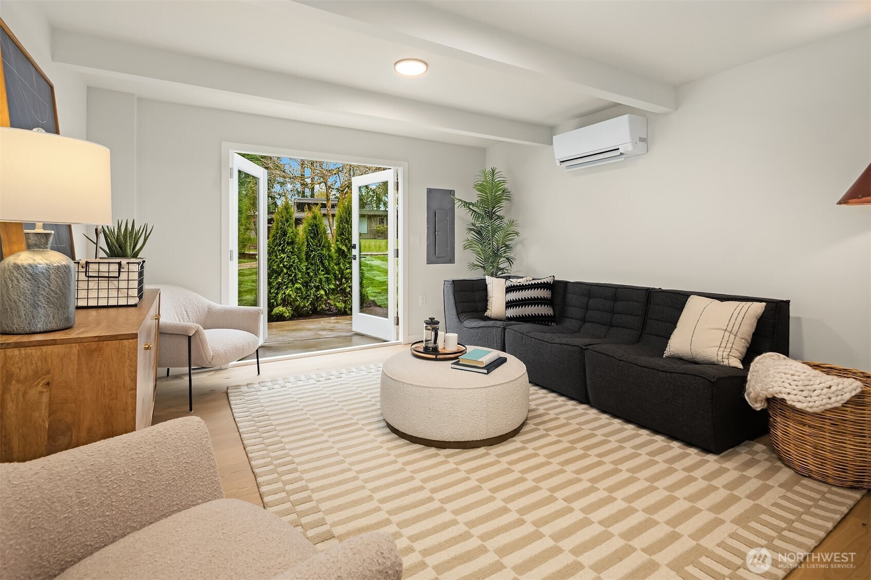 A refined, fully remodeled 4-bedroom residence offering elevated design, modern systems, and effortless comfort. Set on a quiet, light-filled corner lot in Kirkland. This open-concept home has been thoughtfully curated with premium finishes and a seamless indoor-outdoor flow, ideal for both entertaining and everyday living. The heart of the home features a Bosch Pro gas range and full Bosch appliance package, complemented by designer lighting, crisp architectural lines, and engineered hardwoods throughout. Heated bathroom floors add an understated layer of comfort, while efficient ductless mini-split heating and cooling delivers zoned, modern climate control. Extensive upgrades include a new roof, all-new electrical, and new plumbing providing both luxury and long-term peace of mind. Outside, composite decking with custom railings creates a polished extension of the living space, perfect for hosting or unwinding. Positioned on a quiet street and enhanced by its corner-lot setting, the home is filled with natural light and offers a rare blend of thoughtful craftsmanship, modern performance, and refined Kirkland living