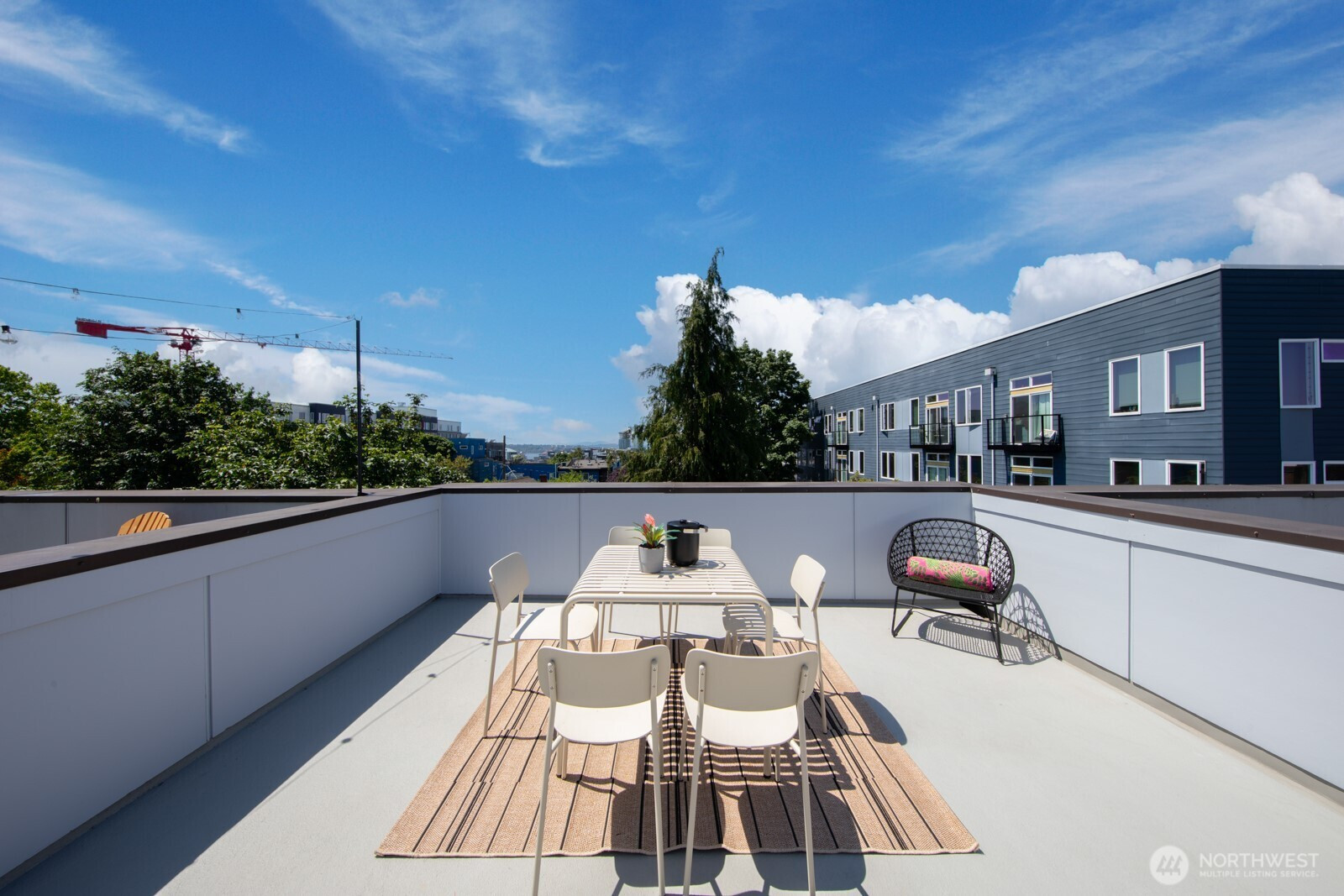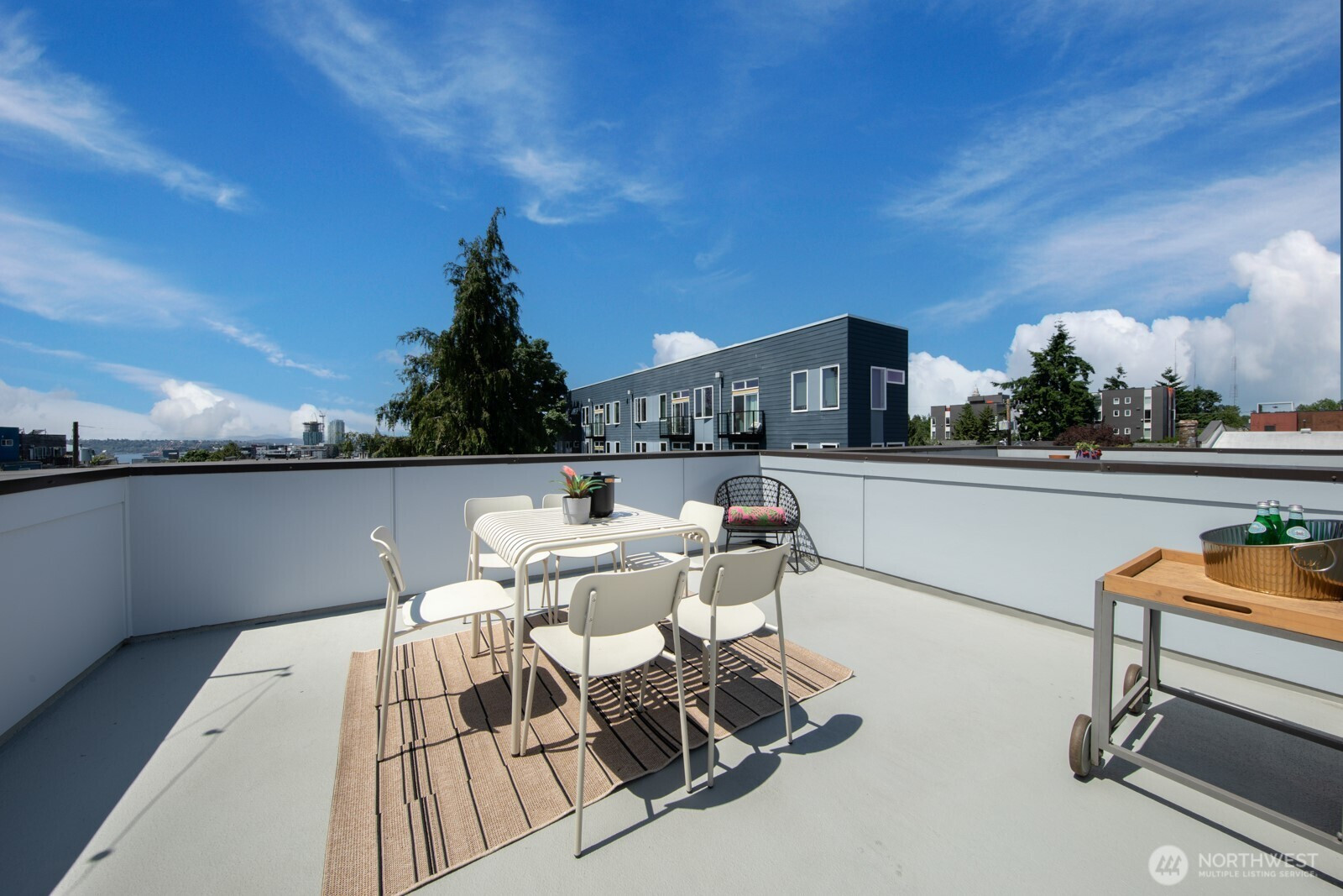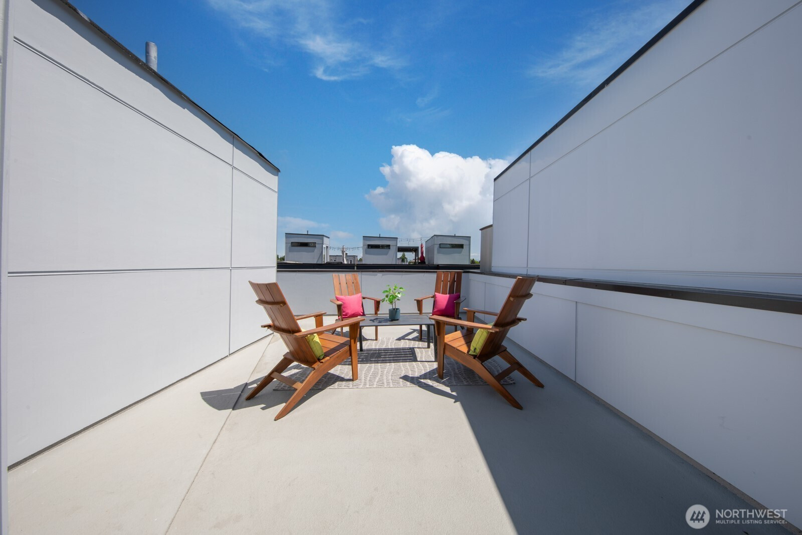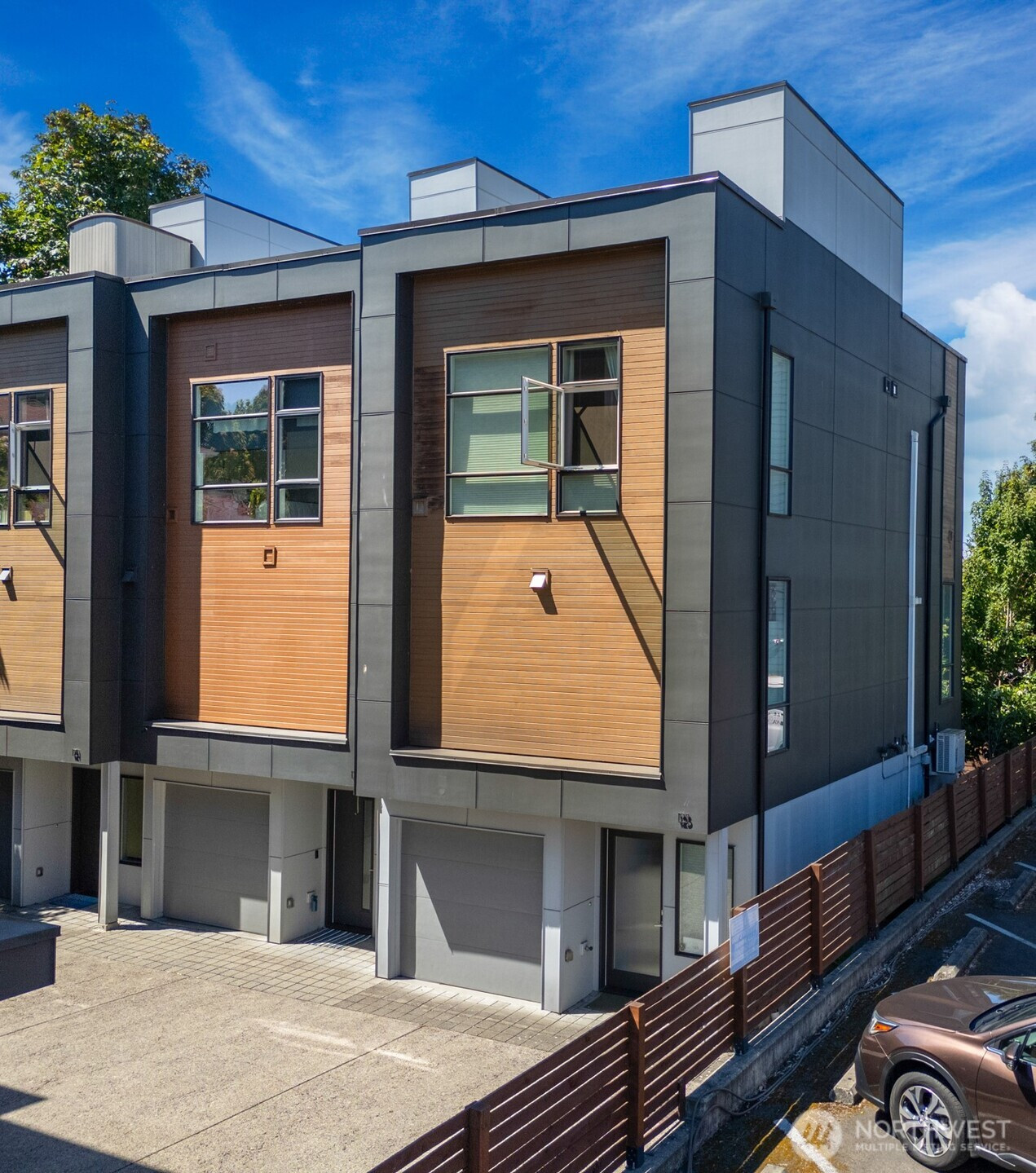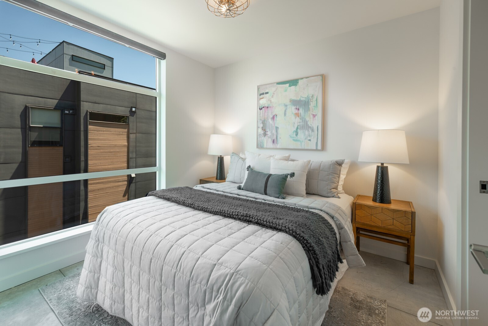 Stylish, spacious, and perfectly located—this light-filled townhouse has it all! The huge-wide open main floor features a sleek kitchen that flows seamlessly into a generous sized dining and living area, framed by floor-to-ceiling windows overlooking your private patio & offering tons of natural light. Upstairs, the west-facing primary suite offers double closets and a full bath, plus an additional bedroom. A lower-level bedroom with adjacent bath is perfect for guests or a home office. Polished concrete floors, floating staircases, and timeless finishes throughout. Enjoy sweeping city, Sound, and mountain views from the rooftop deck. Tucked away in a quiet spot with easy access to downtown, freeways, dining, and more! Don't miss this one!