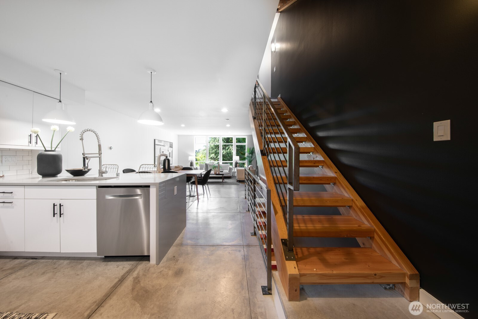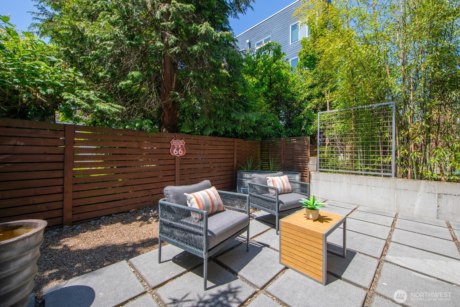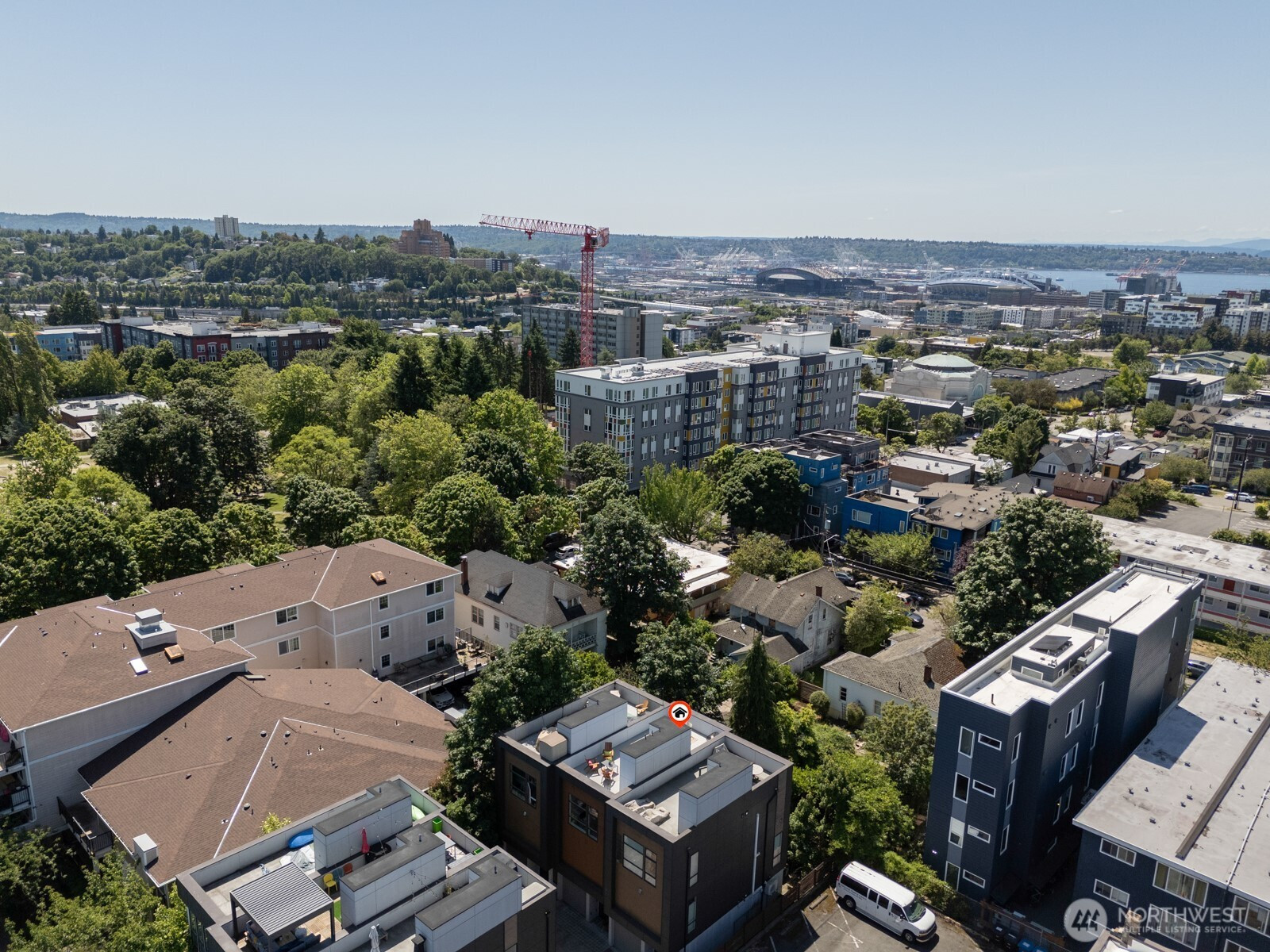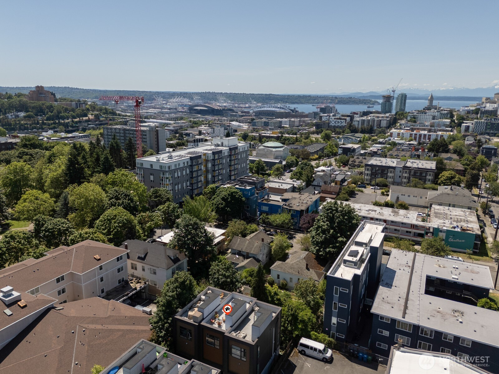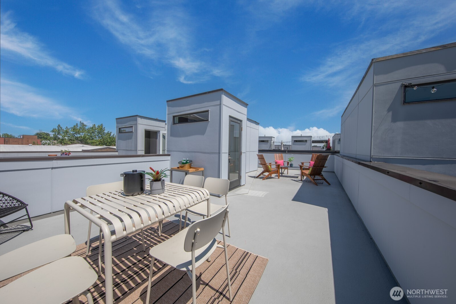 Stylish, spacious, and perfectly located—this light-filled townhouse has it all! The huge-wide open main floor features a sleek kitchen that flows seamlessly into a generous sized dining and living area, framed by floor-to-ceiling windows overlooking your private patio & offering tons of natural light. Upstairs, the west-facing primary suite offers double closets and a full bath, plus an additional bedroom. A lower-level bedroom with adjacent bath is perfect for guests or a home office. Polished concrete floors, floating staircases, and timeless finishes throughout. Enjoy sweeping city, Sound, and mountain views from the rooftop deck. Tucked away in a quiet spot with easy access to downtown, freeways, dining, and more! Don't miss this one!