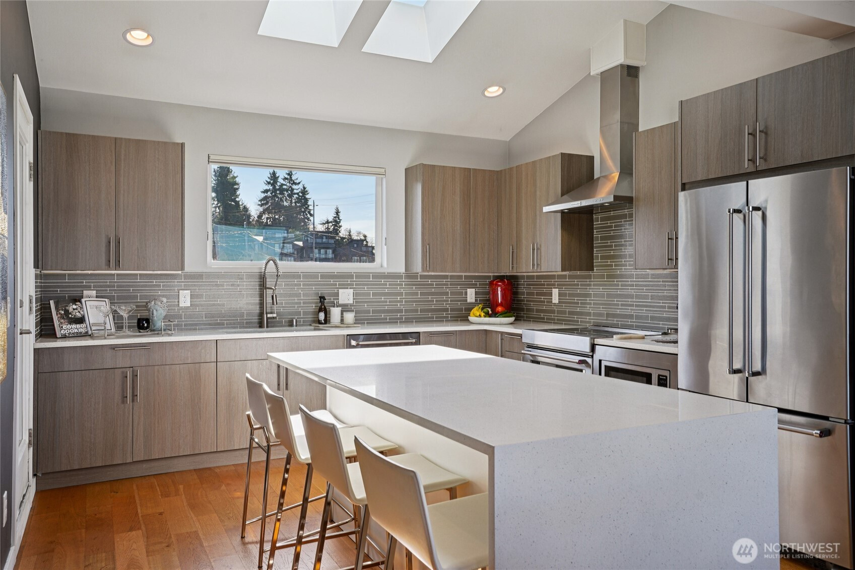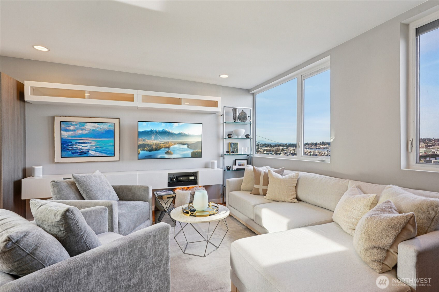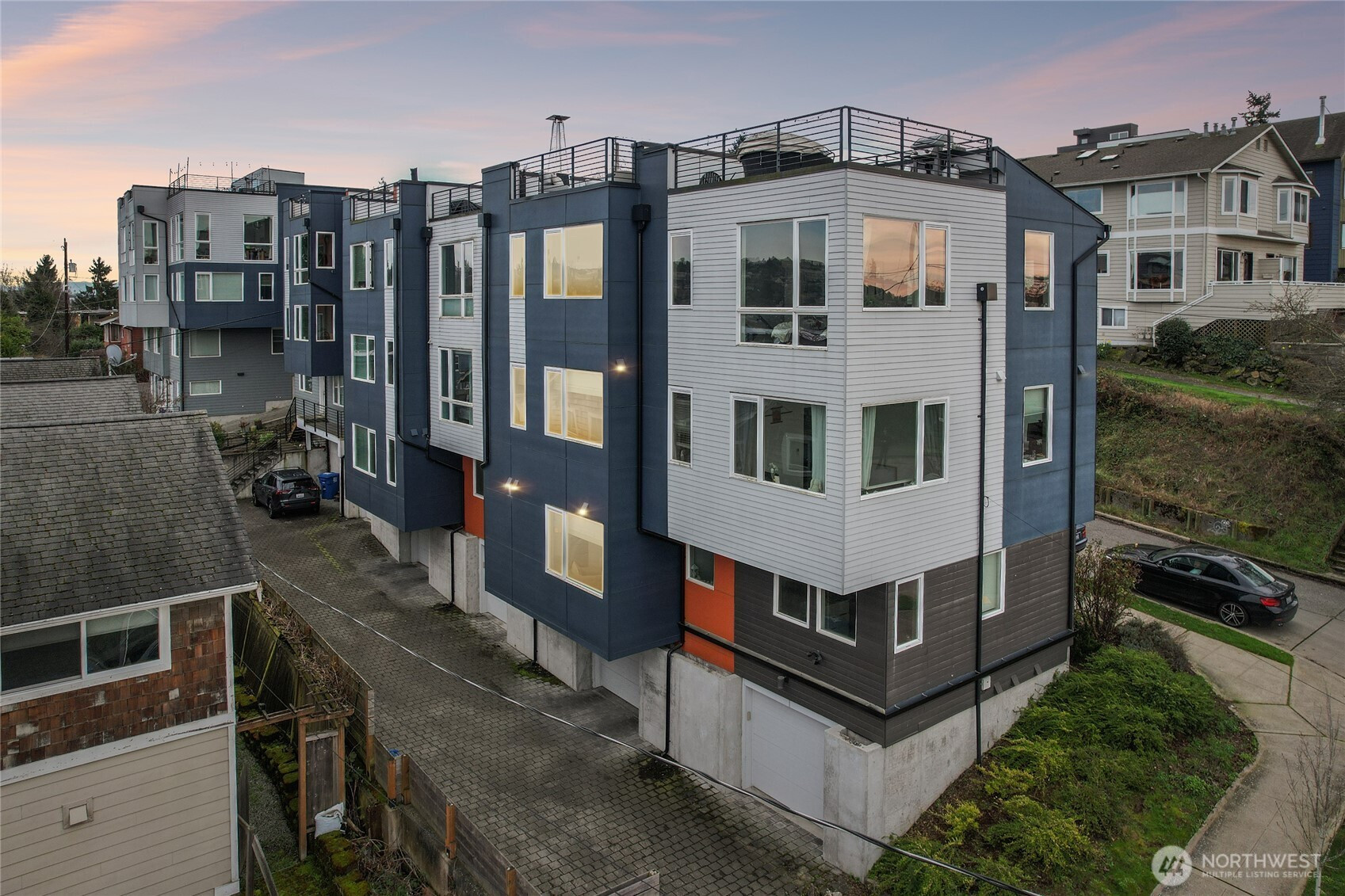 Stunning view townhome at 1230 W Emerson St in North Queen Anne, Seattle. You don't often see such stunning panoramic views at this price point. This light-filled home features 2 bedrooms, 2 bathrooms, and a dramatic double-height office that can easily function as a 3rd bedroom or convert to a true 3rd bedroom while also maintaining the current office space. Thoughtfully upgraded with custom closet systems, designer lighting and fixtures, dimmers throughout, under-cabinet lighting, designer paint, custom window treatments, and remote-controlled shades in the primary suite. A built-in entertainment system enhances everyday comfort and entertaining.The spacious chef’s kitchen flows seamlessly into bright living areas with abundant natural light, creating an ideal layout for entertaining. From the kitchen you have easy access to expansive rooftop deck which showcases sweeping views, making outdoor entertaining effortless.Additional highlights include a private, spacious garage, generous storage, and a comfortable, highly functional floor plan.Located in sought-after North Queen Anne with quick access to everything that Fremont, Ballard, SPU, and South Lake Union offer. Convenient to everyday essentials including Whole Foods, Trader Joe’s, and Fred Meyer, plus neighborhood dining, parks, and transit connections.Rare views + prime location + flexible living space create a standout North Queen Anne opportunity.