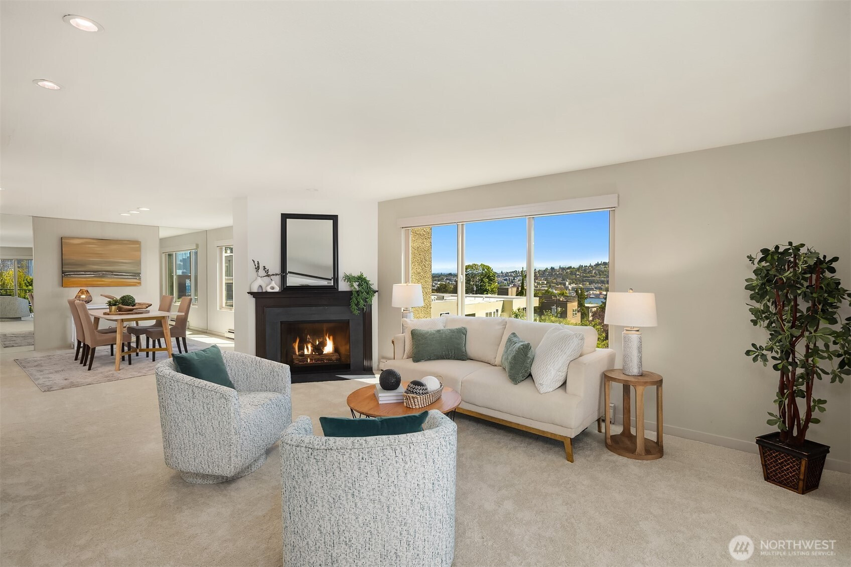 Sunny, spacious top-floor corner condo offering sweeping 270° views of Lake Union, downtown Seattle, the Space Needle, and the Cascades—your own front-row seat to the city’s most iconic skyline. This rare 3-bedroom home with three dedicated parking spaces offers exceptional flexibility for modern living and commuting. Eastern exposure fills the home with beautiful morning light while showcasing the daily rhythm of Lake Union and the shimmering skyline at night. The elegant interior features an updated kitchen with granite counters, a large pantry, and an inviting wood-burning fireplace that anchors the bright living and dining rooms. Step onto the covered deck to enjoy fresh air and panoramic views year-round—perfect for morning coffee or evening unwinding. The three bedrooms offer ample flexibility, including a primary with en-suite. A dedicated in-unit laundry room adds everyday convenience, while thoughtful storage throughout is complemented by two additional storage units. Pet-friendly, no rental cap, strong HOA, and secure building access add comfort and confidence. All of this in a Queen Anne location with a Walkscore of 83 and unbeatable access to South Lake Union, Seattle Center and Climate Pledge Arena, transit, tech campuses, and an array of restaurants, cafes, pubs, and shops. Whether you're commuting, entertaining, or simply enjoying the skyline, this condo brings the best of Seattle to your doorstep. The good life starts here!