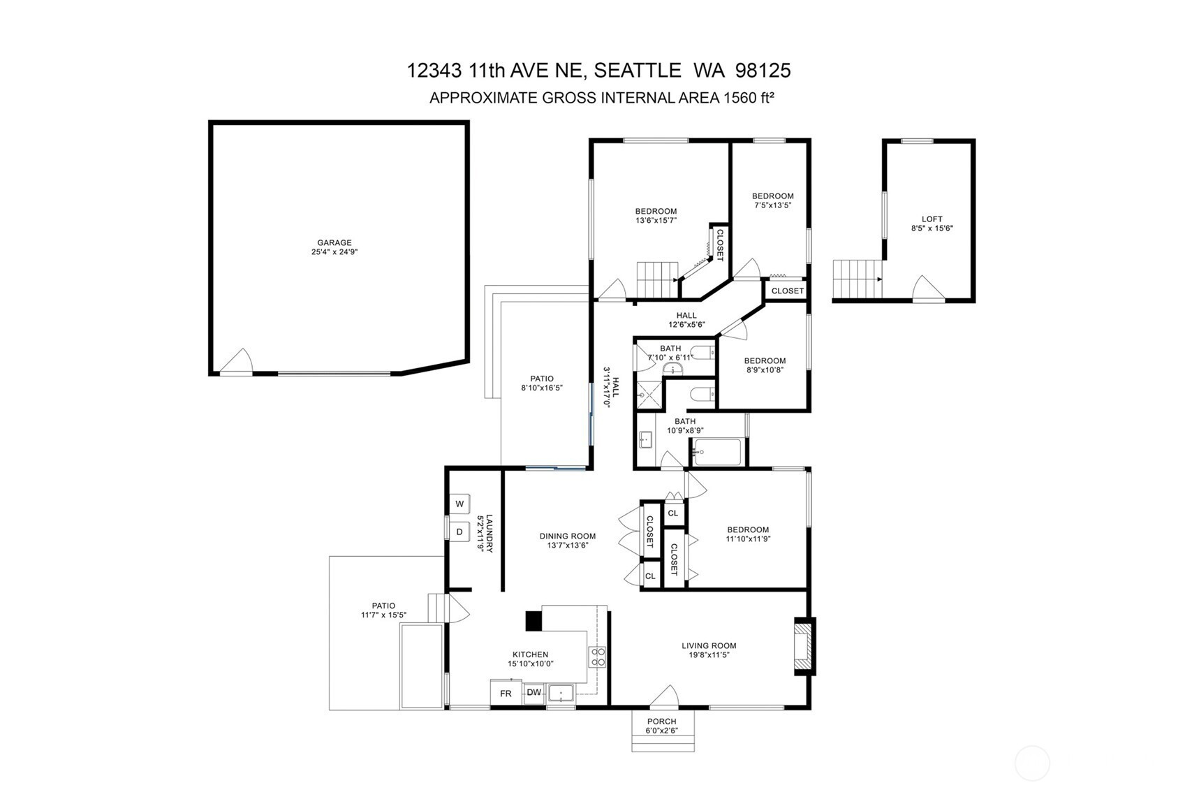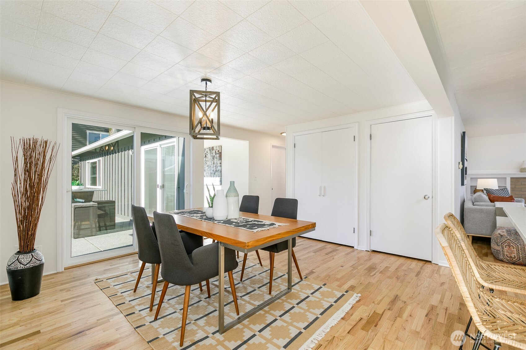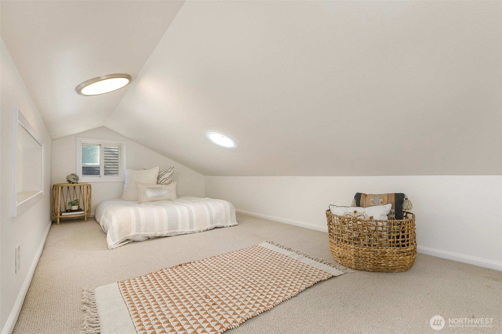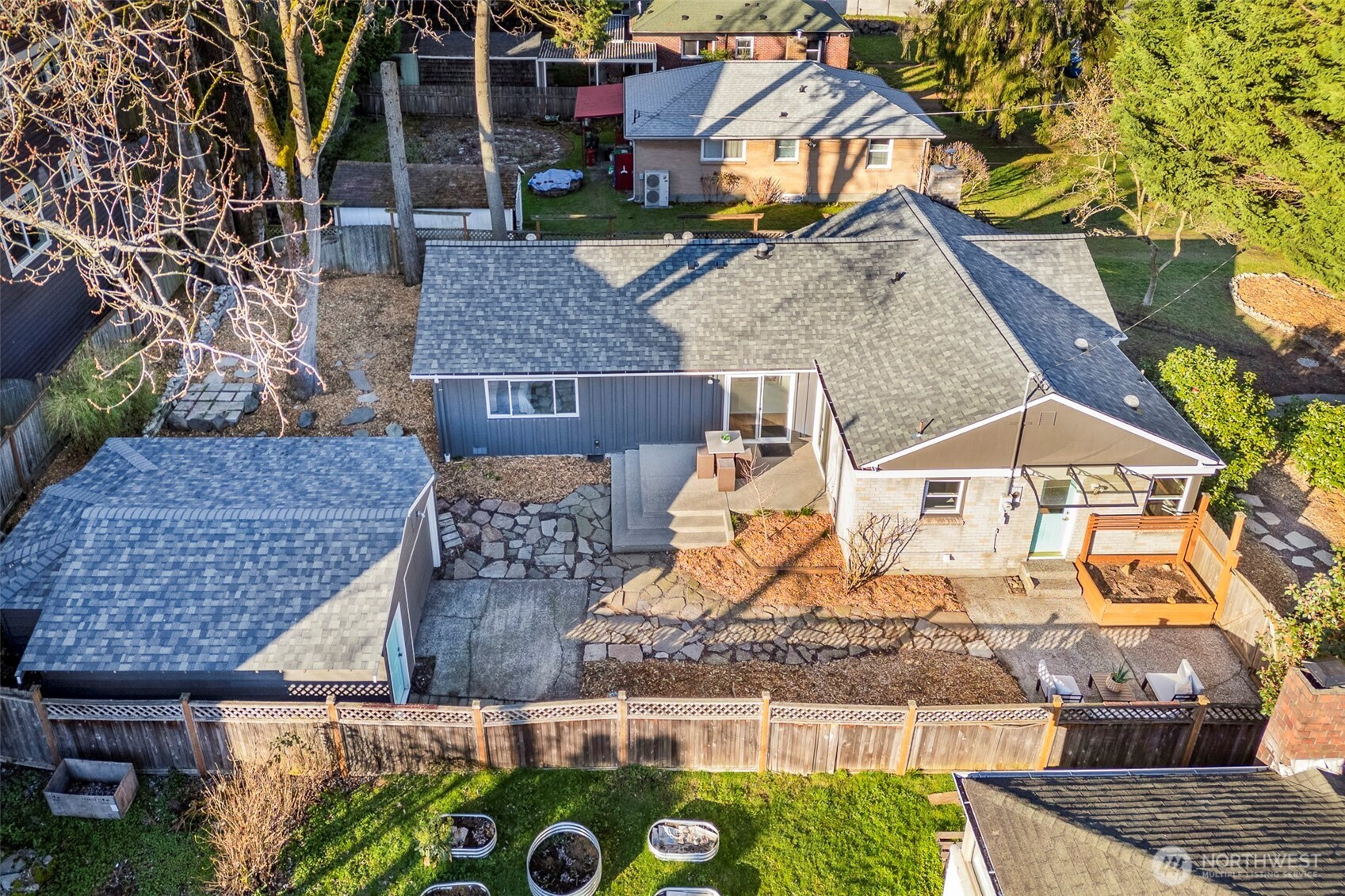 Hidden beneath an old-growth evergreen & framed by blooming camellia bushes, this 1949 east-facing rambler offers storybook curb appeal while blending timeless character with modern updates. Refinished original oak hardwood floors & expansive picture windows create an inviting living space anchored by a cozy wood-burning stove insert. The cottage-inspired kitchen features generous cabinetry, quartz countertops, an antique farmhouse sink, stainless appliances, & solatube lighting, flowing to the dining area & fully fenced backyard for effortless indoor-outdoor living. Vaulted ceilings & south and west-facing windows fill the primary bedroom with light, while its adjoining loft adds flexibility & architectural interest. Three additional bedrooms offer versatility for guests or a dedicated WFH office. Both bathrooms include solatube lighting for added natural light. The backyard provides patio space with room for raised beds, gatherings, or future possibilities, and the oversized detached garage offers storage or workshop potential. The brand-new roof, fresh interior & exterior paint, and seller-provided inspection & sewer scope provide peace of mind. Just around the corner from the soon-to-open Pinehurst Light Rail Station & minutes to I-5, this home pairs everyday comfort with commuter convenience.