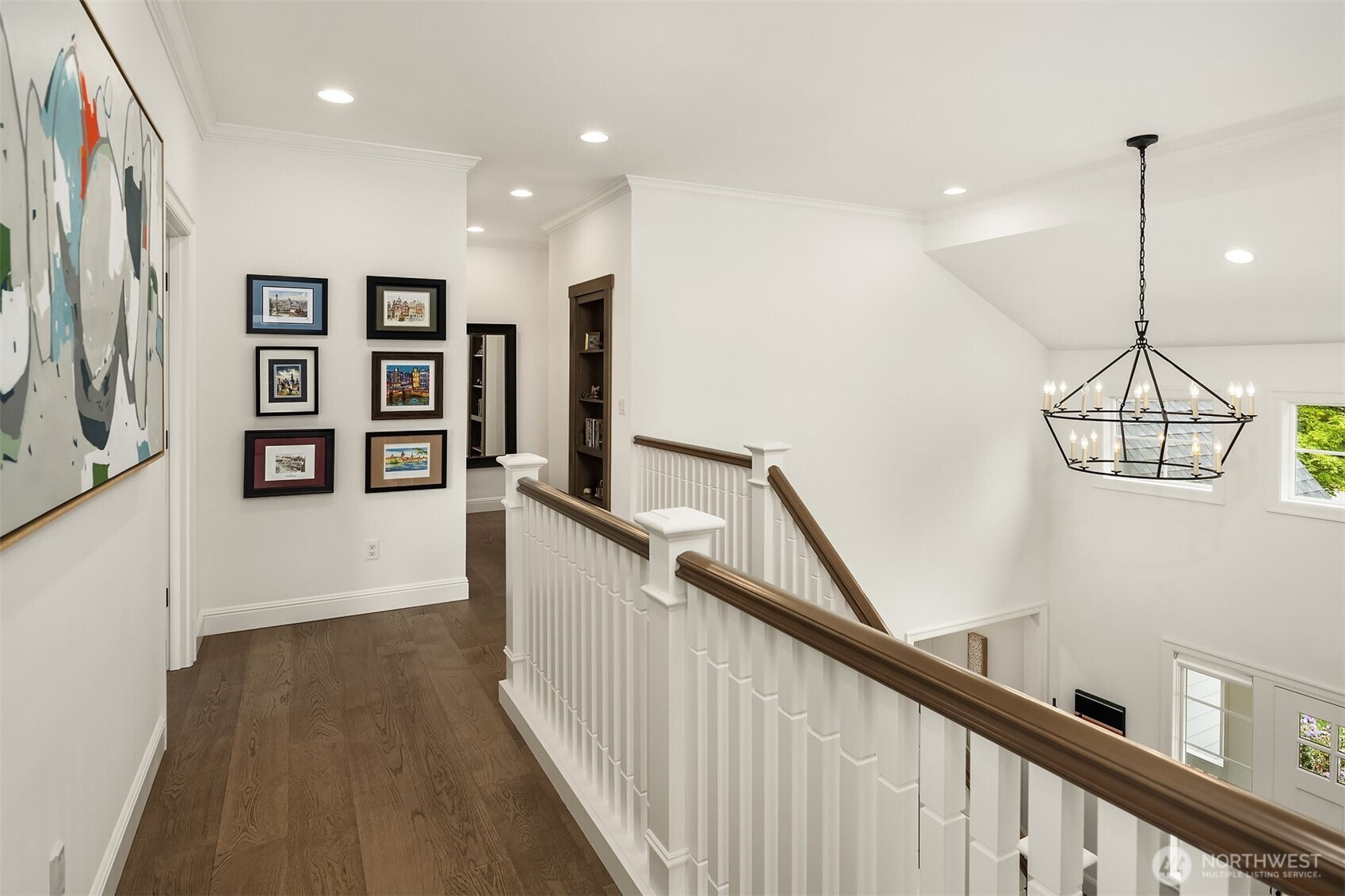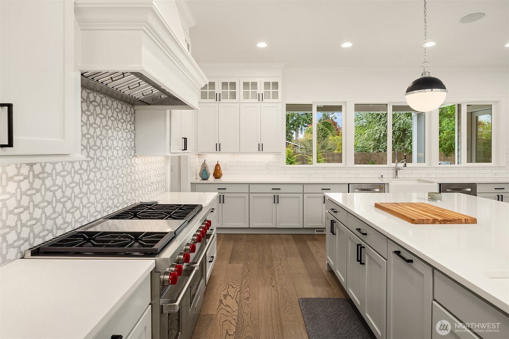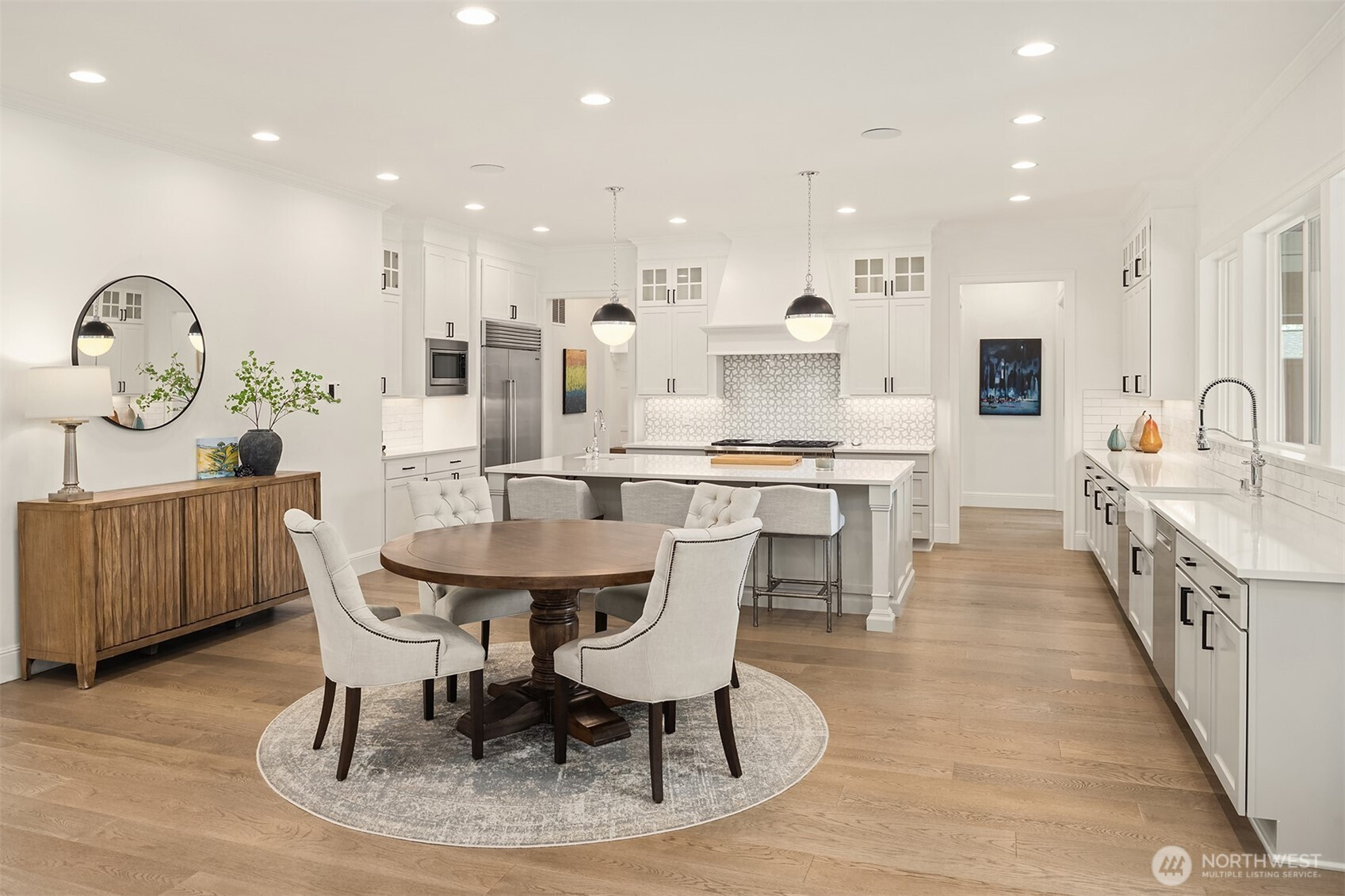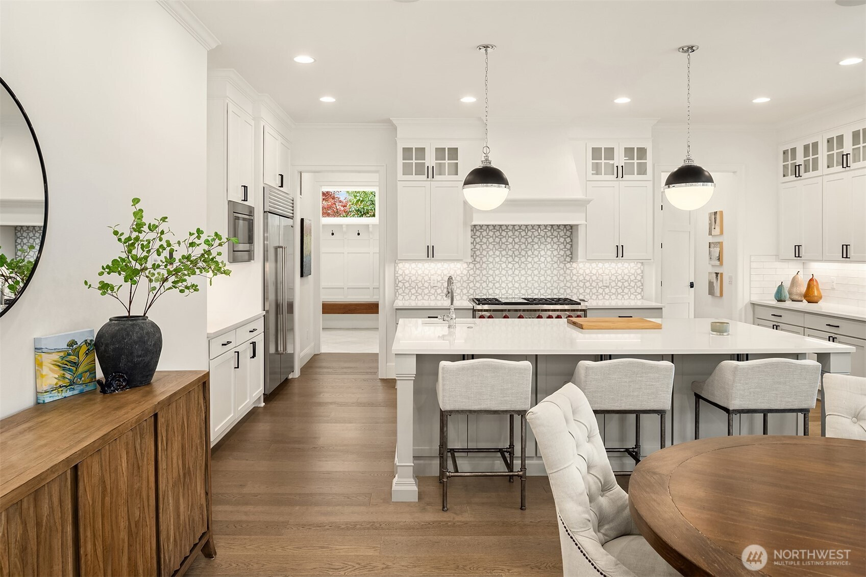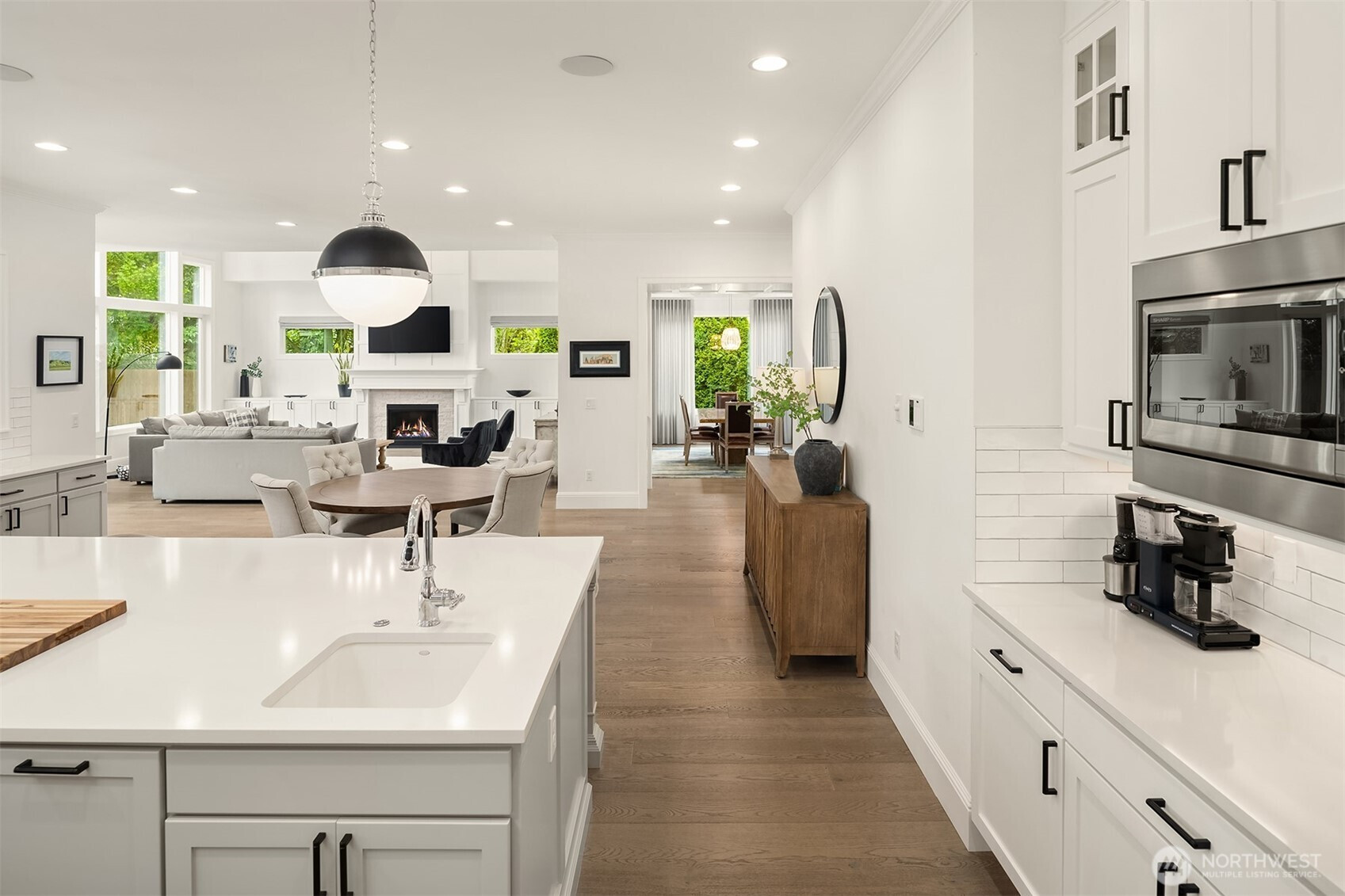 Built by MN Custom Homes, this stunning Woodridge home is thoughtfully designed with timeless elegance and exceptional living spaces. Well-curated for both everyday living and effortless entertaining. The dramatic vaulted great room anchors the main level, complemented by a luxurious entertainer’s kitchen with casual eating area and seamless access to a covered outdoor living area. The flexible main level includes a spacious bonus room and a private guest en-suite. Upstairs, the lovely primary suite showcases a spa-inspired marble bath and expansive walk-in closet, along with two additional bedrooms. This home is just moments from Norwood Park & Pool, Bellevue School District, downtown Bellevue, I-90, and beyond.