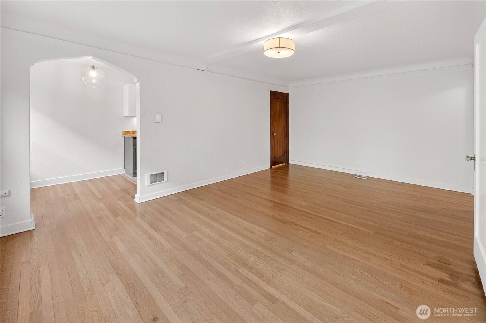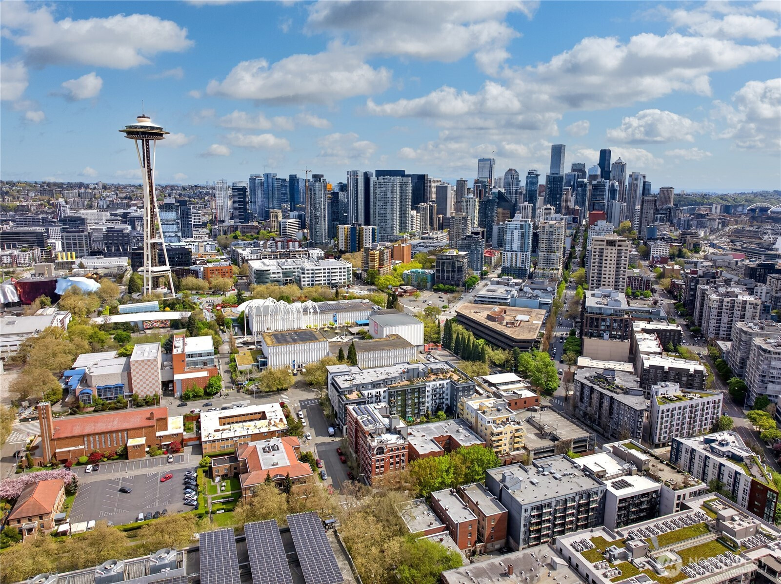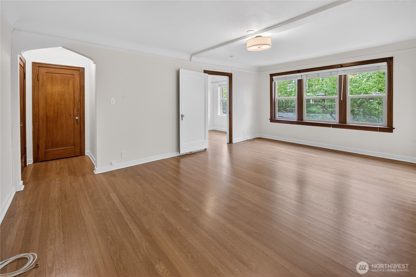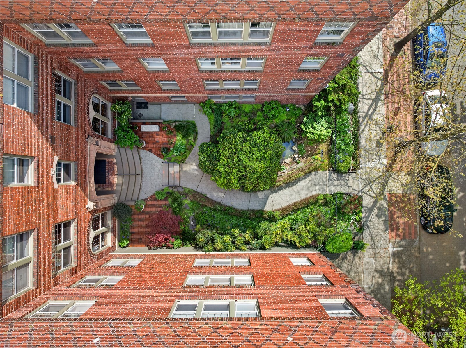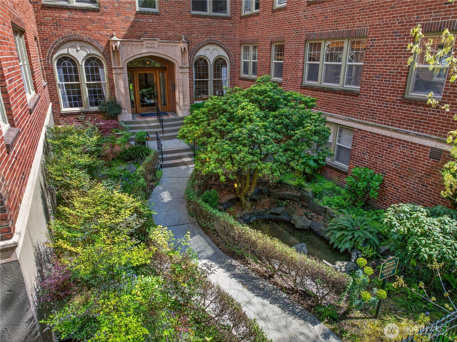 Queen's Court has been one of Lower Queen Anne's most recognized addresses since 1930, and Unit 208 shows you why. Original oak hardwoods, arched doorways, and the building's signature antique glass doorknobs are all intact. This corner unit looks out to a community-maintained green space, trees visible through east-facing windows. The living room opens up immediately, hardwoods underfoot and arched doorways framing the space. The kitchen features shaker cabinetry, granite counters, and stainless appliances, with a nook for morning coffee. The bedroom is quiet and covered with natural light, windows looking out to the trees. The bathroom carries the character through: white tile, wood vanity with granite counter, and that antique glass doorknob on the door. Outside the unit, the community garden and building library quietly shape how you live. Grow something on a weekend morning. Swap books without leaving the building. A dedicated storage unit on property gives bikes, seasonal gear, and the rest of daily life a real home outside the unit. A block from Seattle Center and minutes from Elliott Bay, this is Lower Queen Anne at its most alive. Step outside and you are choosing between a concert at Climate Pledge Arena, dinner at Toulouse Petit, or a morning at Myrtle Edwards Park watching ferries and ships cross the harbor. Groceries, cafes, and green space all within reach. In a building with nearly a century of character behind it. Come experience it.