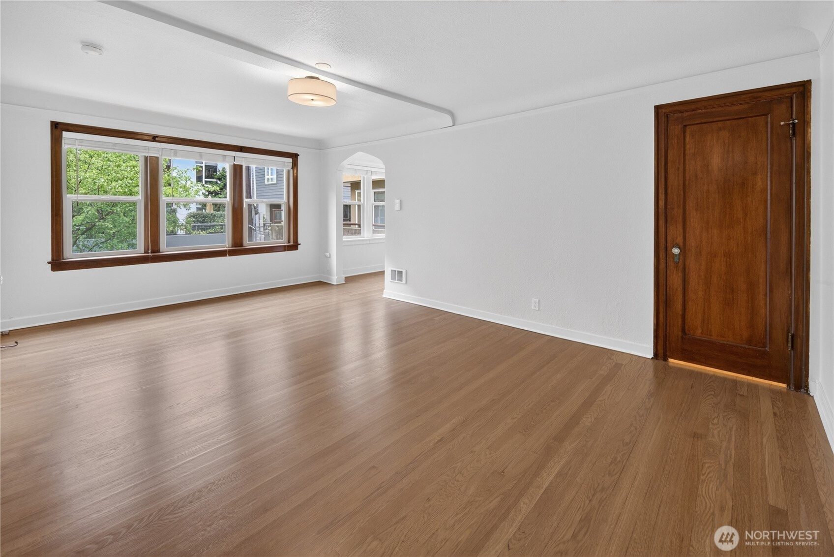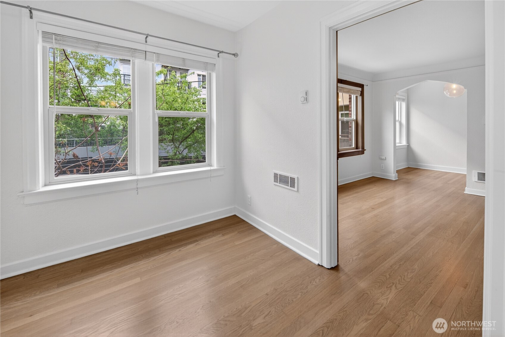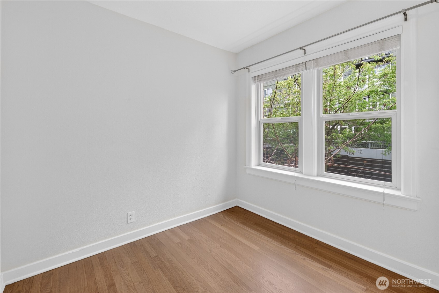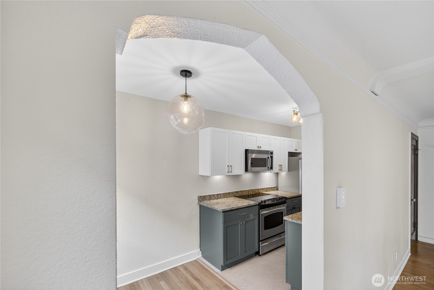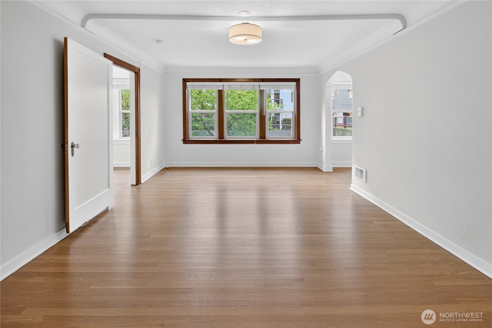 Queen's Court has been one of Lower Queen Anne's most recognized addresses since 1930, and Unit 208 shows you why. Original oak hardwoods, arched doorways, and the building's signature antique glass doorknobs are all intact. This corner unit looks out to a community-maintained green space, trees visible through east-facing windows. The living room opens up immediately, hardwoods underfoot and arched doorways framing the space. The kitchen features shaker cabinetry, granite counters, and stainless appliances, with a nook for morning coffee. The bedroom is quiet and covered with natural light, windows looking out to the trees. The bathroom carries the character through: white tile, wood vanity with granite counter, and that antique glass doorknob on the door. Outside the unit, the community garden and building library quietly shape how you live. Grow something on a weekend morning. Swap books without leaving the building. A dedicated storage unit on property gives bikes, seasonal gear, and the rest of daily life a real home outside the unit. A block from Seattle Center and minutes from Elliott Bay, this is Lower Queen Anne at its most alive. Step outside and you are choosing between a concert at Climate Pledge Arena, dinner at Toulouse Petit, or a morning at Myrtle Edwards Park watching ferries and ships cross the harbor. Groceries, cafes, and green space all within reach. In a building with nearly a century of character behind it. Come experience it.