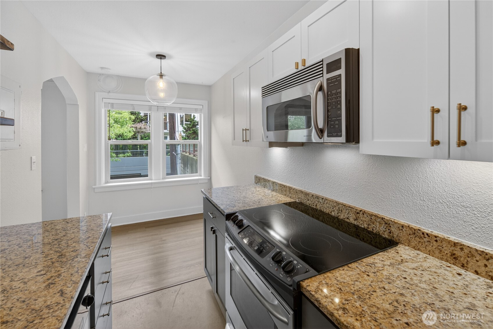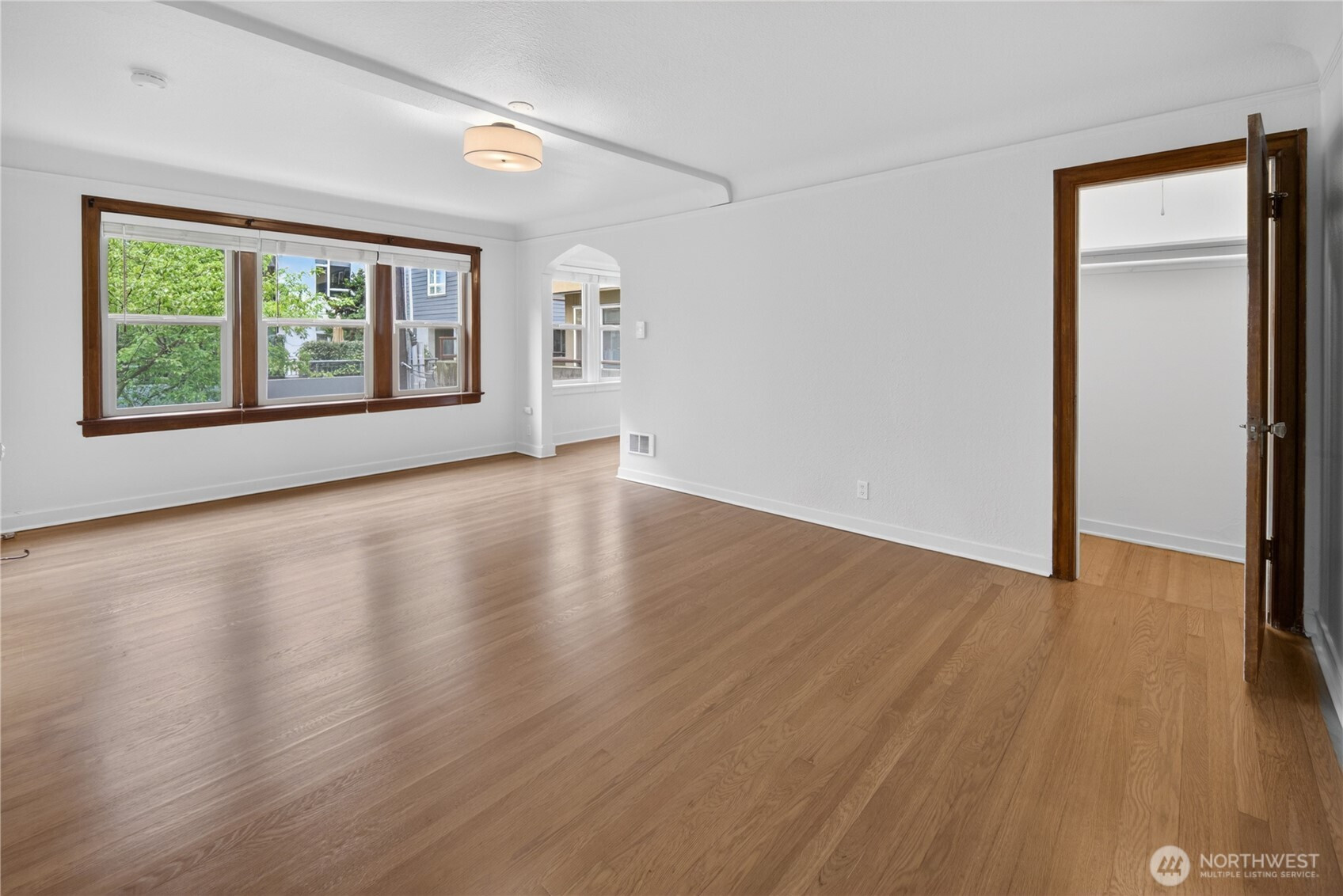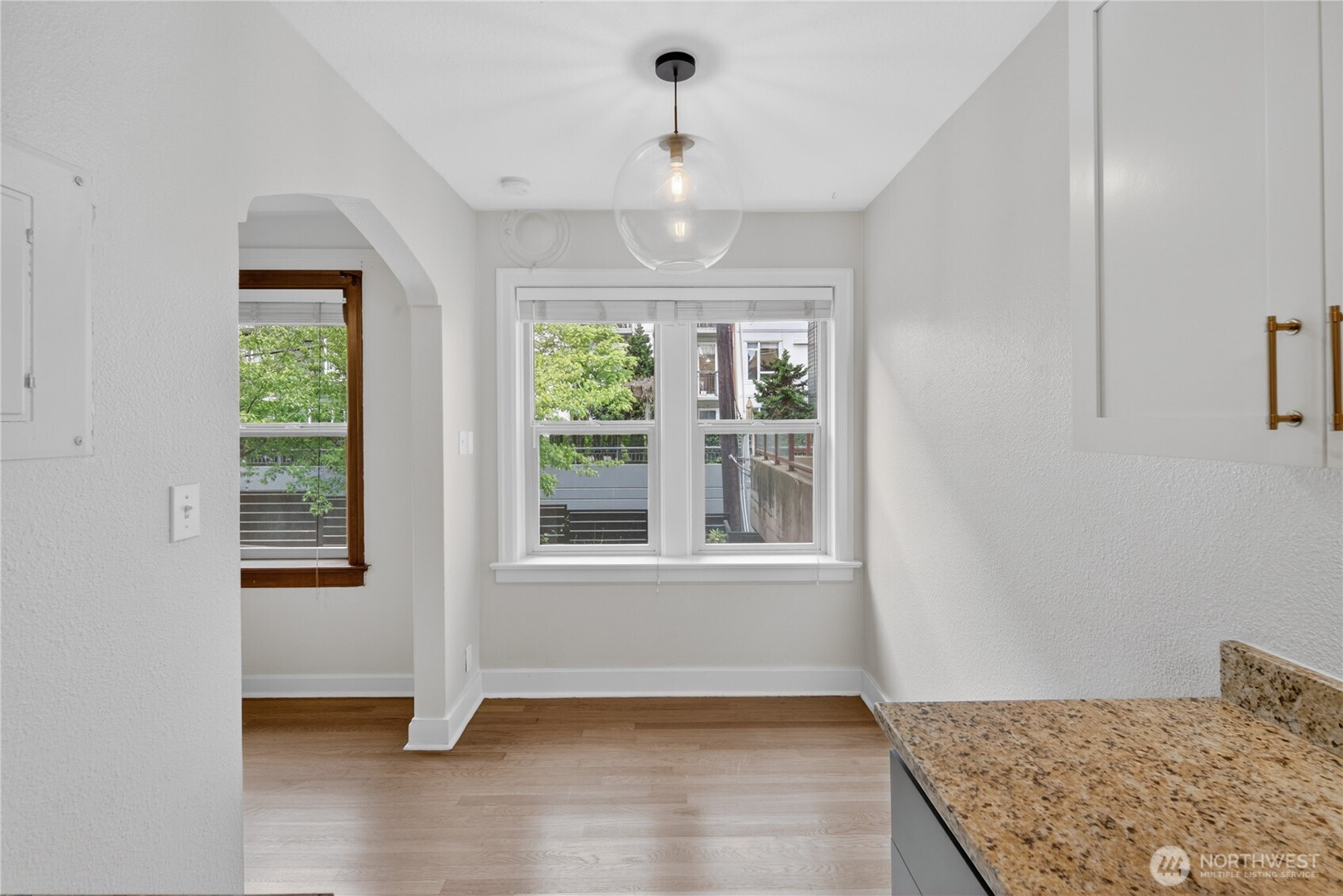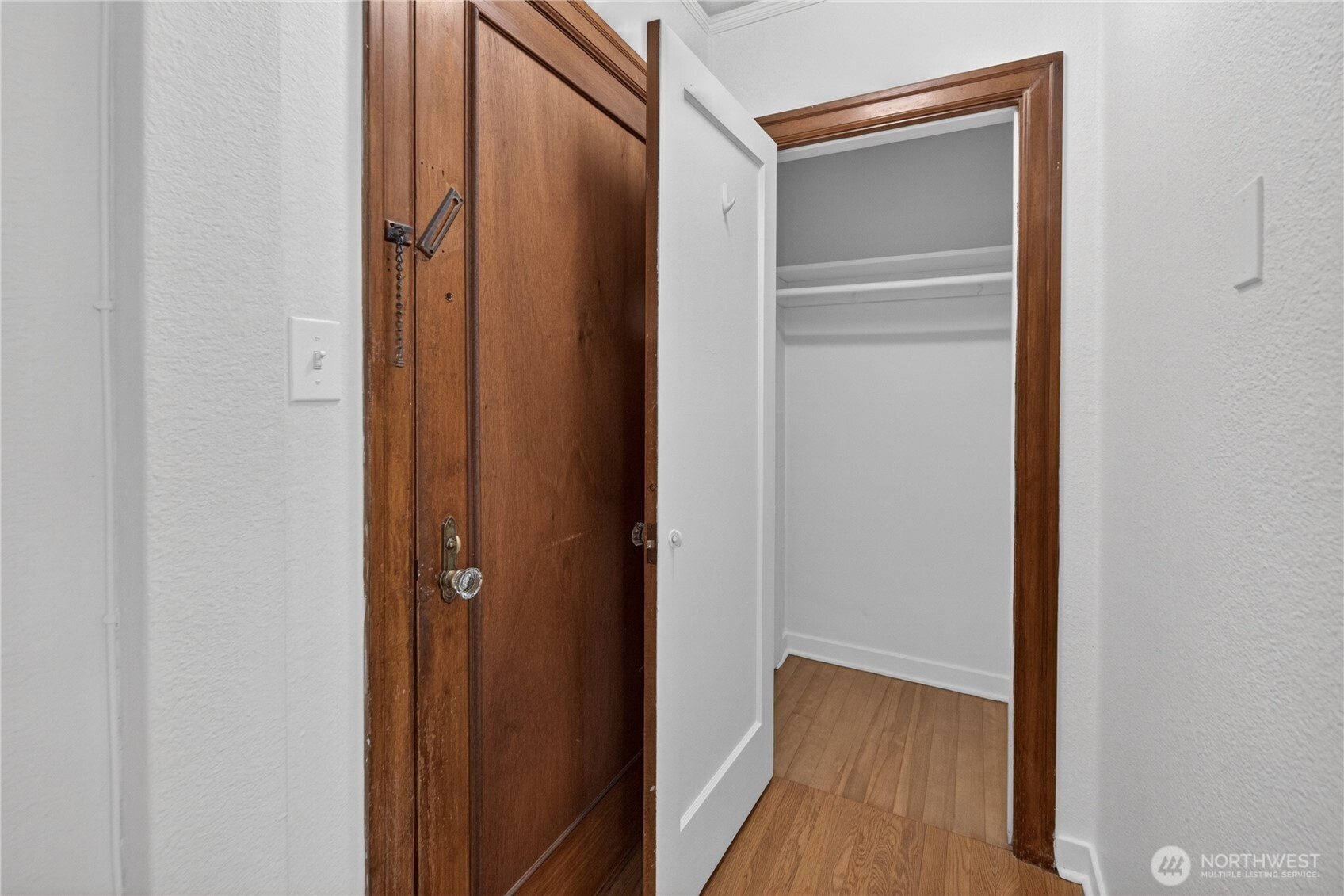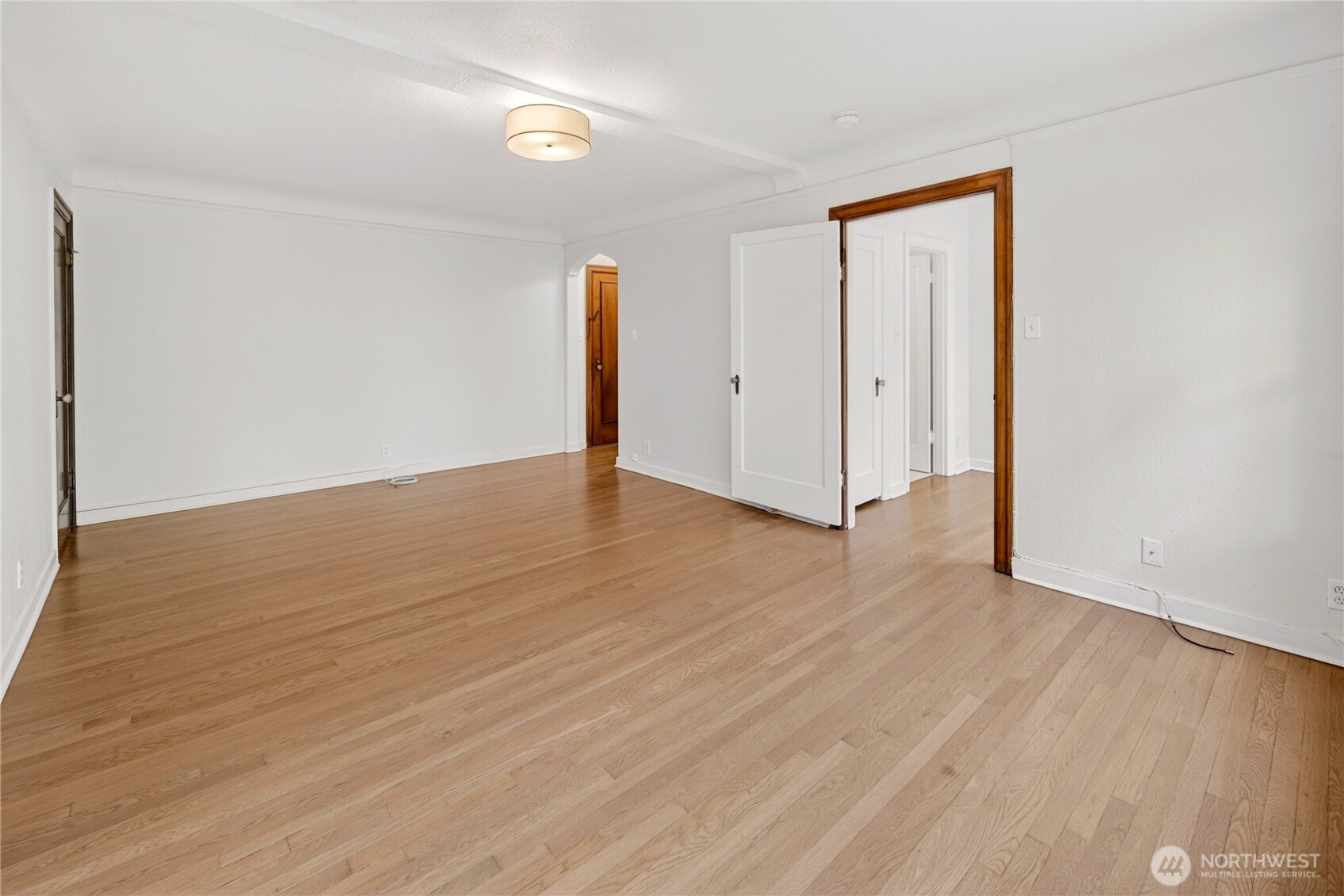 Queen's Court has been one of Lower Queen Anne's most recognized addresses since 1930, and Unit 208 shows you why. Original oak hardwoods, arched doorways, and the building's signature antique glass doorknobs are all intact. This corner unit looks out to a community-maintained green space, trees visible through east-facing windows. The living room opens up immediately, hardwoods underfoot and arched doorways framing the space. The kitchen features shaker cabinetry, granite counters, and stainless appliances, with a nook for morning coffee. The bedroom is quiet and covered with natural light, windows looking out to the trees. The bathroom carries the character through: white tile, wood vanity with granite counter, and that antique glass doorknob on the door. Outside the unit, the community garden and building library quietly shape how you live. Grow something on a weekend morning. Swap books without leaving the building. A dedicated storage unit on property gives bikes, seasonal gear, and the rest of daily life a real home outside the unit. A block from Seattle Center and minutes from Elliott Bay, this is Lower Queen Anne at its most alive. Step outside and you are choosing between a concert at Climate Pledge Arena, dinner at Toulouse Petit, or a morning at Myrtle Edwards Park watching ferries and ships cross the harbor. Groceries, cafes, and green space all within reach. In a building with nearly a century of character behind it. Come experience it.