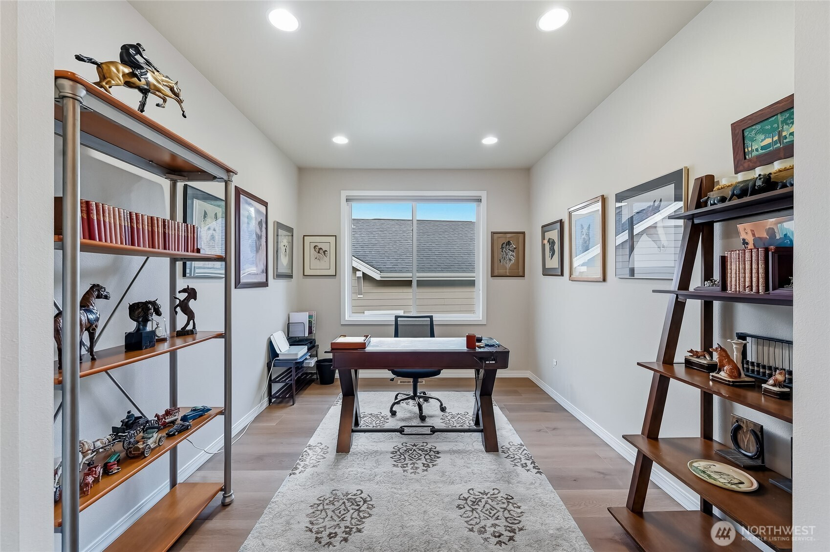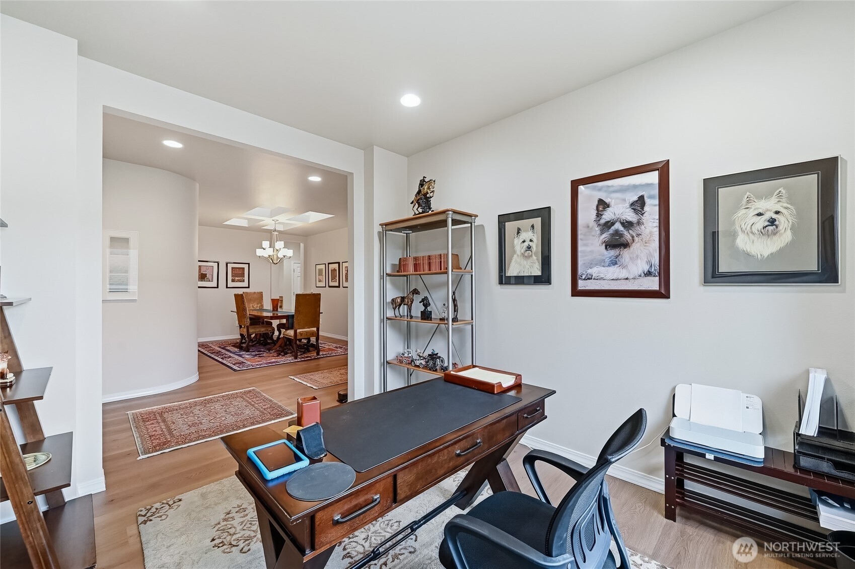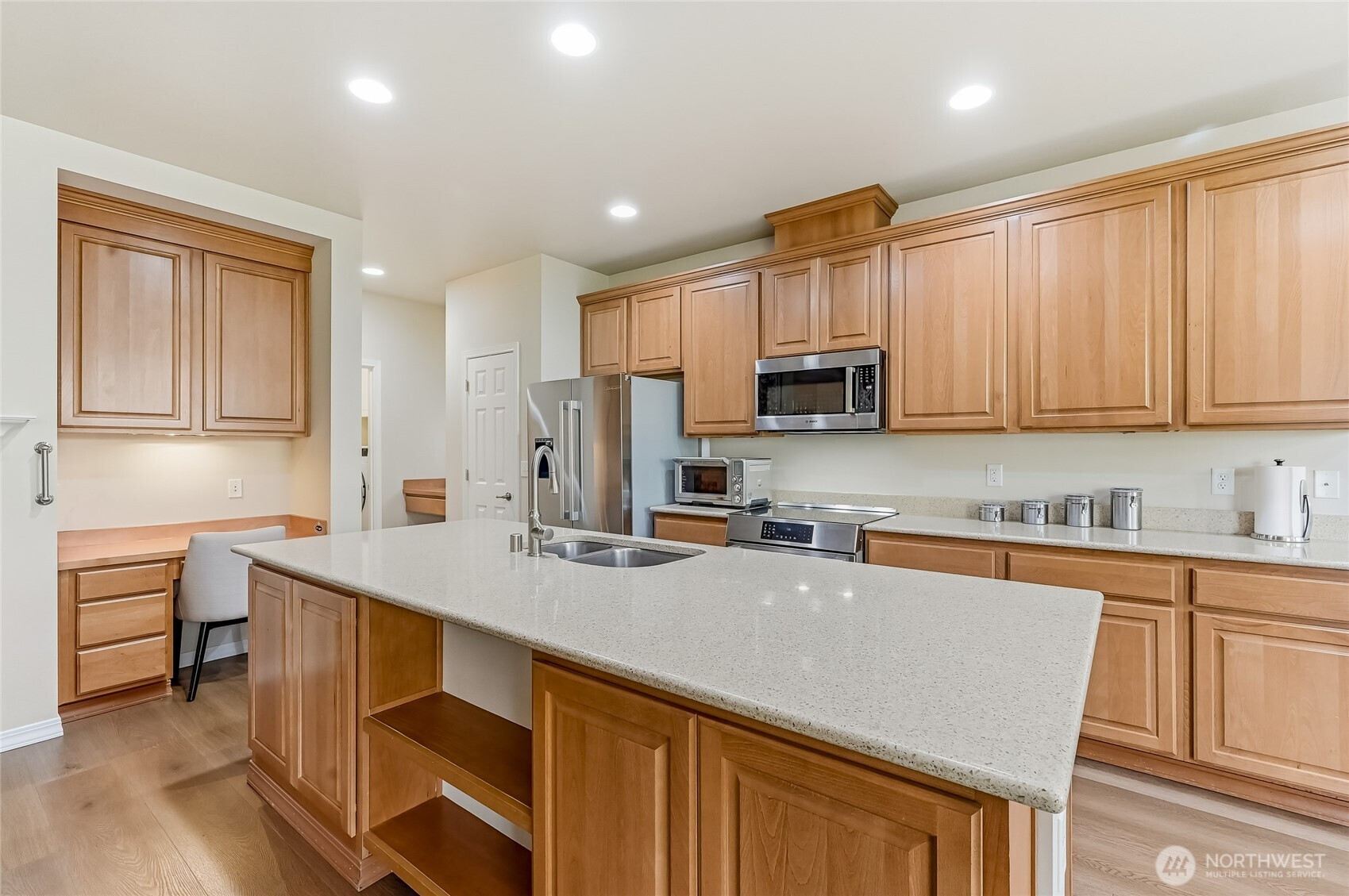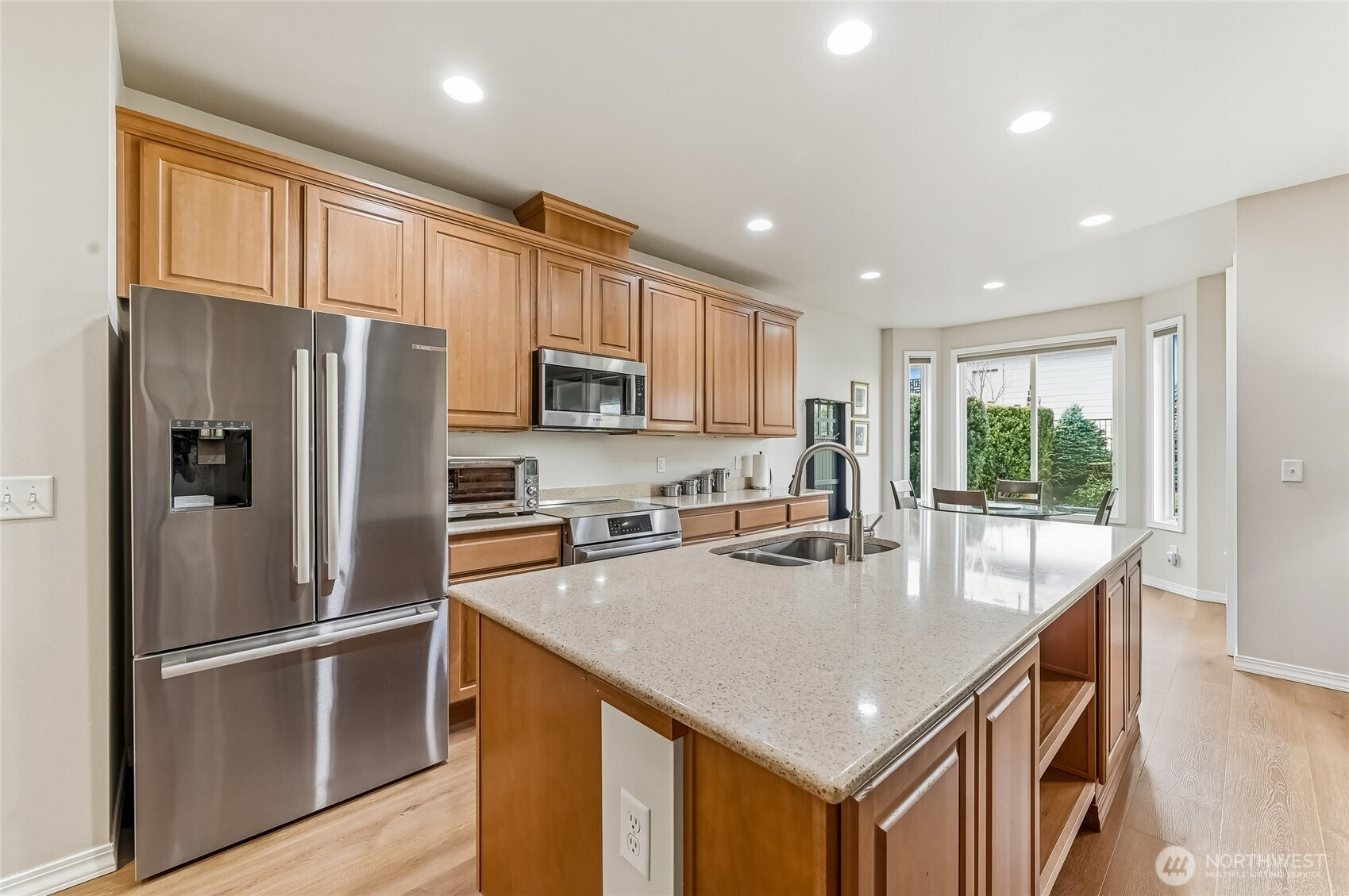 Sunset Magazine Perfect best describes this immaculate Bainbridge model home located in Division 12 the youngest neighborhood in Trilogy and its within easy walking distance of the Cascade Club. This flexible floor plan is an entertainer’s dream with its large, central great room plus formal dining room with an oversized skylight which lets in tons of natural light. New Luxury Vinyl Plank flooring flows throughout the main living areas and large picture windows frame the serene garden views. The updated island kitchen includes 42” upper cabinets and lower cabinets with convenient pull-outs all topped with slab counters. Newer Bosch fridge, DW, range & microwave. The kitchen dining nook includes a custom bump-out and overlooks the private backyard. The great room flows seamlessly out to the sunny, west facing patio surrounded by flowering garden beds, it’s the perfect space for relaxing on a summer day and it’s fully fenced for your furry friends. Spacious owner's suite with spa-like bath, the walk-in closet is finished with an ELFA organizing system. The guest bedroom has an adjacent full bath and is separated from the primary suite by the home office providing everyone with plenty of privacy. Top of the line LG washer and dryer on bottom drawer stands. The 2 Car garage includes the ELFA storage system and the extended driveway provides additional parking. This home has been freshly painted inside & out with designer colors and is move-in ready. Central AC. Pre-inspected. 55+