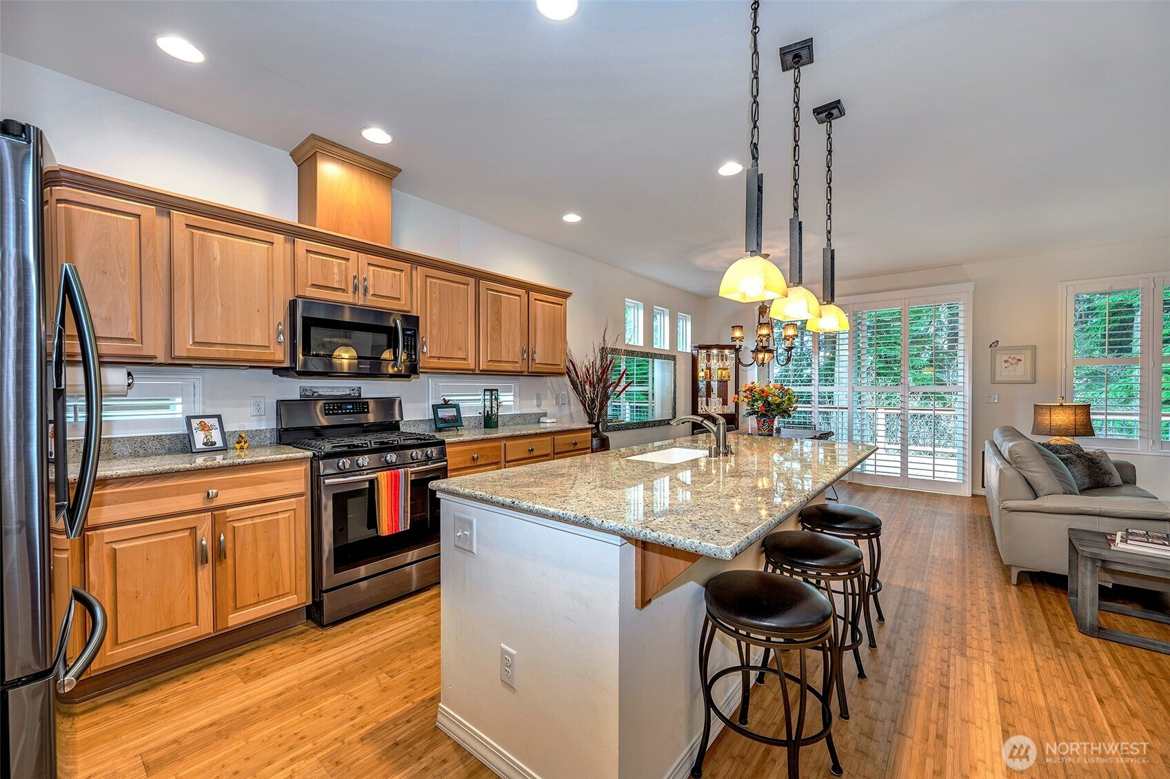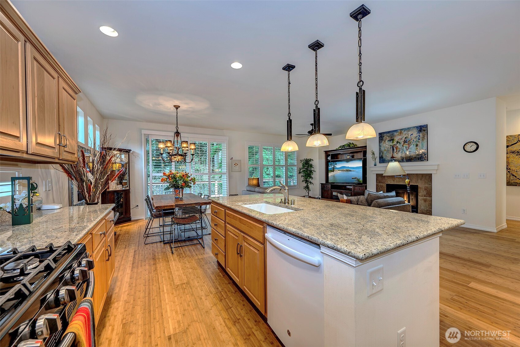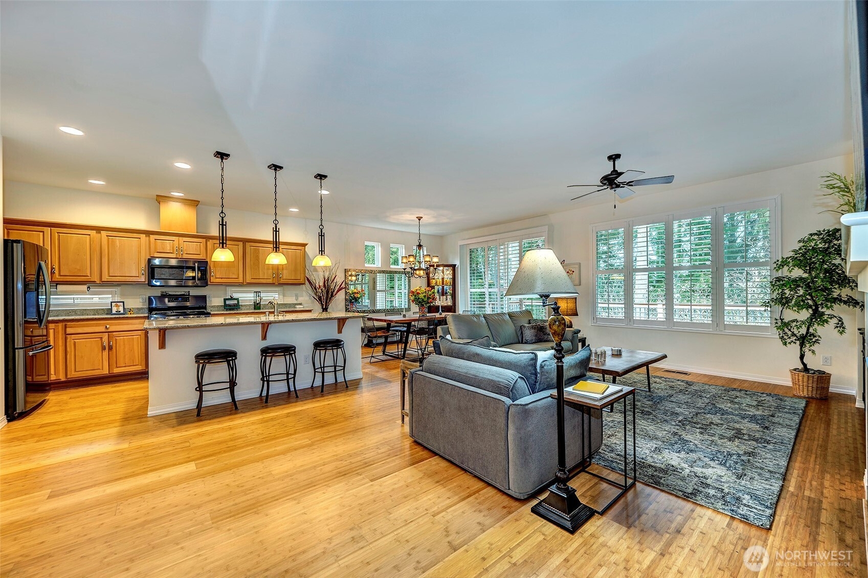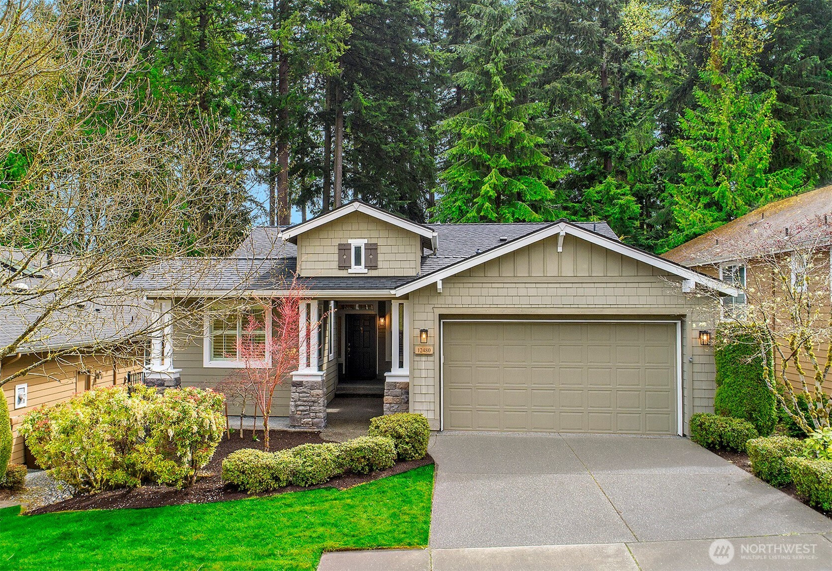 Experience resort-style living in the premier 55+ community of Trilogy at Redmond Ridge. Ideally located just blocks from the clubhouse and directly across from the 16th tee box, this meticulously maintained Vashon floor plan offers the perfect blend of casual elegance. Sited on a beautiful greenbelt lot, the home captures serene, nature-filled views from nearly every room. A covered entry welcomes guests into a warm, inviting interior featuring designer finishes and a sophisticated color palette throughout. Just off the entry, a private guest suite with an adjacent full bath provides ideal accommodation for visitors. Freshly refinished bamboo hardwood floors flow seamlessly through the open-concept great room, where expansive picture windows frame tranquil forest views. The island kitchen is well-appointed with maple cabinetry, granite countertops, breakfast bar, and ample workspace. The spacious primary suite with bay window includes an en-suite bath and walk-in closet, A private office provides the perfect work-from-home or hobby space. Step outside to the oversized, sun-filled deck, an ideal setting for relaxing or entertaining. Finished two-car garage features an easy-care epoxy floor and built-in storage cabinetry. Additional highlights include a new roof (2022), plantation shutters, and central A/C. Residents enjoy exceptional amenities, including a clubhouse, fitness center, pickleball and tennis courts, and more, all within a vibrant, active community.