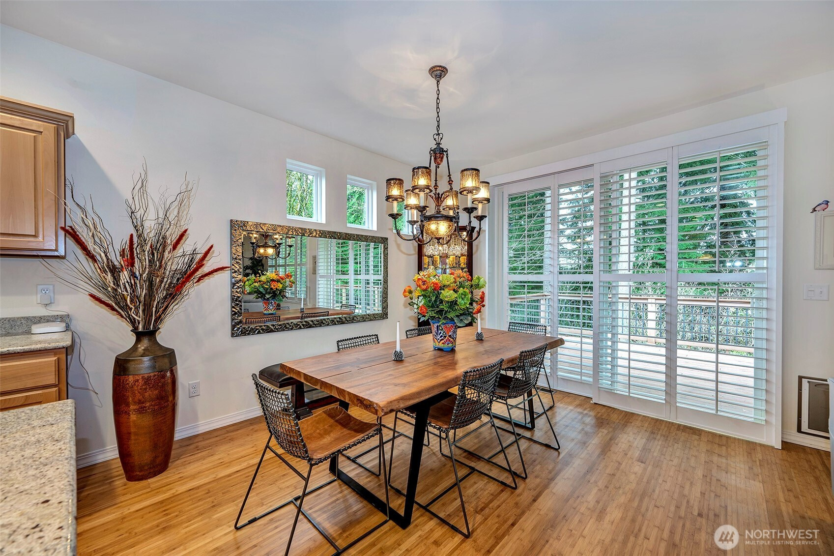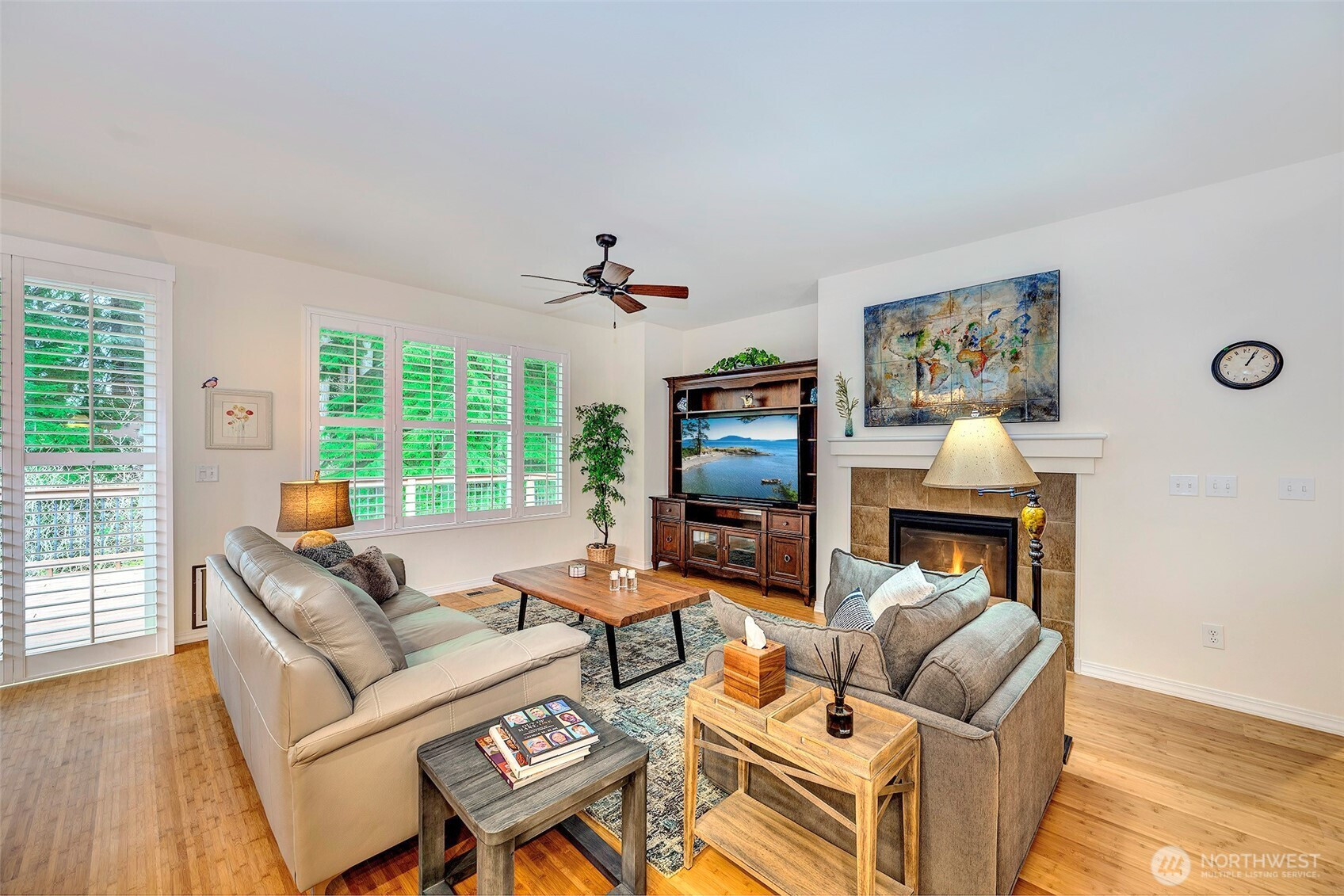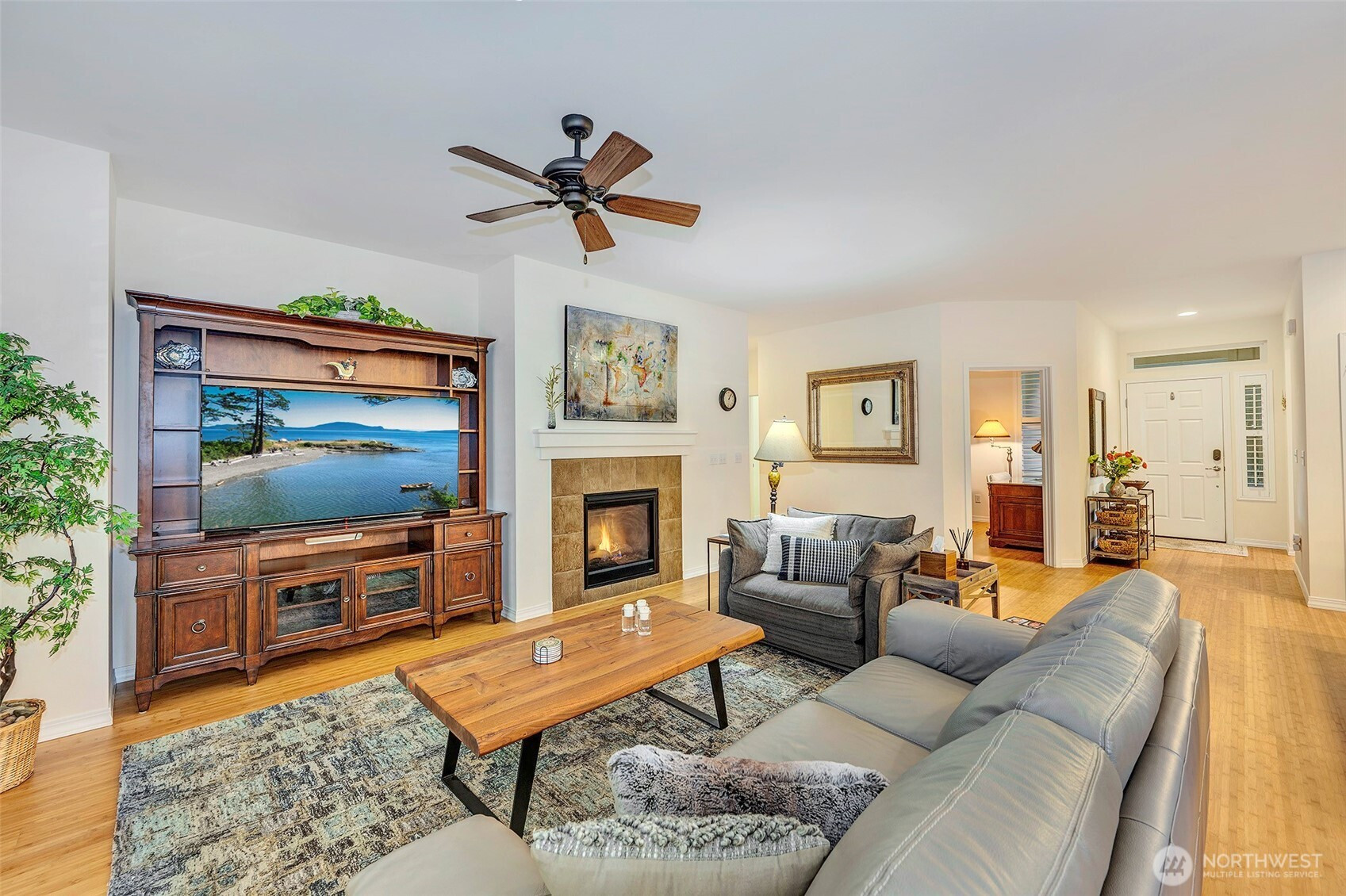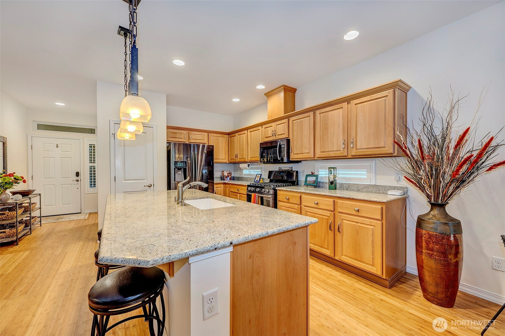 Experience resort-style living in the premier 55+ community of Trilogy at Redmond Ridge. Ideally located just blocks from the clubhouse and directly across from the 16th tee box, this meticulously maintained Vashon floor plan offers the perfect blend of casual elegance. Sited on a beautiful greenbelt lot, the home captures serene, nature-filled views from nearly every room. A covered entry welcomes guests into a warm, inviting interior featuring designer finishes and a sophisticated color palette throughout. Just off the entry, a private guest suite with an adjacent full bath provides ideal accommodation for visitors. Freshly refinished bamboo hardwood floors flow seamlessly through the open-concept great room, where expansive picture windows frame tranquil forest views. The island kitchen is well-appointed with maple cabinetry, granite countertops, breakfast bar, and ample workspace. The spacious primary suite with bay window includes an en-suite bath and walk-in closet, A private office provides the perfect work-from-home or hobby space. Step outside to the oversized, sun-filled deck, an ideal setting for relaxing or entertaining. Finished two-car garage features an easy-care epoxy floor and built-in storage cabinetry. Additional highlights include a new roof (2022), plantation shutters, and central A/C. Residents enjoy exceptional amenities, including a clubhouse, fitness center, pickleball and tennis courts, and more, all within a vibrant, active community.