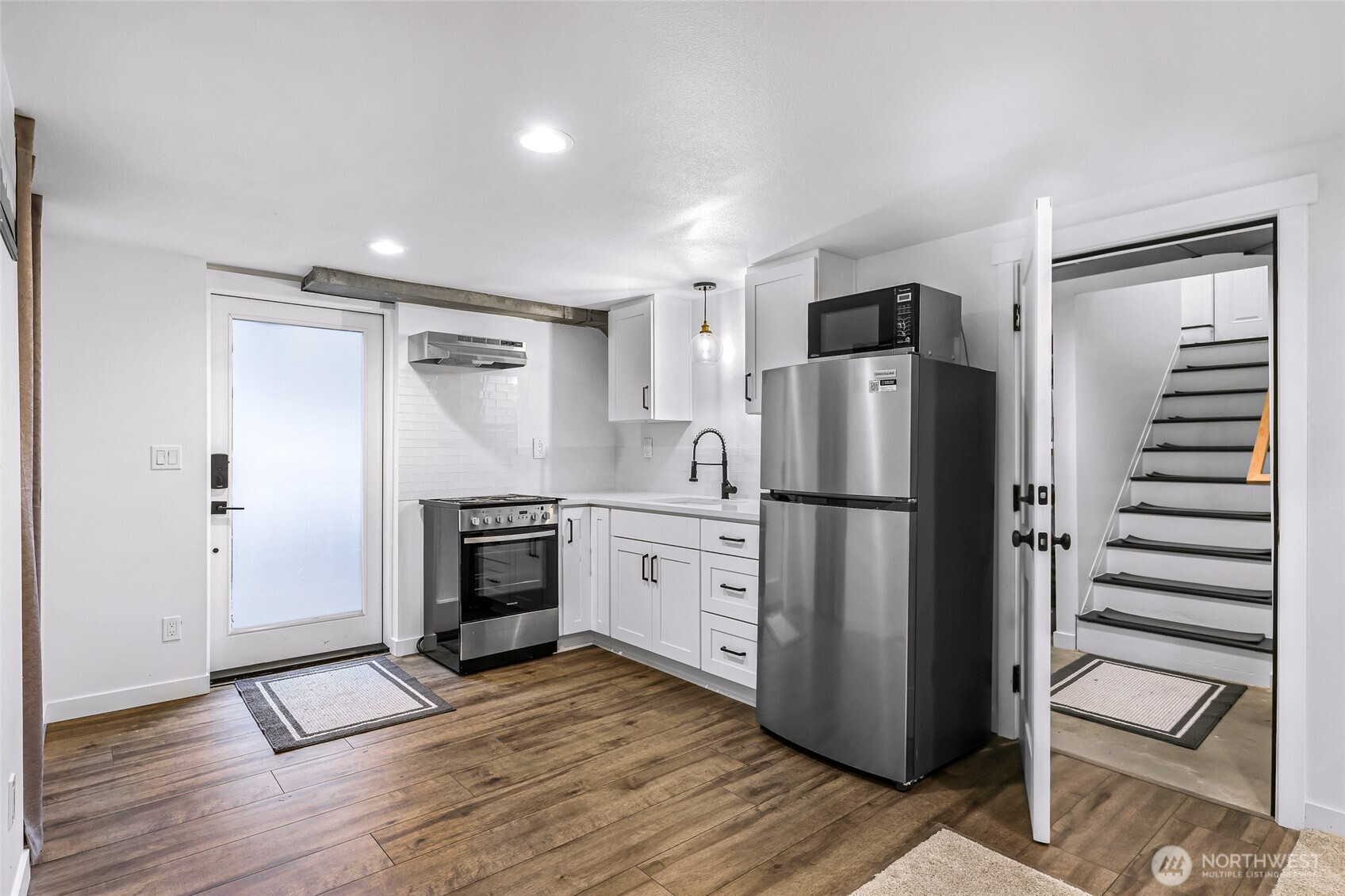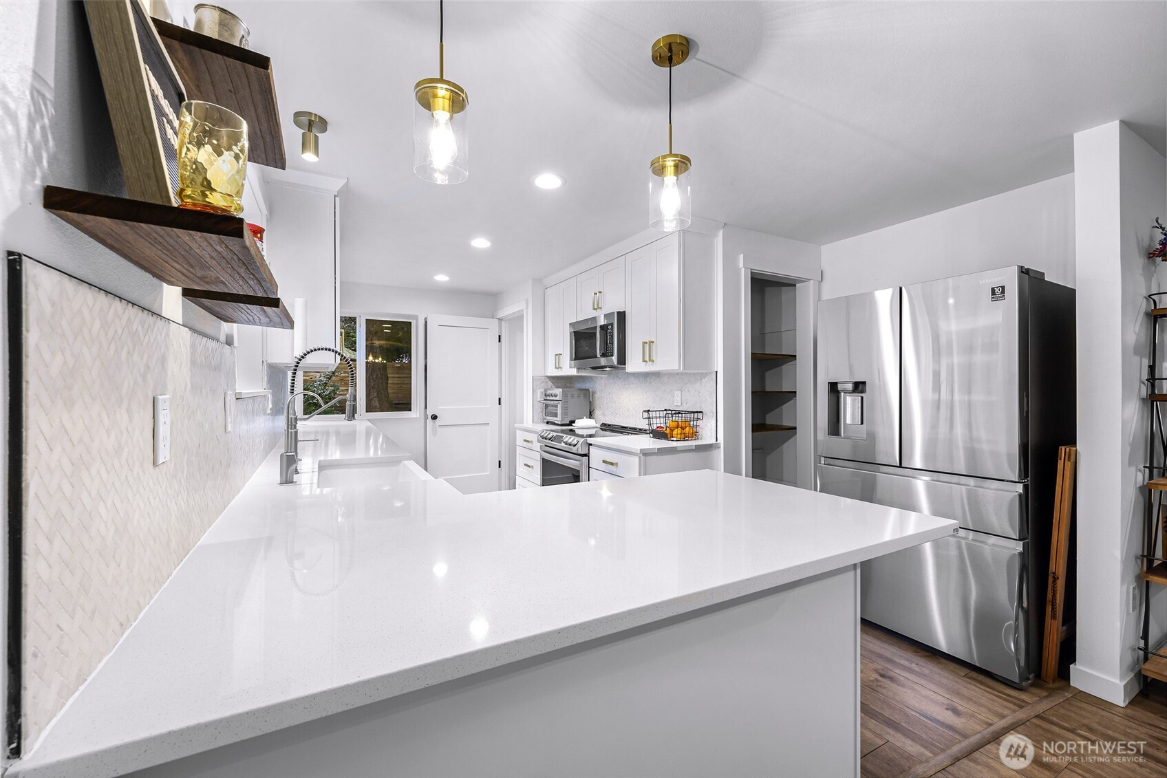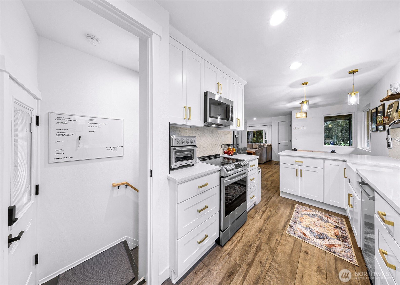 Step inside and feel the ease of truly turnkey living in the quiet and convenient neighborhood of Pinehurst. Reimagined in 2022, the main floor opens into a modern living space with warm LVP floors, a cozy fireplace, and bay window. With long quartz counters, the fresh kitchen is perfect for everyday cooking or weekend gatherings. Three comfortable bedrooms, a tiled ¾ bath, and a powder room offer effortless main-level living. Downstairs, a second living area with its own entrance, fireplace, kitchen area, and full bath creates incredible flexibility—ideal for guests or multigenerational living. Newer plumbing, electrical heat pump and a new roof in 2025 add peace of mind. All this is just minutes from light-rail and an easy commute!