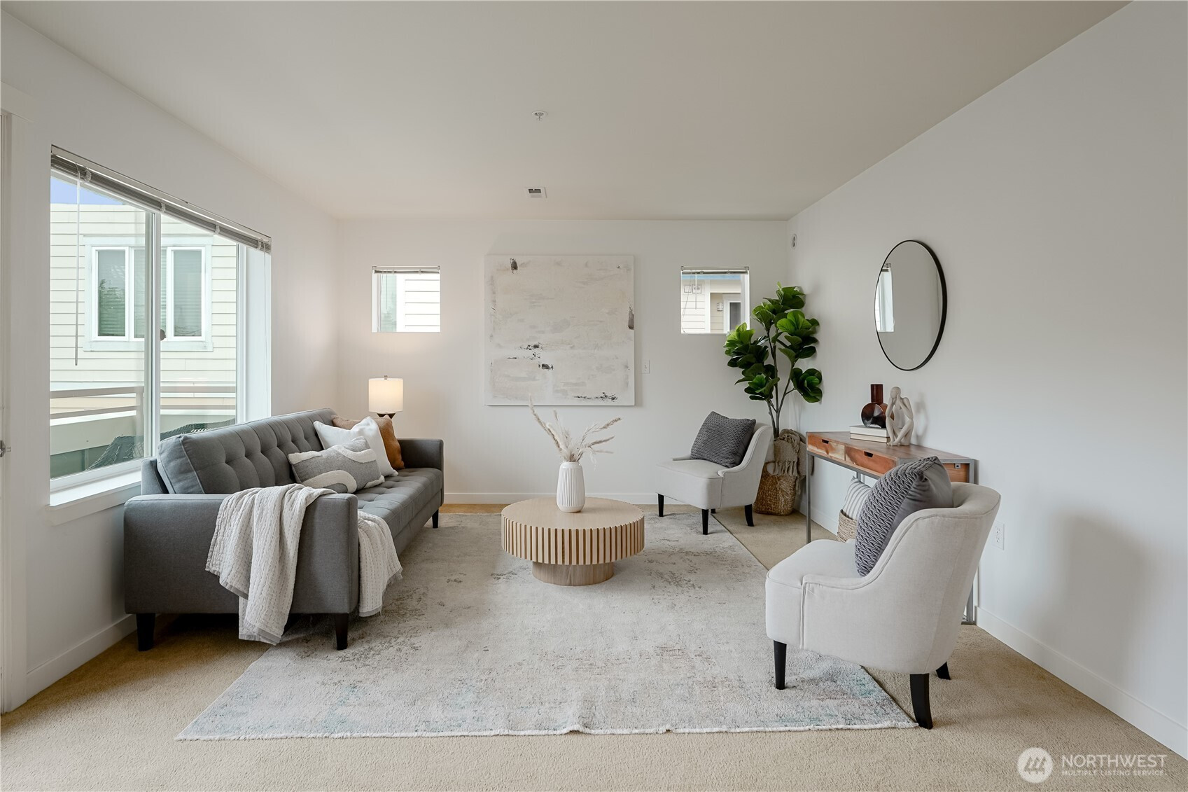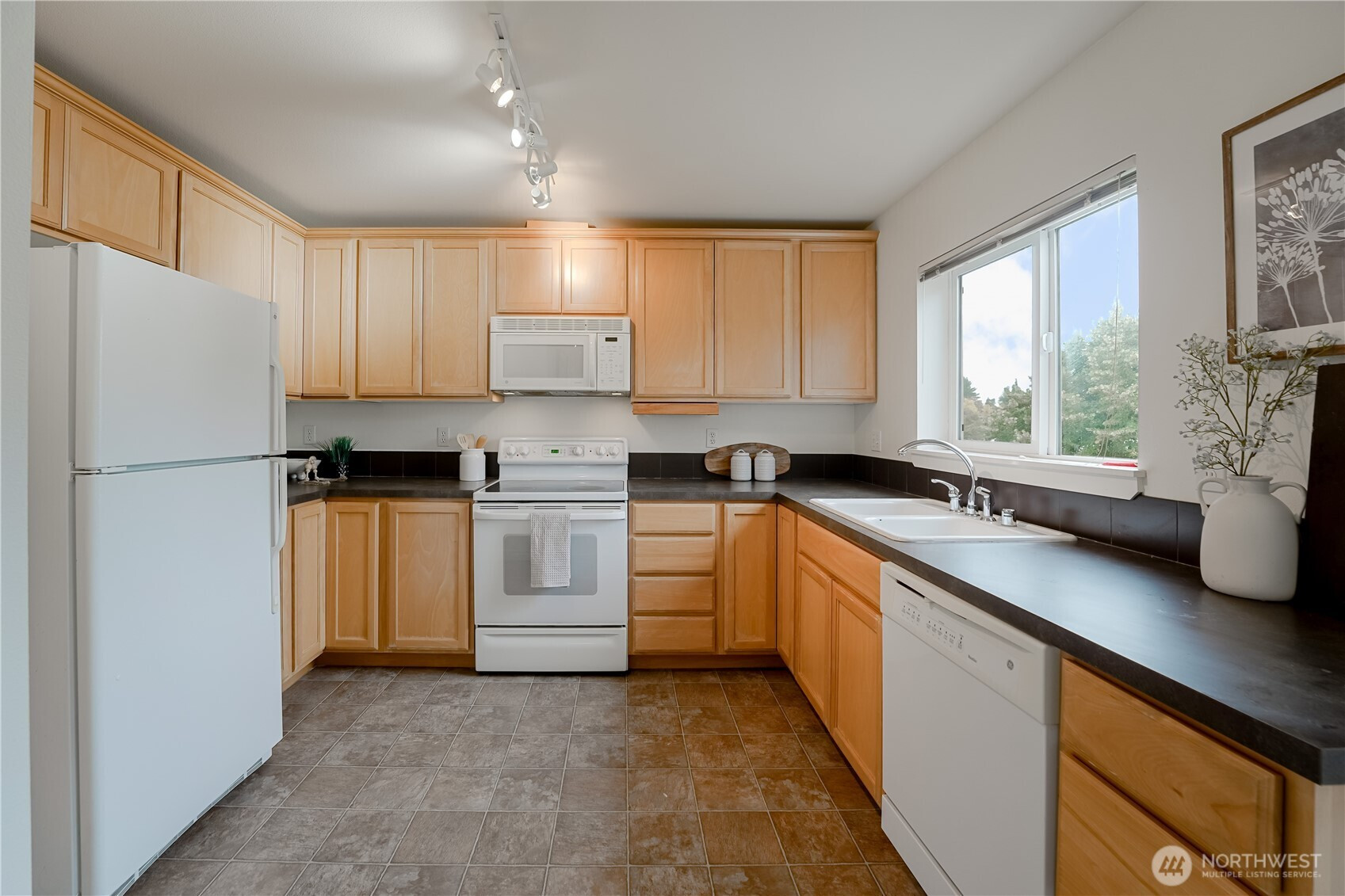 Top-floor, end-unit condo lives large with abundant natural light and west-facing windows that fill the space with warmth. The open kitchen with extensive cabinetry flows into a spacious living and dining area and a private deck for fresh air and relaxation. Featuring 2 bedrooms and 1.75 baths, the primary suite offers three closets and an en-suite; the second bedroom includes a walk-in closet. In-unit washer/dryer, elevator access with no stairs, and two secure parking spaces add everyday ease. Pet-friendly, well-managed building with strong reserves and no rental cap. Near groceries, parks, dining, I-5, and the future Pinehurst Light Rail Station (2026).