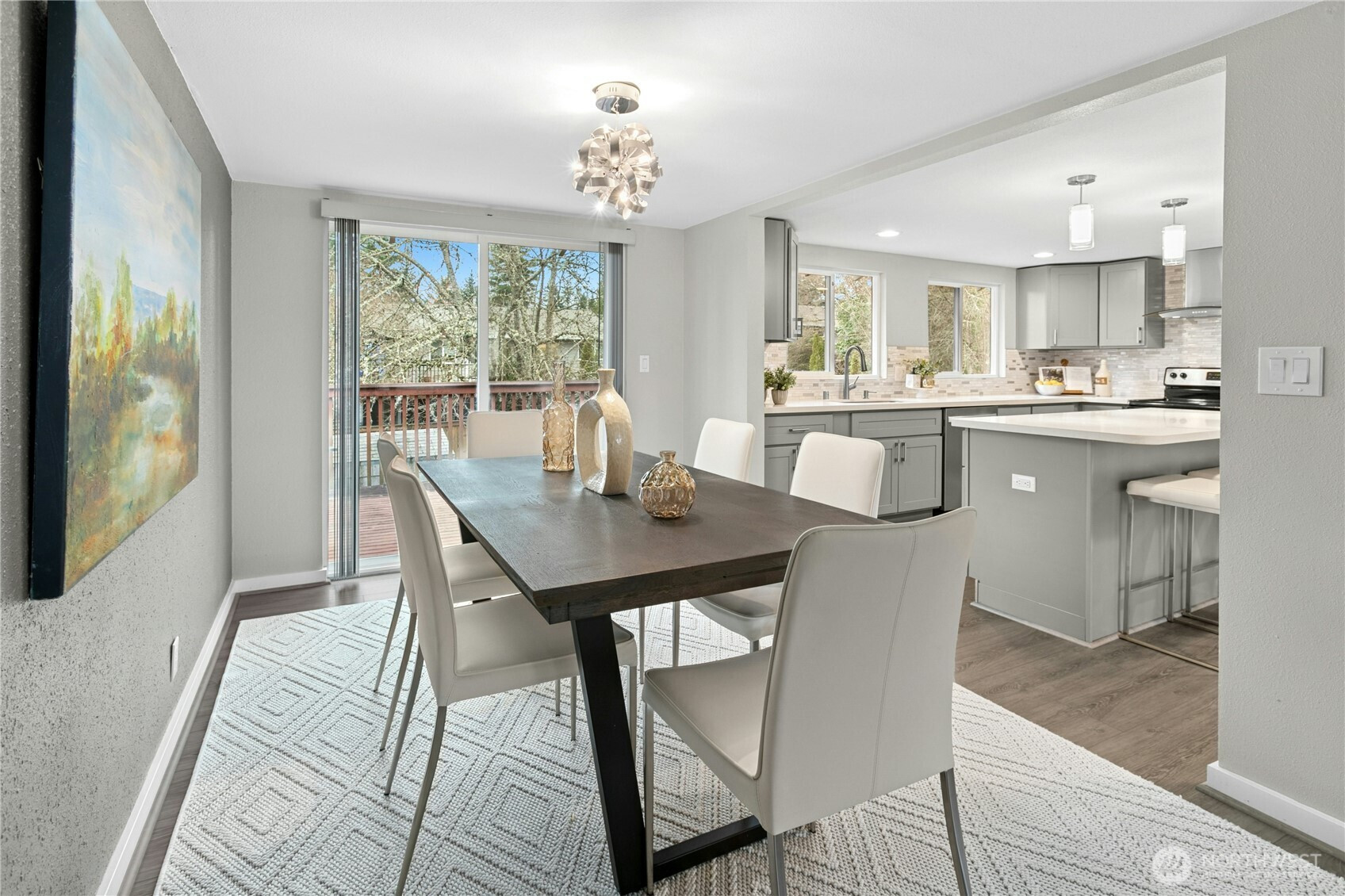 Beautifully maintained and thoughtfully updated home in a sought-after Newcastle cul-de-sac! This spacious 5-bedroom, 2.75-bath residence offers 2,710 sq ft of flexible living space on a 7,841 sq ft lot. Designed for modern living, the light-filled upper level features new luxury vinyl plank flooring and a stylish open-concept kitchen with quartz counters, tile backsplash, stainless steel appliances, and generous prep space. The dining area flows seamlessly to an expansive deck—perfect for entertaining, summer evenings, or morning coffee. Large windows, updated lighting, and a cozy fireplace create a warm yet contemporary atmosphere.The lower level offers exceptional versatility, with a spacious bonus/living area, two additional bedrooms, and a laundry room—ideal for guests, a home office, a gym, or a media space. Fresh exterior paint and a covered entry enhance curb appeal, while the peaceful dead-end location offers privacy and quiet.Minutes to parks, trails, shopping, highly rated schools, I-405, and an easy commute to Bellevue and Seattle. A home that balances lifestyle, location, and livability—welcome home!