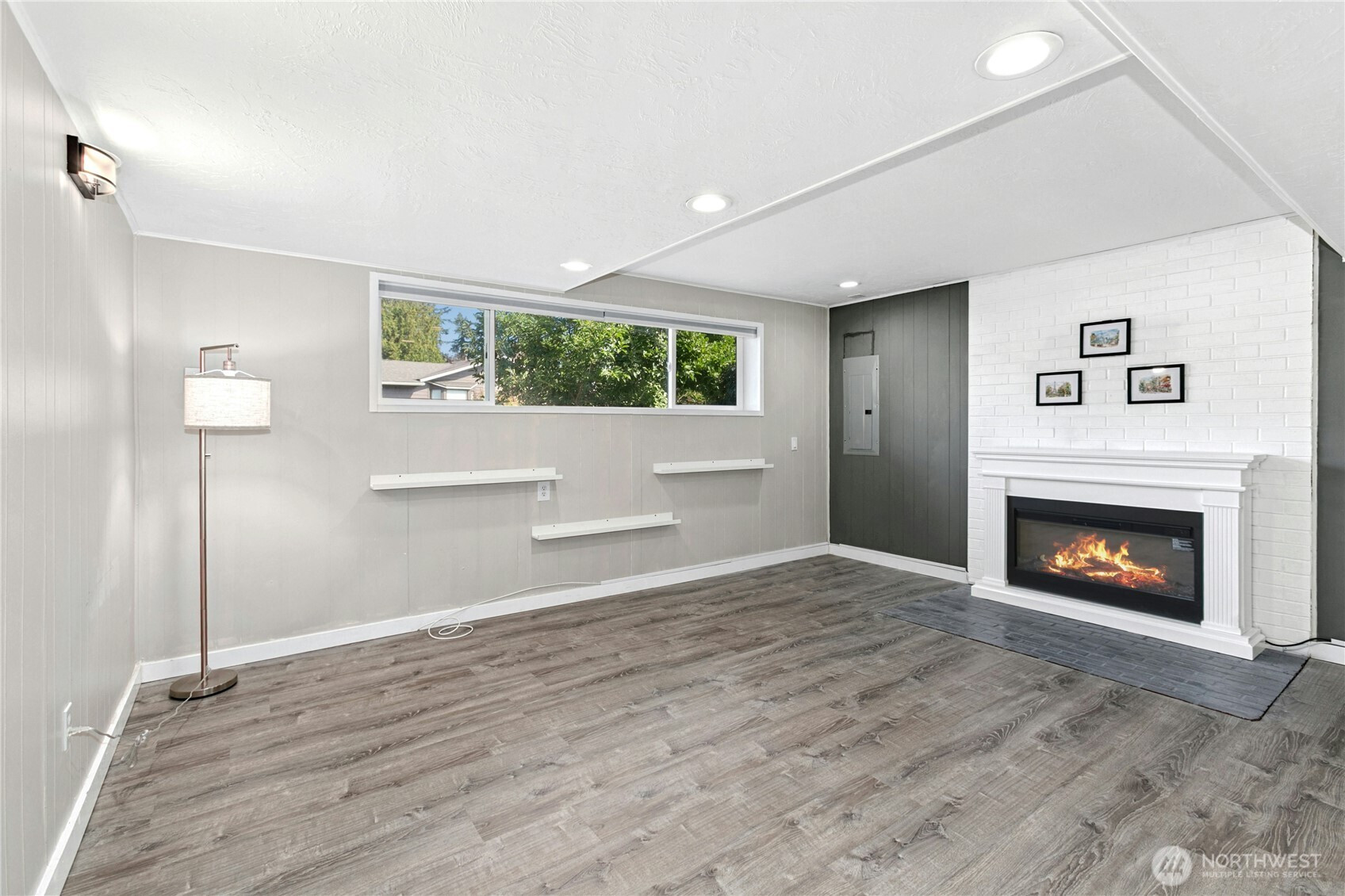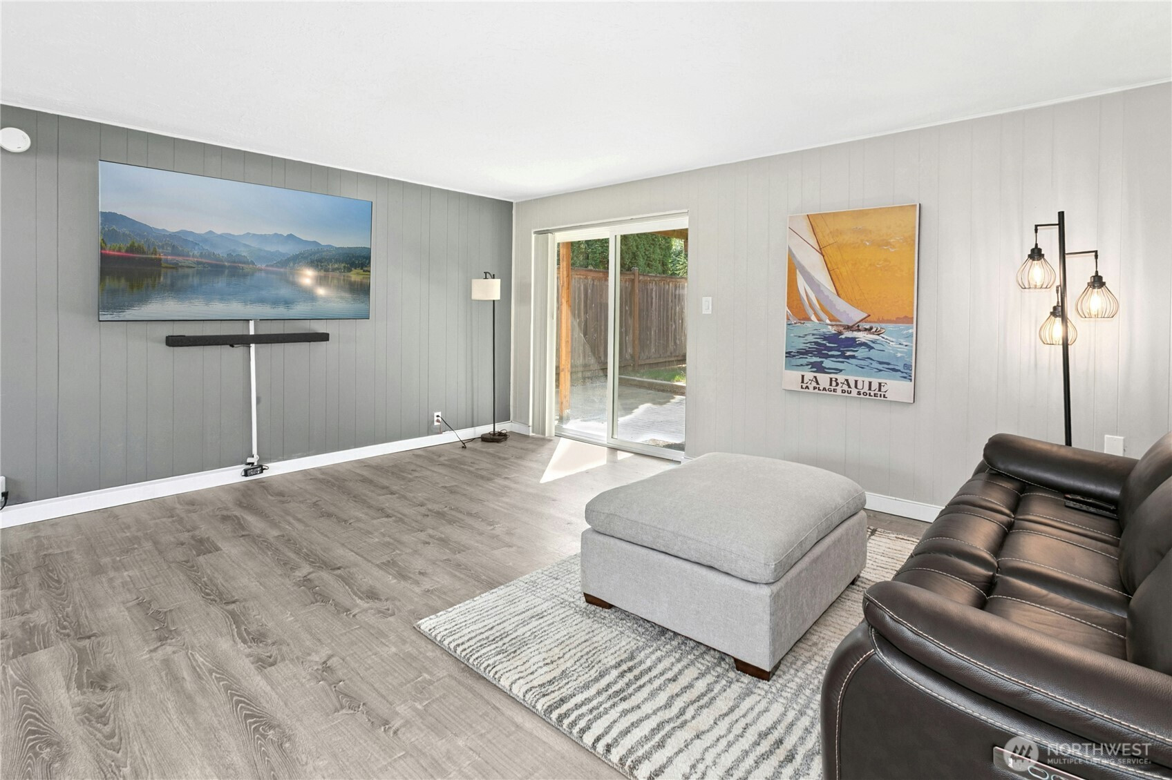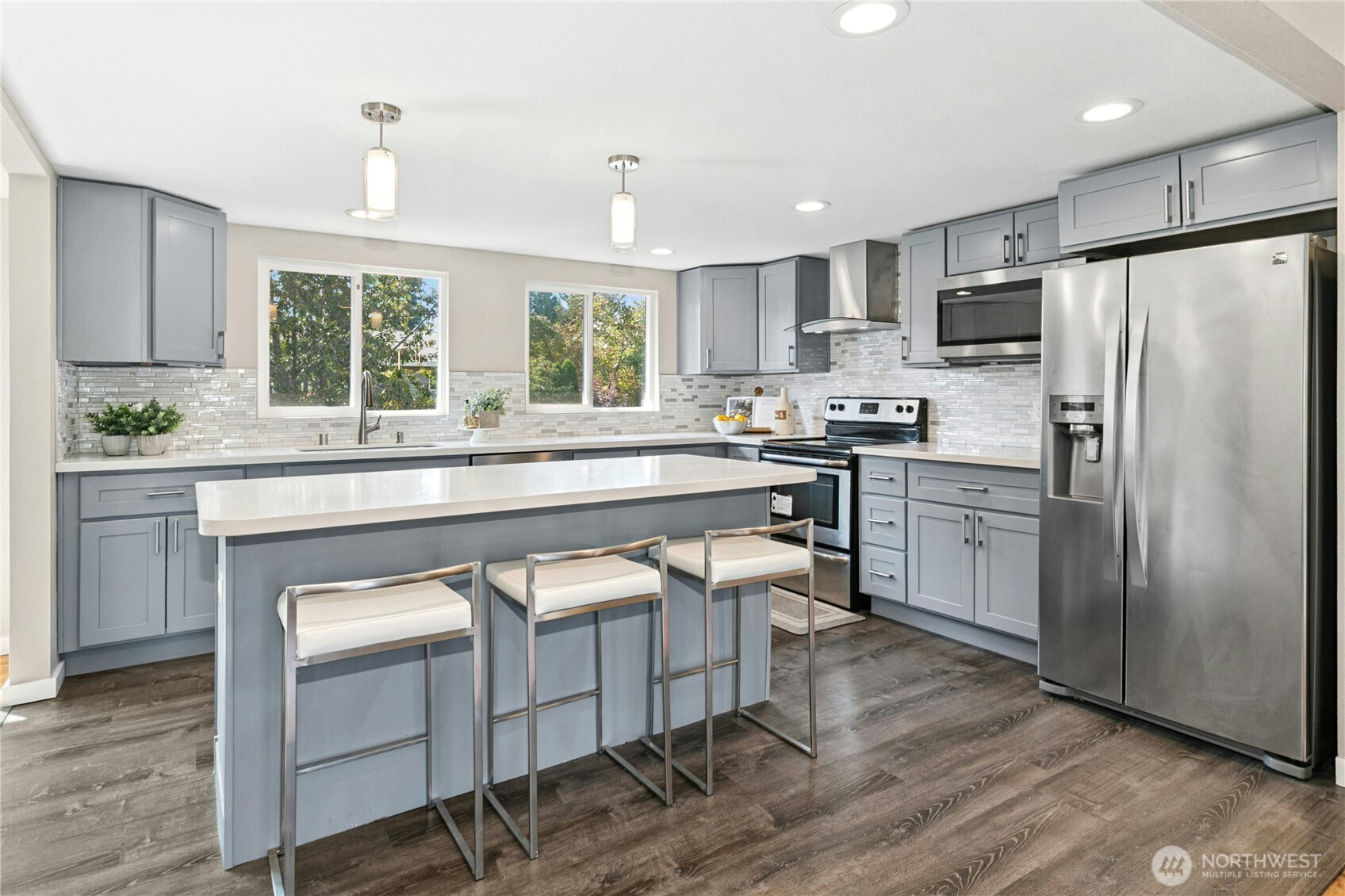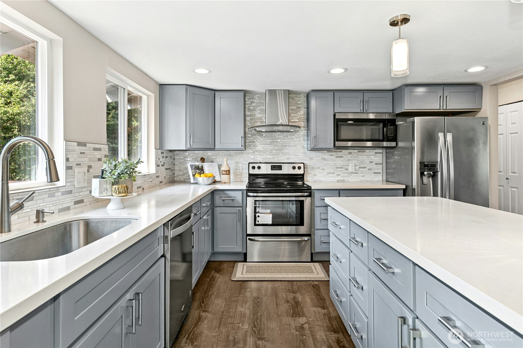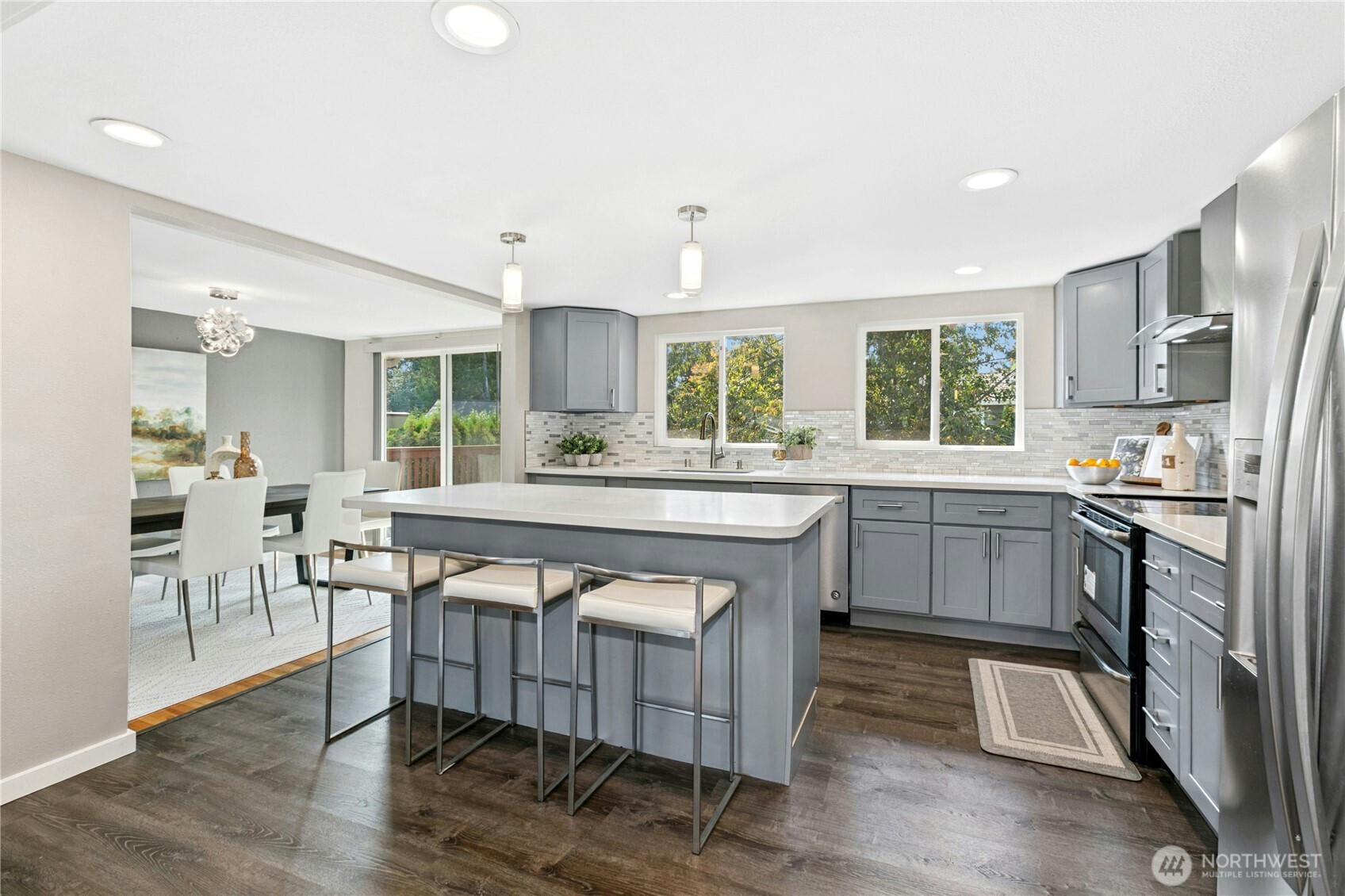 Beautifully maintained home in sought-after Newcastle cul-de-sac location! This spacious 5-bedroom, 2.75-bath home offers 2,710 sqft of living space on a level 7,841 sqft lot. Light-filled upper-level features gleaming hardwood floors, a modern open-concept kitchen with quartz counters, tile backsplash, and stainless-steel appliances. Dining area opens to an expansive deck—ideal for entertaining. Large windows, updated lighting, and cozy fireplace complete the living space. Lower level includes flexible bonus/living space, 2 bedrooms and laundry. Updated main bath and stylish kitchen. Fresh exterior appeal with contemporary paint and covered entry. Peaceful dead-end street just minutes from parks, schools, shopping, and I-405. Welcome home!