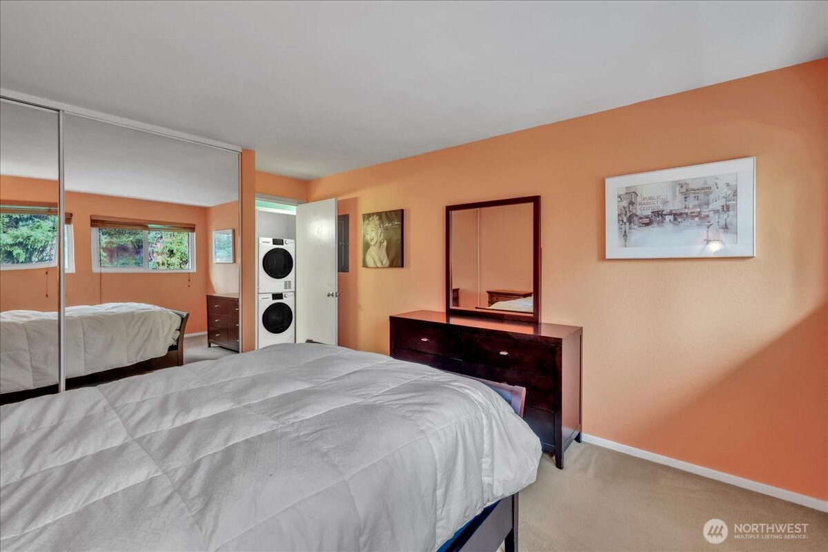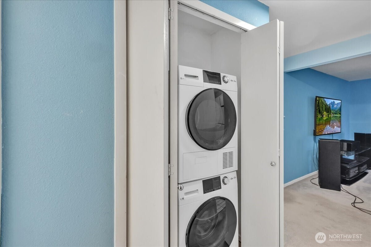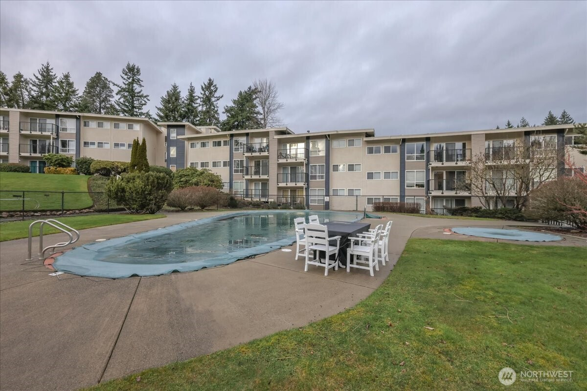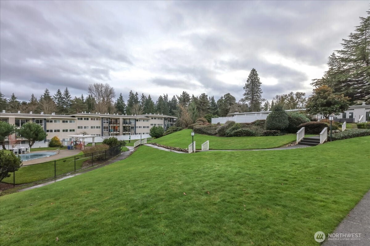 Enjoy the convenience of living in a complex that is conveniently located, surrounded by mature landscape in the heart of Bellevue!. Beautifully landscaped grounds complete with walkways, swimming pool and hot tub with plenty of lounging area, Cabana with exercise room, game room and kitchen as each building in the complex overlooks this tranquil centerpiece. Cozy Top floor one bedroom unit features a remodeled bathroom, newer appliances, new hot water tank, new washer & dryer. Secured Building. New textured ceiling throughout condo. Many updates include new roofs, balconies, elevators, exterior paint, carports, elevators and some plumbing. No special assessment. Well run condominium complex with high owner occupancy. Cats and dogs allowed with no restrictions. Deeded carport space included. EV charging station.