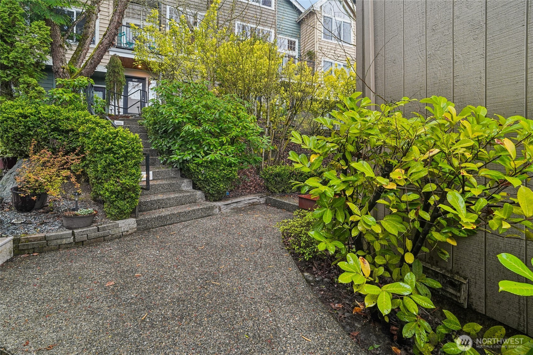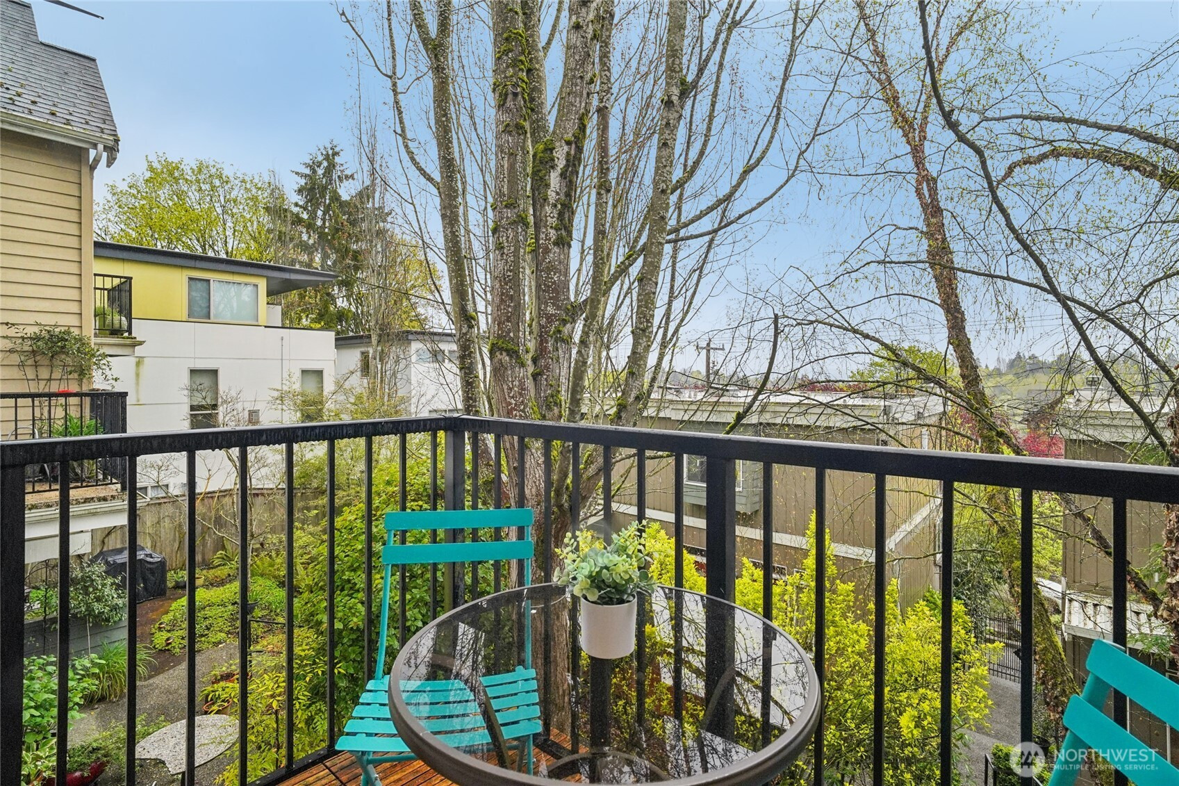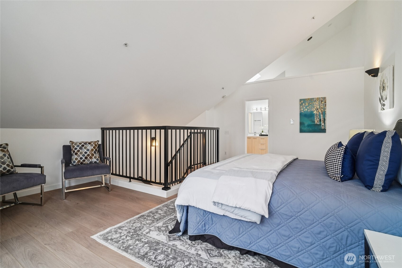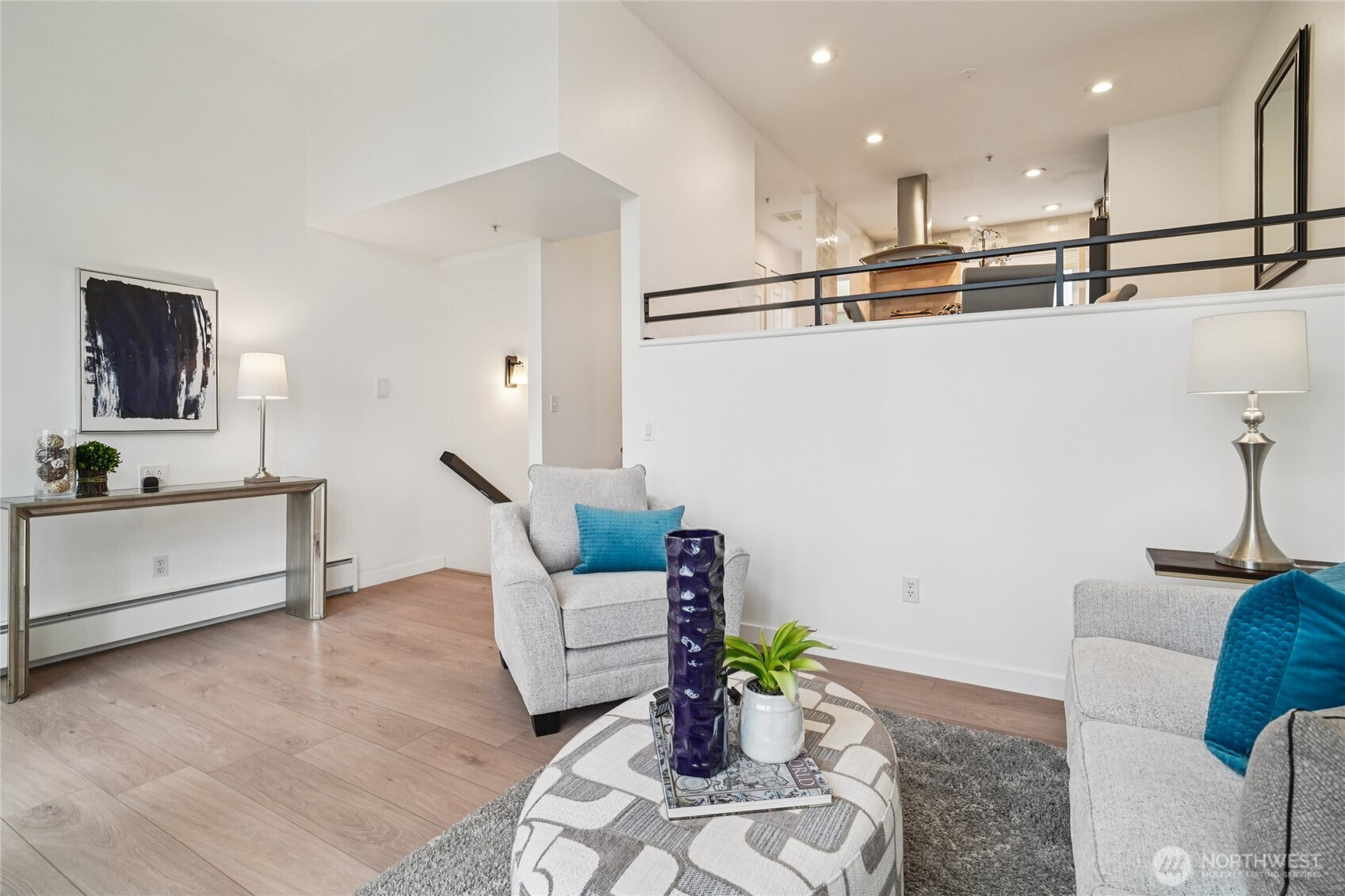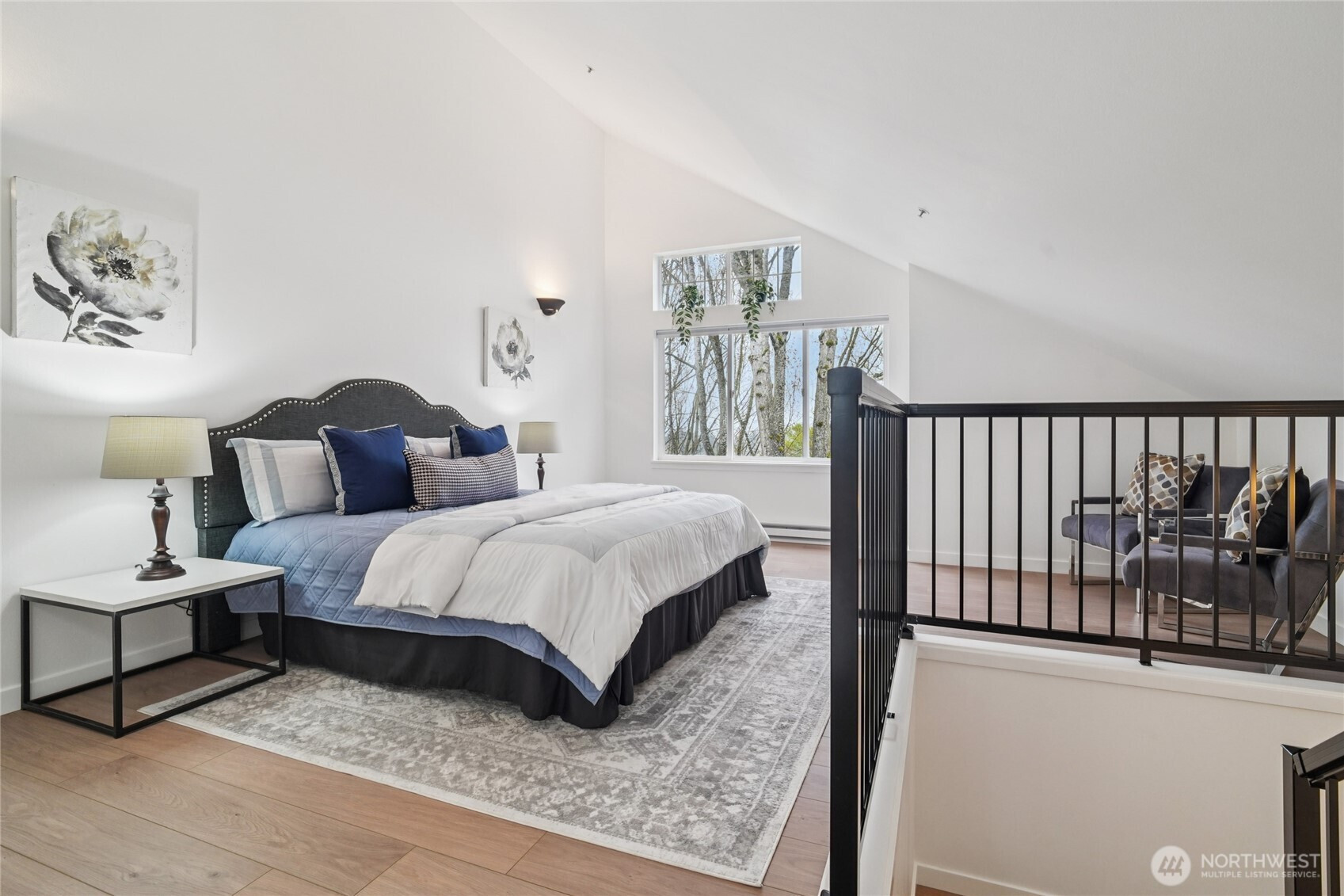 Extensively remodeled 2 Bed/ 2 Bath townhome tucked away in a boutique gated community centrally located in the desirable Madison Valley neighborhood. Entry leads to the first level, which has one bedroom (or home office) with French doors opening to the front patio as well as a full bath down the hall. Stairs lead up to the primary living space, which features a desirable open floor plan, soaring ceilings, and tons of natural light. Completely updated kitchen with modern finishes including quartz counters, sleek black cabinets, subway tile backsplash, floating shelves and new stainless steel appliances. A sizable pantry plus a laundry closet with a new washer & dryer flank the kitchen. Kitchen opens to the lofted dining area, which overlooks the spacious and bright living room. Entire top floor boasts a huge primary suite with vaulted ceilings, a large walk-in closet, and a completely remodeled en-suite bath. Wake up to the beautiful sunrise and easterly views of the Cascades, Mt. Rainier, and Lake WA. Additional updates include luxury vinyl flooring, fresh interior paint, new baseboard heaters plus smart thermostats throughout. Covered balcony off the living room is a great space for a BBQ or outdoor seating. A one car attached garage with EV charging provides secure parking and additional storage space. No HOA Dues or rental restrictions. Outstanding location with easy access to shops, restaurants, parks and freeways!