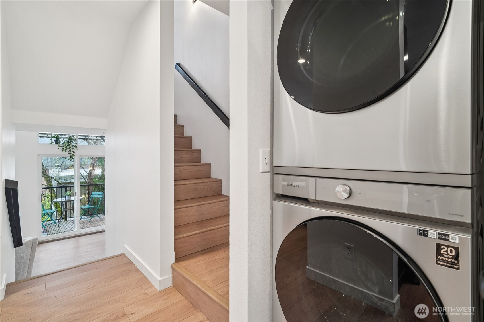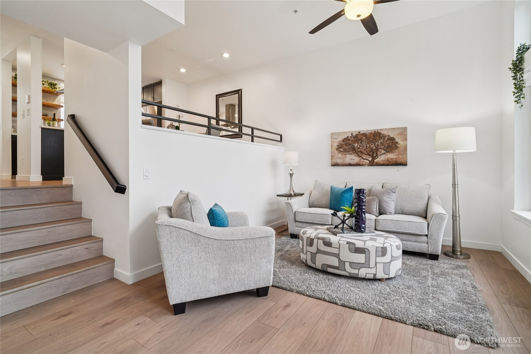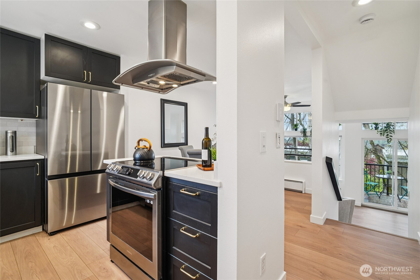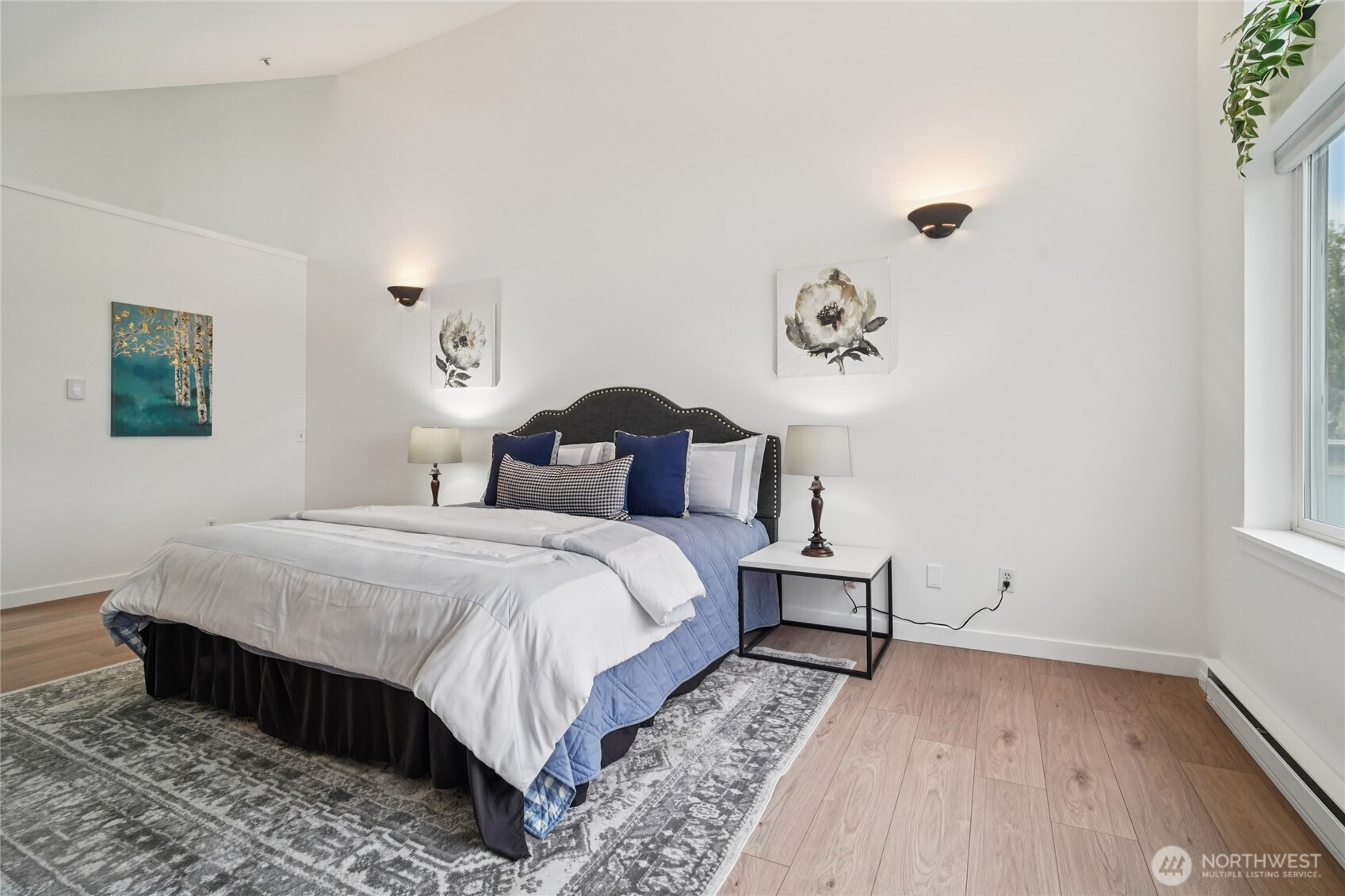 Extensively remodeled 2 Bed/ 2 Bath townhome tucked away in a boutique gated community centrally located in the desirable Madison Valley neighborhood. Entry leads to the first level, which has one bedroom (or home office) with French doors opening to the front patio as well as a full bath down the hall. Stairs lead up to the primary living space, which features a desirable open floor plan, soaring ceilings, and tons of natural light. Completely updated kitchen with modern finishes including quartz counters, sleek black cabinets, subway tile backsplash, floating shelves and new stainless steel appliances. A sizable pantry plus a laundry closet with a new washer & dryer flank the kitchen. Kitchen opens to the lofted dining area, which overlooks the spacious and bright living room. Entire top floor boasts a huge primary suite with vaulted ceilings, a large walk-in closet, and a completely remodeled en-suite bath. Wake up to the beautiful sunrise and easterly views of the Cascades, Mt. Rainier, and Lake WA. Additional updates include luxury vinyl flooring, fresh interior paint, new baseboard heaters plus smart thermostats throughout. Covered balcony off the living room is a great space for a BBQ or outdoor seating. A one car attached garage with EV charging provides secure parking and additional storage space. No HOA Dues or rental restrictions. Outstanding location with easy access to shops, restaurants, parks and freeways!