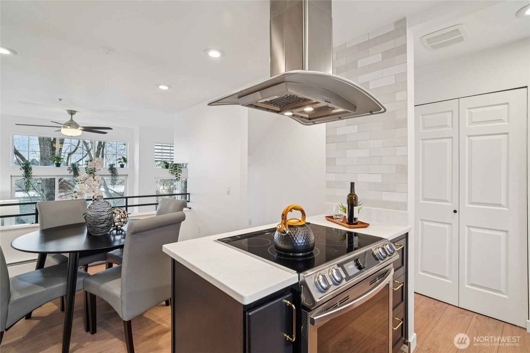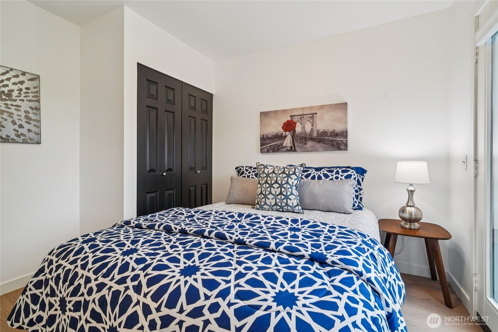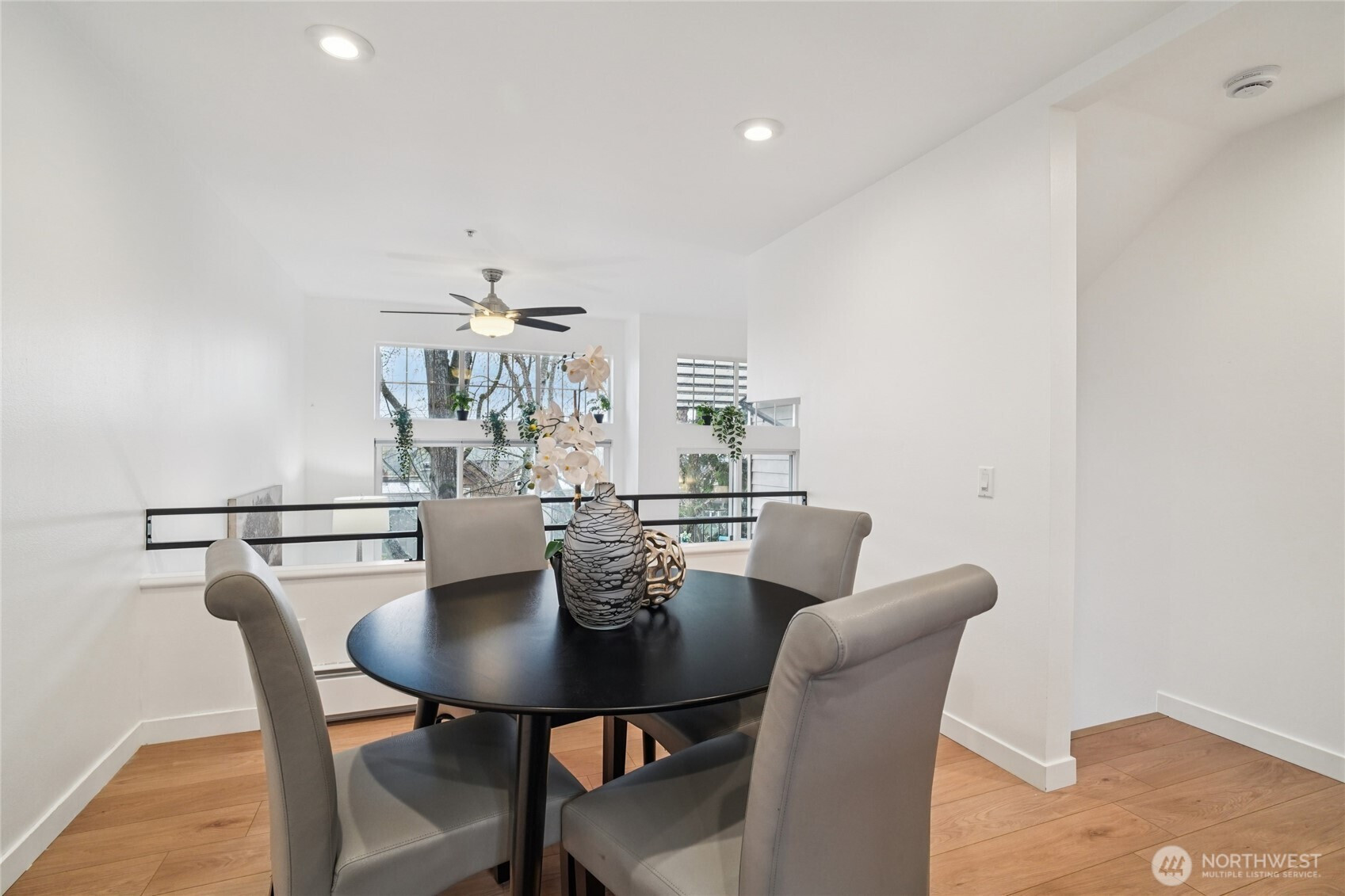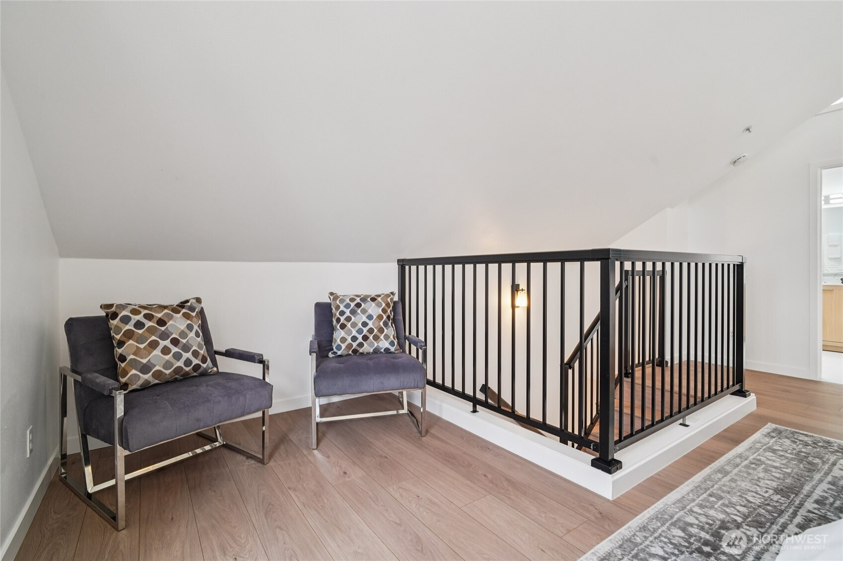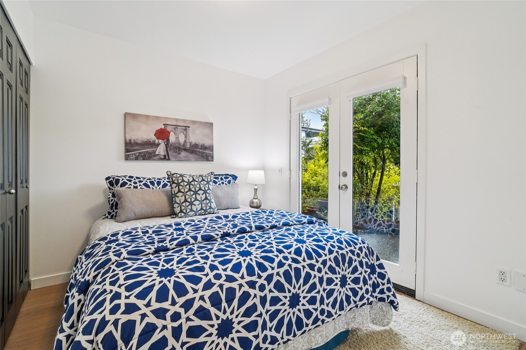 Extensively remodeled 2 Bed/ 2 Bath townhome tucked away in a boutique gated community centrally located in the desirable Madison Valley neighborhood. Entry leads to the first level, which has one bedroom (or home office) with French doors opening to the front patio as well as a full bath down the hall. Stairs lead up to the primary living space, which features a desirable open floor plan, soaring ceilings, and tons of natural light. Completely updated kitchen with modern finishes including quartz counters, sleek black cabinets, subway tile backsplash, floating shelves and new stainless steel appliances. A sizable pantry plus a laundry closet with a new washer & dryer flank the kitchen. Kitchen opens to the lofted dining area, which overlooks the spacious and bright living room. Entire top floor boasts a huge primary suite with vaulted ceilings, a large walk-in closet, and a completely remodeled en-suite bath. Wake up to the beautiful sunrise and easterly views of the Cascades, Mt. Rainier, and Lake WA. Additional updates include luxury vinyl flooring, fresh interior paint, new baseboard heaters plus smart thermostats throughout. Covered balcony off the living room is a great space for a BBQ or outdoor seating. A one car attached garage with EV charging provides secure parking and additional storage space. No HOA Dues or rental restrictions. Outstanding location with easy access to shops, restaurants, parks and freeways!