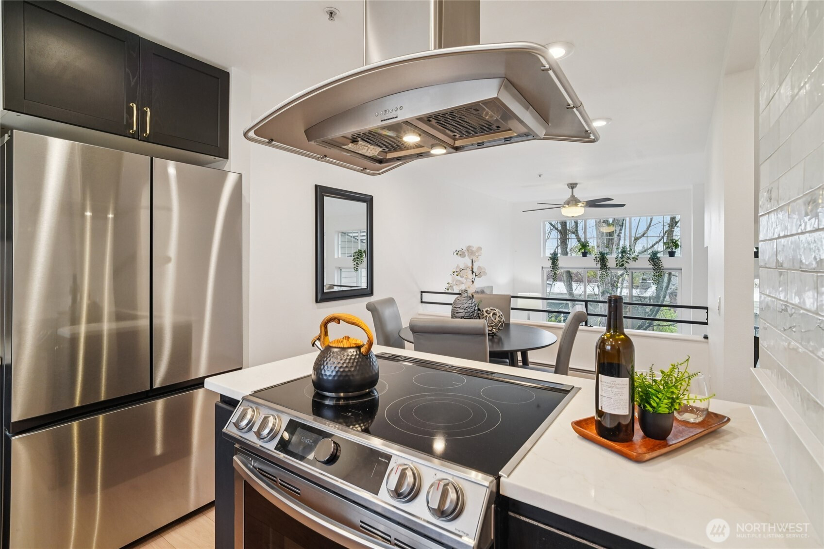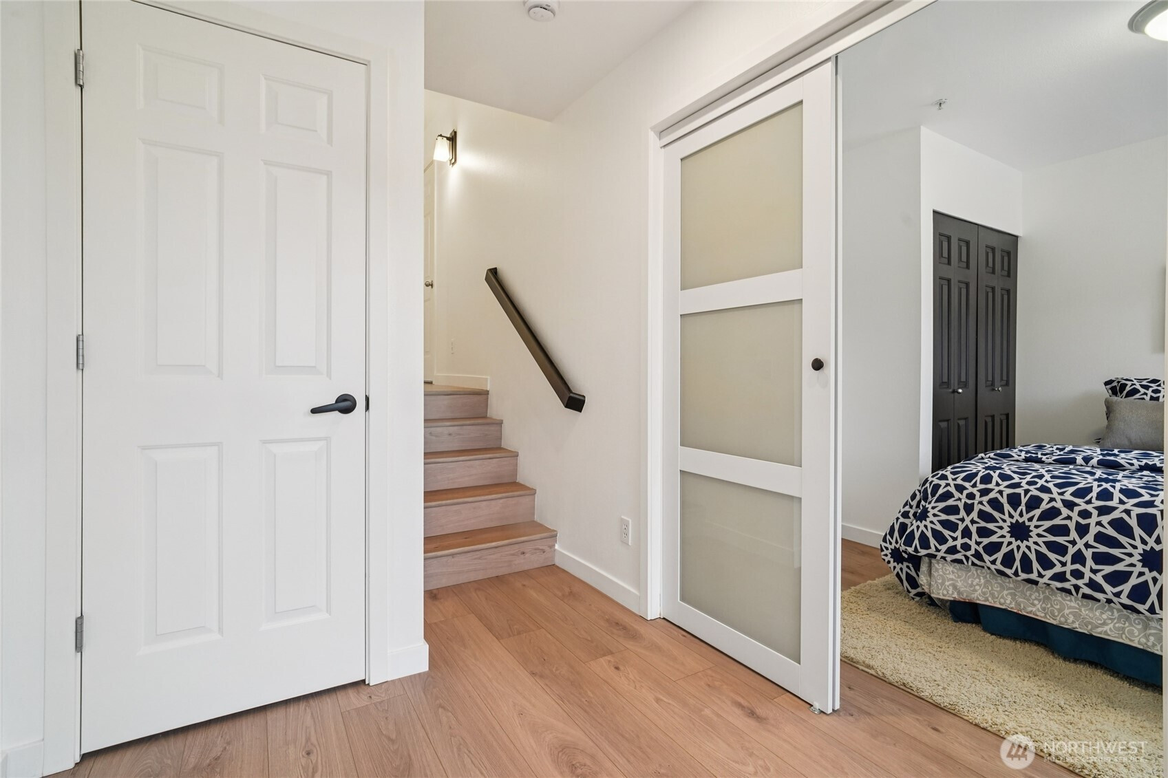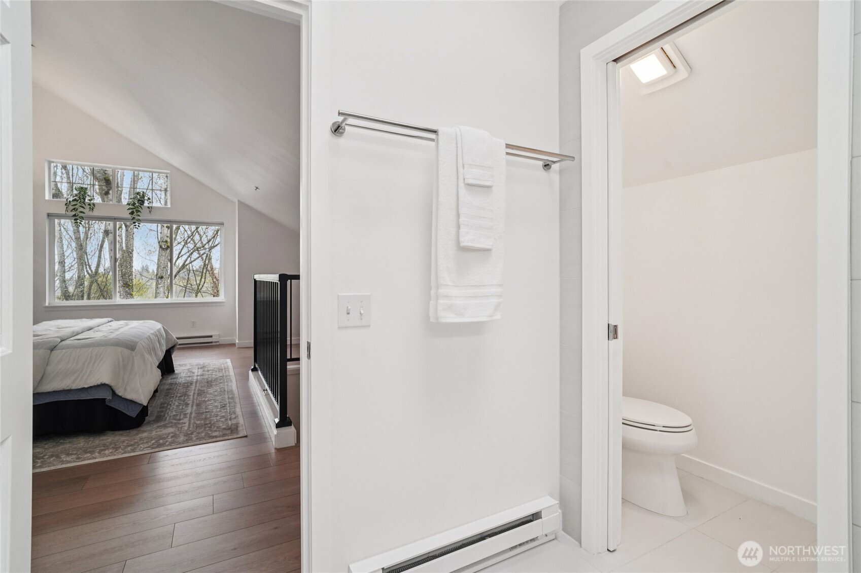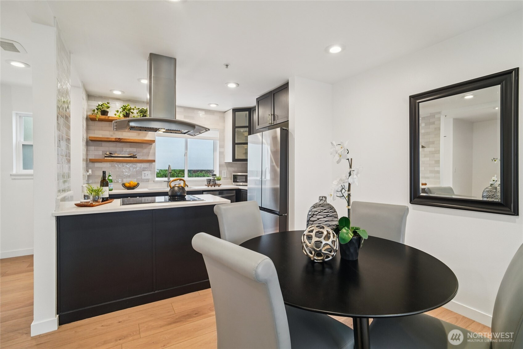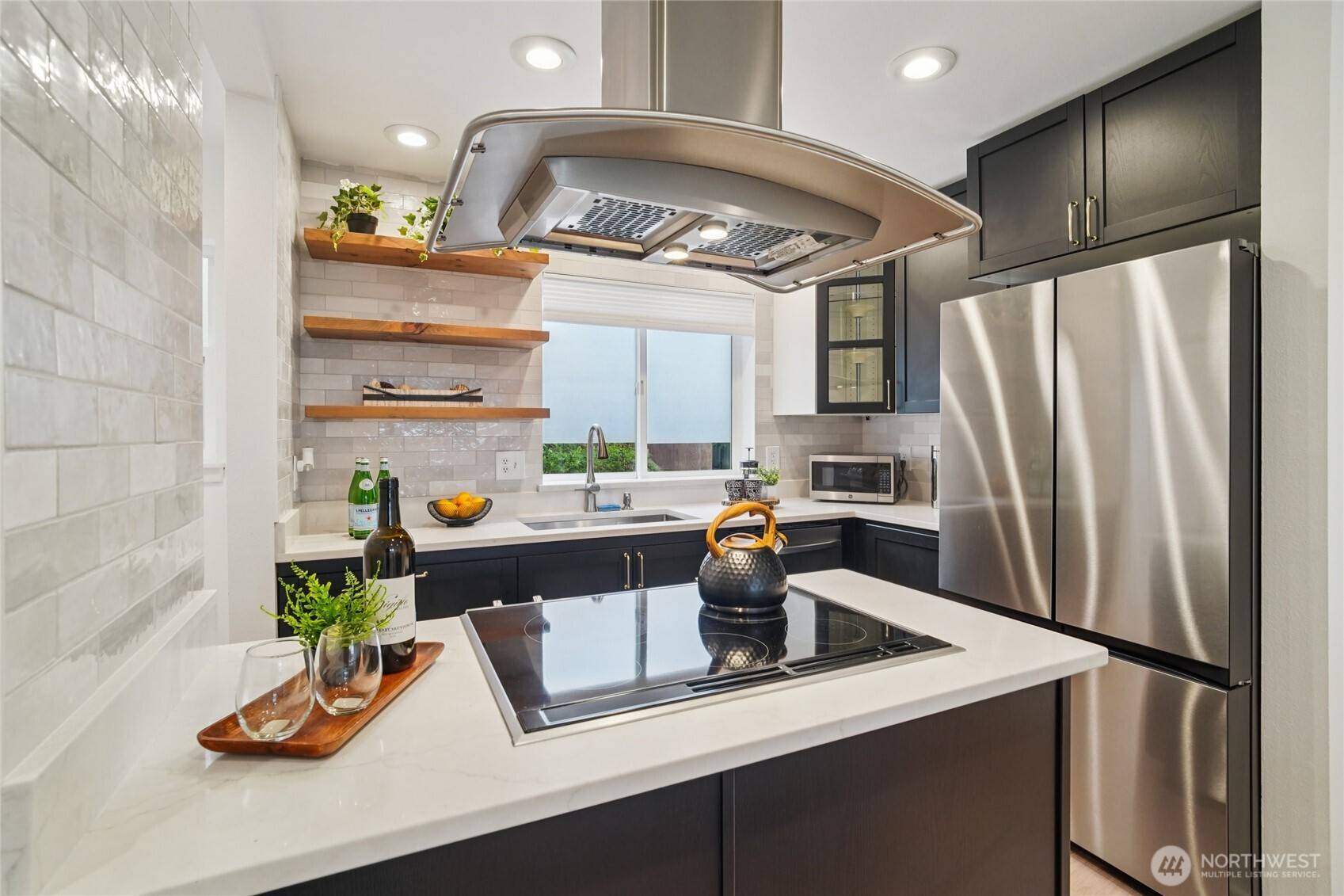 Extensively remodeled 2 Bed/ 2 Bath townhome tucked away in a boutique gated community centrally located in the desirable Madison Valley neighborhood. Entry leads to the first level, which has one bedroom (or home office) with French doors opening to the front patio as well as a full bath down the hall. Stairs lead up to the primary living space, which features a desirable open floor plan, soaring ceilings, and tons of natural light. Completely updated kitchen with modern finishes including quartz counters, sleek black cabinets, subway tile backsplash, floating shelves and new stainless steel appliances. A sizable pantry plus a laundry closet with a new washer & dryer flank the kitchen. Kitchen opens to the lofted dining area, which overlooks the spacious and bright living room. Entire top floor boasts a huge primary suite with vaulted ceilings, a large walk-in closet, and a completely remodeled en-suite bath. Wake up to the beautiful sunrise and easterly views of the Cascades, Mt. Rainier, and Lake WA. Additional updates include luxury vinyl flooring, fresh interior paint, new baseboard heaters plus smart thermostats throughout. Covered balcony off the living room is a great space for a BBQ or outdoor seating. A one car attached garage with EV charging provides secure parking and additional storage space. No HOA Dues or rental restrictions. Outstanding location with easy access to shops, restaurants, parks and freeways!