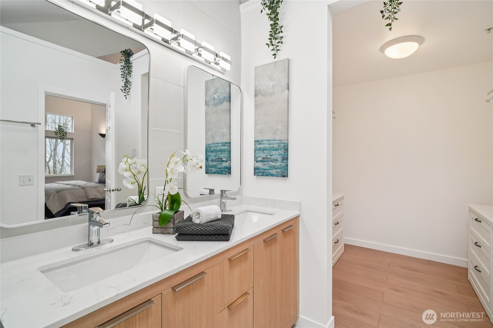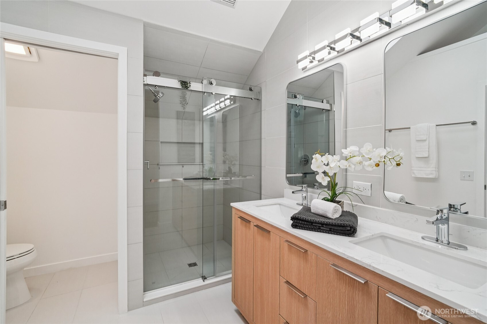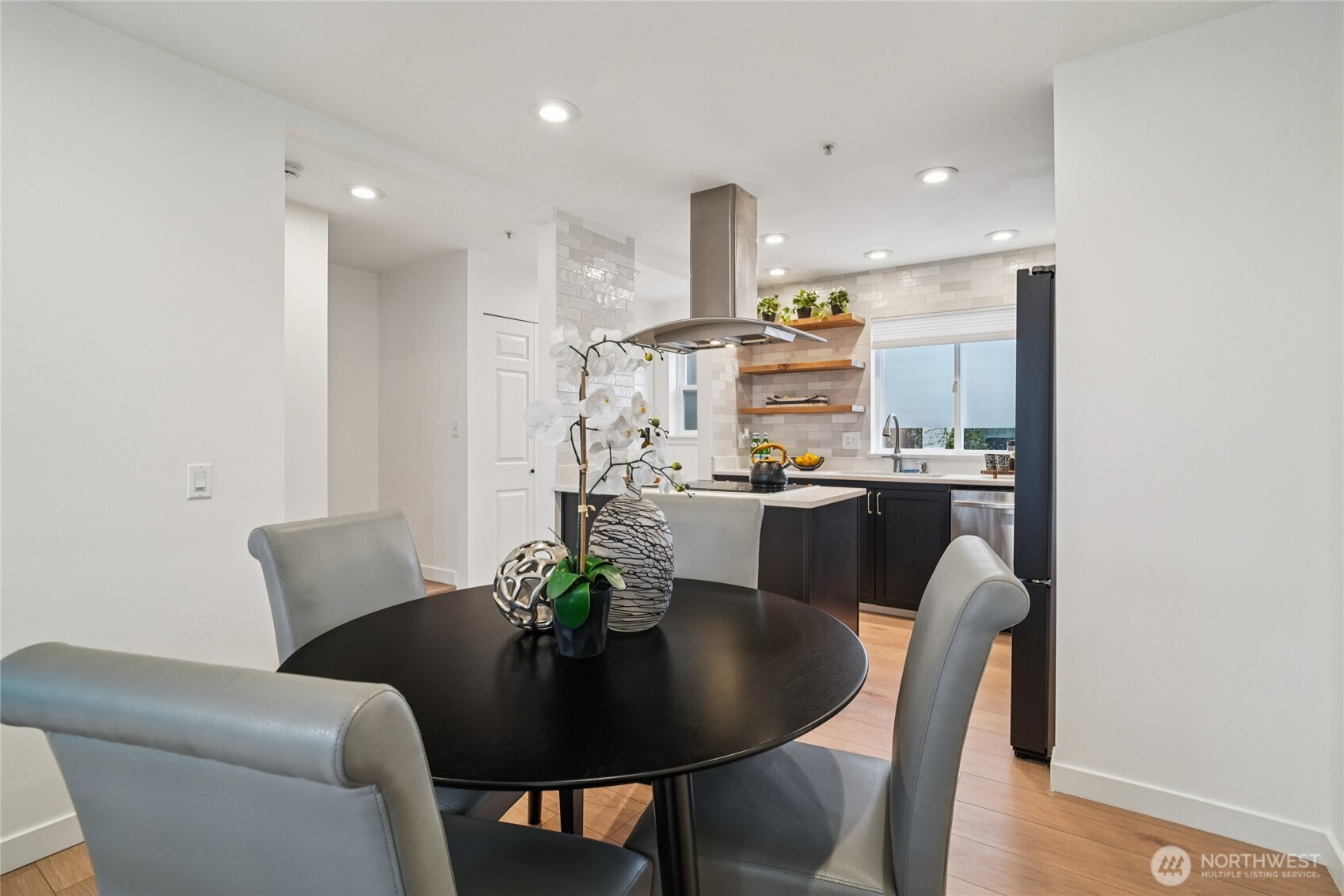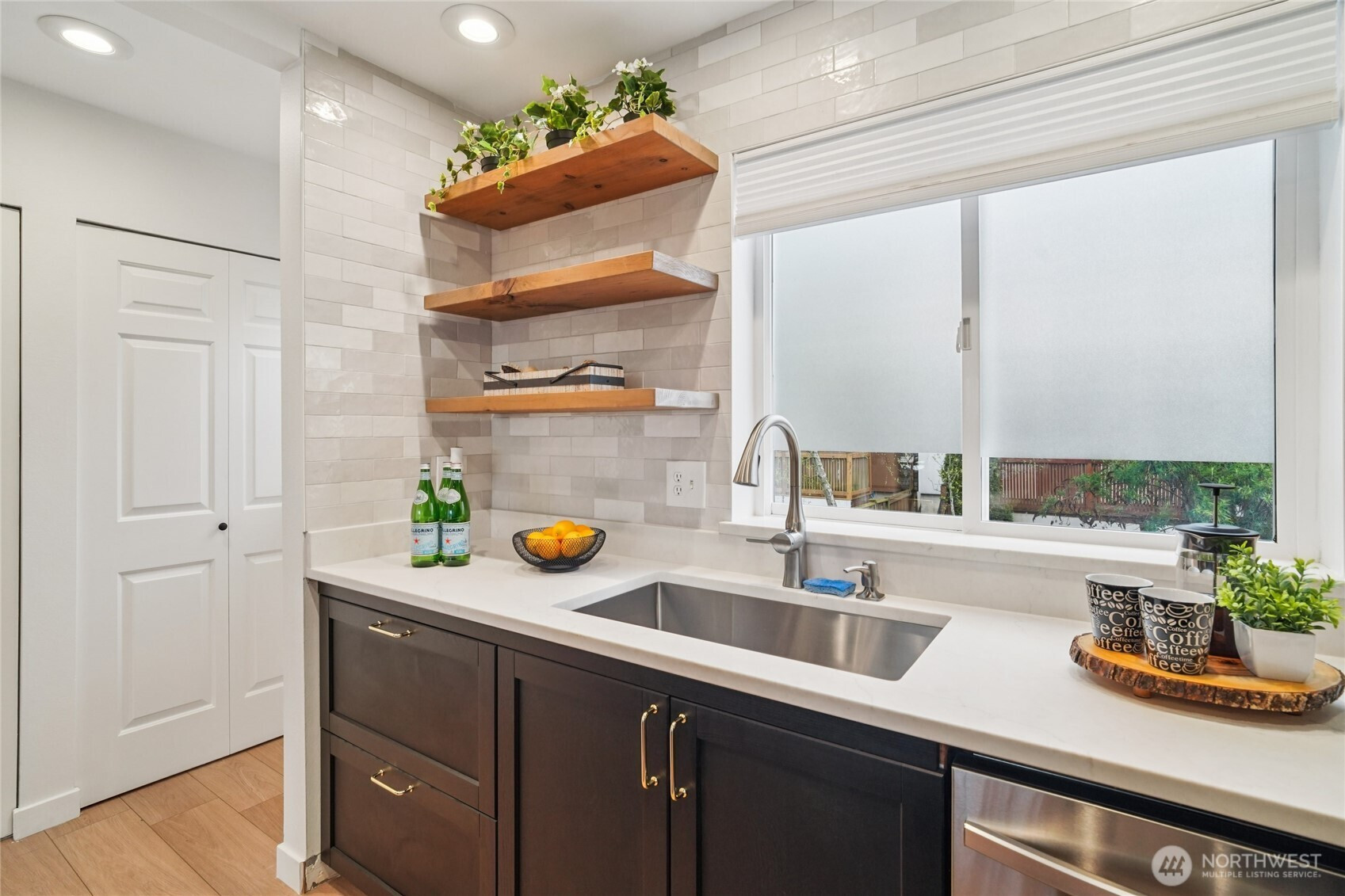 Extensively remodeled 2 Bed/ 2 Bath townhome tucked away in a boutique gated community centrally located in the desirable Madison Valley neighborhood. Entry leads to the first level, which has one bedroom (or home office) with French doors opening to the front patio as well as a full bath down the hall. Stairs lead up to the primary living space, which features a desirable open floor plan, soaring ceilings, and tons of natural light. Completely updated kitchen with modern finishes including quartz counters, sleek black cabinets, subway tile backsplash, floating shelves and new stainless steel appliances. A sizable pantry plus a laundry closet with a new washer & dryer flank the kitchen. Kitchen opens to the lofted dining area, which overlooks the spacious and bright living room. Entire top floor boasts a huge primary suite with vaulted ceilings, a large walk-in closet, and a completely remodeled en-suite bath. Wake up to the beautiful sunrise and easterly views of the Cascades, Mt. Rainier, and Lake WA. Additional updates include luxury vinyl flooring, fresh interior paint, new baseboard heaters plus smart thermostats throughout. Covered balcony off the living room is a great space for a BBQ or outdoor seating. A one car attached garage with EV charging provides secure parking and additional storage space. No HOA Dues or rental restrictions. Outstanding location with easy access to shops, restaurants, parks and freeways!