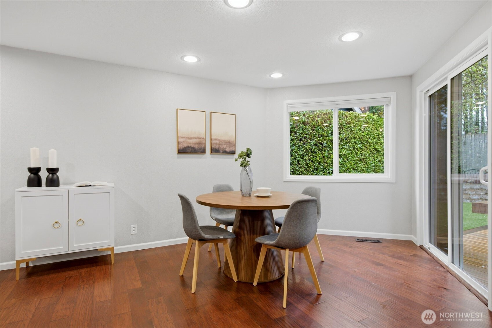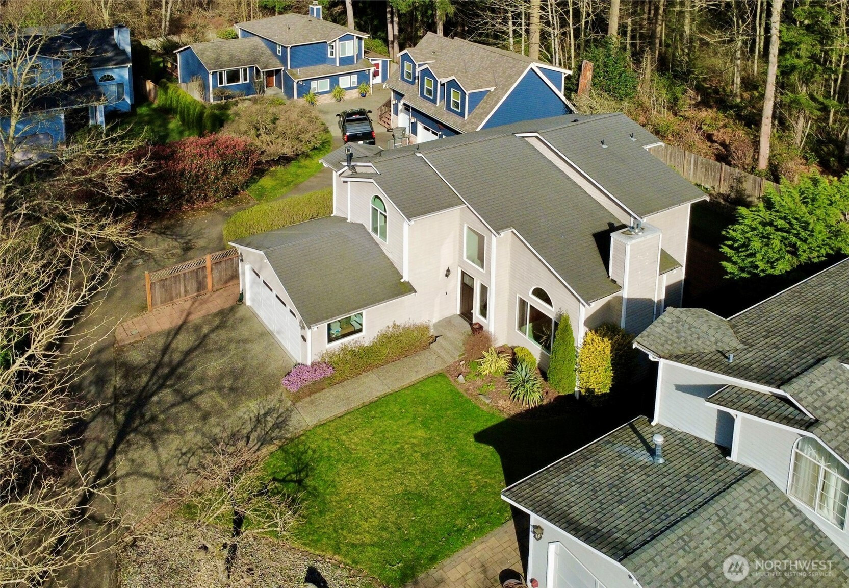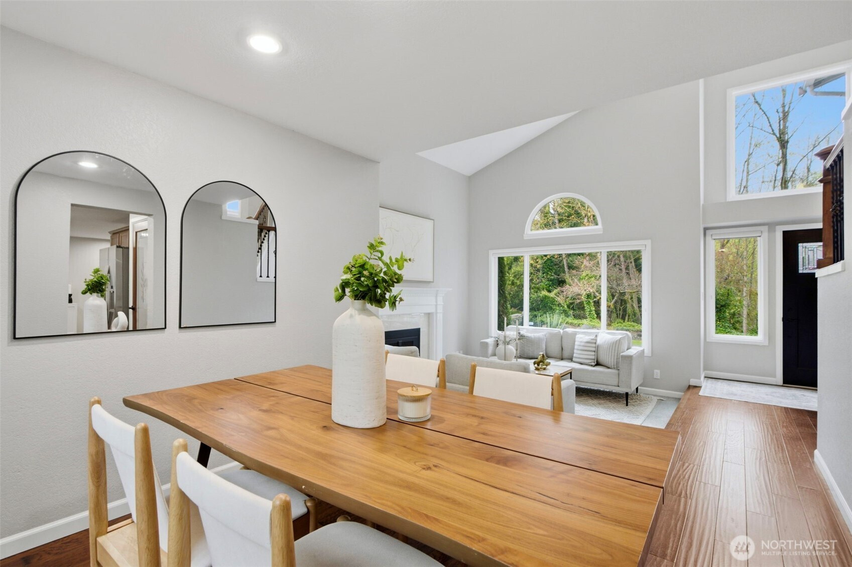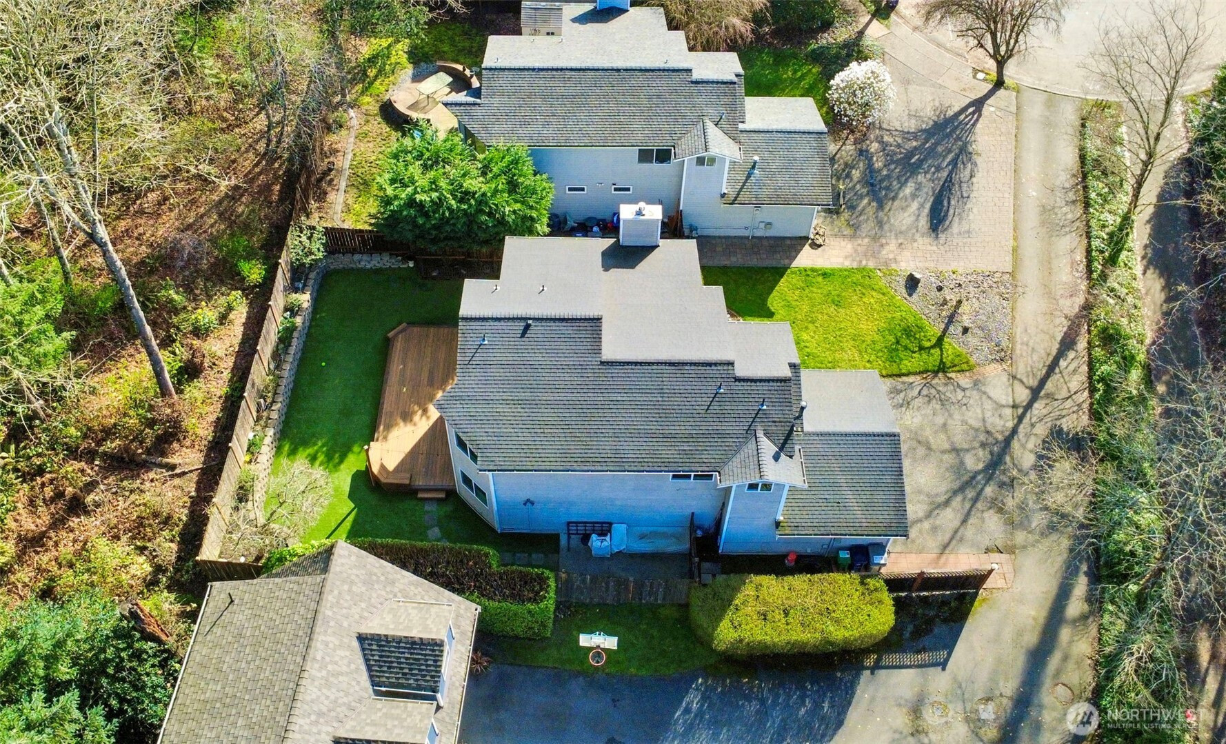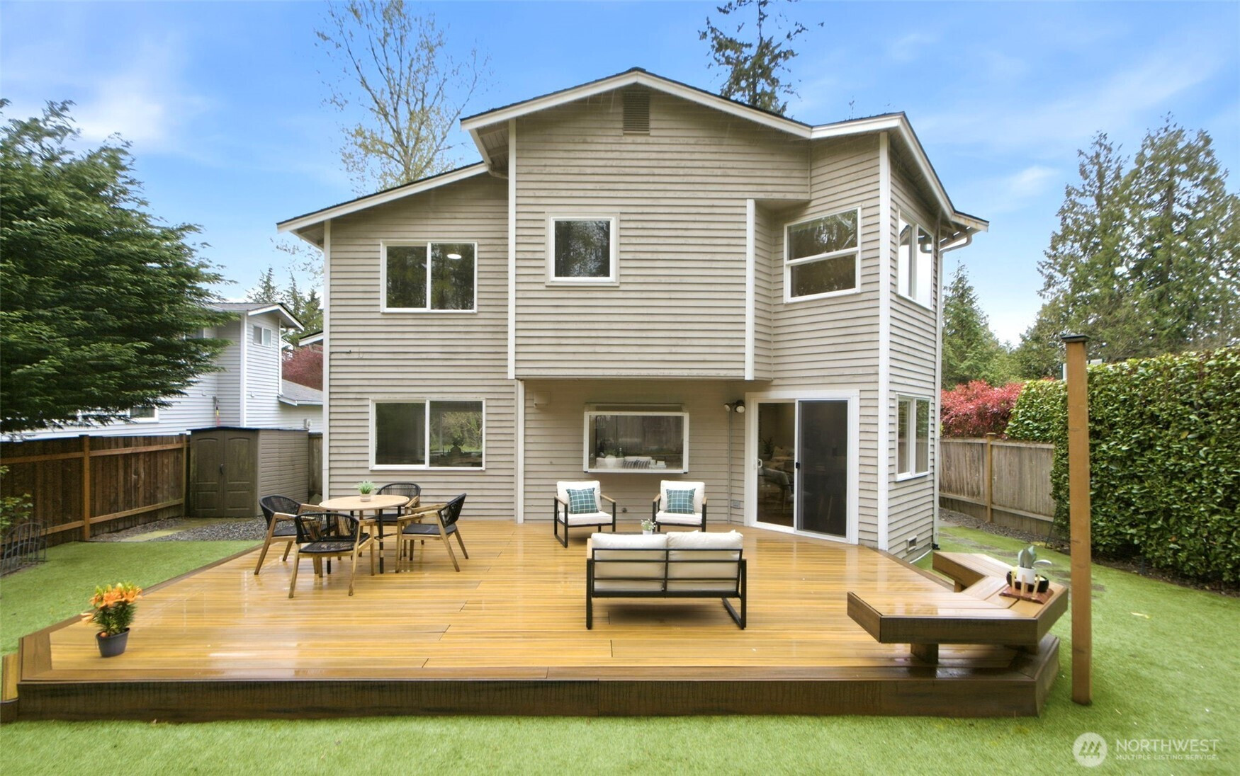 Beautifully updated 2-story home in a prime North Rose Hill location with sought-after southern exposure. Tucked at the quiet end of a cul-de-sac, this 3-bedroom, 2.25-bath plus den home offers 1,830 square feet on a 6,738 square feet lot backing to North Rose Hill Woodlands Park for exceptional privacy and a peaceful setting. The inviting interior features soaring cathedral ceilings, a sunken living room with fireplace, and formal dining. The spacious kitchen with eating area opens to the family room and sliding doors to a large Trex deck, creating seamless flow for everyday living and entertaining. Vaulted ceilings enhance the airy feel, while stainless steel appliances, ceramic tile baths, and heated floors in the primary bath add comfort and style. All bedrooms and den connect well to main living areas. The fully fenced backyard offers low-maintenance artificial turf, storage shed, and space to relax or play. The oversized 2-car garage is finished and insulated for year-round comfort with overhead storage and durable epoxy resin floors. Recent upgrades include a new energy-efficient furnace (2024), water heater (2023) and updated energy-efficient windows. Ideally located next to North Rose Hill Woodlands Park with trails, boardwalks and playground. Minutes to Mark Twain Elementary, Totem Lake, downtown Redmond, dining, shopping, Costco, freeway access, transit, and major tech campuses including Microsoft, Google, and Meta. Award-winning Lake Washington School District.