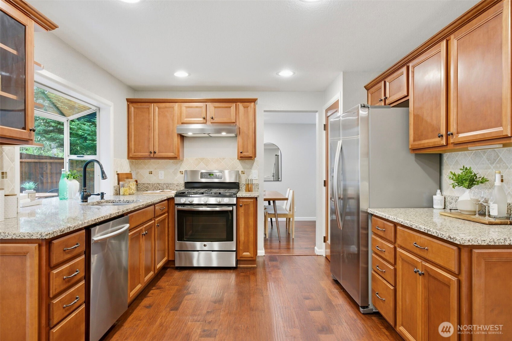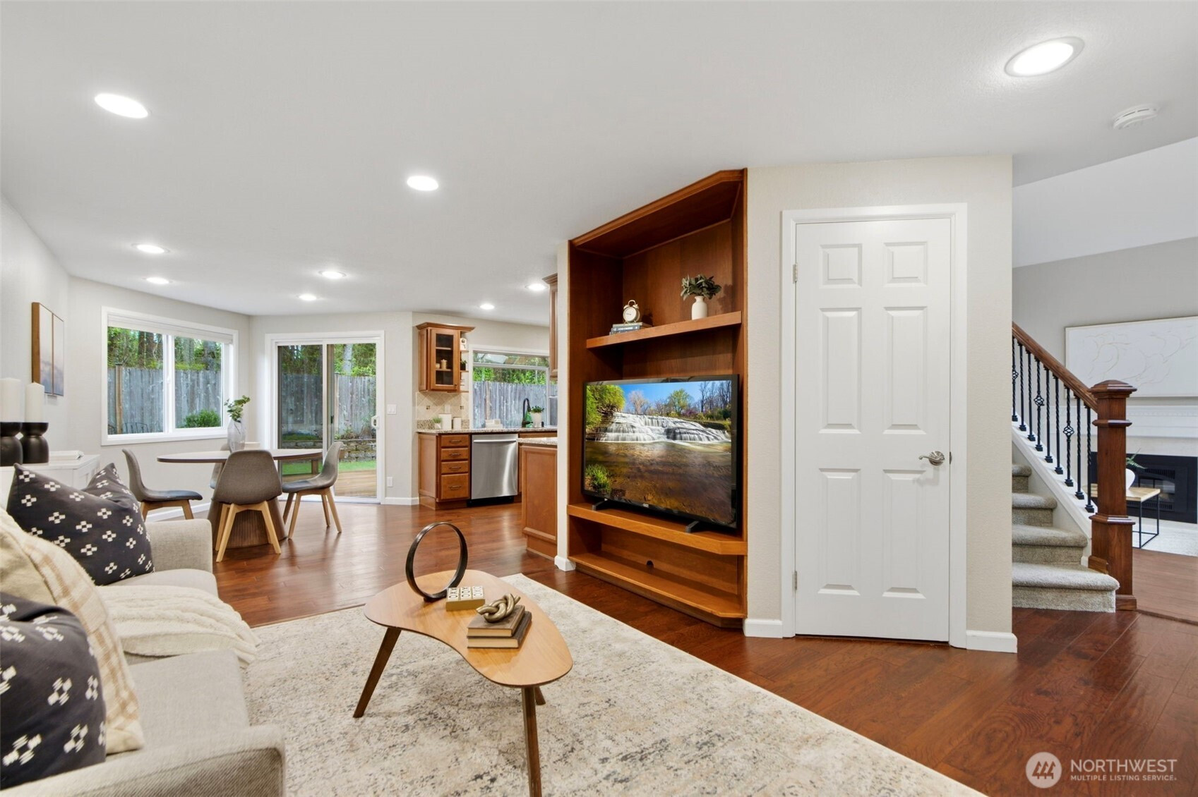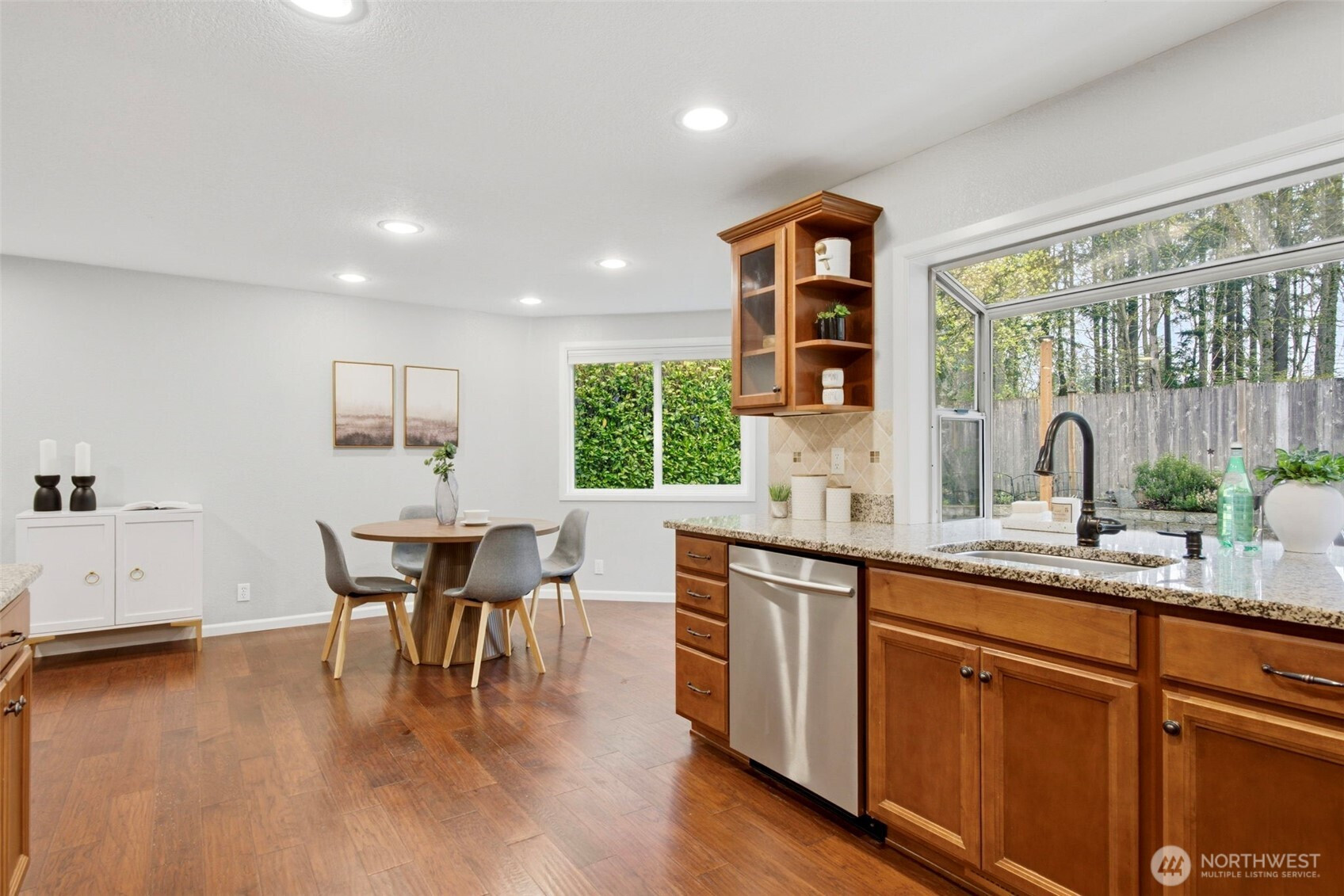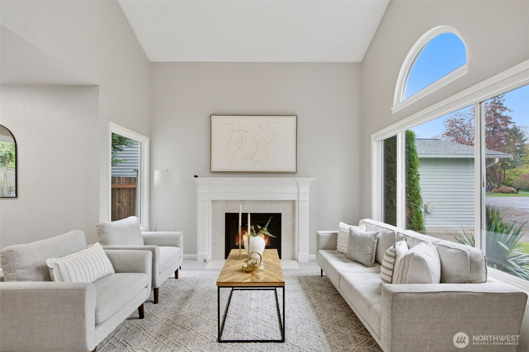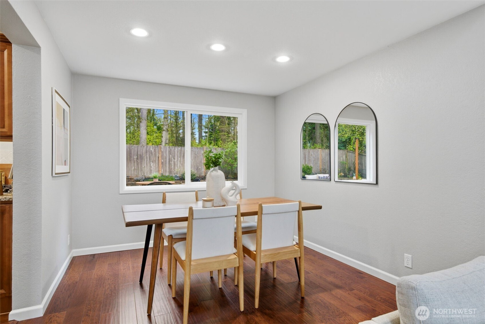Beautifully updated 2-story home in a prime North Rose Hill location with sought-after southern exposure. Tucked at the quiet end of a cul-de-sac, this 3-bedroom, 2.25-bath plus den home offers 1,830 square feet on a 6,738 square feet lot backing to North Rose Hill Woodlands Park for exceptional privacy and a peaceful setting. The inviting interior features soaring cathedral ceilings, a sunken living room with fireplace, and formal dining. The spacious kitchen with eating area opens to the family room and sliding doors to a large Trex deck, creating seamless flow for everyday living and entertaining. Vaulted ceilings enhance the airy feel, while stainless steel appliances, ceramic tile baths, and heated floors in the primary bath add comfort and style. All bedrooms and den connect well to main living areas. The fully fenced backyard offers low-maintenance artificial turf, storage shed, and space to relax or play. The oversized 2-car garage is finished and insulated for year-round comfort with overhead storage and durable epoxy resin floors. Recent upgrades include a new energy-efficient furnace (2024), water heater (2023) and updated energy-efficient windows. Ideally located next to North Rose Hill Woodlands Park with trails, boardwalks and playground. Minutes to Mark Twain Elementary, Totem Lake, downtown Redmond, dining, shopping, Costco, freeway access, transit, and major tech campuses including Microsoft, Google, and Meta. Award-winning Lake Washington School District.