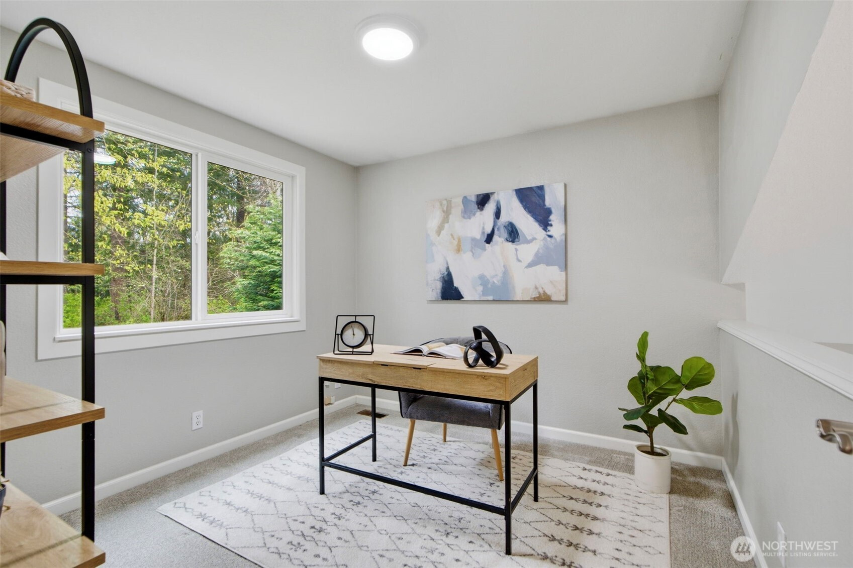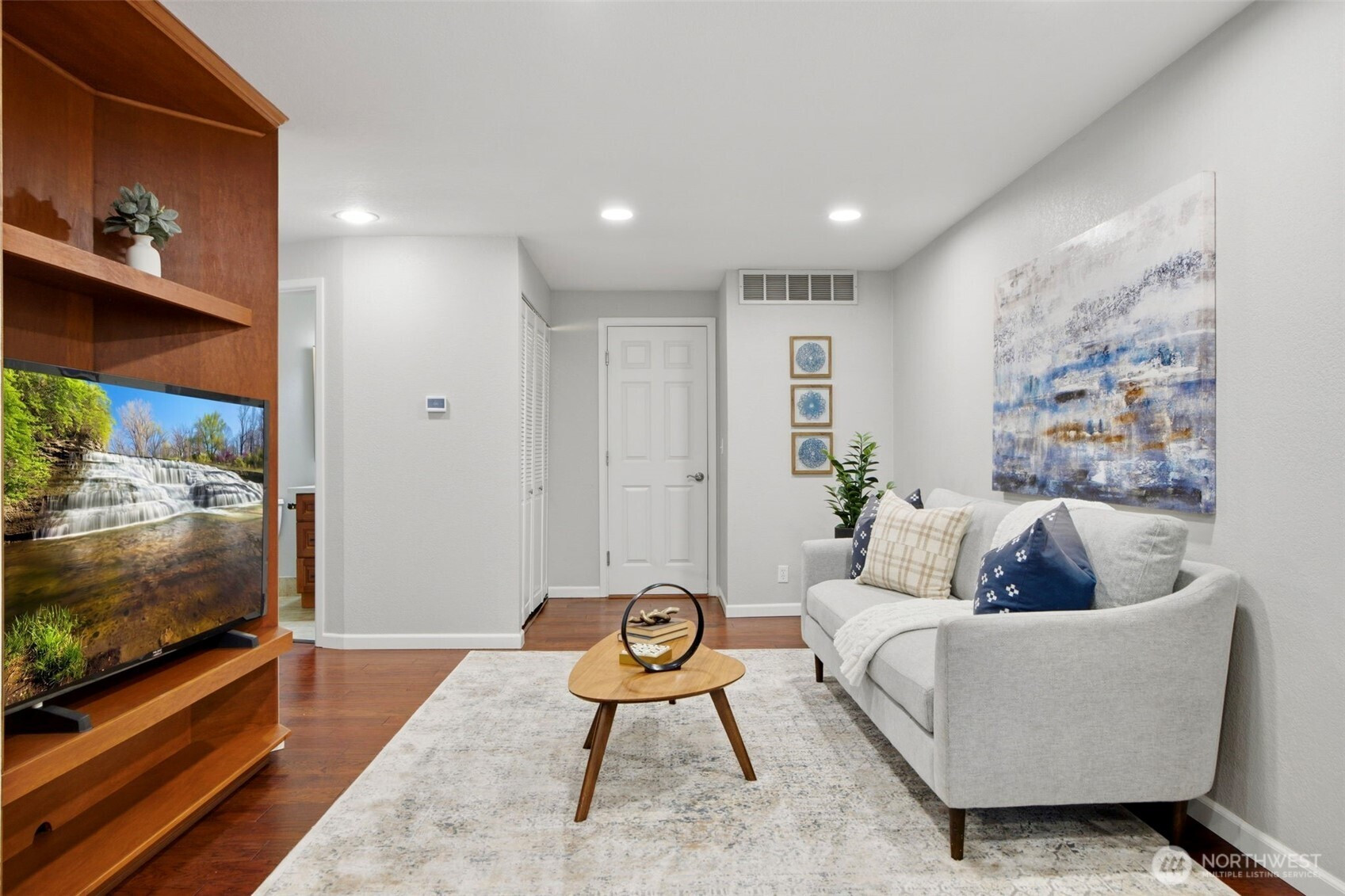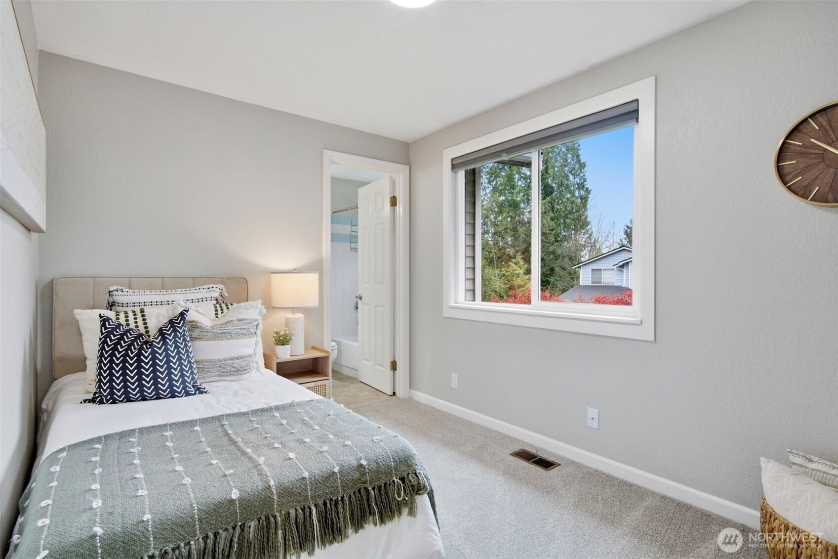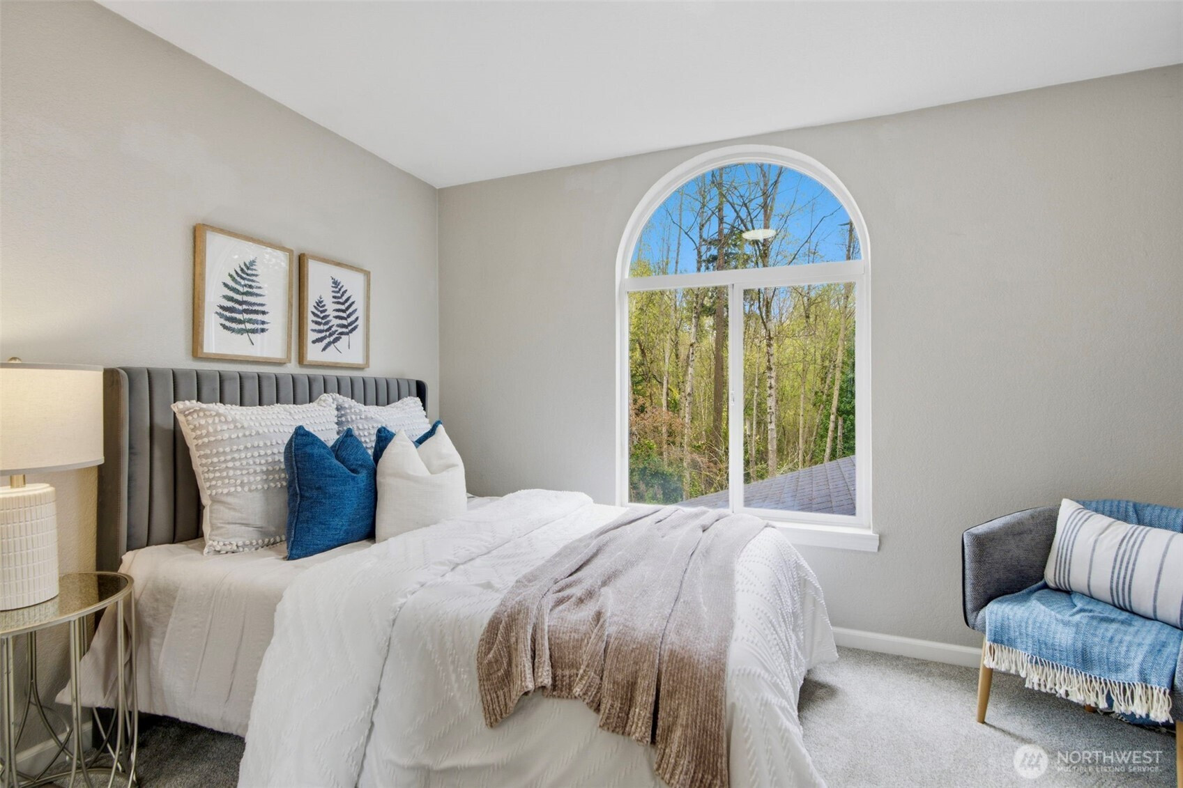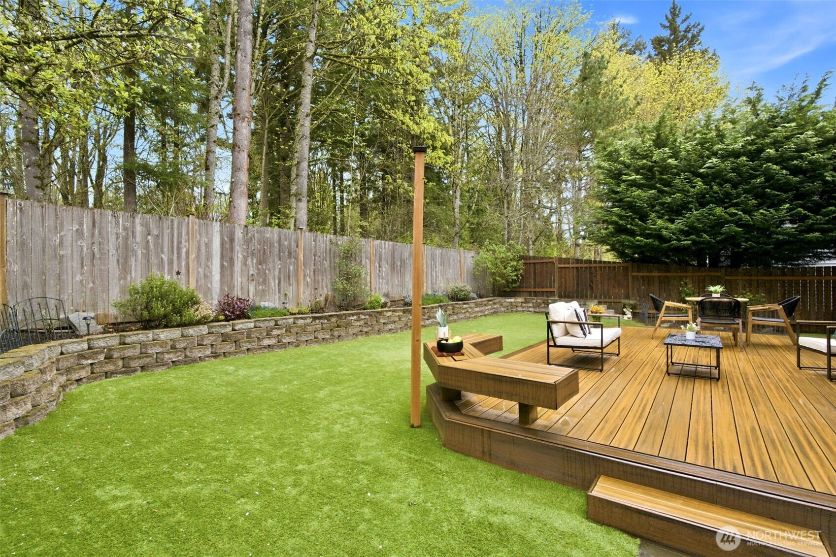 Beautifully updated 2-story home in a prime North Rose Hill location with sought-after southern exposure. Tucked at the quiet end of a cul-de-sac, this 3-bedroom, 2.25-bath plus den home offers 1,830 square feet on a 6,738 square feet lot backing to North Rose Hill Woodlands Park for exceptional privacy and a peaceful setting. The inviting interior features soaring cathedral ceilings, a sunken living room with fireplace, and formal dining. The spacious kitchen with eating area opens to the family room and sliding doors to a large Trex deck, creating seamless flow for everyday living and entertaining. Vaulted ceilings enhance the airy feel, while stainless steel appliances, ceramic tile baths, and heated floors in the primary bath add comfort and style. All bedrooms and den connect well to main living areas. The fully fenced backyard offers low-maintenance artificial turf, storage shed, and space to relax or play. The oversized 2-car garage is finished and insulated for year-round comfort with overhead storage and durable epoxy resin floors. Recent upgrades include a new energy-efficient furnace (2024), water heater (2023) and updated energy-efficient windows. Ideally located next to North Rose Hill Woodlands Park with trails, boardwalks and playground. Minutes to Mark Twain Elementary, Totem Lake, downtown Redmond, dining, shopping, Costco, freeway access, transit, and major tech campuses including Microsoft, Google, and Meta. Award-winning Lake Washington School District.