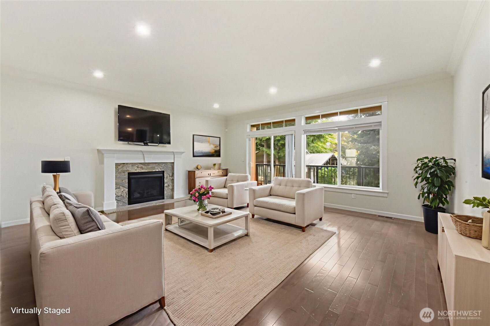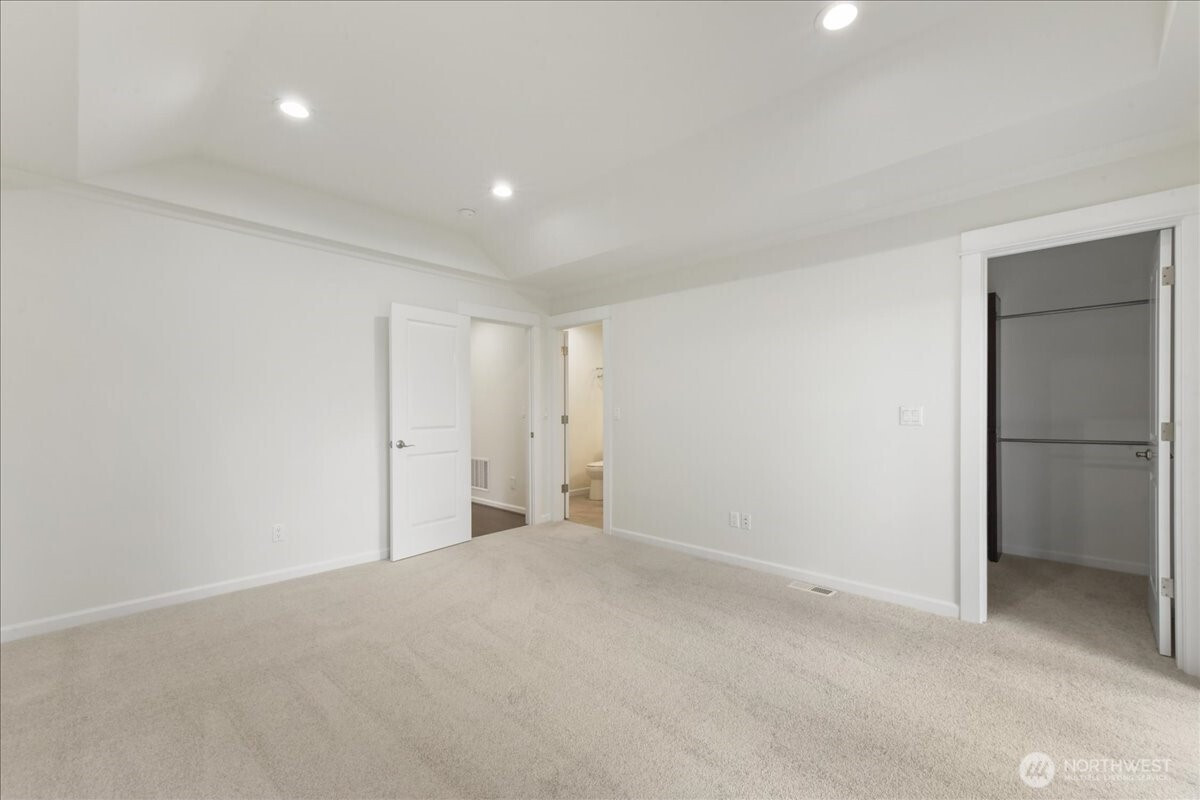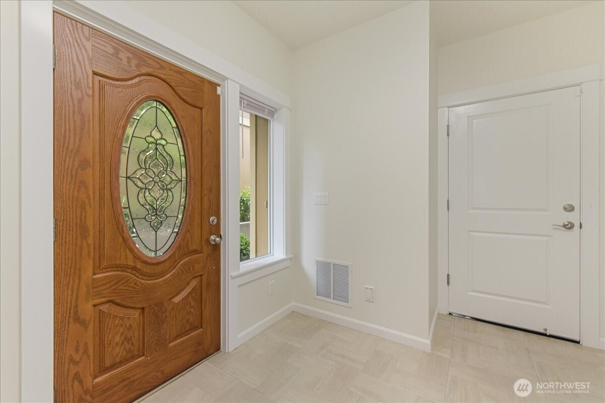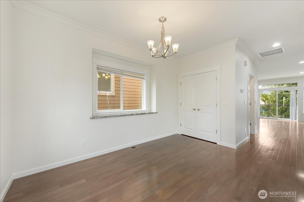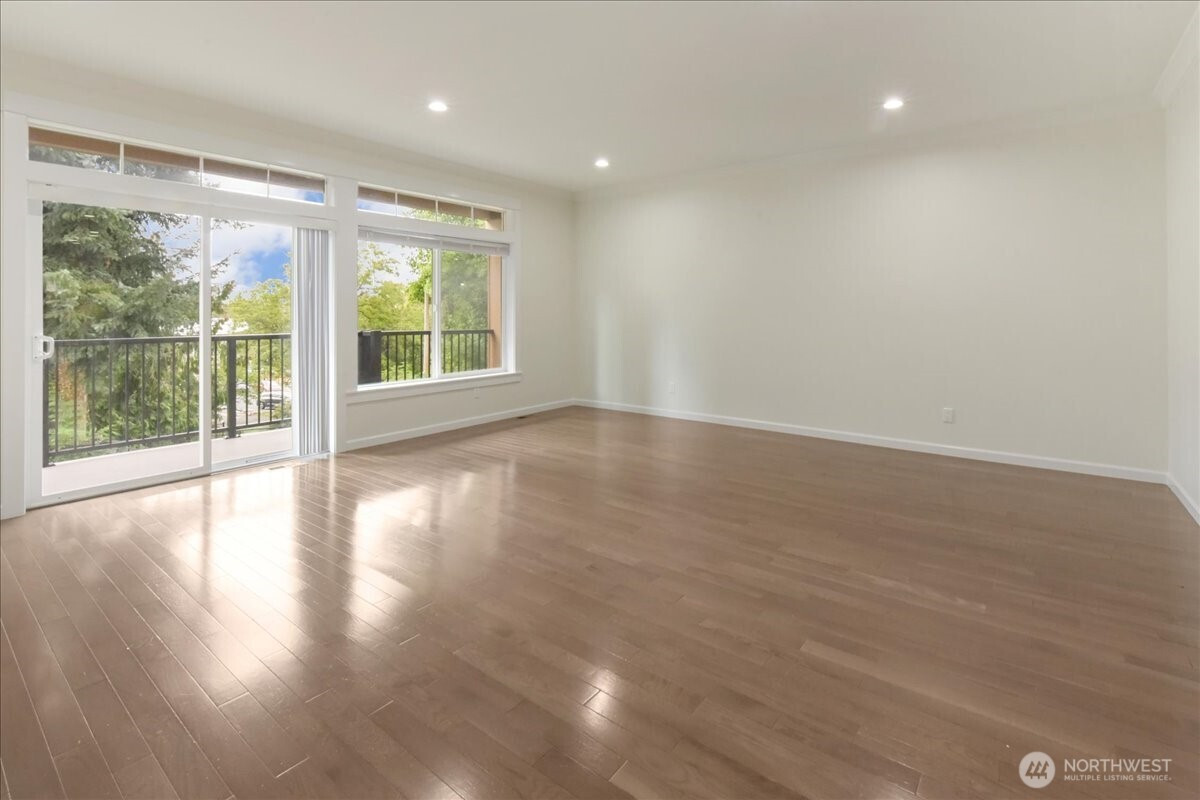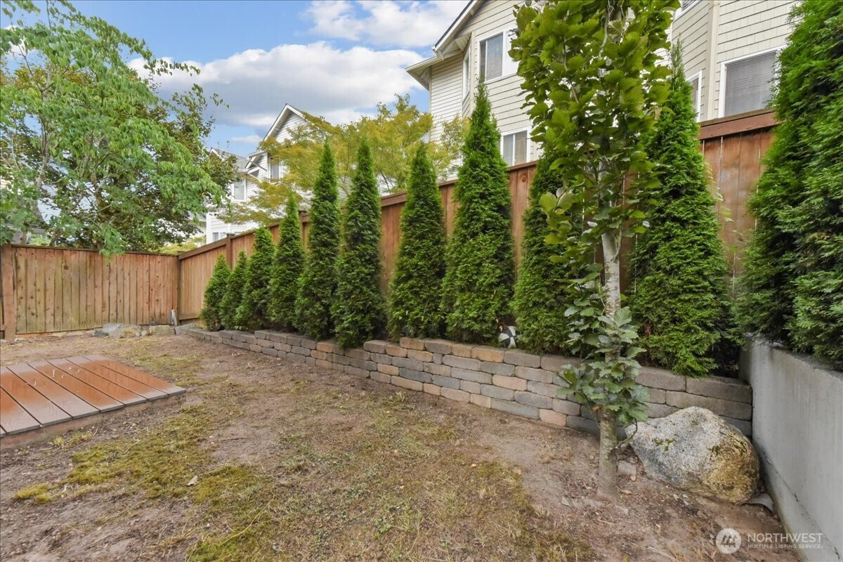 Discover the perfect blend of sophisticated architecture and functional living. Built in 2017, this SF townhome-style residence offers the secluded feel of a single-family home with the low-maintenance ease of a modern build. Positioned three homes back from the street, this 2,026 sq. ft. sanctuary provides a quiet retreat in the heart of North Seattle. The entry level features a spacious bedroom/office with a full high-end bathroom and a sliding glass door leading to your private, fenced backyard—ideal for guests, roommates, or a "work-from-home" setup with a view. The second story opens into an expansive great room anchored by a contemporary gas fireplace and stunning engineered hardwoods. The gourmet kitchen is a chef’s focal point, boasting premium stainless steel appliances, sleek cabinetry, and a seamless flow into the dining area. Step out onto the large, covered balcony to enjoy year-round territorial views and fresh air. The top floor is dedicated to rest. The primary suite features soaring vaulted ceilings, a generous walk-in closet, and a spa-like bathroom with a glass-enclosed shower. Two additional well-proportioned bedrooms share a full bath, while the conveniently located laundry closet simplifies daily chores. Enjoy the best of both worlds: a residential neighborhood feel with immediate walkability to the vibrant dining of Lake City and Wedgwood. Complete with a two-car garage and a built-in vacuum system,this home is move-in ready for the modern lifestyle.