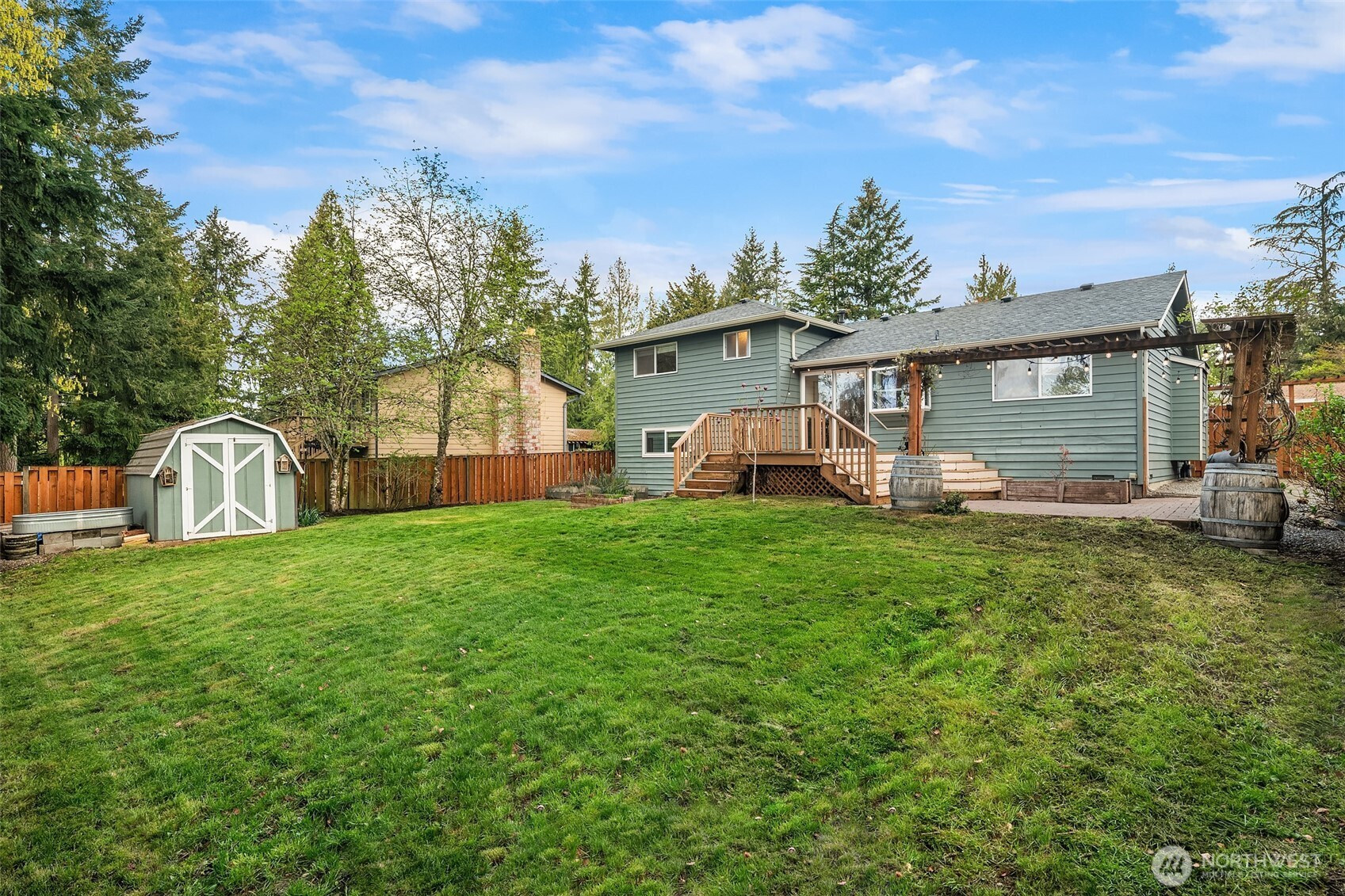 The one you’ve been eagerly anticipating! This beautifully maintained, three-level home offers the perfect blend of functionality, convenience, and prime location. Nestled in the heart of Fairwood, on a serene cul-de-sac surrounded by long-time residents, this light-filled home boasts a gas fireplace, an updated kitchen with quartz countertops, a garden window, and ample storage. Ascending a half-flight of stairs from the main floor, you’ll find three bedrooms, including the primary bedroom with an ensuite 3/4 bath, two additional bedrooms, and another full bathroom. Descending another half-flight of stairs, you’ll discover a light-filled family room, a half-bath, a laundry room, and a fourth bedroom that can easily be converted into an office, workout space, playroom, or any other desired area. The attached two-car garage provides additional storage and convenience. The fully fenced backyard is a gardener’s paradise, featuring an entertaining deck and patio, numerous planters, a lush lawn perfect for outdoor activities, a hot tub pad, and a dry storage/garden shed. This opportunity is not to be missed!