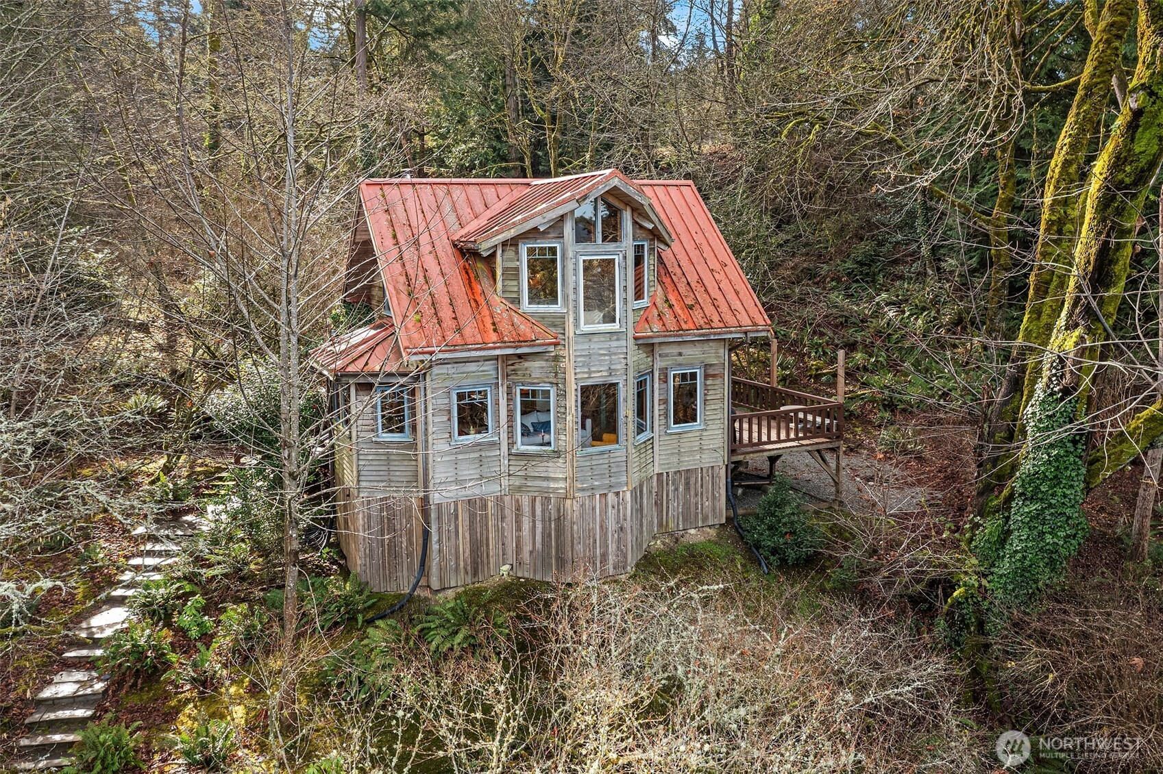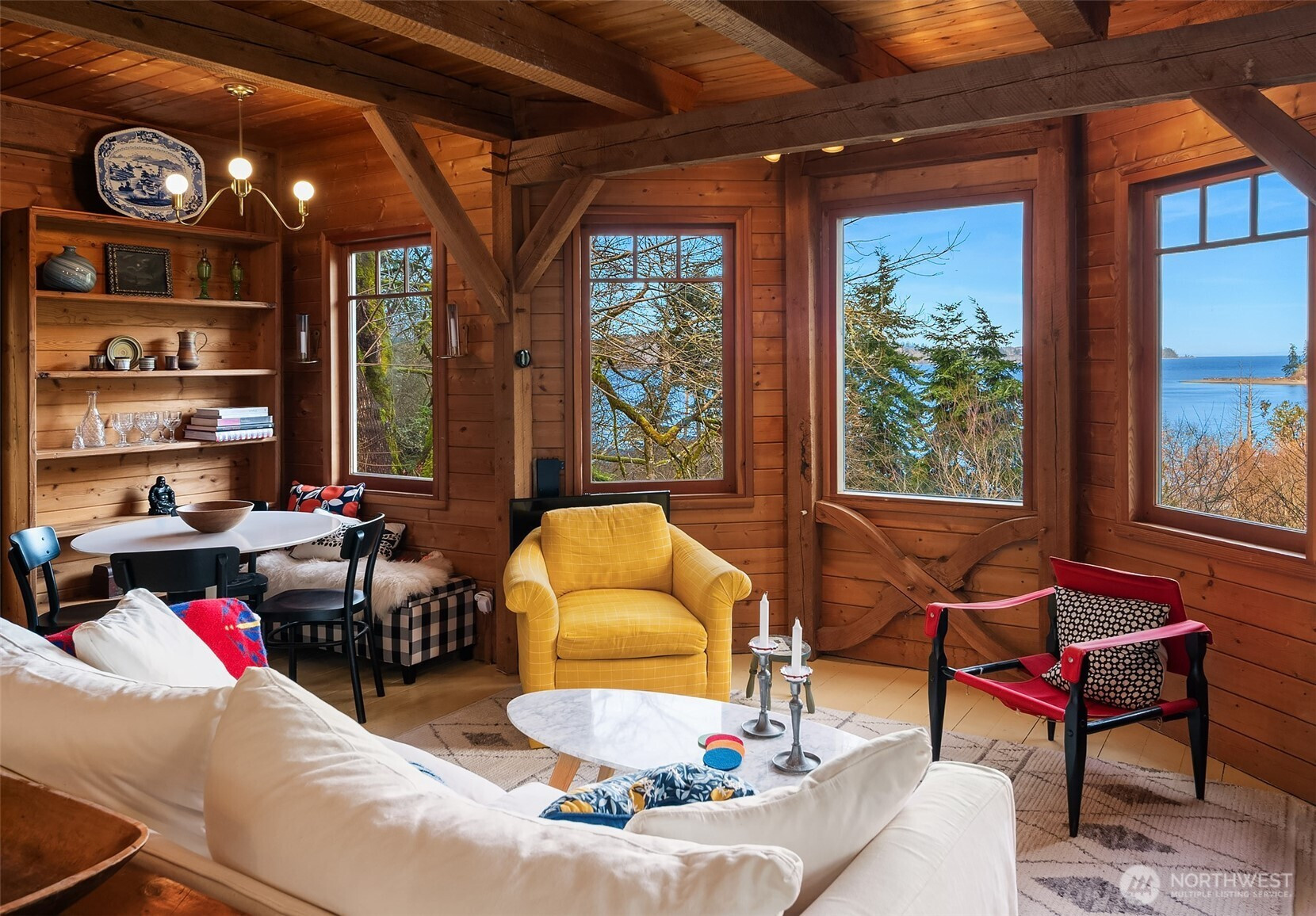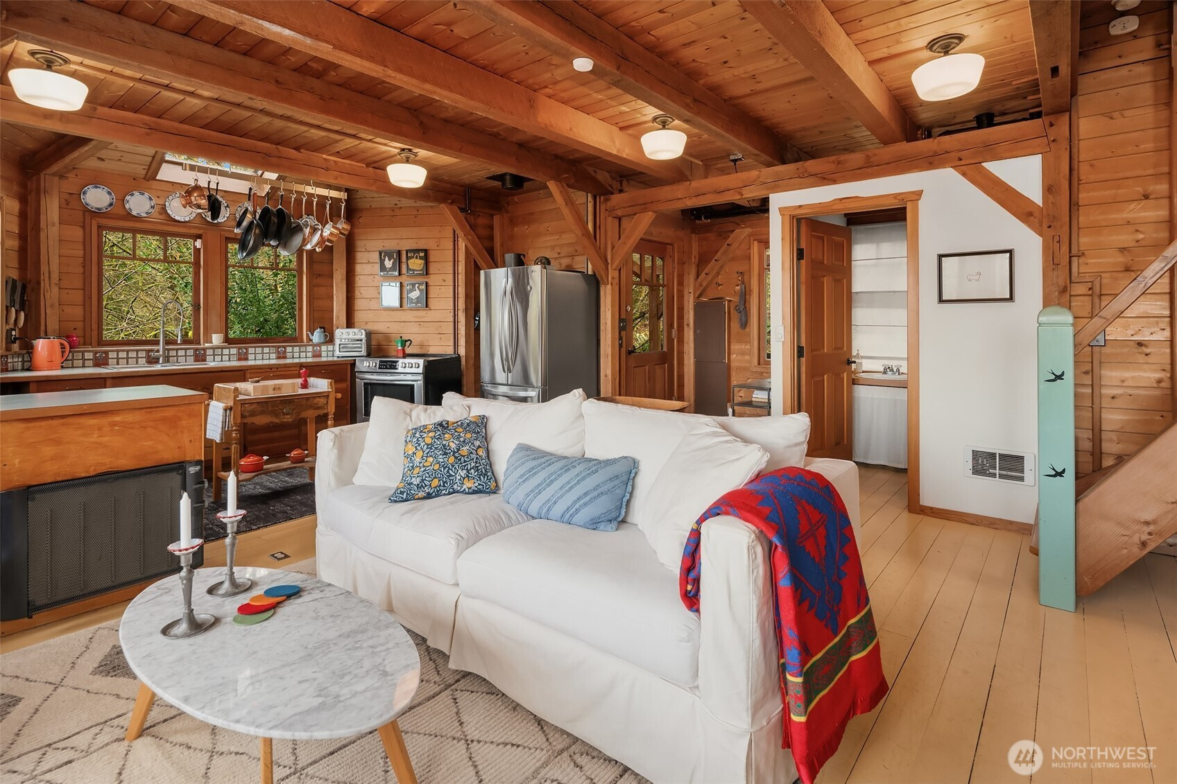 Tucked away on Vashon Island’s coveted northwest side, this authentic timber-frame one-bedroom cottage offers a rare blend of craftsmanship, privacy, and waterfront access. Hand-crafted with exposed beams and warm wood details, the home lives large in its thoughtful design—vaulted ceilings, abundant natural light, and an inviting open living space create a timeless Northwest retreat. The kitchen and living area flow seamlessly for relaxed everyday living or cozy evenings by candlelight, while the bedroom provides a peaceful haven framed by natural textures and tranquil surroundings.Step outside to enjoy the rhythms of island life, with shared access to a community beach just moments away—perfect for sunset walks, beachcombing, kayaking, paddle-boarding or summer campfires. A nearby meadow adds to the sense of openness and connection to nature, offering seasonal color, bird life, and room to breathe. Whether you’re seeking a weekend escape, a simplified full-time residence, or an inspiring artist’s hideaway, this cottage delivers a lifestyle rooted in beauty and balance.Surrounded by mature trees and the quiet charm of Vashon’s west side, yet within easy reach of ferry service, local farms, and village amenities, this special property invites you to slow down and savor island living. A true timber-frame home with beach and meadow access is a rare find—this is your opportunity to own a piece of Vashon’s iconic lifestyle.