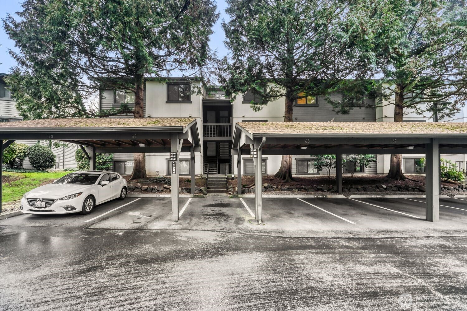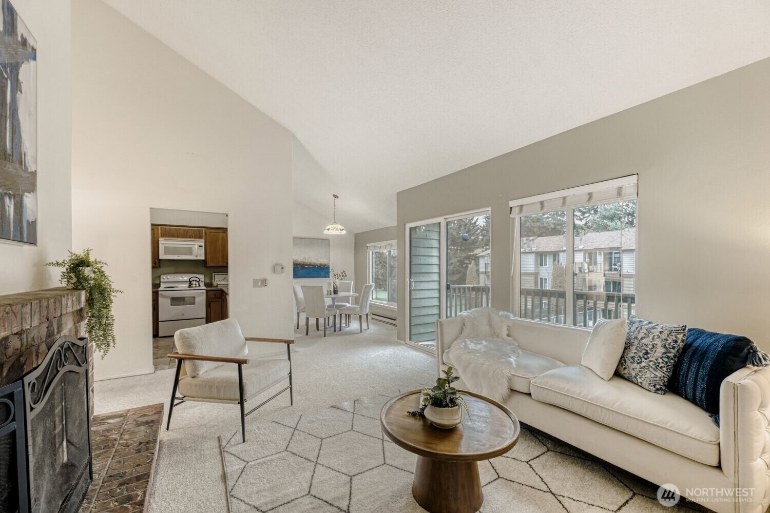 Move-in ready top-floor condo with abundant natural light and a view of the neighboring community’s pool. This home offers 2 bedrooms, 1.75 baths, vaulted ceilings, generous storage, and a private deck ideal for summer BBQs. The thoughtful layout provides excellent functionality with ample closet space and covered parking conveniently located right out front. Freshly painted and all appliances included.Community amenities include an indoor hot tub, pool, and sport court, ensuring year-round recreation and relaxation. Set within a quiet, well-kept community and just moments from The Village at Totem Lake’s shopping, dining, and everyday conveniences, this is a wonderful opportunity to own a stylish, turnkey home in Kirkland. Make this home yours today.