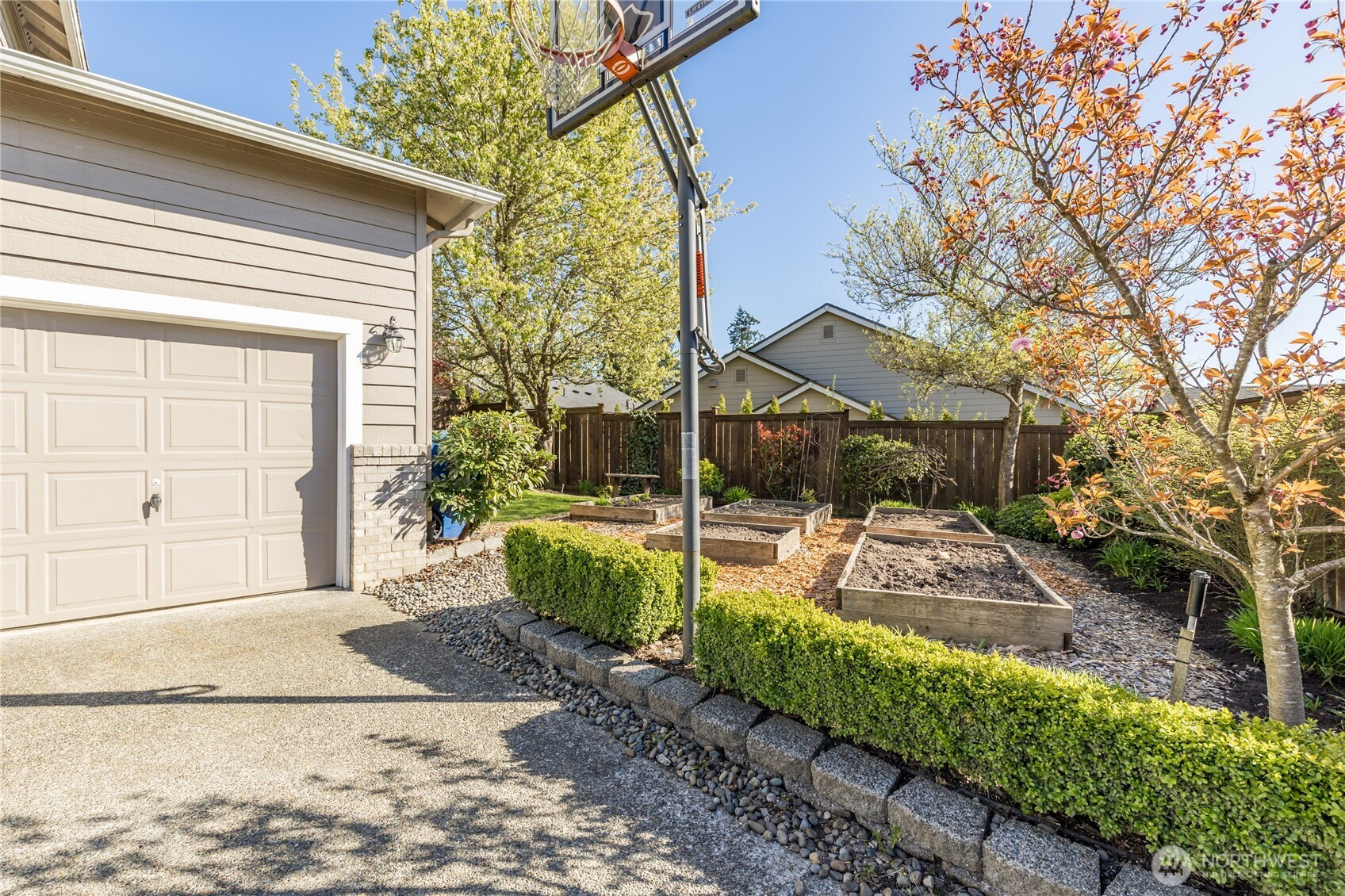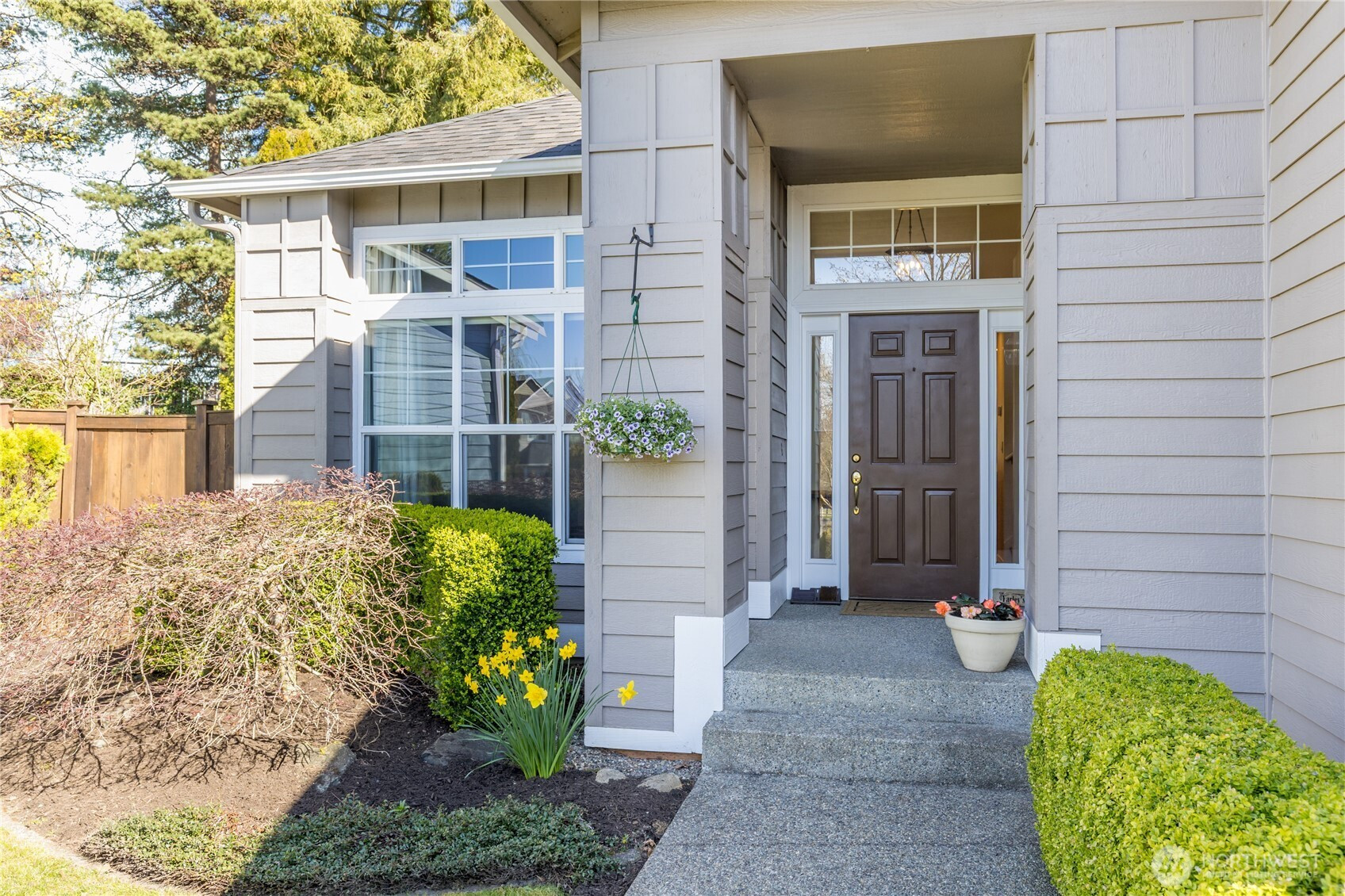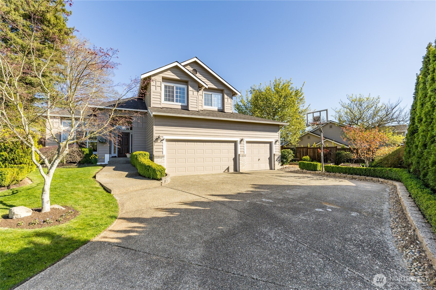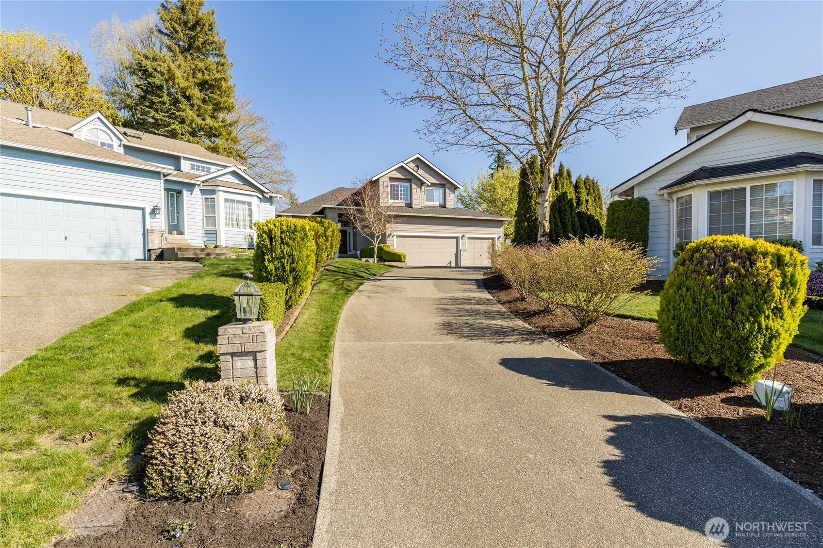 Experience the perfect blend of privacy and convenience in this meticulously maintained Willow Park retreat. Tucked away at the end of a quiet cul-de-sac with an expansive driveway for added seclusion, this home offers a rare sense of peace just minutes from major freeways, shopping, and top-rated schools. The grand entry makes a stunning first impression with soaring vaulted ceilings and an abundance of natural light. The main level features gleaming hardwoods and a highly functional layout, including a bright kitchen with a center island and pantry that flows into a cozy family room with a gas fireplace. A versatile main-floor den with double doors serves as an ideal home office or guest space. Upstairs, the spacious primary suite features a five-piece bath and walk-in closet, while additional bedrooms offer pleasant glimpses of the Olympic Mountains. For added convenience, the laundry room is also located on the upper level. Outdoor living is a highlight, featuring a large covered patio for year-round enjoyment, a serene garden pond, and raised beds in the sunny southwest corner. Significant "big-ticket" updates provide total peace of mind: New 50-year roof (2022), high-efficiency furnace (2022), new A/C (2023), and fresh exterior paint (2023). Located just a short stroll from community parks and Willow Crest Elementary, this home is truly move-in ready.