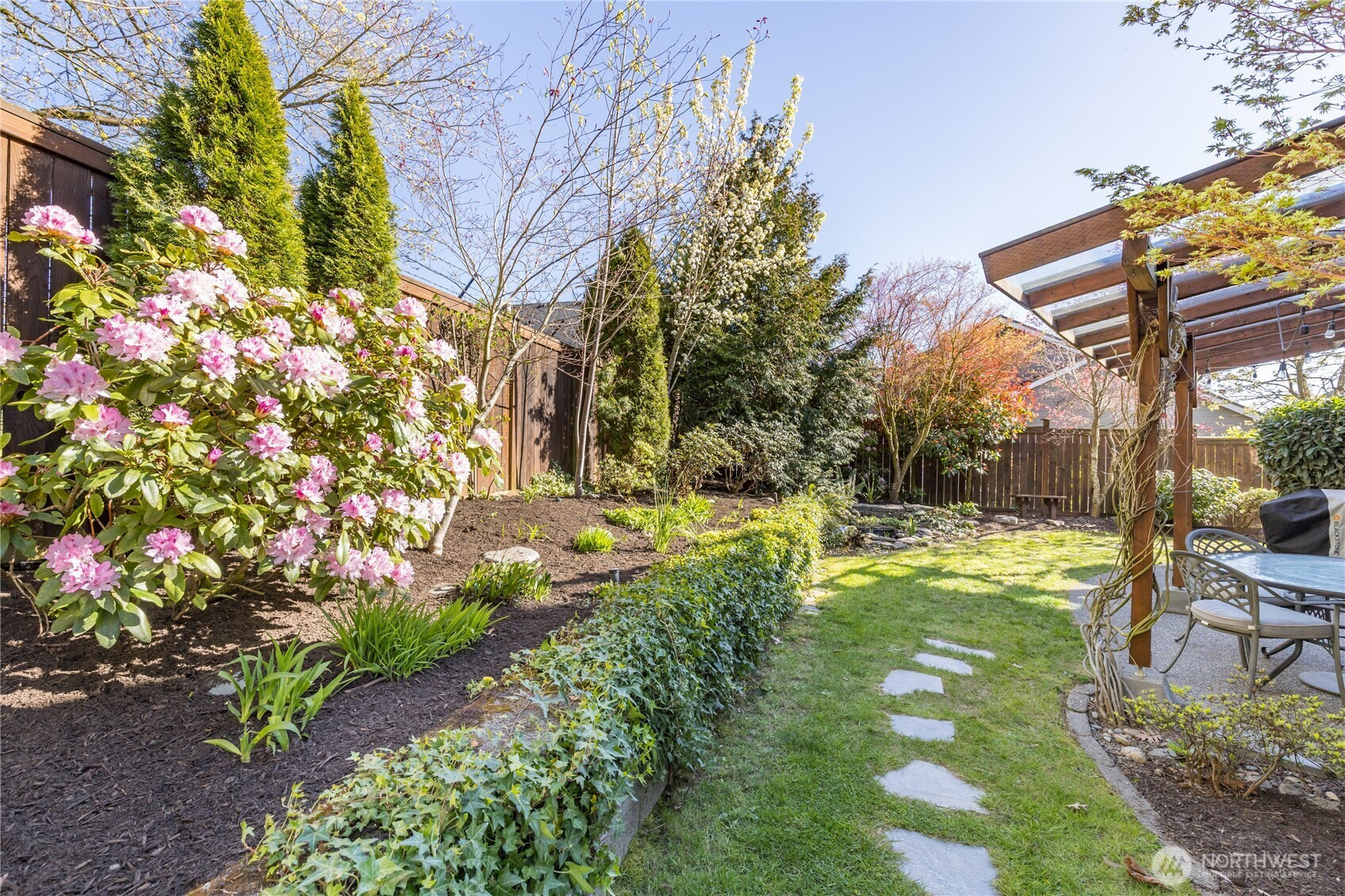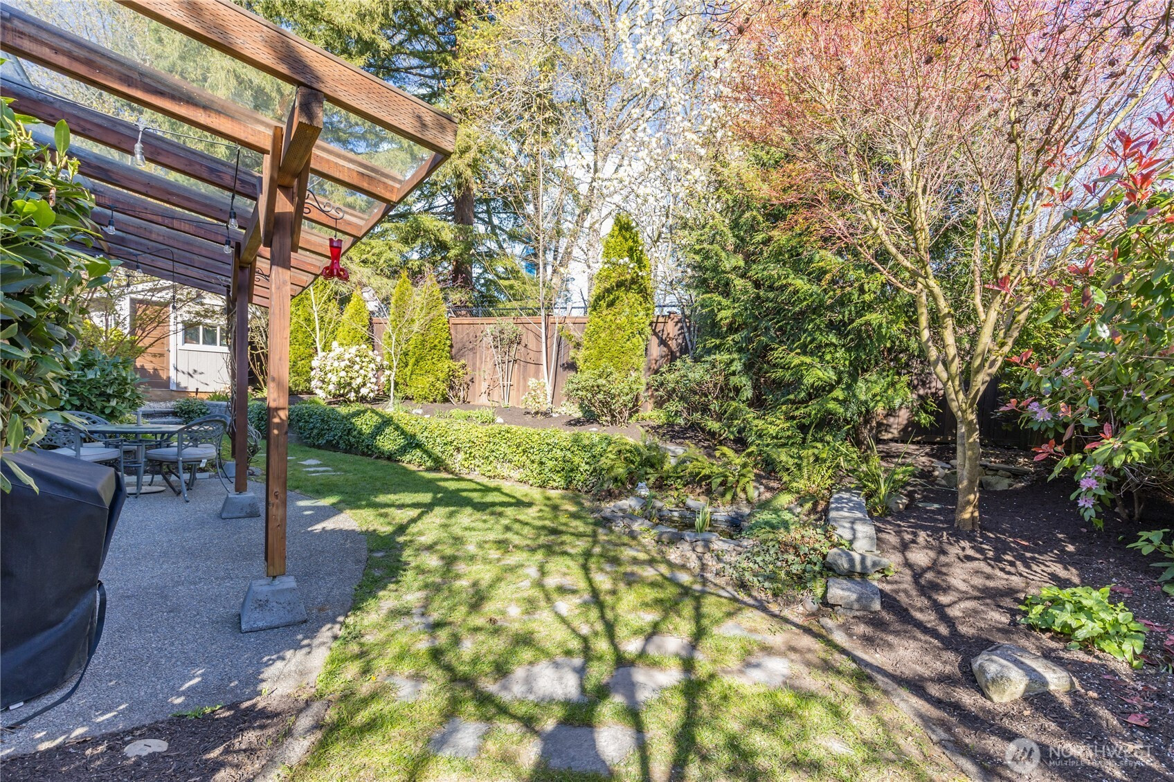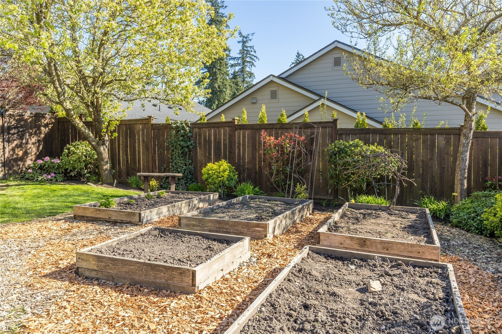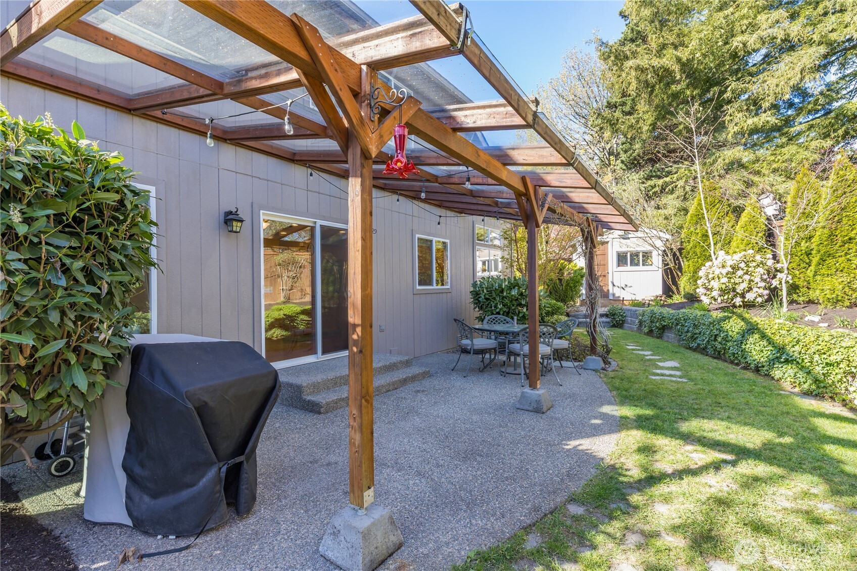 Experience the perfect blend of privacy and convenience in this meticulously maintained Willow Park retreat. Tucked away at the end of a quiet cul-de-sac with an expansive driveway for added seclusion, this home offers a rare sense of peace just minutes from major freeways, shopping, and top-rated schools. The grand entry makes a stunning first impression with soaring vaulted ceilings and an abundance of natural light. The main level features gleaming hardwoods and a highly functional layout, including a bright kitchen with a center island and pantry that flows into a cozy family room with a gas fireplace. A versatile main-floor den with double doors serves as an ideal home office or guest space. Upstairs, the spacious primary suite features a five-piece bath and walk-in closet, while additional bedrooms offer pleasant glimpses of the Olympic Mountains. For added convenience, the laundry room is also located on the upper level. Outdoor living is a highlight, featuring a large covered patio for year-round enjoyment, a serene garden pond, and raised beds in the sunny southwest corner. Significant "big-ticket" updates provide total peace of mind: New 50-year roof (2022), high-efficiency furnace (2022), new A/C (2023), and fresh exterior paint (2023). Located just a short stroll from community parks and Willow Crest Elementary, this home is truly move-in ready.