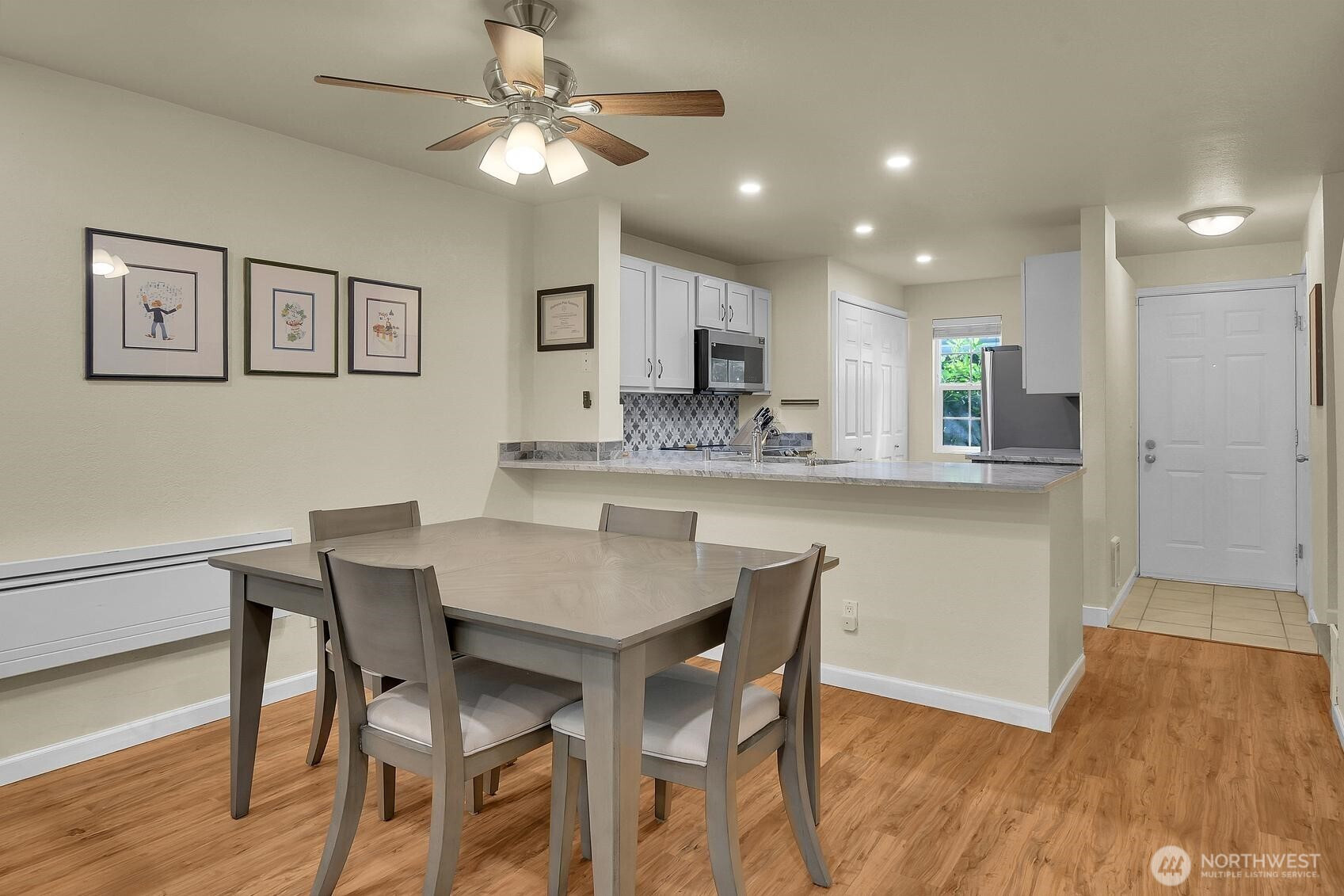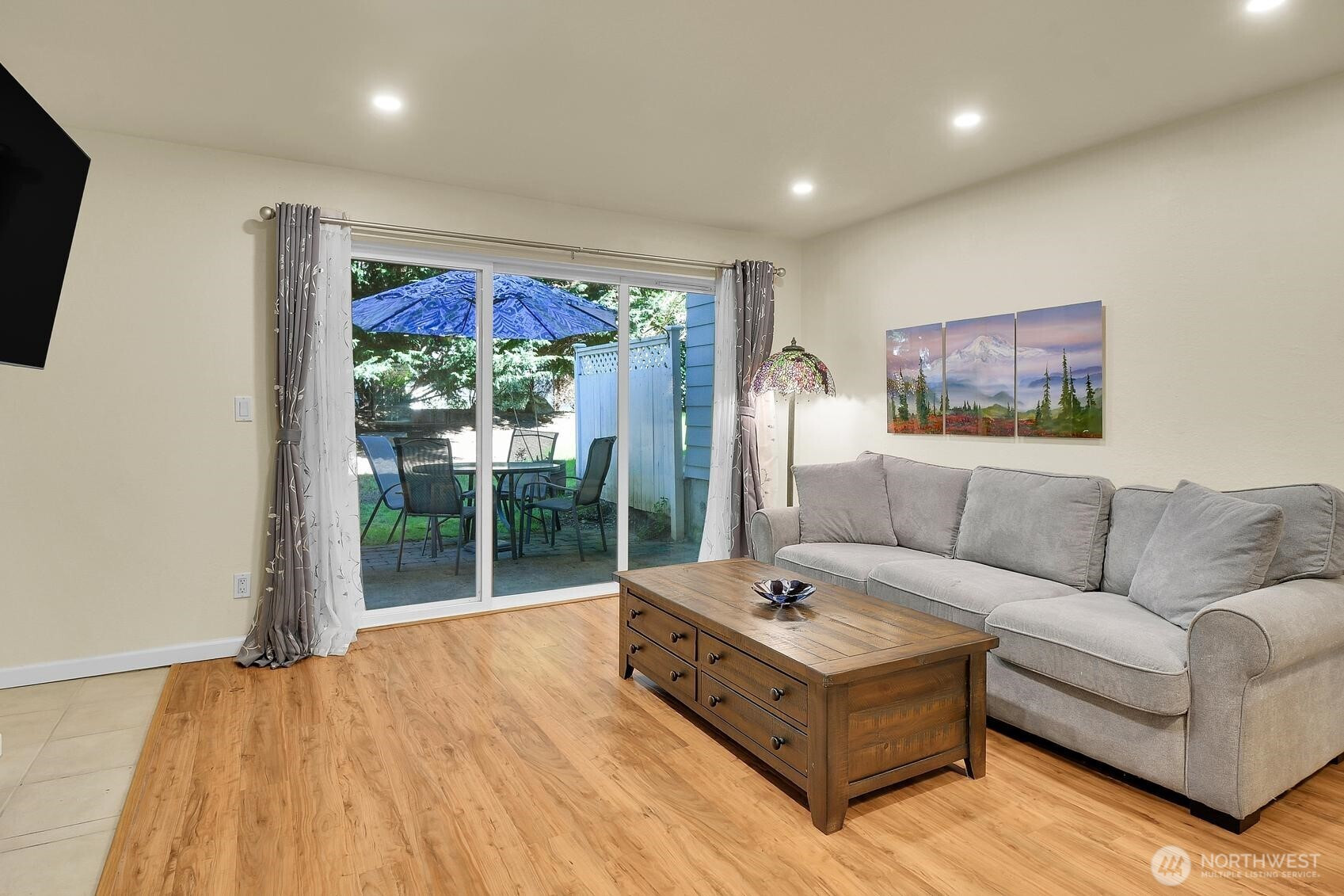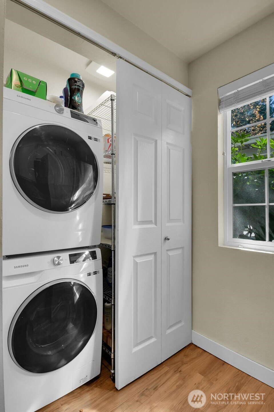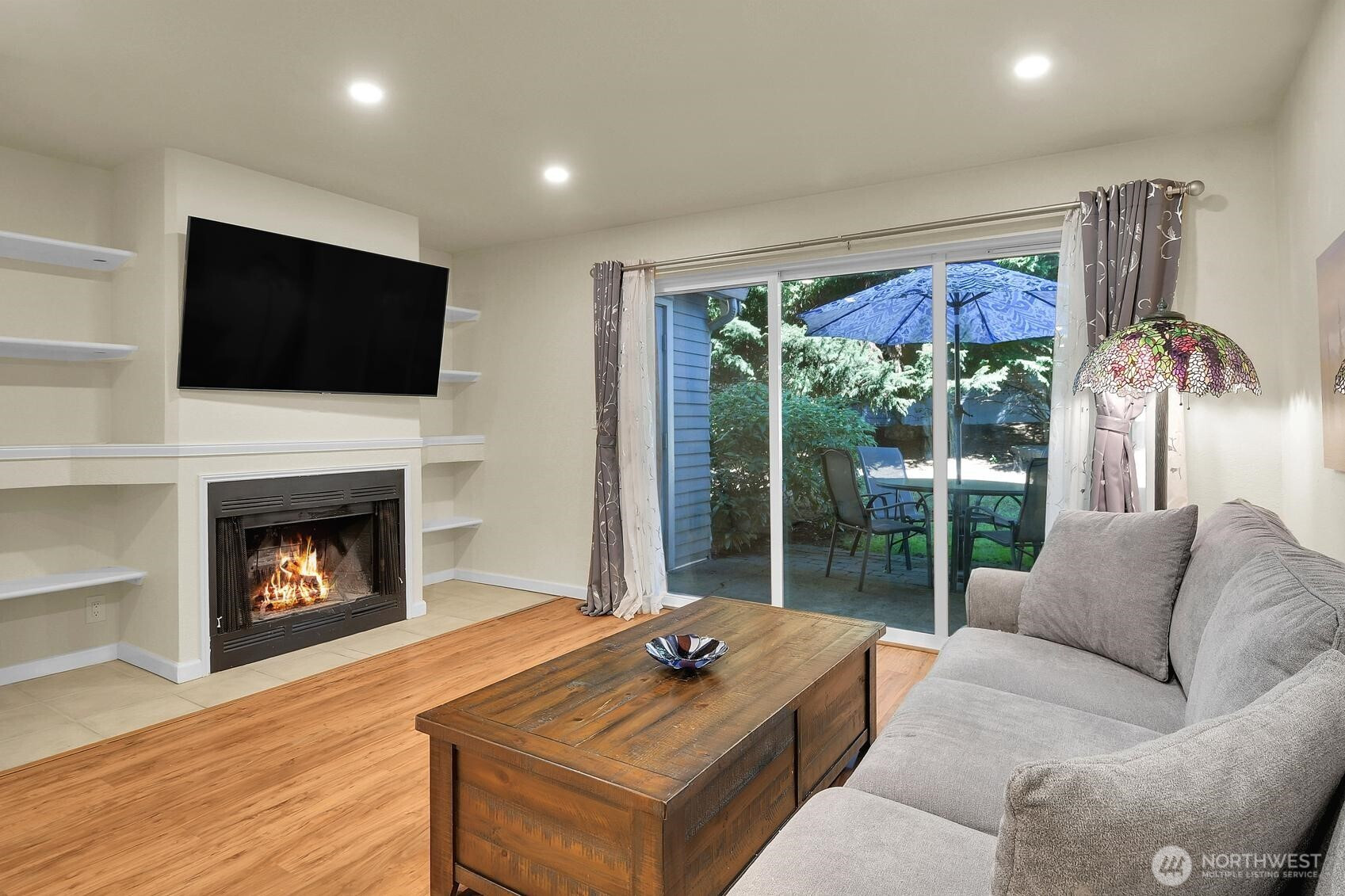 Tucked into a quiet Kirkland community, this beautifully remodeled 2-bed, 2.25-bath townhouse is packed with thoughtful upgrades that set it apart. Full slab marble countertops and undercounter sinks in the kitchen and all bathrooms, full wall backsplash on two walls, and a Samsung Smart induction range with convection, air fryer, and steam options make this kitchen a standout. Actual Pergo floors throughout — no carpet anywhere. Flush LED lighting with dimmer switches and multi-warmth settings eliminate the need for lamps. Built-in shelving frames an enclosed fireplace with flat screen mounting area and dedicated media outlets. Individual climate control in each bedroom, updated heating, and north-facing rear windows keep things cool all summer. Shaded patio with extra storage outside. Stackable washer/dryer frees the other half for pantry use. Close to waterfront parks, schools, shopping, and freeway access. Every detail has been considered — JUST MOVE IN!