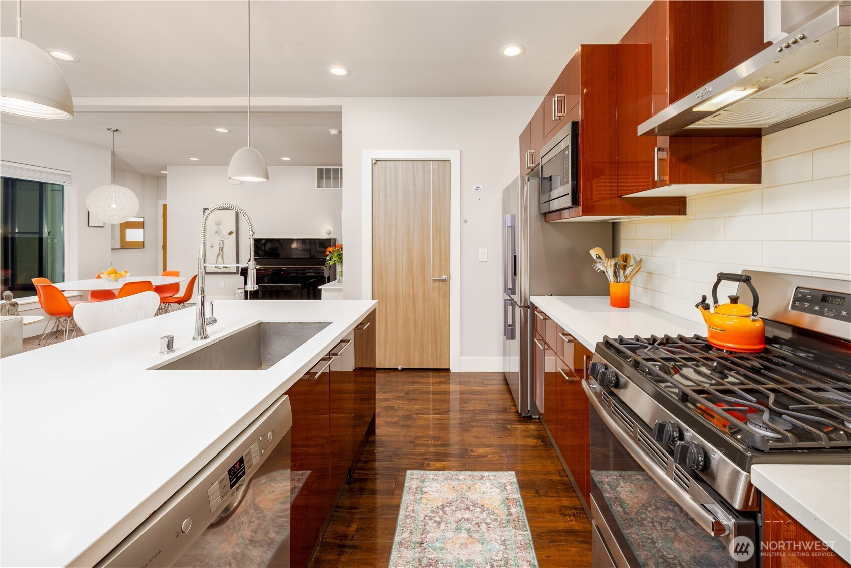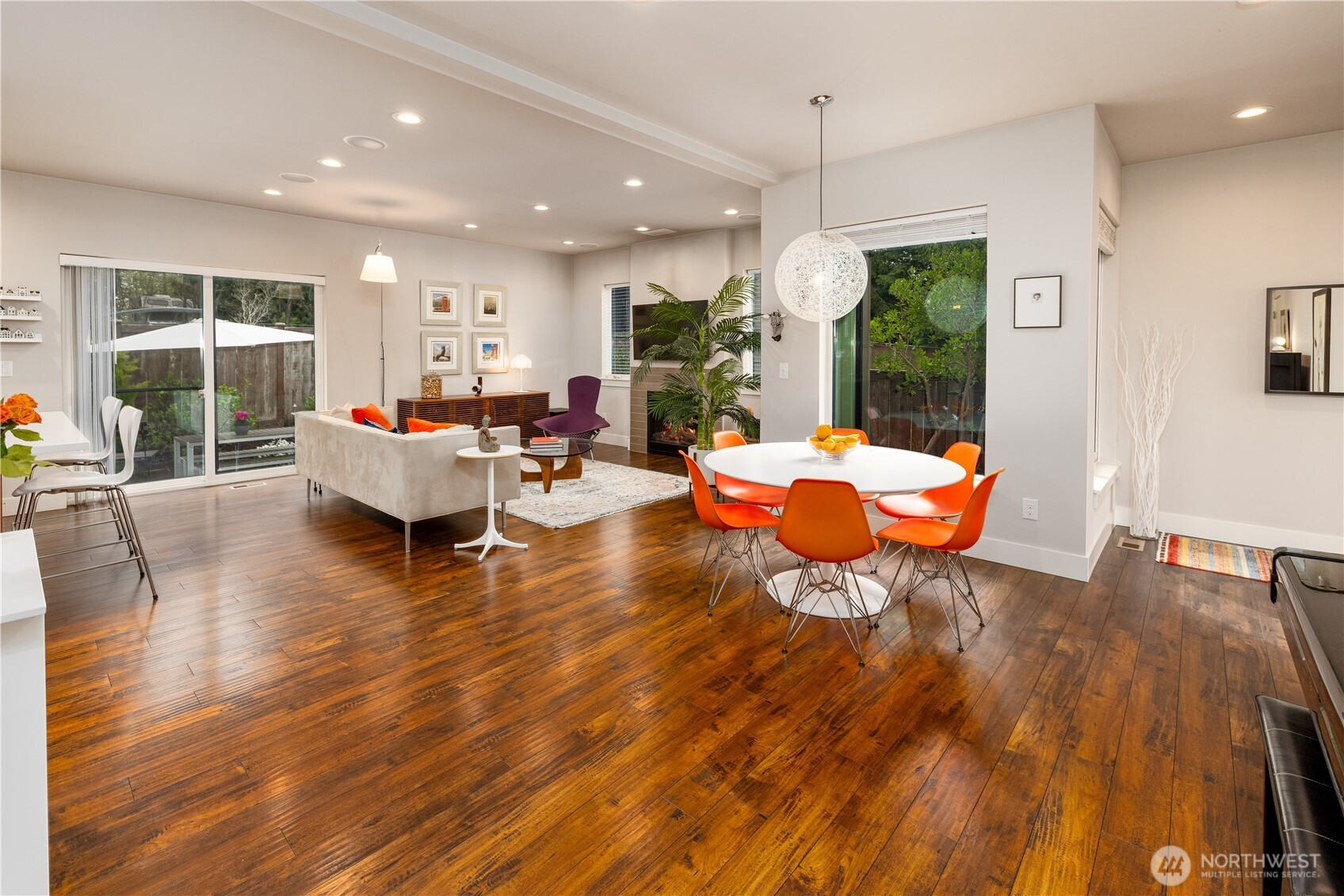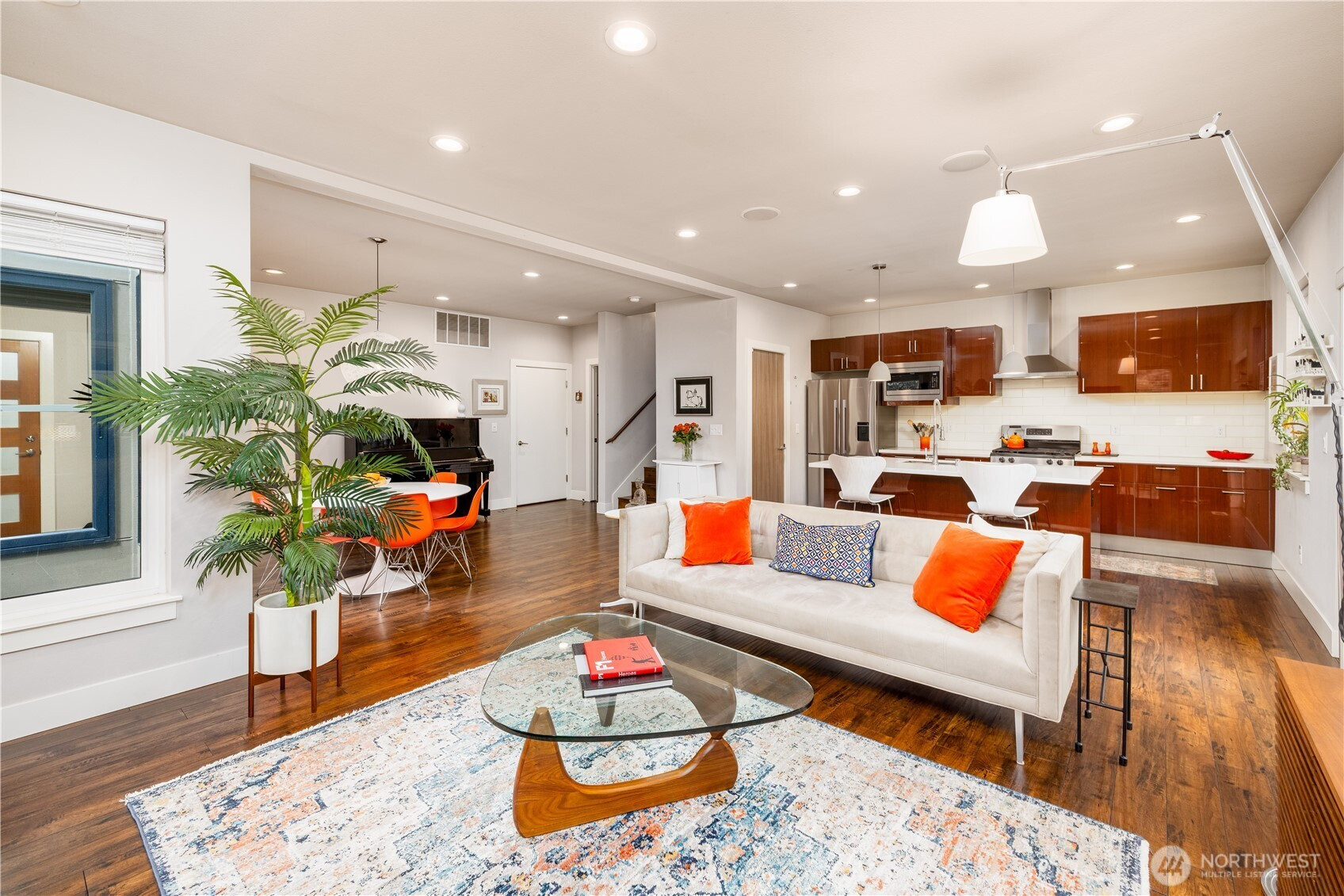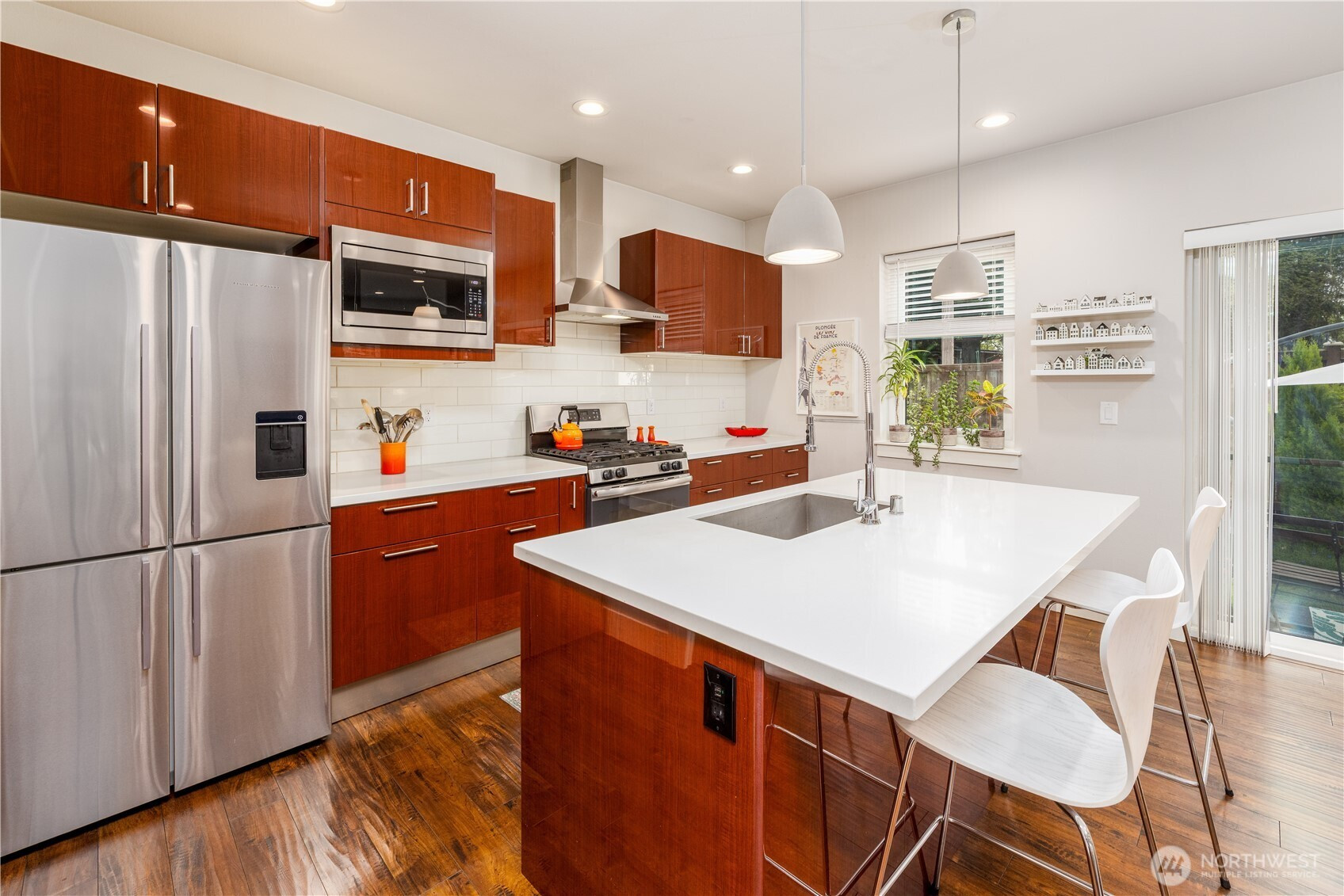 Stunning modern home that blends clean design with comfortable, efficient living. Thoughtfully laid out, it offers 3 bedrooms plus an upstairs loft and office nook, giving you the flexibility to work from home, host guests, or create a space that fits your lifestyle. The main level is both functional and inviting, centered around a well-designed kitchen featuring pull-down shelving, double drawers, and a generous walk-in pantry. It opens seamlessly to the living and dining areas, where large windows bring in plenty of natural light and create a warm, easygoing atmosphere for both everyday living and entertaining. A cozy gas fireplace keeps things comfortable in the winter, while A/C ensures you stay cool through the summer months. Step outside to a private patio and garden space; perfect for relaxing evenings, casual get-togethers, or a quiet morning coffee. Located just 20 minutes from Seattle–Tacoma International Airport, you’ll enjoy a convenient commute without sacrificing a sense of retreat. Nearby parks, along with favorites like Trader Joe’s, local shops, and dining, make everyday living simple and enjoyable. Modern, functional, and easy to live in, this home is ready to welcome you.