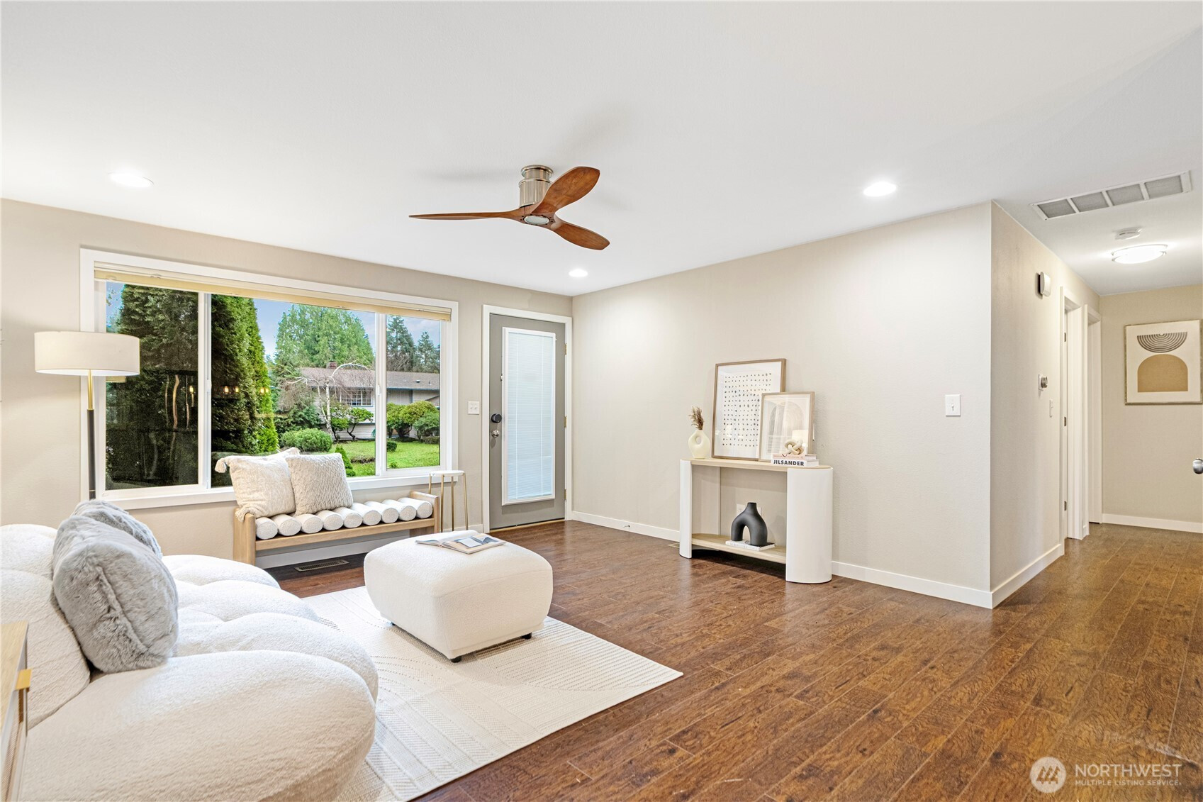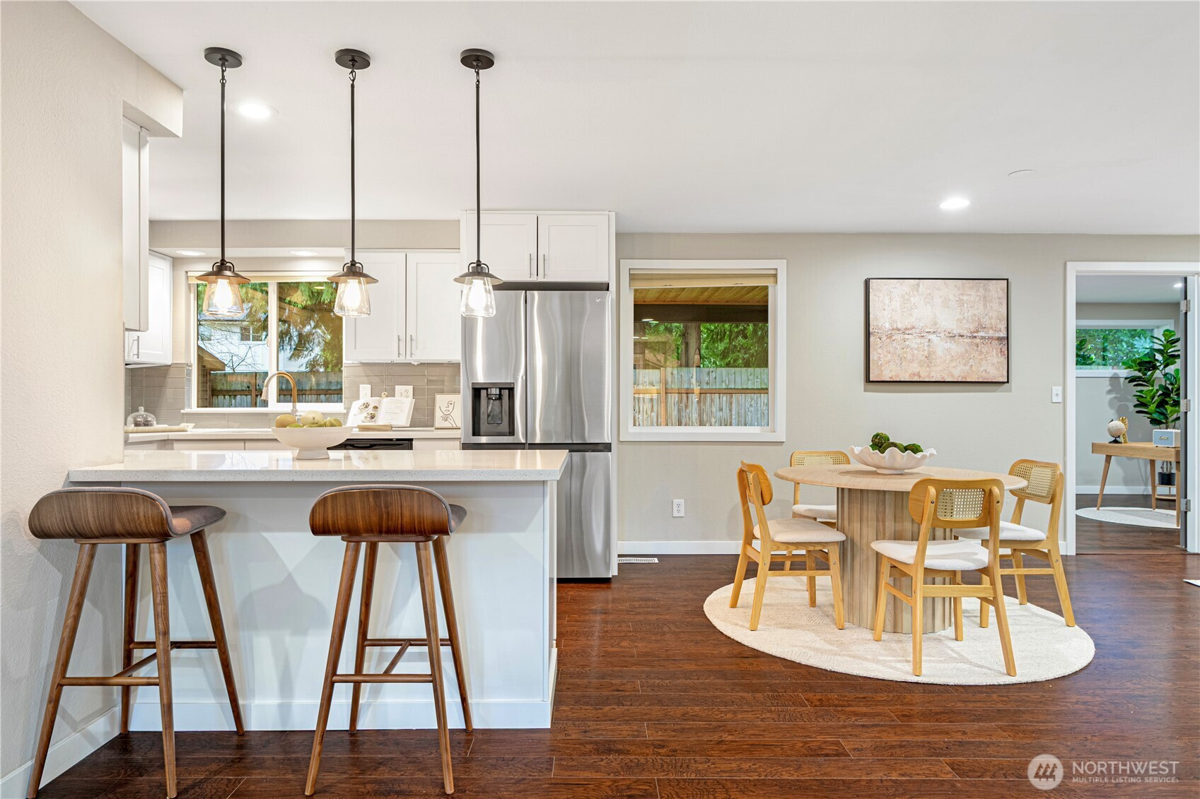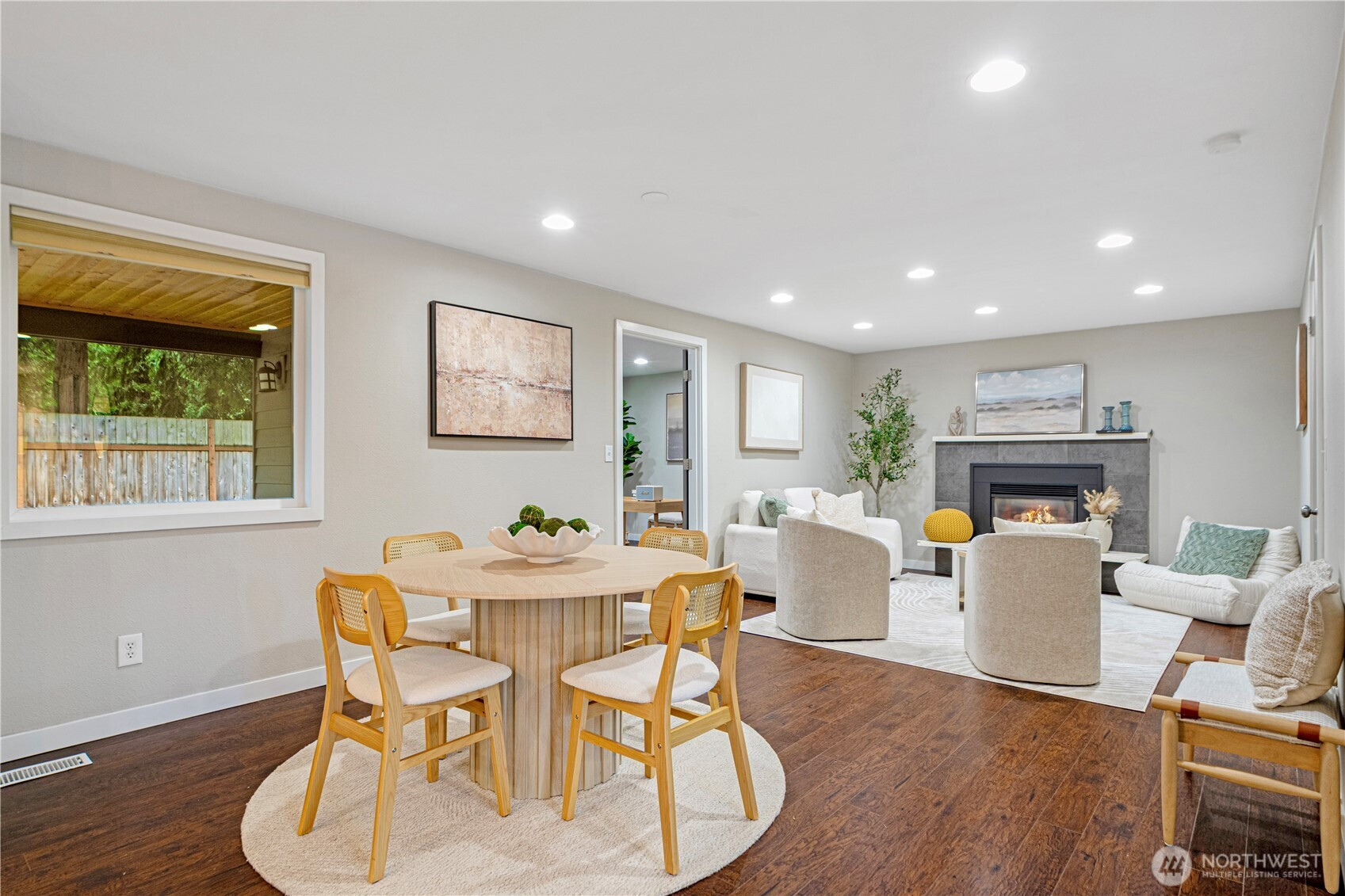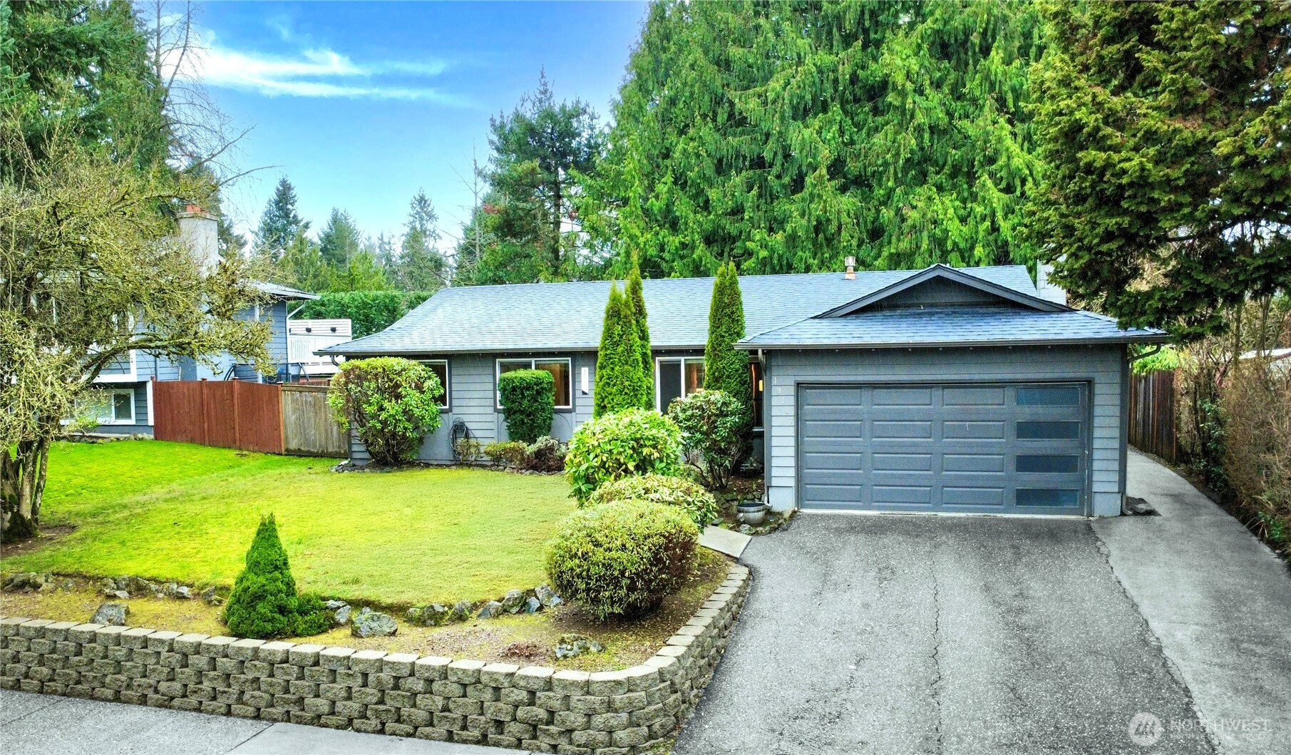 Location, location, location! Charming rambler in a fantastic Kirkland neighborhood! This move-in-ready home features fresh interior paint and a remodeled kitchen with white quartz countertops, glass-tile backsplash, shaker cabinets, and newer stainless-steel appliances. Enjoy two full bathrooms with designer tile and matching quartz counters. The family room showcases a tiled fireplace, creating a warm and inviting space. Additional upgrades include a permitted 4th room, central A/C, 2-car garage with EV charging. Amazing location: minutes to I-405, EvergreenHealth, Juanita Beach, and less than a mile to The Village at Totem Lake’s shopping and dining scene. Great Lake Washington School District, walking distance to the Park & Ride!