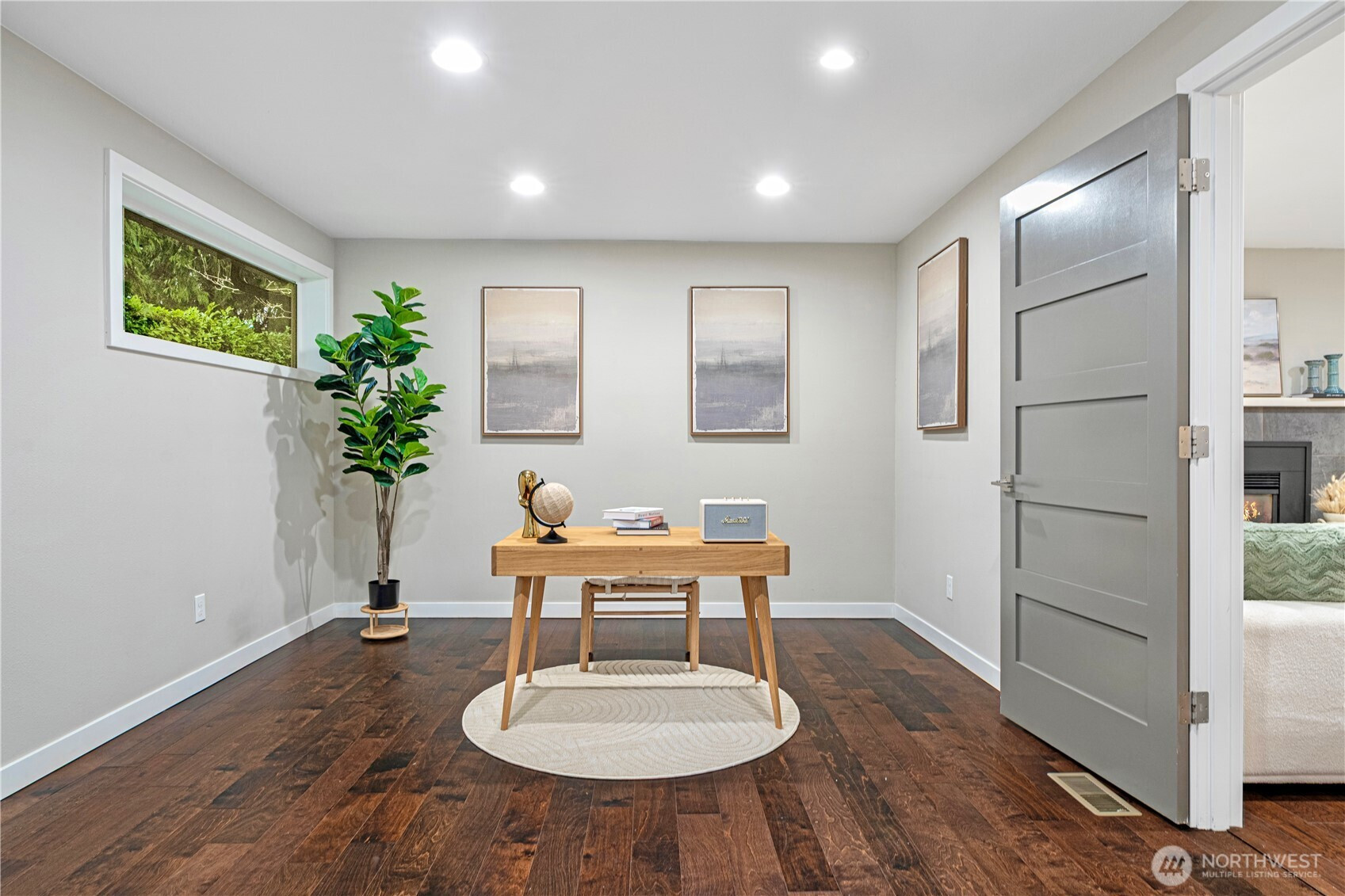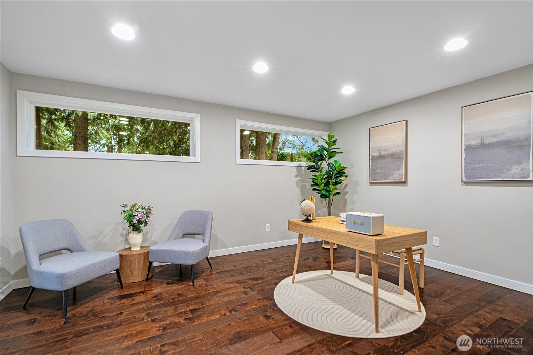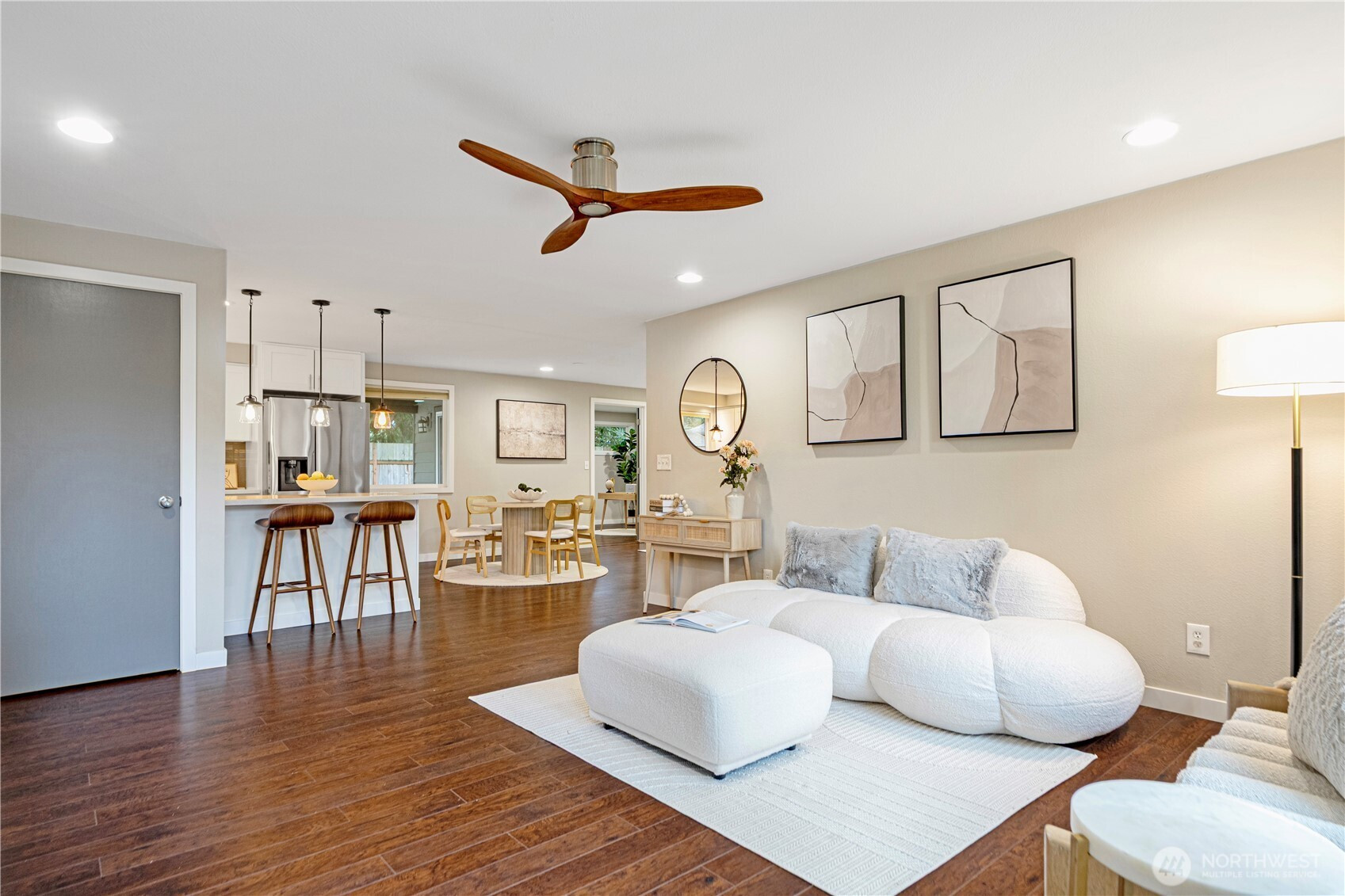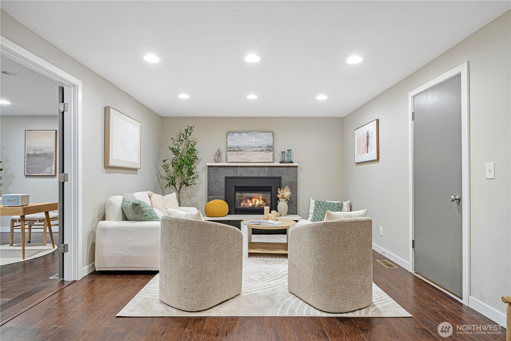 Location, location, location! Charming rambler in a fantastic Kirkland neighborhood! This move-in-ready home features fresh interior paint and a remodeled kitchen with white quartz countertops, glass-tile backsplash, shaker cabinets, and newer stainless-steel appliances. Enjoy two full bathrooms with designer tile and matching quartz counters. The family room showcases a tiled fireplace, creating a warm and inviting space. Additional upgrades include a permitted 4th room, central A/C, 2-car garage with EV charging. Amazing location: minutes to I-405, EvergreenHealth, Juanita Beach, and less than a mile to The Village at Totem Lake’s shopping and dining scene. Great Lake Washington School District, walking distance to the Park & Ride!