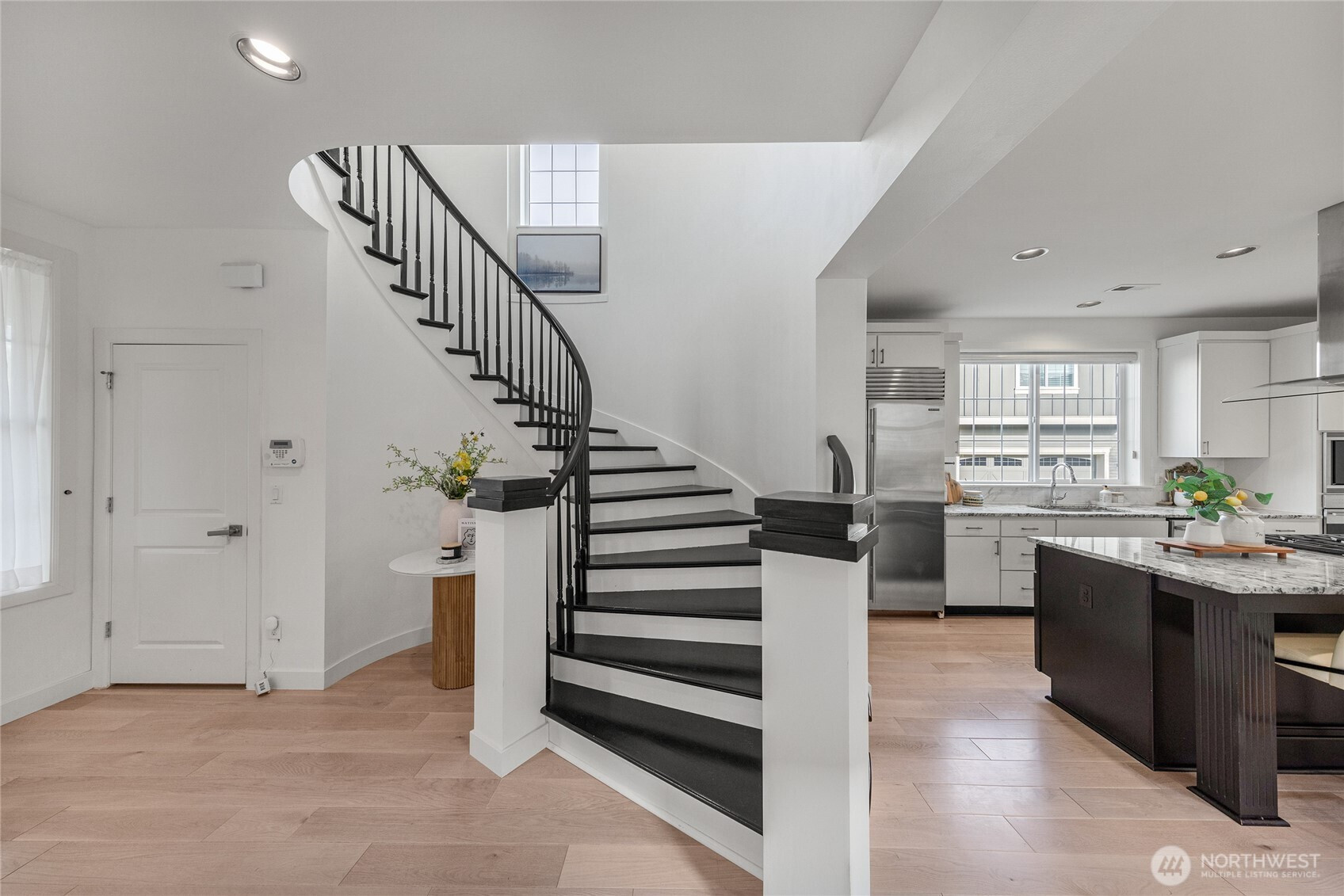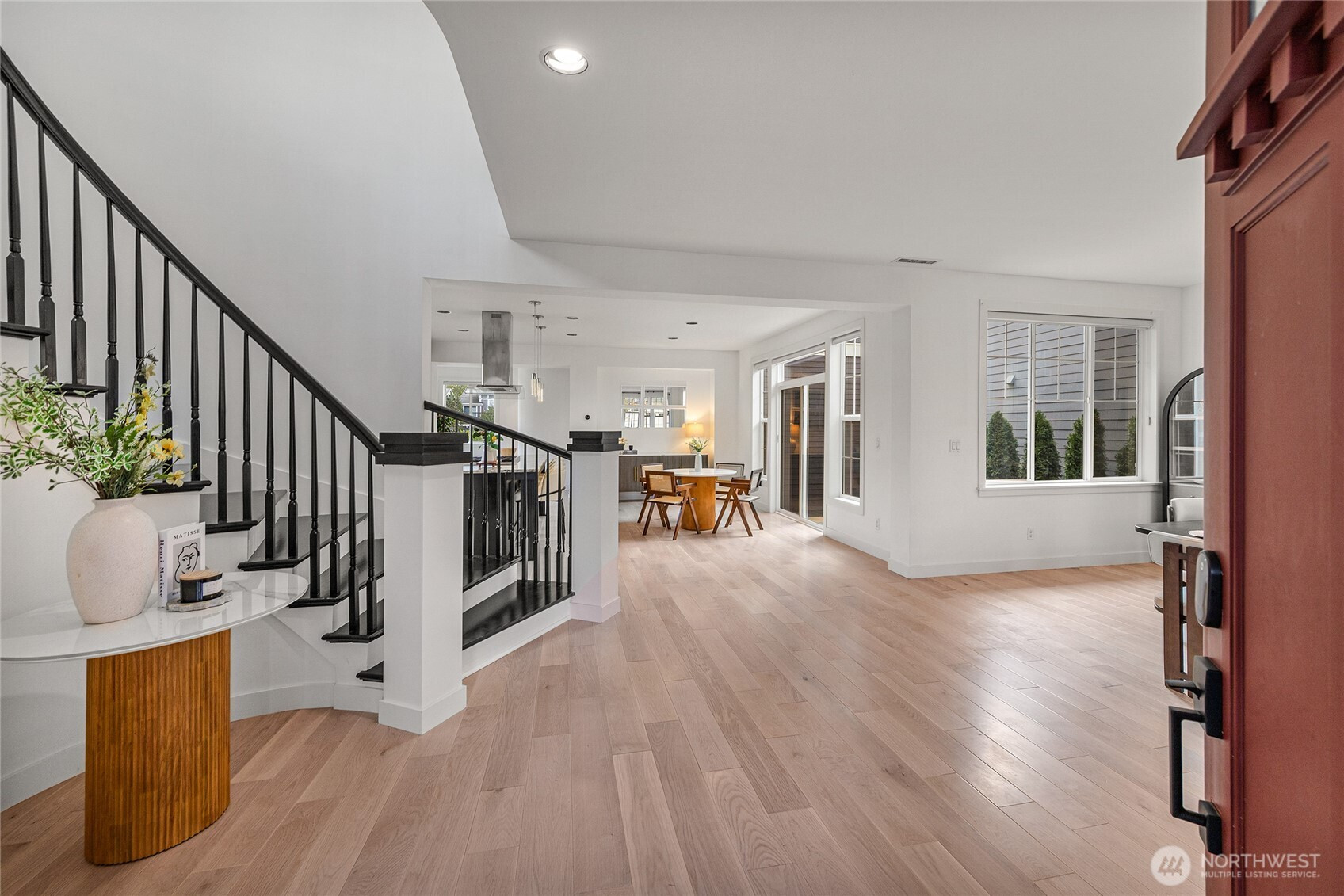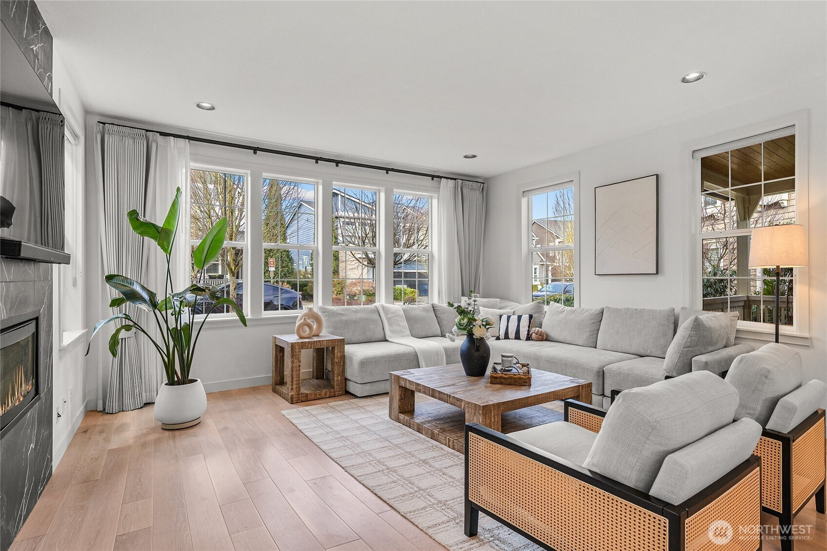 Welcome to this beautifully maintained Toll Brothers home in the coveted Pine Crest community at Issaquah Highlands. Set on a sun-filled corner lot, this 4 bed, 3 bath residence offers a modern great room design with exceptional natural light and a graceful curved staircase that creates a striking architectural focal point. Newly installed engineered hardwood floors and fresh interior and exterior paint provide a crisp, updated feel throughout. The kitchen is thoughtfully designed with a large center island, Wolf appliances, stainless steel finishes, and a stylish backsplash. The spacious primary suite includes motorized blinds, a 5-piece bath, and a generous walk-in closet. Extended patio pavers, central A/C, private office space, and a side-by-side 2-car garage complete the home. Walk to Grand Ridge Plaza, parks, and enjoy easy I-90 access and Issaquah schools.