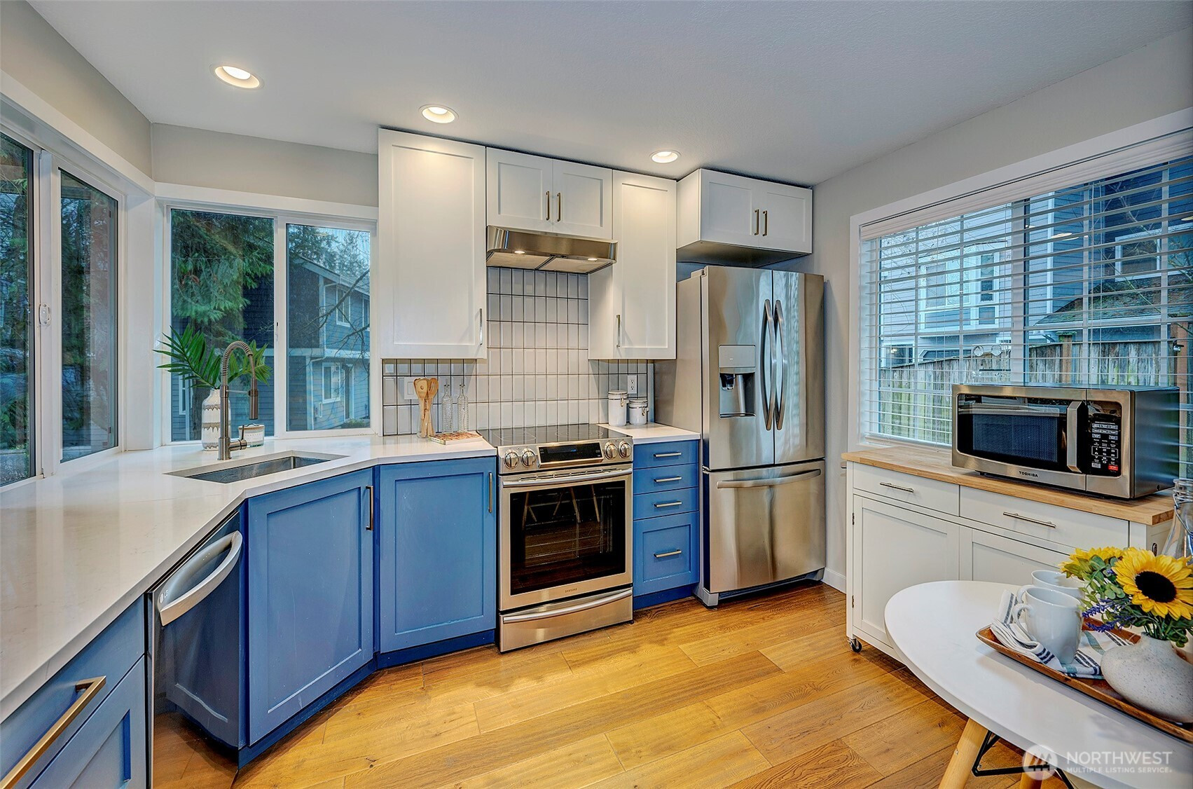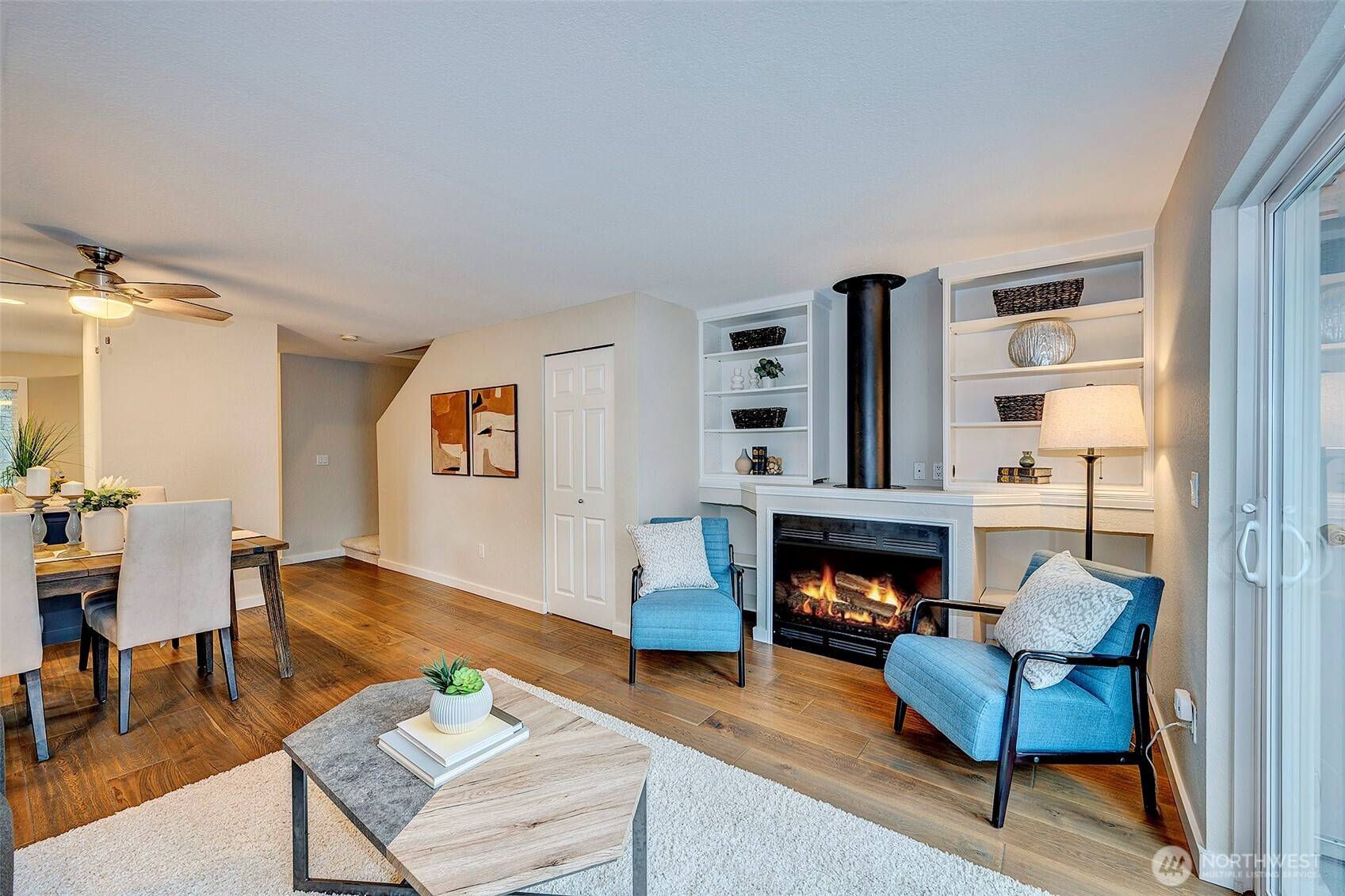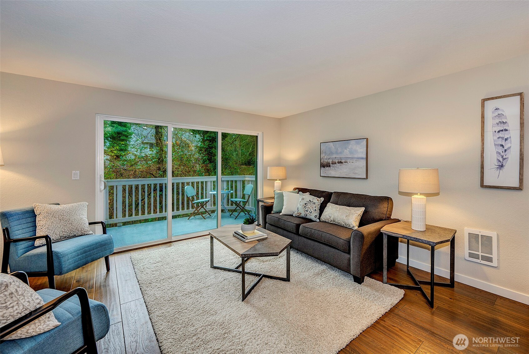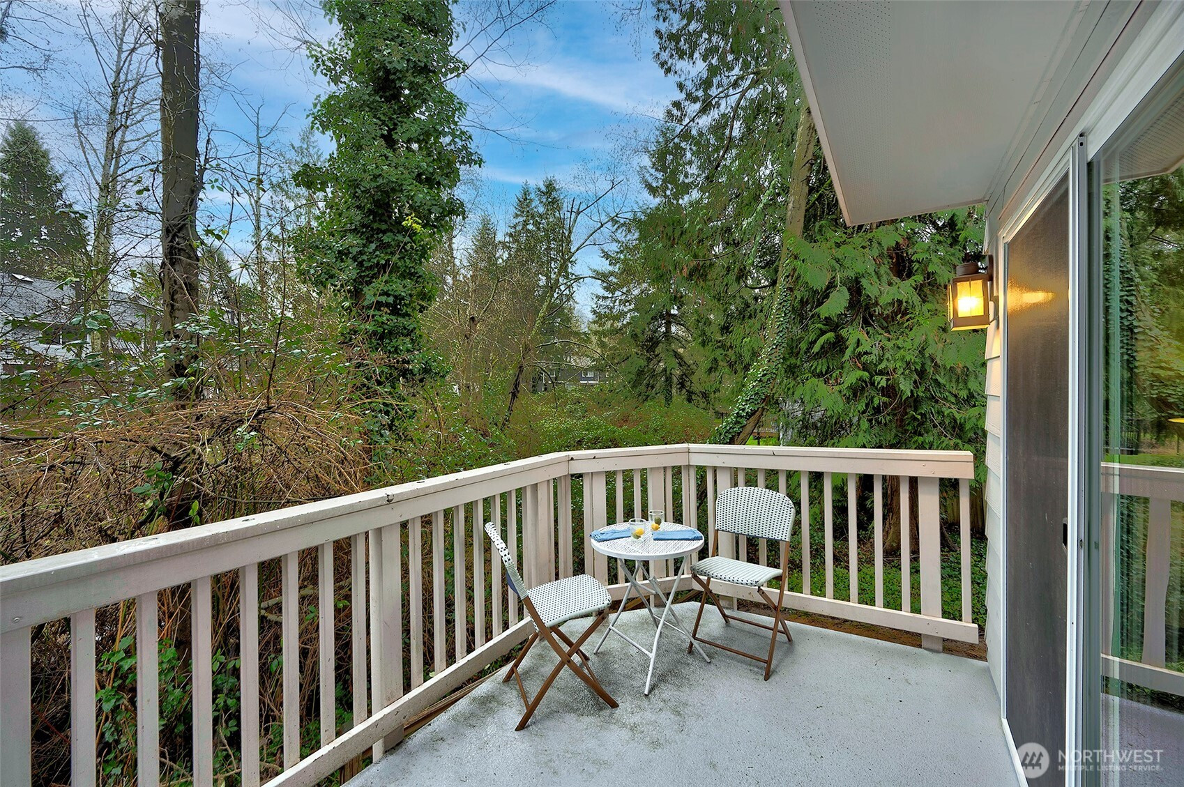 Welcome home to this beautifully updated 3-bed, 2.5-bath, end-unit townhome in Kirkland Village. The kitchen features quartz countertops, tile backsplash, SS appliances, & engineered hardwood floors throughout the main level. The open living & dining area offers a cozy wood-burning fireplace with built-ins & opens to a spacious deck overlooking a serene greenbelt & creek. 1/2 bath & laundry complete the main level. Upstairs are 3 beds & 2 full baths. Updates include new carpet, new vinyl flooring in all baths, & all new paint. An unbeatable location close to shopping, dining, transit, & freeways - a commuter’s dream. Desirable LW Schools with a strong, well-managed HOA & 2 designated parking spaces. A must see!