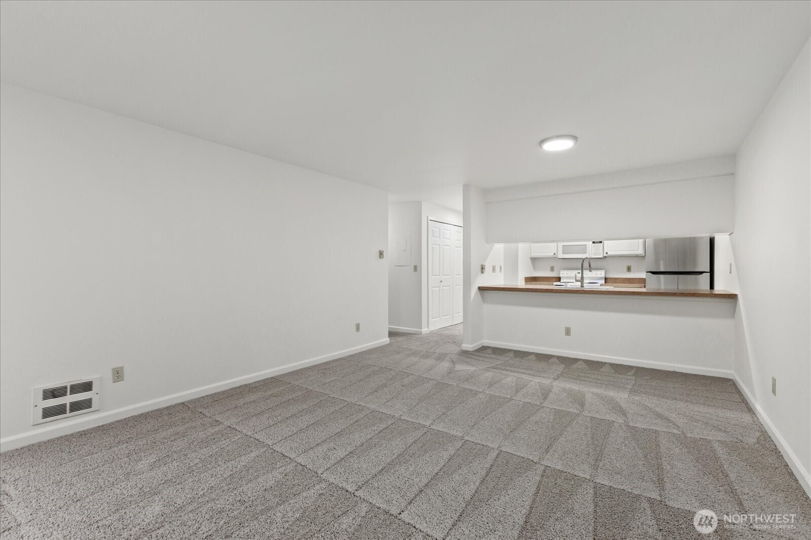Welcome to Harrison Court Condos—beautifully maintained and ideally situated between Maple Leaf and Northgate! Enjoy quick access to light rail, the Kraken Iceplex, shopping, and dining. This secure, pet-friendly unit features an open layout with a bright living room, wood-burning fireplace, and private balcony with storage. The primary bedroom includes a walk-in closet and full bath, while the second bedroom works perfectly for guests or a home office. A second full bath and in-unit full-size W/D add everyday convenience. Fresh interior paint and new carpet make this home move-in ready.