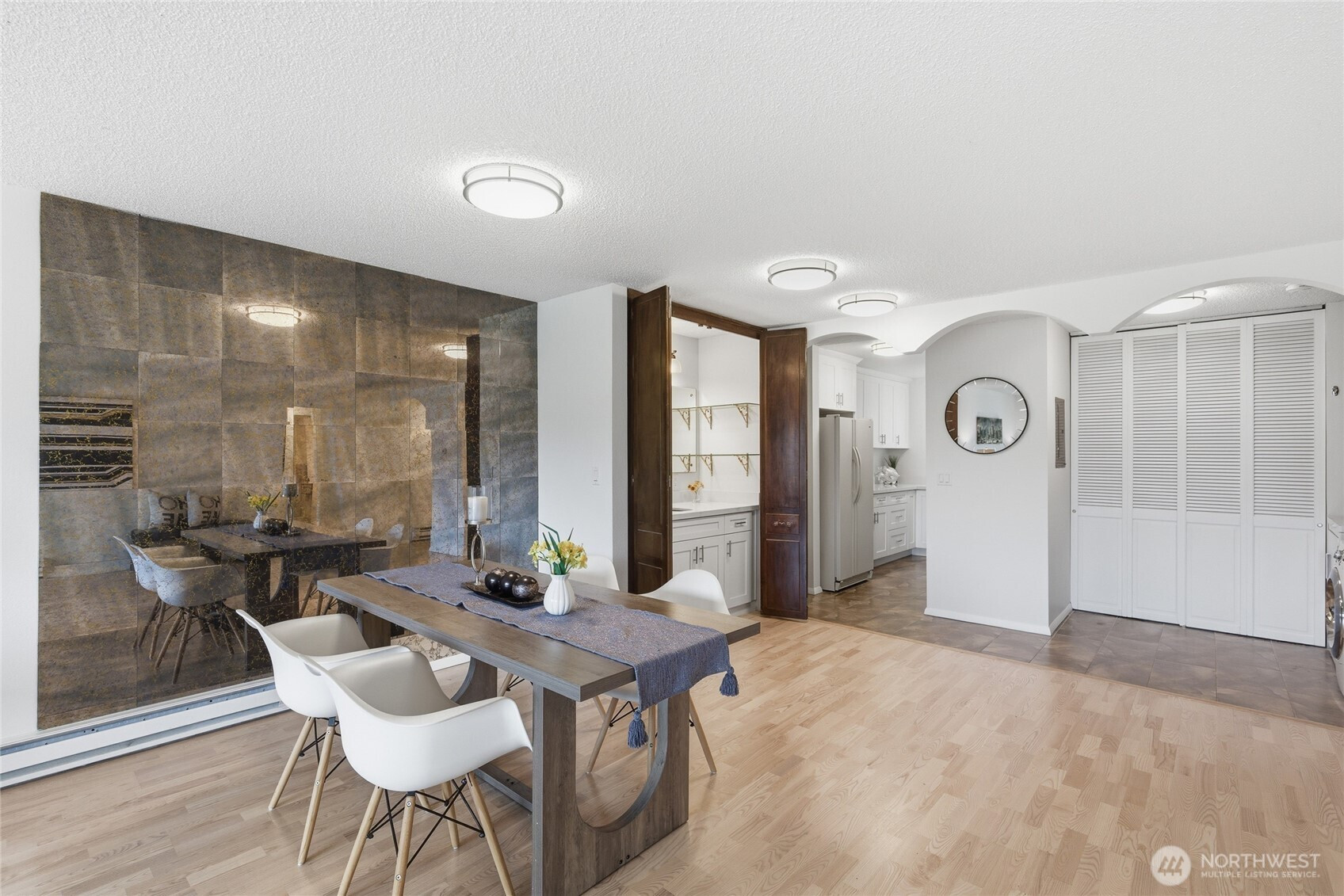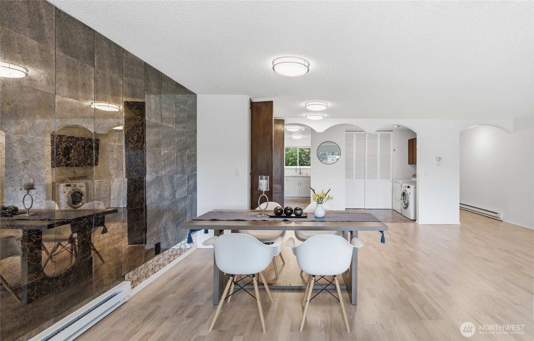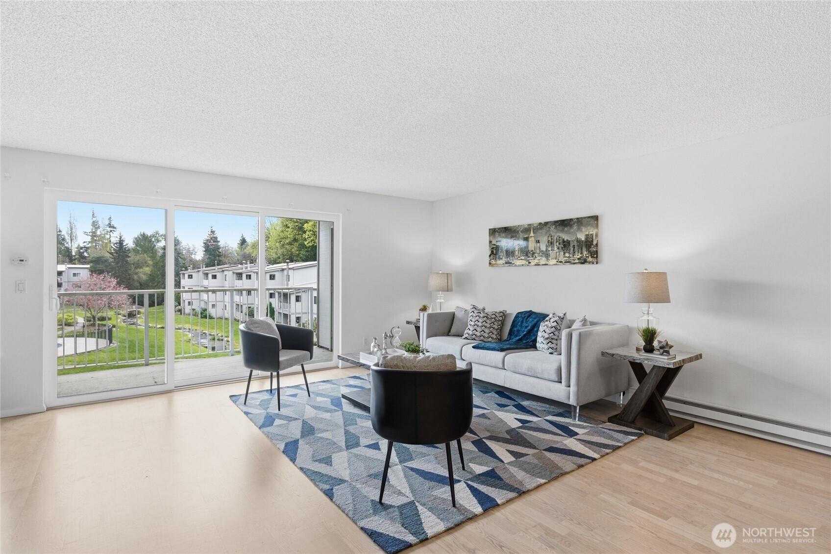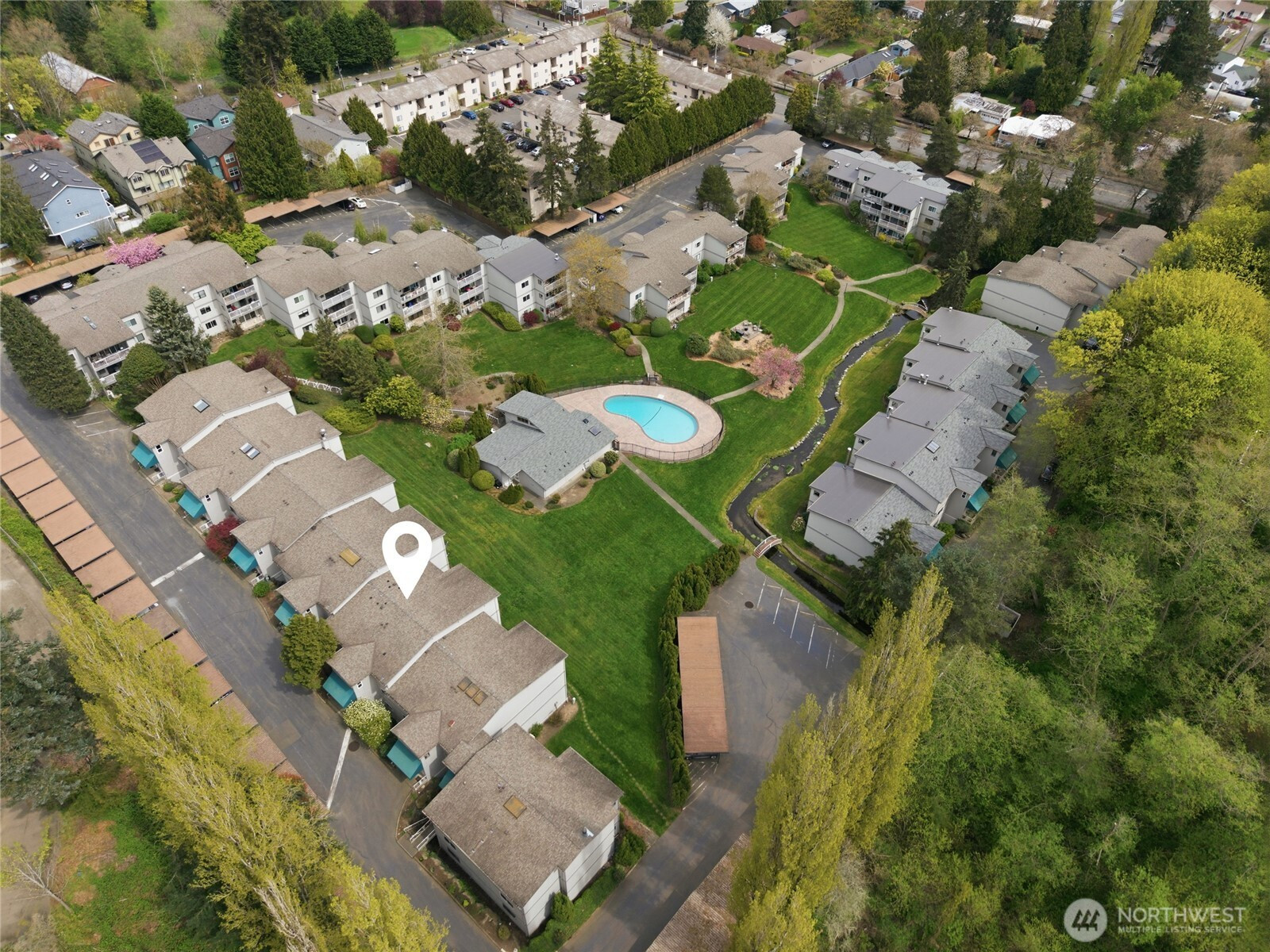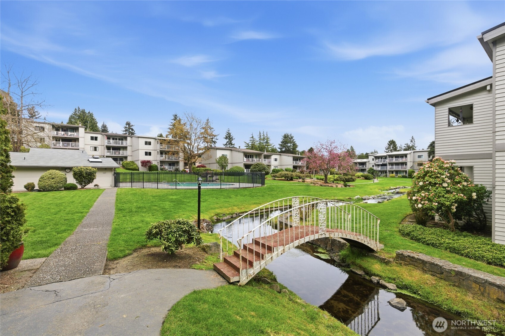 Welcome to this beautifully updated residence in the Bridgehaven community, offering a rare combination of space, comfort, and convenience. This mid level unit features ground level entry with no stairs, providing easy access. Inside, the home opens to an expansive living space rarely found in today’s market, creating flexibility for both relaxing and entertaining. The renovated kitchen features modern appliances and clean finishes, while updated bathrooms bring a cohesive feel throughout. Newer windows and a recently replaced water heater add comfort and long term value. Generously sized bedrooms with oversized closets offer exceptional storage, while an in unit washer and dryer enhances everyday functionality. A wet bar adds an ideal touch for hosting. Step out to your private balcony and enjoy the peaceful, park like setting surrounded by mature landscaping. Additional highlights include two covered parking spaces, a valuable and hard to find feature. Residents enjoy amenities including a pool, hot tub, sauna, and clubhouse, all within a well established community. Ideally located near Jackson Park Golf Course, with easy access to I 5, transit along 15th Ave NE, and the Northgate light rail for connectivity to downtown, UW, and beyond. A rare opportunity to own a spacious, updated condo in one of North Seattle’s most convenient locations.