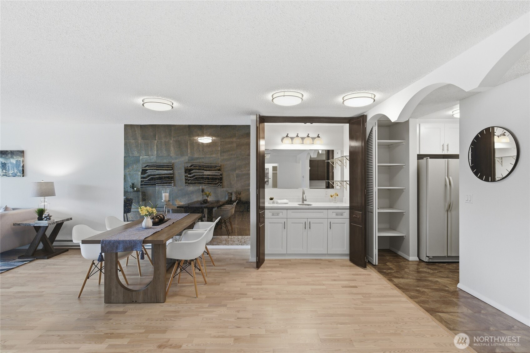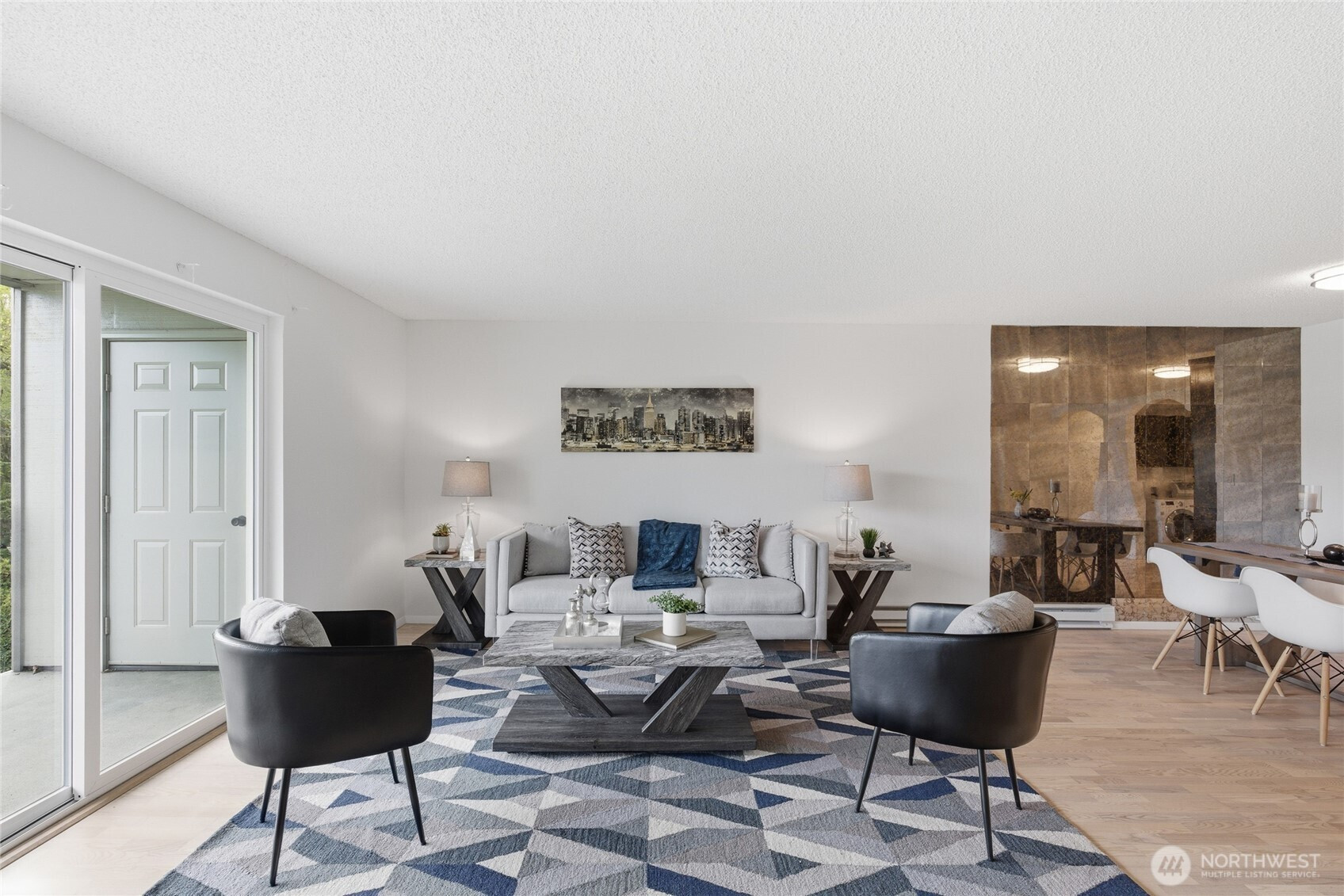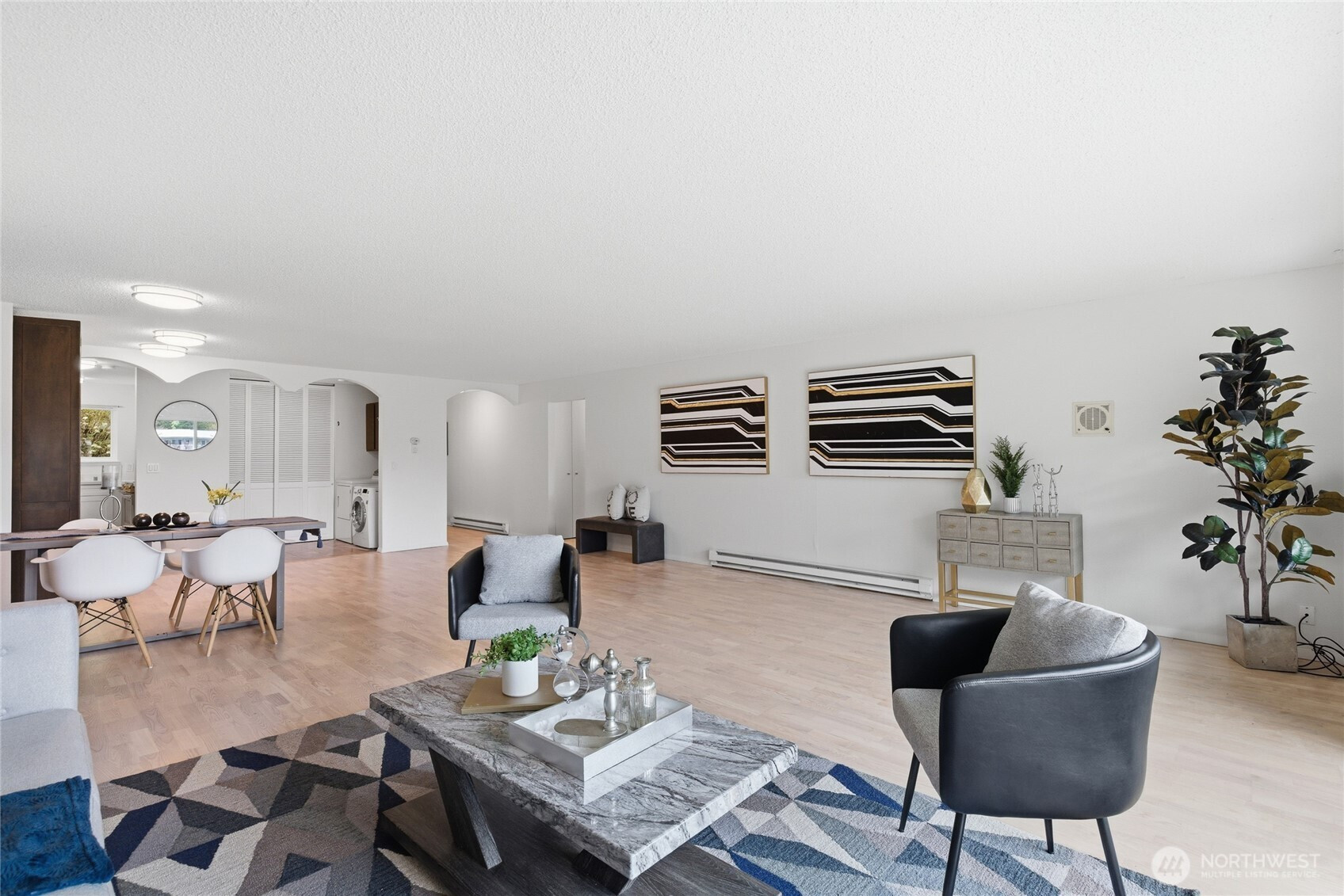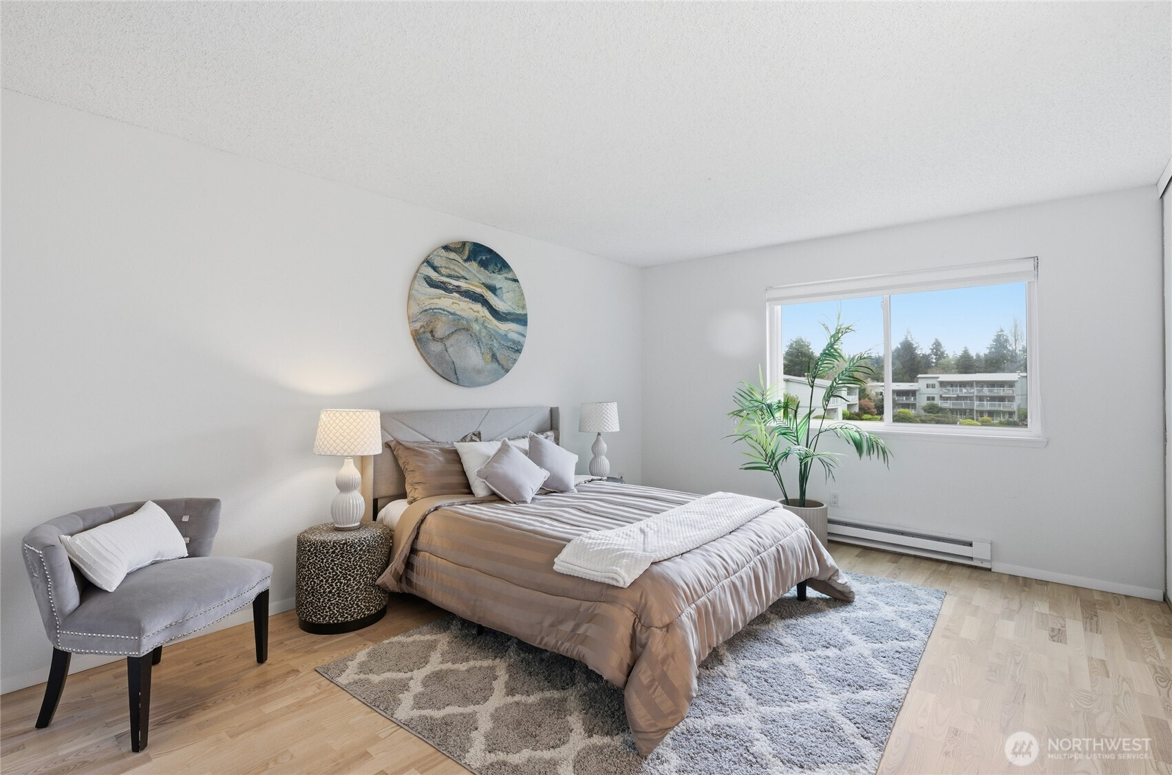 Welcome to this beautifully updated residence in the Bridgehaven community, offering a rare combination of space, comfort, and convenience. This mid level unit features ground level entry with no stairs, providing easy access. Inside, the home opens to an expansive living space rarely found in today’s market, creating flexibility for both relaxing and entertaining. The renovated kitchen features modern appliances and clean finishes, while updated bathrooms bring a cohesive feel throughout. Newer windows and a recently replaced water heater add comfort and long term value. Generously sized bedrooms with oversized closets offer exceptional storage, while an in unit washer and dryer enhances everyday functionality. A wet bar adds an ideal touch for hosting. Step out to your private balcony and enjoy the peaceful, park like setting surrounded by mature landscaping. Additional highlights include two covered parking spaces, a valuable and hard to find feature. Residents enjoy amenities including a pool, hot tub, sauna, and clubhouse, all within a well established community. Ideally located near Jackson Park Golf Course, with easy access to I 5, transit along 15th Ave NE, and the Northgate light rail for connectivity to downtown, UW, and beyond. A rare opportunity to own a spacious, updated condo in one of North Seattle’s most convenient locations.