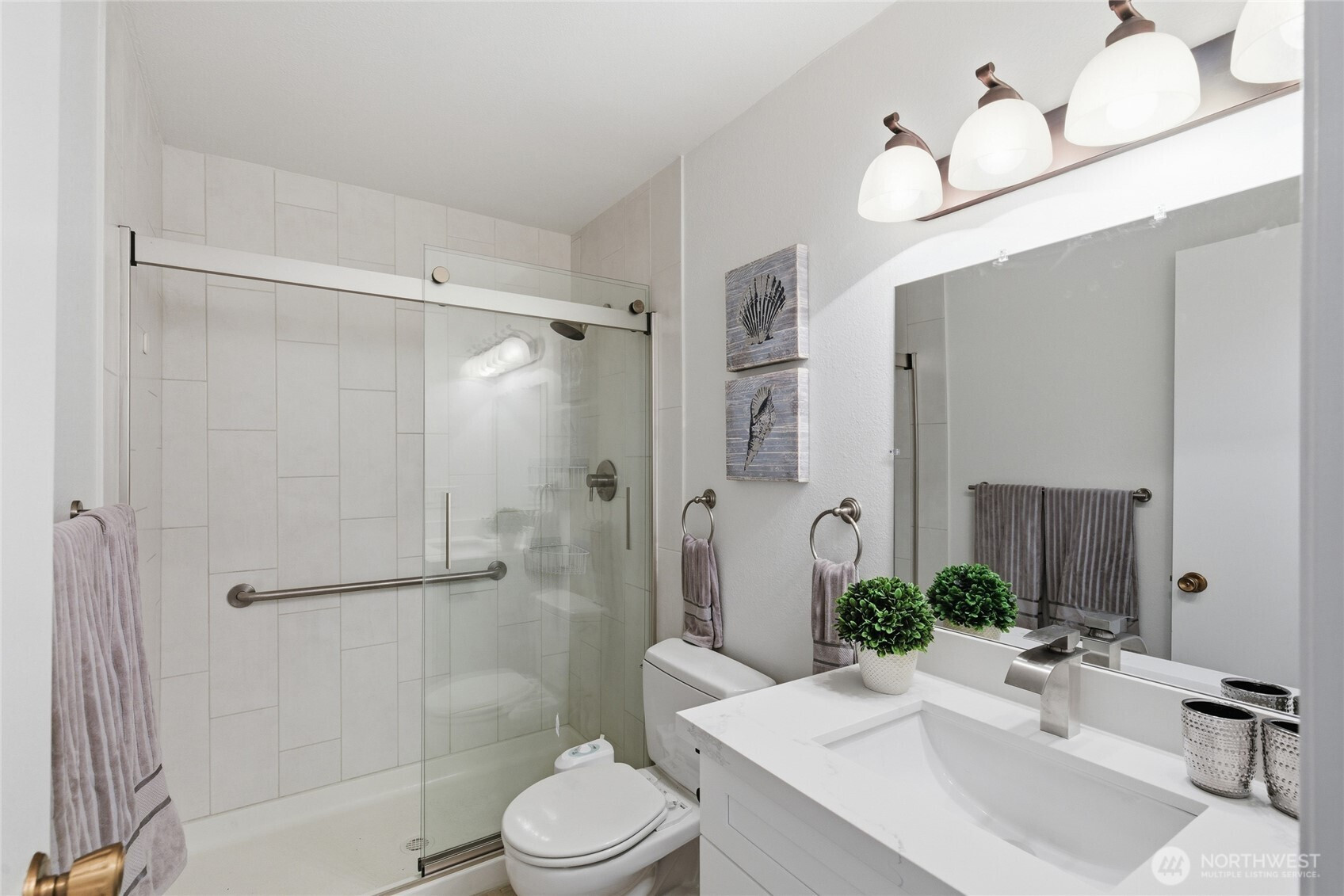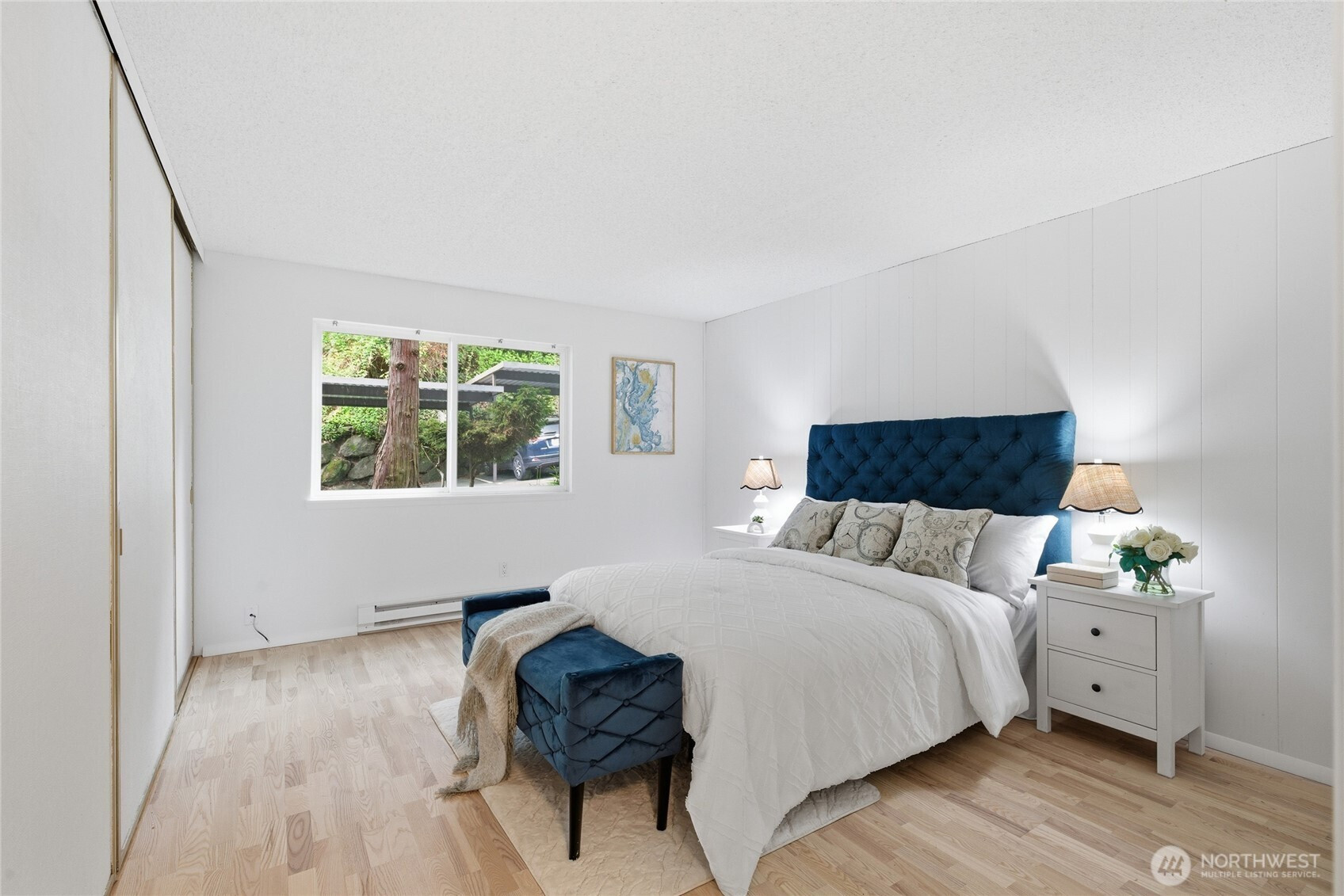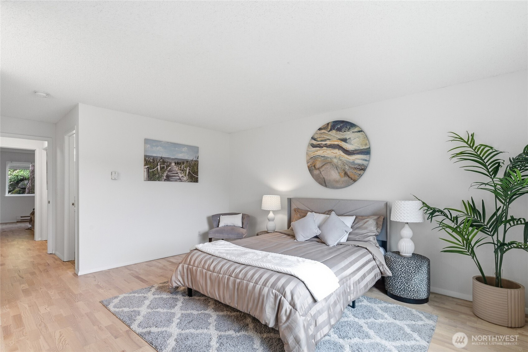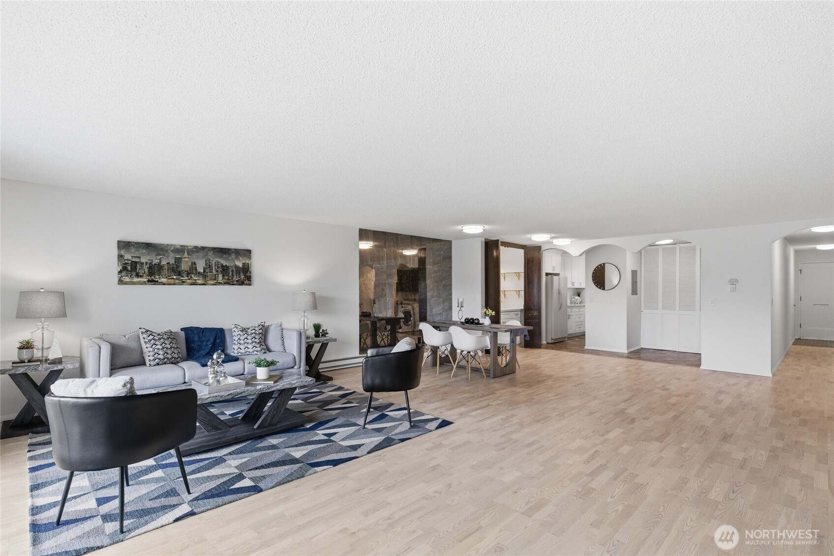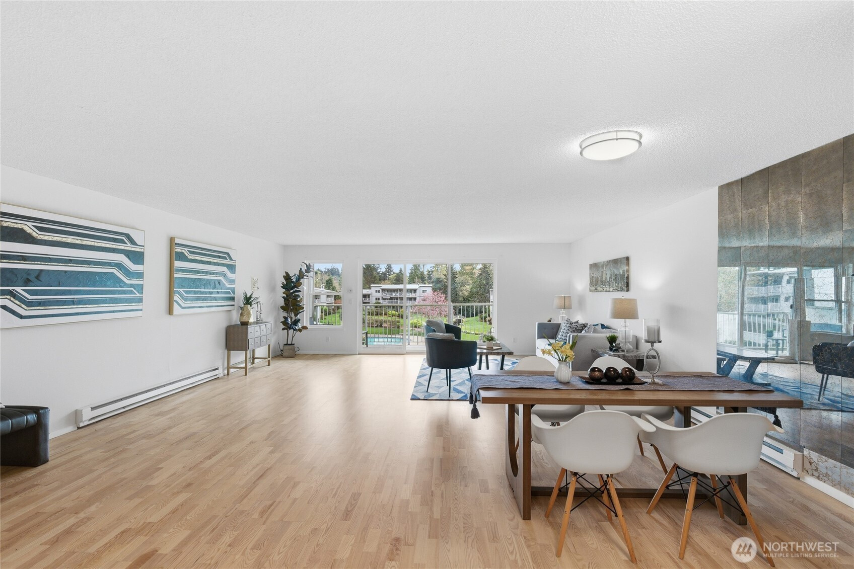 Welcome to this beautifully updated residence in the Bridgehaven community, offering a rare combination of space, comfort, and convenience. This mid level unit features ground level entry with no stairs, providing easy access. Inside, the home opens to an expansive living space rarely found in today’s market, creating flexibility for both relaxing and entertaining. The renovated kitchen features modern appliances and clean finishes, while updated bathrooms bring a cohesive feel throughout. Newer windows and a recently replaced water heater add comfort and long term value. Generously sized bedrooms with oversized closets offer exceptional storage, while an in unit washer and dryer enhances everyday functionality. A wet bar adds an ideal touch for hosting. Step out to your private balcony and enjoy the peaceful, park like setting surrounded by mature landscaping. Additional highlights include two covered parking spaces, a valuable and hard to find feature. Residents enjoy amenities including a pool, hot tub, sauna, and clubhouse, all within a well established community. Ideally located near Jackson Park Golf Course, with easy access to I 5, transit along 15th Ave NE, and the Northgate light rail for connectivity to downtown, UW, and beyond. A rare opportunity to own a spacious, updated condo in one of North Seattle’s most convenient locations.