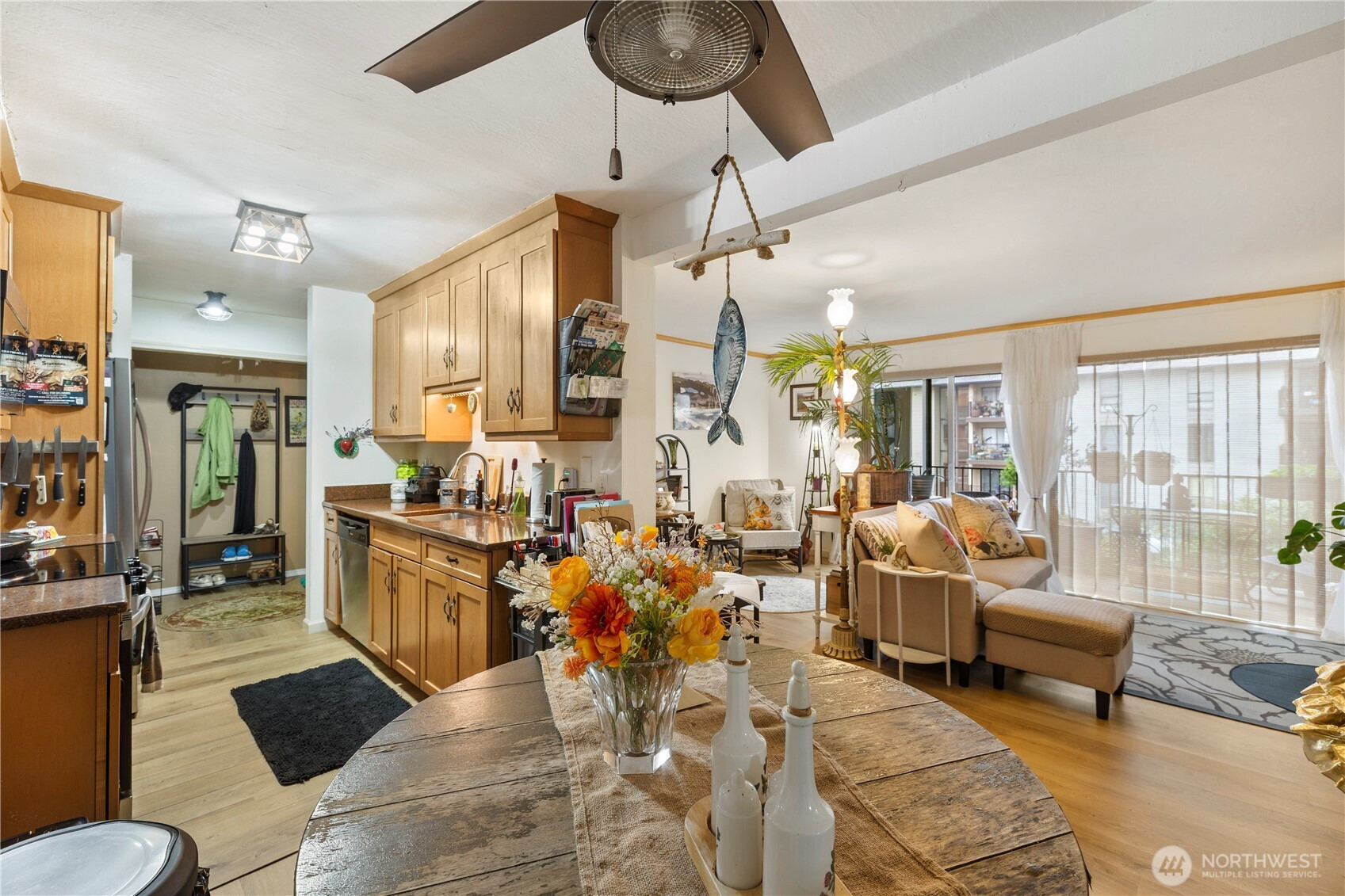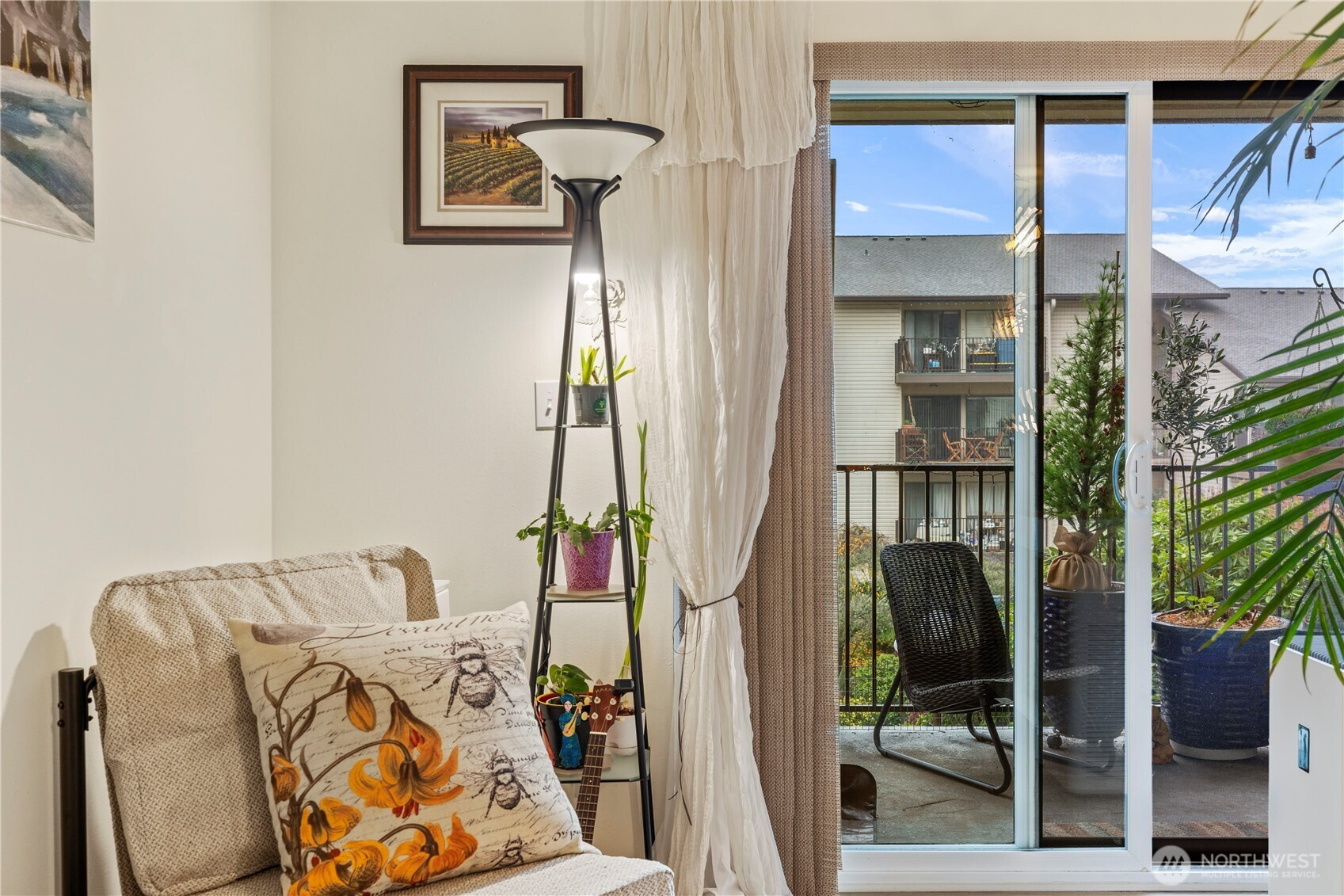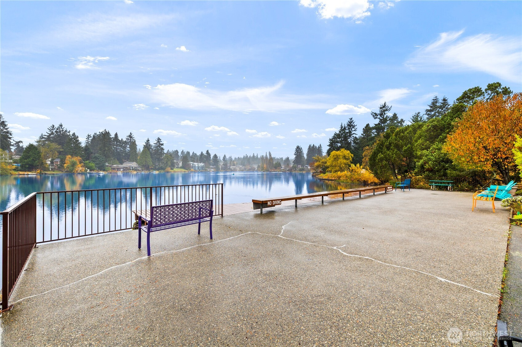 Lakefront living at its finest! This desirable interior unit has a private balcony overlooking the courtyard gardens and pool with view of the lake. This complex is one of Seattle's best kept secrets with fully gated access hiding a private beach on Bitter Lake with dock and fishing pier, a tennis court, a huge heated pool with cabana containing event space, kitchenette and changing rooms; and two nicely appointed game/exercise rooms. Nicely remodeled with new appliances and bathroom cabinetry, ceiling fan, a new electric fireplace, and a small in-unit washer dryer. Includes deeded parking space and storage locker on balcony. Enjoy peaceful comfort and the benefits of resort style living in the heart of Seattle :)