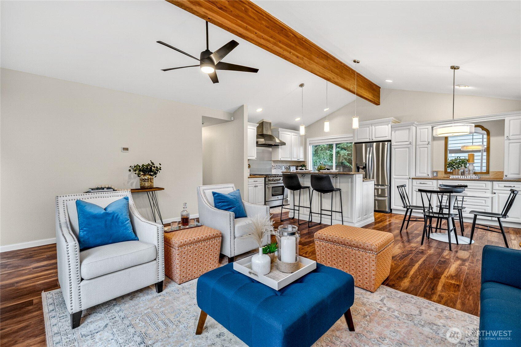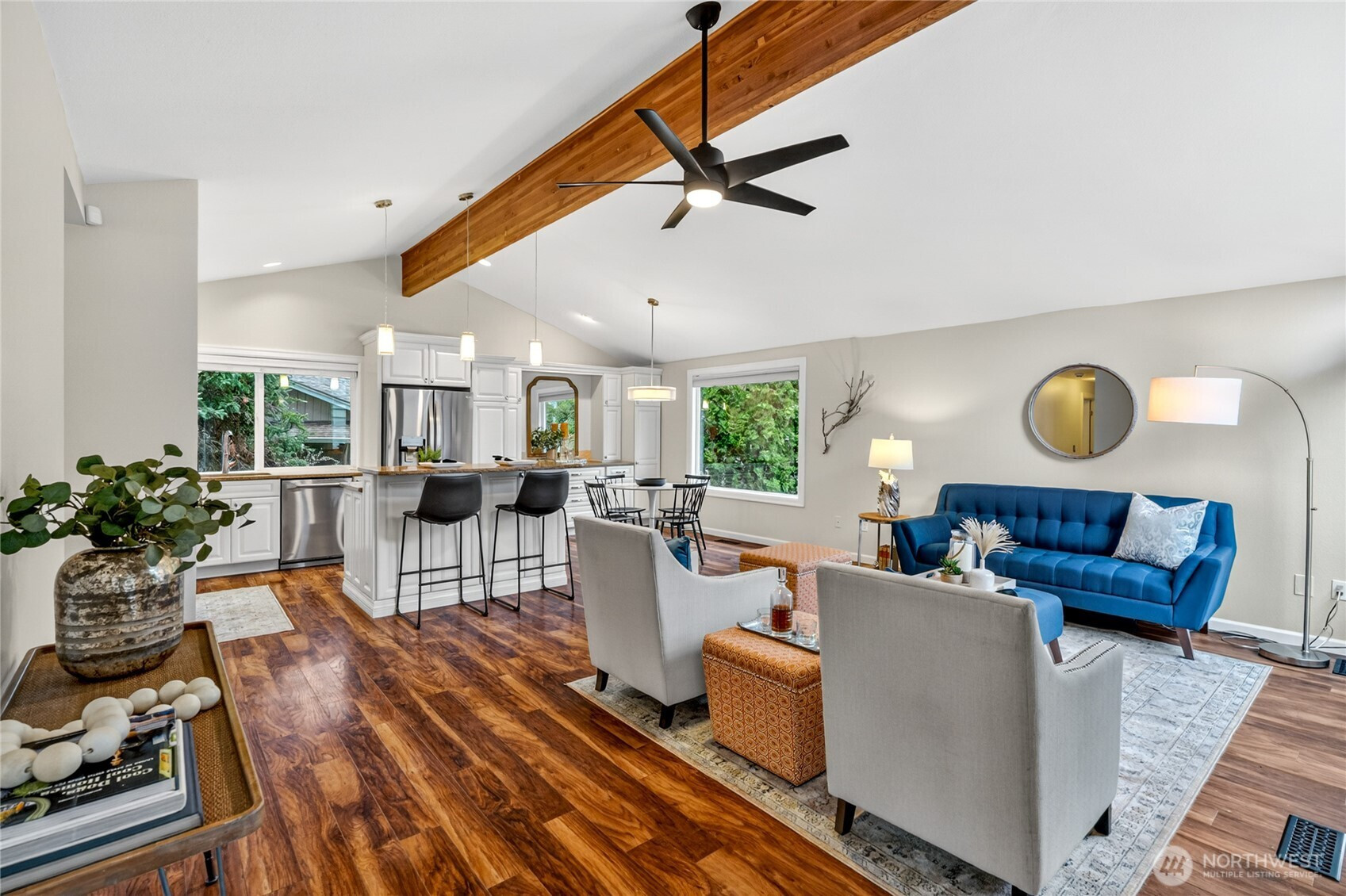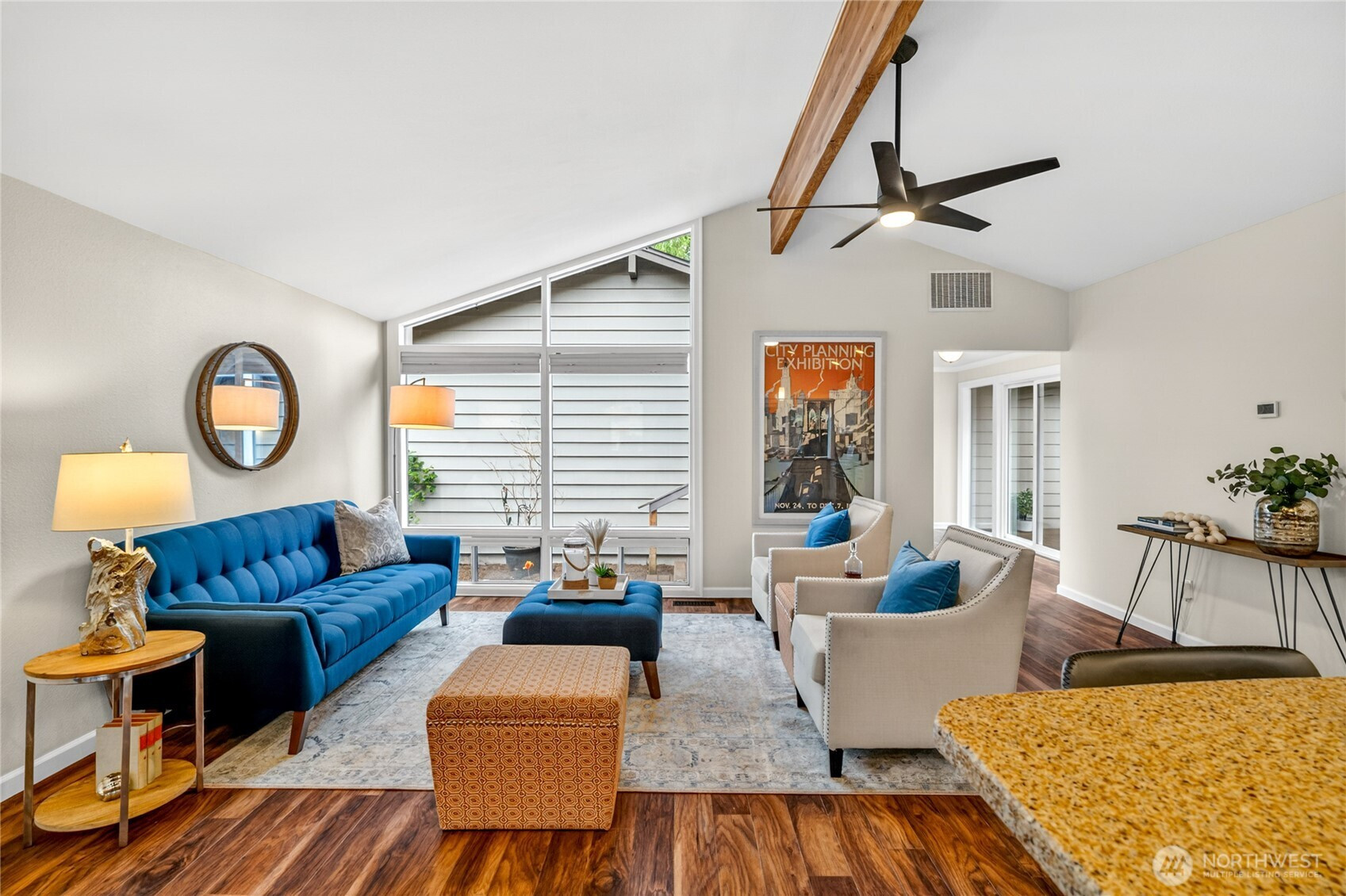 Not your average home—and that’s exactly the point. With mid-century influence and a layout you don’t see every day, this home is designed around connection, light, and space. A private courtyard entry welcomes you in, while a glass-encased breezeway links two distinct wings—creating a seamless indoor-outdoor flow that feels both open and intentional. Vaulted ceilings and an airy layout lead into a remodeled kitchen featuring a large island, commercial BlueStar range, and extensive cabinetry—ready for everything from quiet mornings to a full house. Both bathrooms have been fully remodeled, including a primary suite with its own ¾ bath. A 2016 addition introduces a spacious bonus room—ideal for movie nights, game days, or a space that finally flexes the way you need it to. Step outside and the property truly shines. A terraced backyard rises behind the home, offering layered garden views, privacy, and multiple outdoor spaces—including a courtyard-style retreat with hot tub. A detached shop with power, water, and garage door adds incredible flexibility for projects, hobbies, workspace—or potential future ADU. Brand new roof (April 2026), remodeled bathrooms, new lighting, and fresh interior paint throughout—walls, trim, doors, and ceilings—paired with new lighting and laminate flooring, completes the home. Located in Fairwood West with a 2-car garage and generous driveway parking. A home that stands apart and that you won't forget.