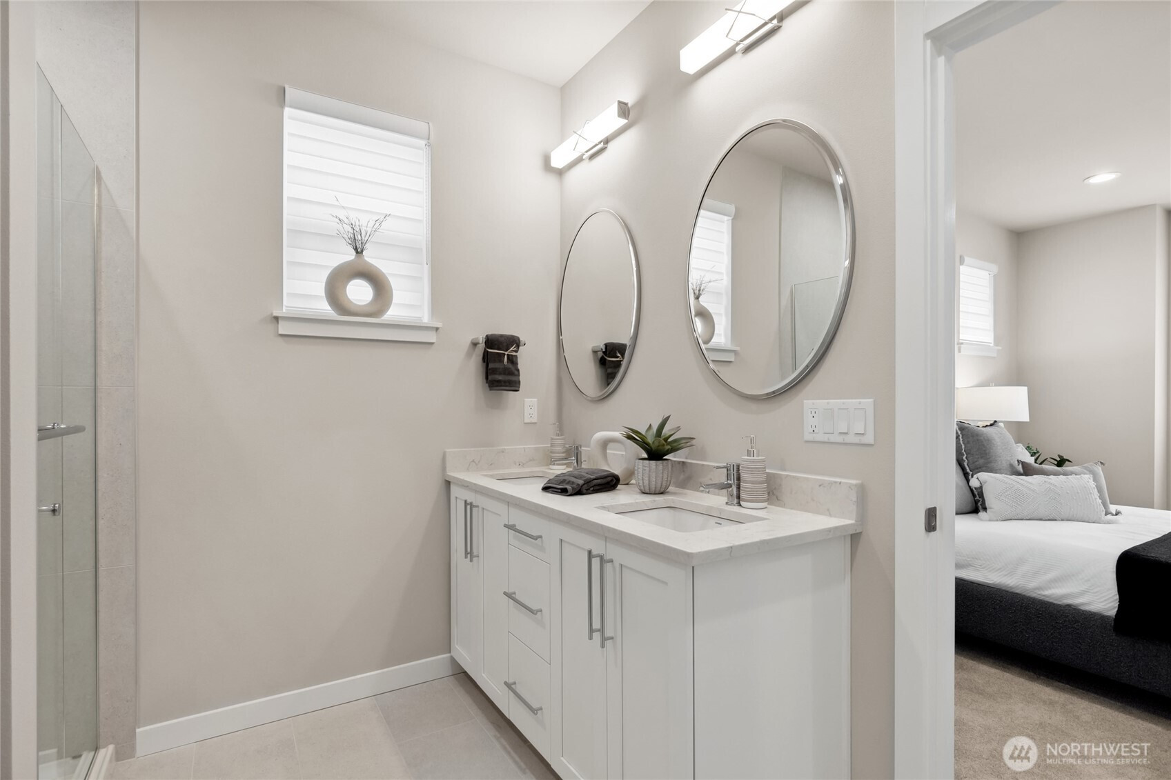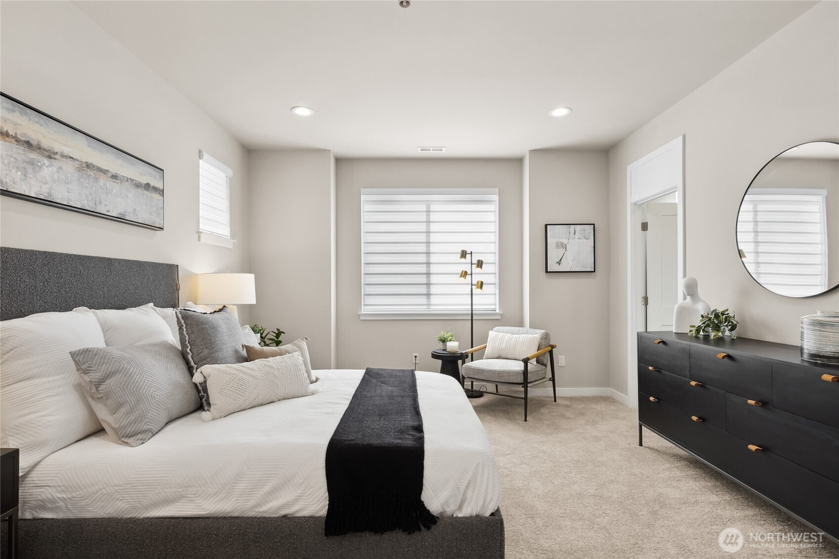 This northeast-facing Residence 2 offers 4 beds, 3.5 bath w/ a 2 car garage and your covered deck faces southwest for sunny afternoons! 3 bedrooms up & a lower-level bedroom/den w/ its own entrance & bathroom! Enjoy cooking in your open kitchen w/ oversized island in the heart of the home. Spacious private suite boasts separate sinks & walk-in closet. You'll love the slab quartz counters, 5 burner gas cooktop, soft close cabs, blinds, surround sound, all appliances, and huge covered Trex deck off the dining rm. Lake WA schools, 220V car outlet, Smart Home features & A/C too! Buyers must register their broker on site at first visit, including open houses. Below market rates for qualified buyers.