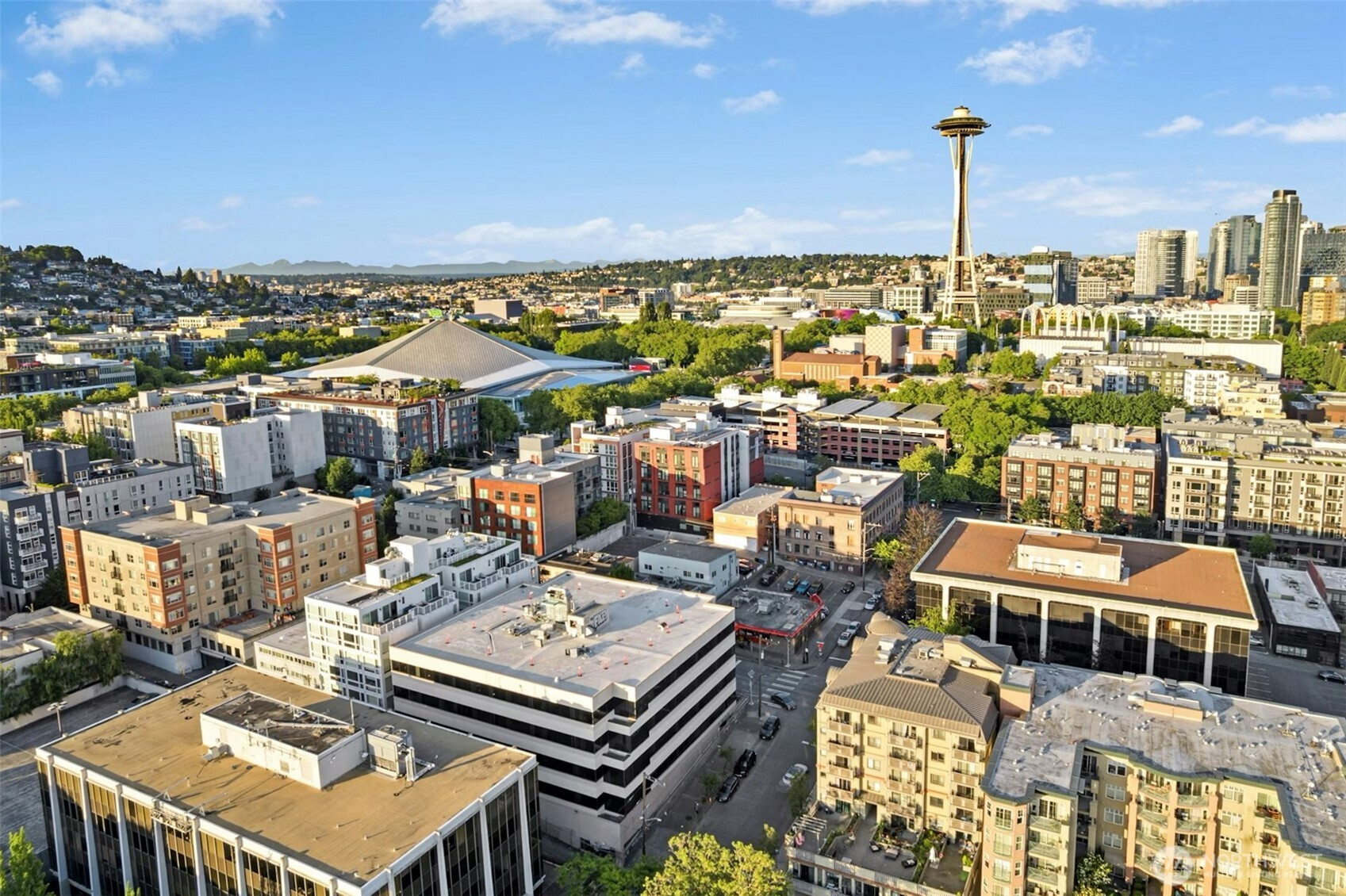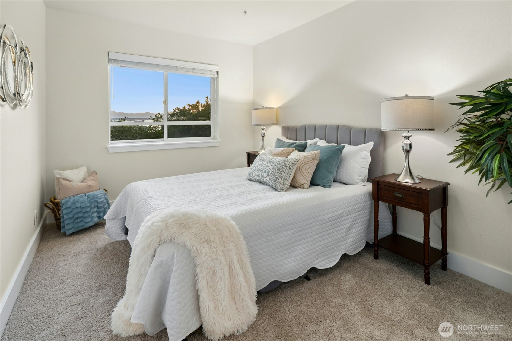 Stunning Elliot Bay and Olympic Mountain views from this bright Selano condo at the nexus of Lower Queen Anne, Belltown, and South Lake Union. Wind down watching ferries glide past Olympic Mountain sunsets from your living area and private deck, then wake up to Elliott Bay views and the iconic PI Globe from your primary bedroom. This condo is refreshingly quiet. Freshly painted with brand-new carpet and sleek engineered hardwoods, this home blends clean design with everyday comfort. The versatile second bedroom is ideal for a home office or guest space, with its own 2nd deck. In-unit washer/dryer, secured garage parking, and private storage add convenience. Pet-friendly, no rental cap, and LOW HOA DUES for the area — this is city living, streamlined.