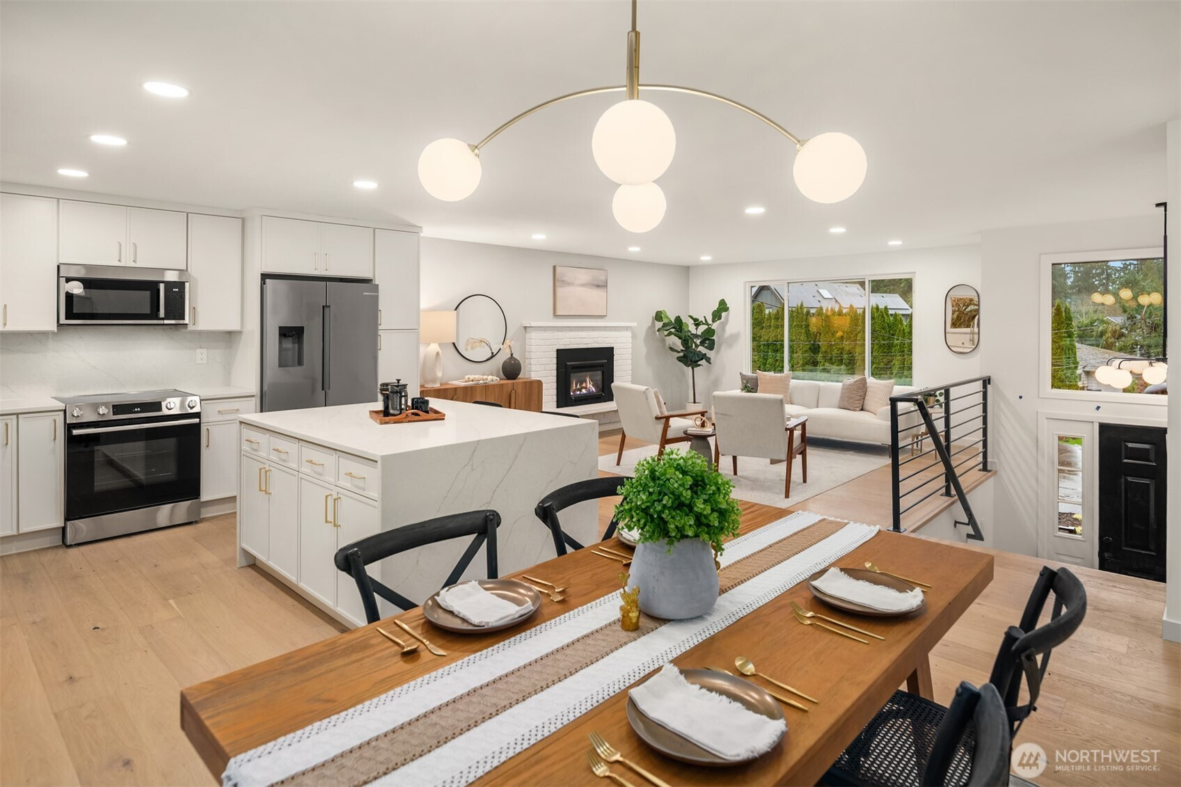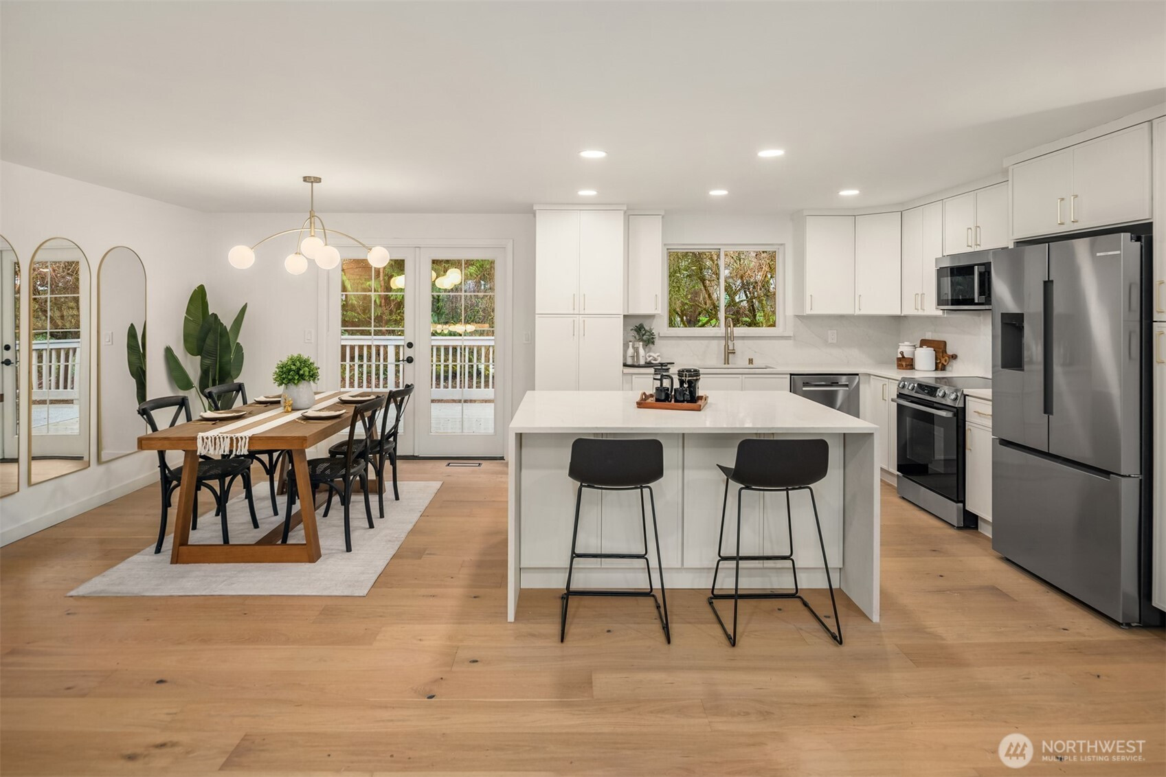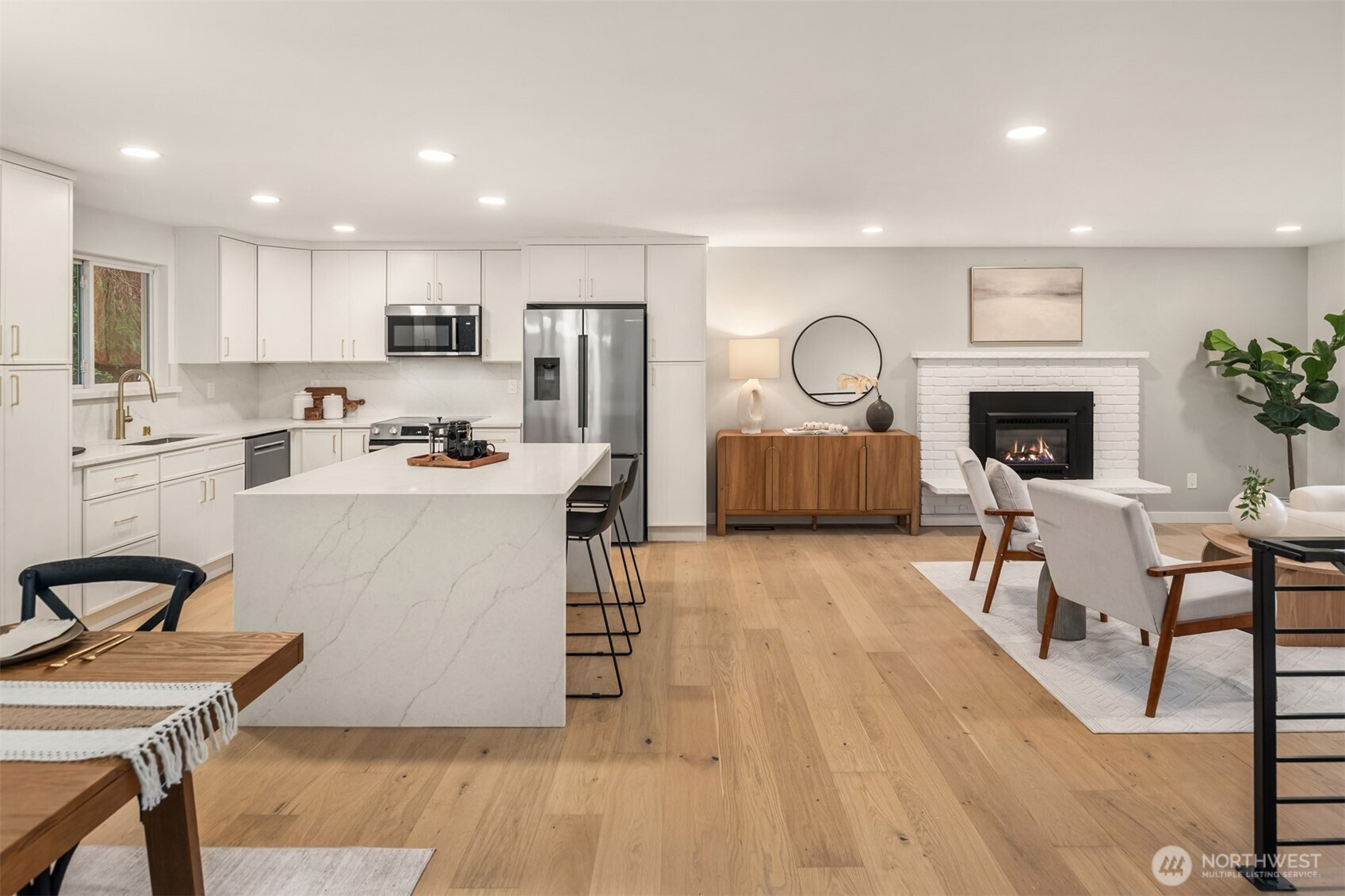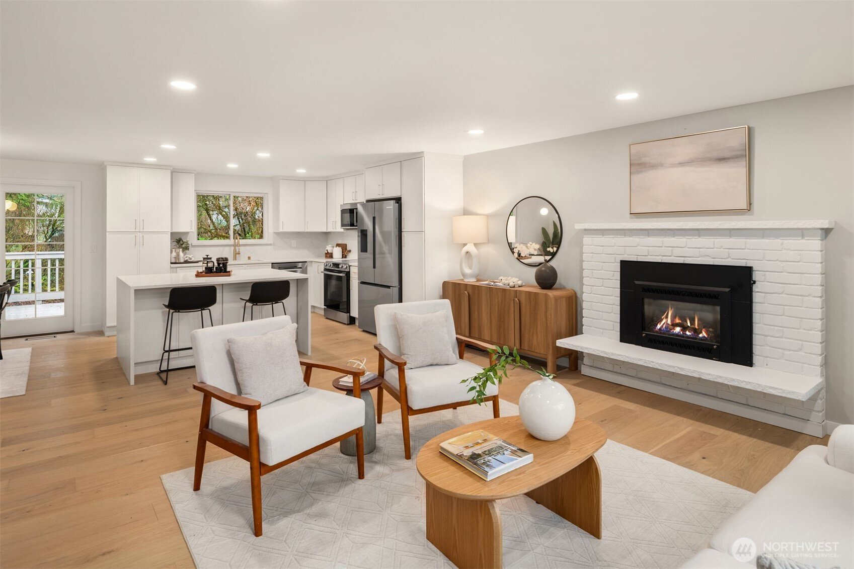 Completely reimagined home with DADU potential on 12,450 sq ft lot in highly sought-after South Rose Hill . Tucked away at the end of a private drive, this beautifully appointed residence offers style, comfort, and functionality throughout. The main level showcases white oak hardwood flooring, a stunning high-end kitchen featuring quartz countertops, shaker-style cabinetry, and stainless steel appliances. The open-concept living and dining areas are anchored by a cozy gas fireplace and provide seamless access to the outdoor deck, making it ideal for entertaining and enjoying warm summer evenings. The spacious primary suite includes a luxurious bath with tile floors and a custom surround. Two additional bedrooms and a full bathroom complete the main floor. Upon entering the lower level you'll find a large family room ideal for gatherings or movie nights, an additional bedroom/flex space, a three-quarter bath, and a dedicated laundry room. Fully finished two-car garage adds convenience and practicality. Located within the top-rated Lake WA school district and offering an easy commute to both downtown Redmond and Kirkland and tech hubs. This home is just minutes from highly rated restaurants, parks, and everyday amenities.