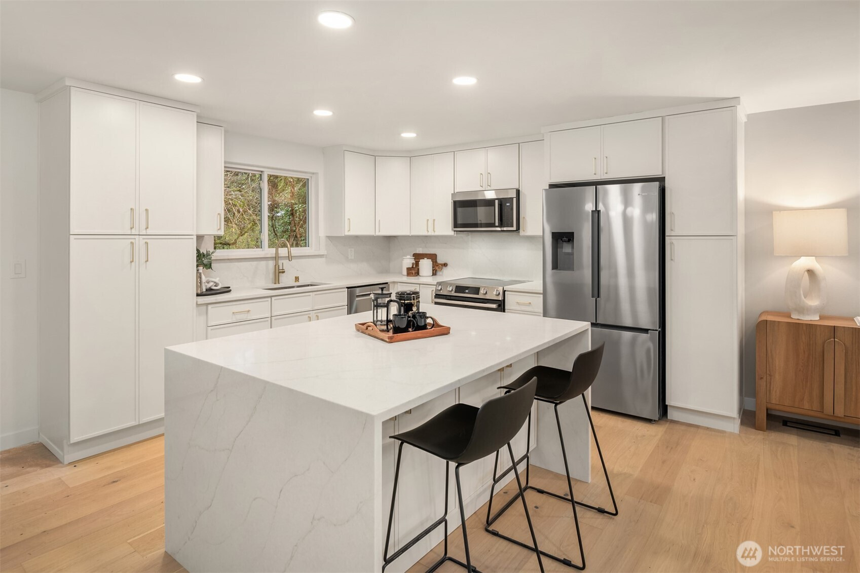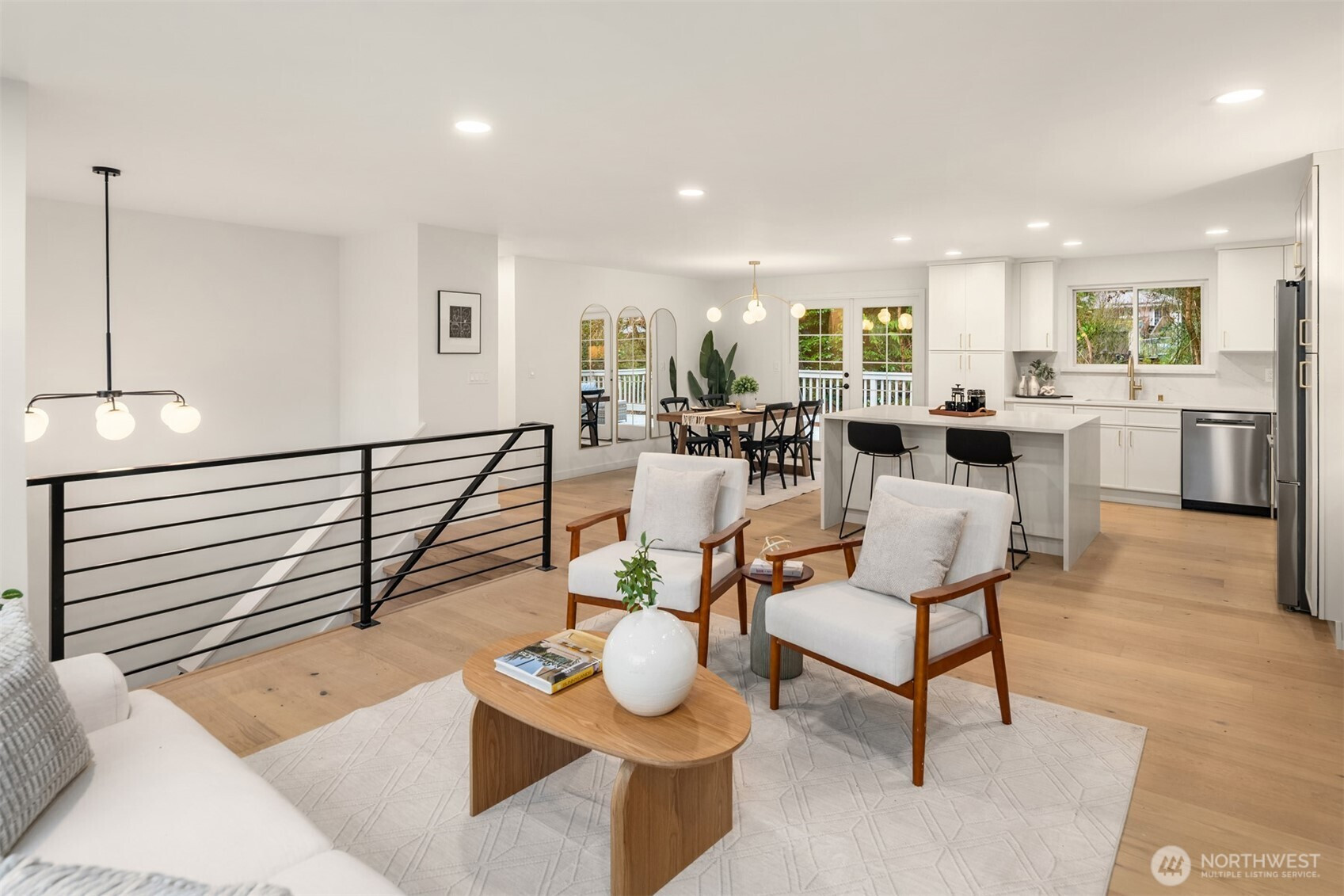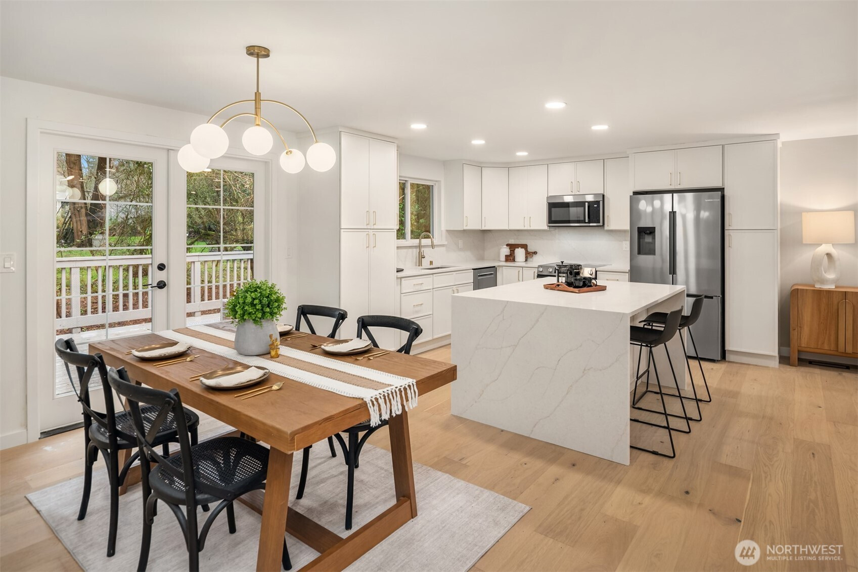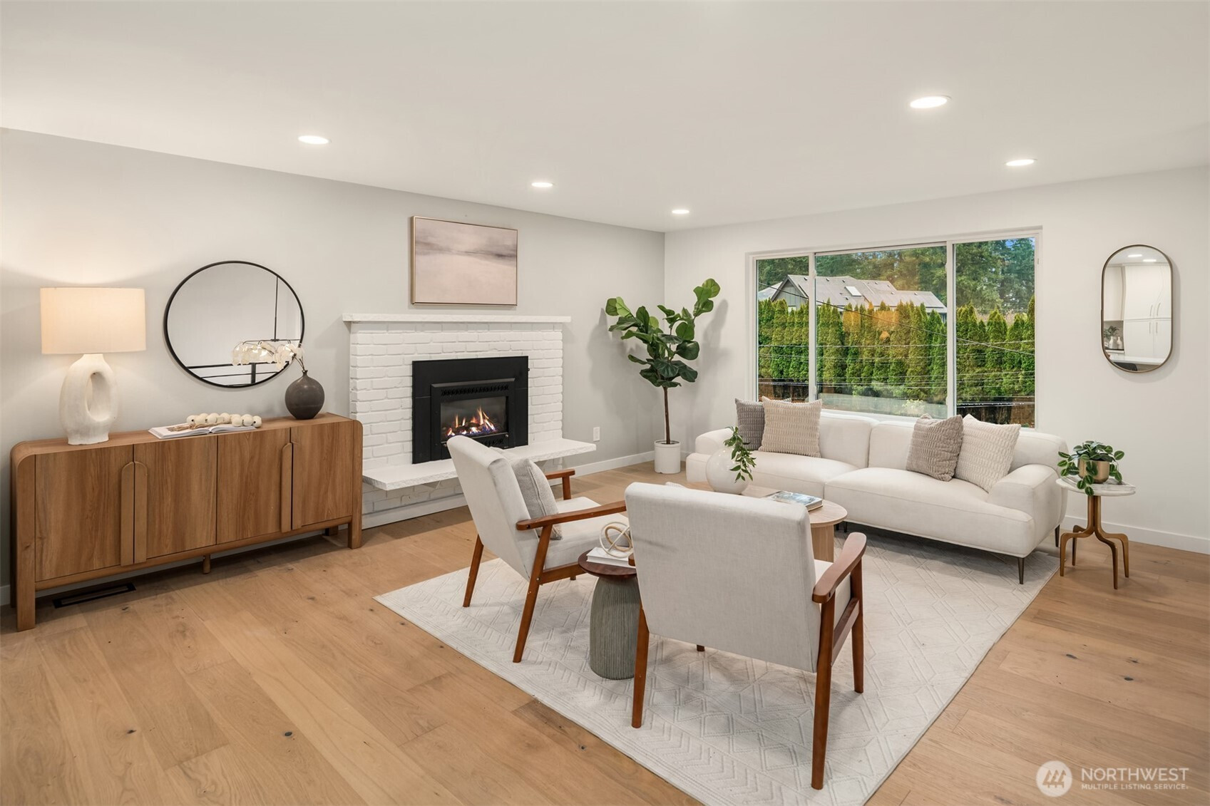 Completely reimagined home with DADU potential on 12,450 sq ft lot in highly sought-after South Rose Hill . Tucked away at the end of a private drive, this beautifully appointed residence offers style, comfort, and functionality throughout. The main level showcases white oak hardwood flooring, a stunning high-end kitchen featuring quartz countertops, shaker-style cabinetry, and stainless steel appliances. The open-concept living and dining areas are anchored by a cozy gas fireplace and provide seamless access to the outdoor deck, making it ideal for entertaining and enjoying warm summer evenings. The spacious primary suite includes a luxurious bath with tile floors and a custom surround. Two additional bedrooms and a full bathroom complete the main floor. Upon entering the lower level you'll find a large family room ideal for gatherings or movie nights, an additional bedroom/flex space, a three-quarter bath, and a dedicated laundry room. Fully finished two-car garage adds convenience and practicality. Located within the top-rated Lake WA school district and offering an easy commute to both downtown Redmond and Kirkland and tech hubs. This home is just minutes from highly rated restaurants, parks, and everyday amenities.