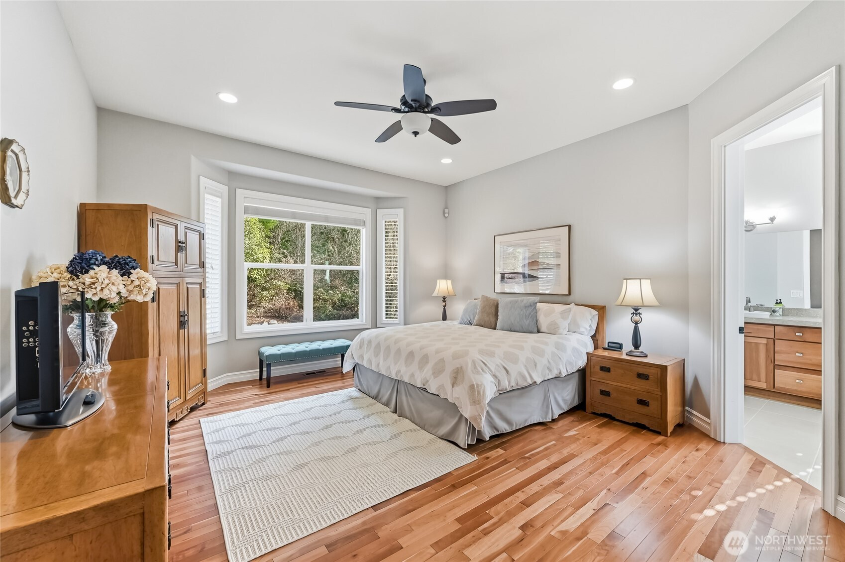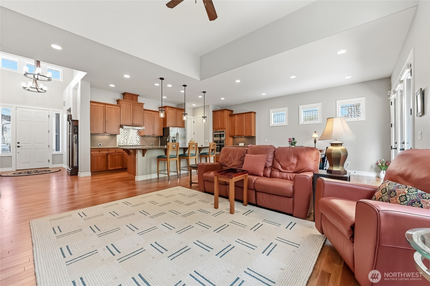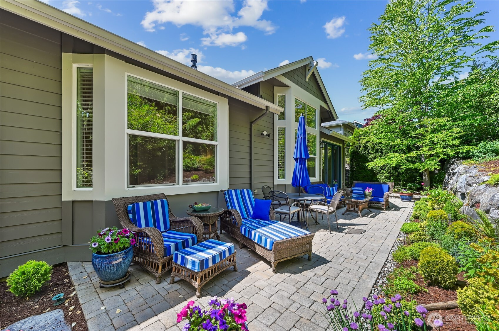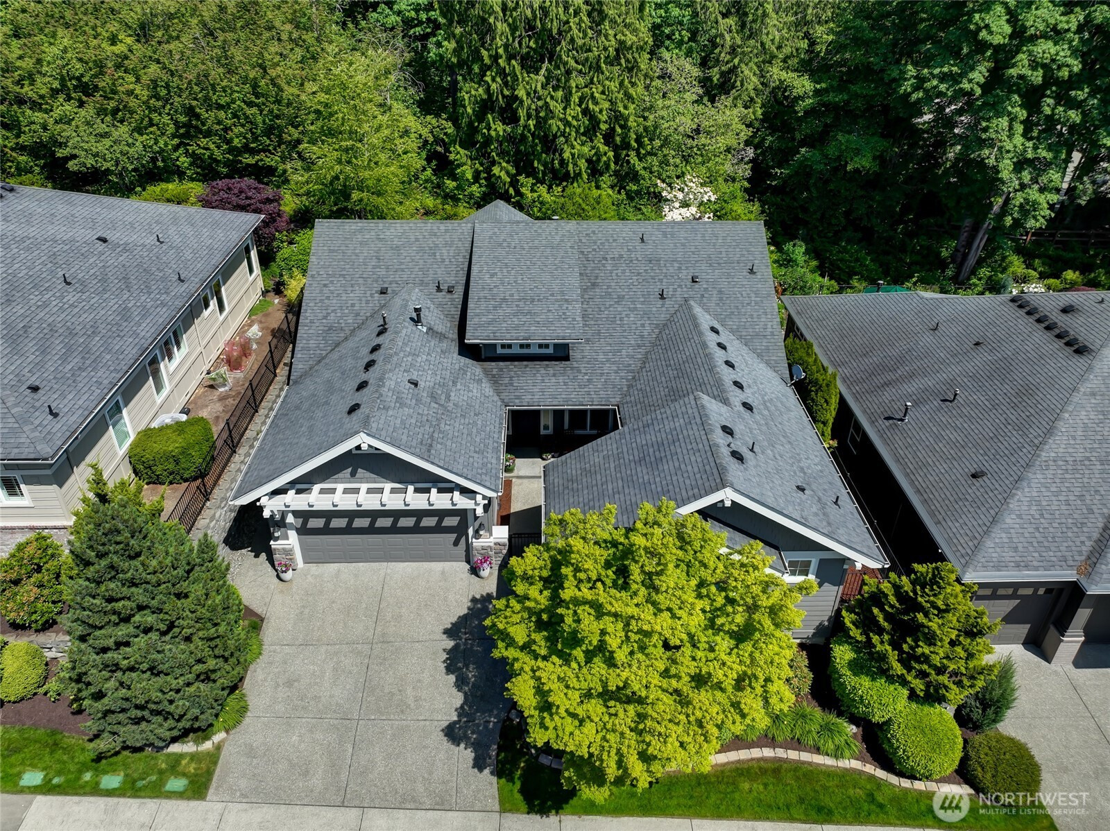 Welcome to easy living in this 1-level, Hemlock plan home offering 2 bedrooms, 2.5 baths and a den. The large paver patio is a fantastic outdoor living space surrounded by nature and a wonderful place to entertain. Cherry hardwoods thru-out the home, no carpet. Kitchen w/42” cherry cabinets with pull-out shelves in the lowers, designer lighting, slab granite counters & custom backsplash. Great room w/gas fireplace and walls of windows. The primary bedroom has a beautifully tiled 5-piece bathroom, dual walk-in closets and looks out to the private backyard. The second bedroom is also en-suite. Large office with glass French doors and a powder room for day guests. Golf cart garage for your sports car, storage or hobbies. New furnace & A/C in 2022, oven & micro in 2021, fridge 2020. Ext paint 2019. Sprinkler system in the front,Low HOA dues of $347/mo include access to the clubhouse, front yard & front sprinkler maintenance. One occupant must be age 55 or older and no permanent occupant under age 18.