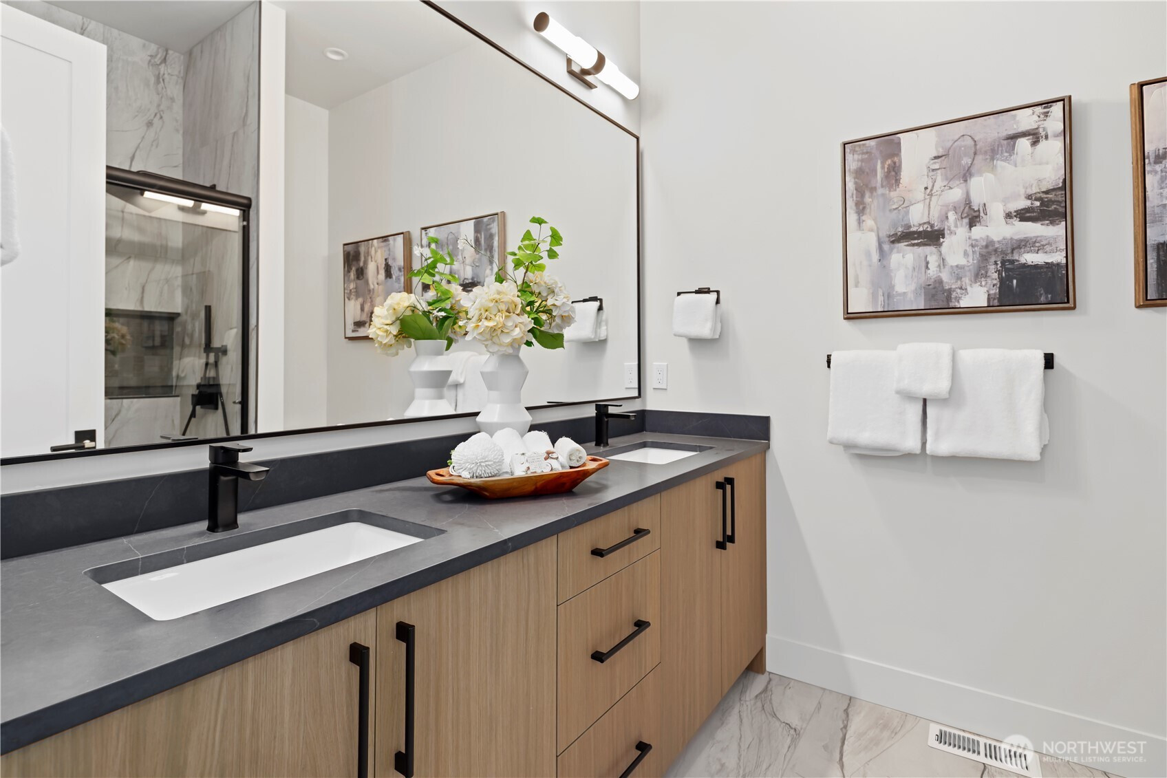 Hamish Anderson Custom Homes, known for Architectural Digest–worthy estates, offers a special limited-edition showcase home. This design-forward NW Contemporary blends warmth, abundant light and sophistication on an oversized, level cul-de-sac lot. Soaring windows surround the home’s central gathering space, where a light-filled great room is anchored by a dramatic two-story gas fireplace clad in large-format stone with organic gold veining and refined slat panel detailing. Chef-caliber kitchen with Thermador appliance suite: French door refrigerator with four freezer drawers and a 48" pro-grade Wi-Fi-enabled gas range with double ovens. Oversized island topped with leathered quartz and seating for four. Generous informal dining for everyday living, plus formal dining with exposed wood beams and a niche for an heirloom piece. Oversized primary with chandelier, millwork accent wall and sleek ensuite with LED backlit mirrors, tile feature wall, motion lighting, freestanding soaking tub, frameless shower, heated floors and a grand walk-in closet connecting to the laundry room. Outdoor living with ceiling fan, heater prewire and gas stubs for BBQ and fire table. Next-generation Control4 system with newly released sleek lighting keypads, integrated audio with built-in speakers and prewiring for security. Bonus room with snack bar and beverage chiller. Five bedrooms including three ensuites, one main-level suite featuring double vanity and heated floors.